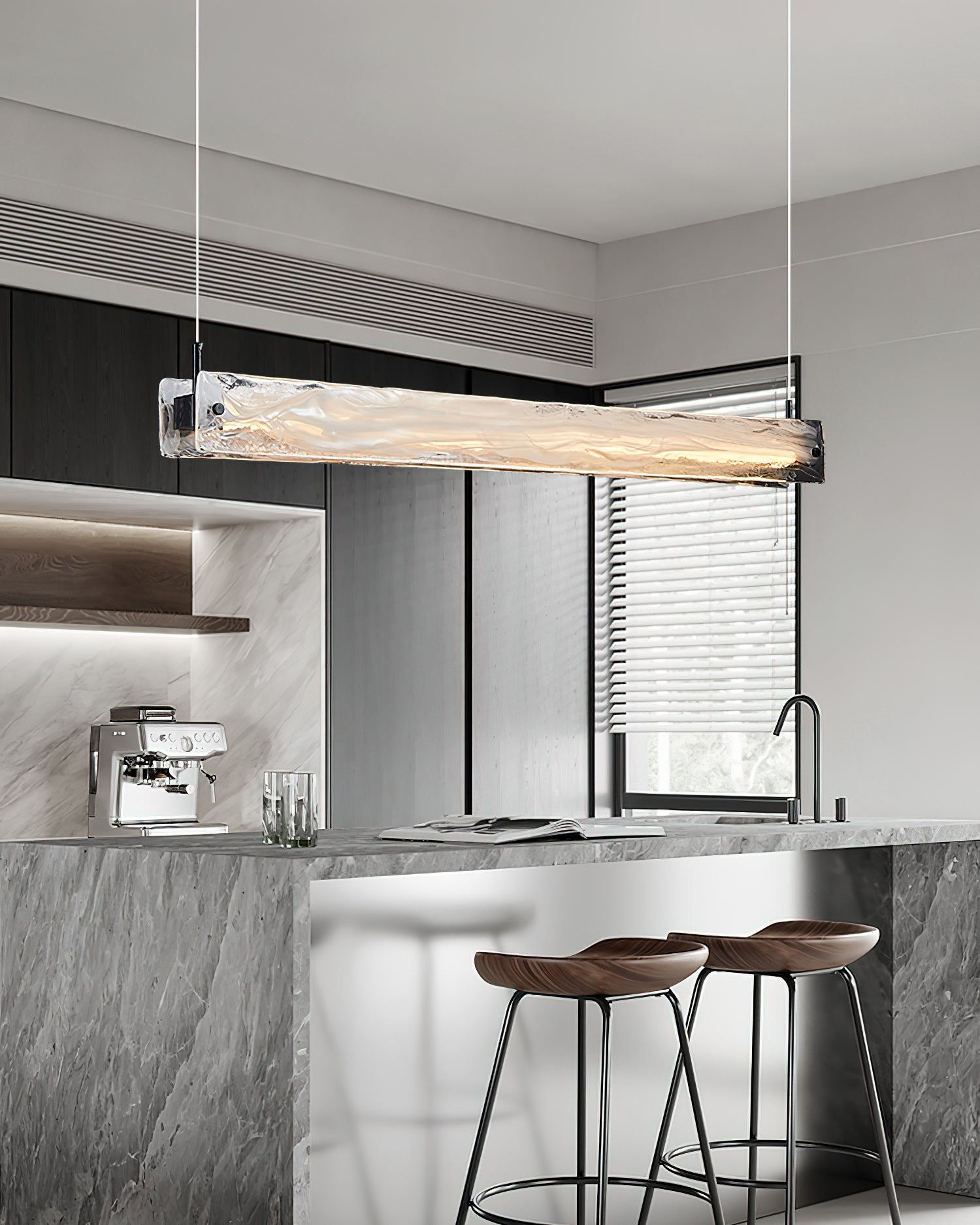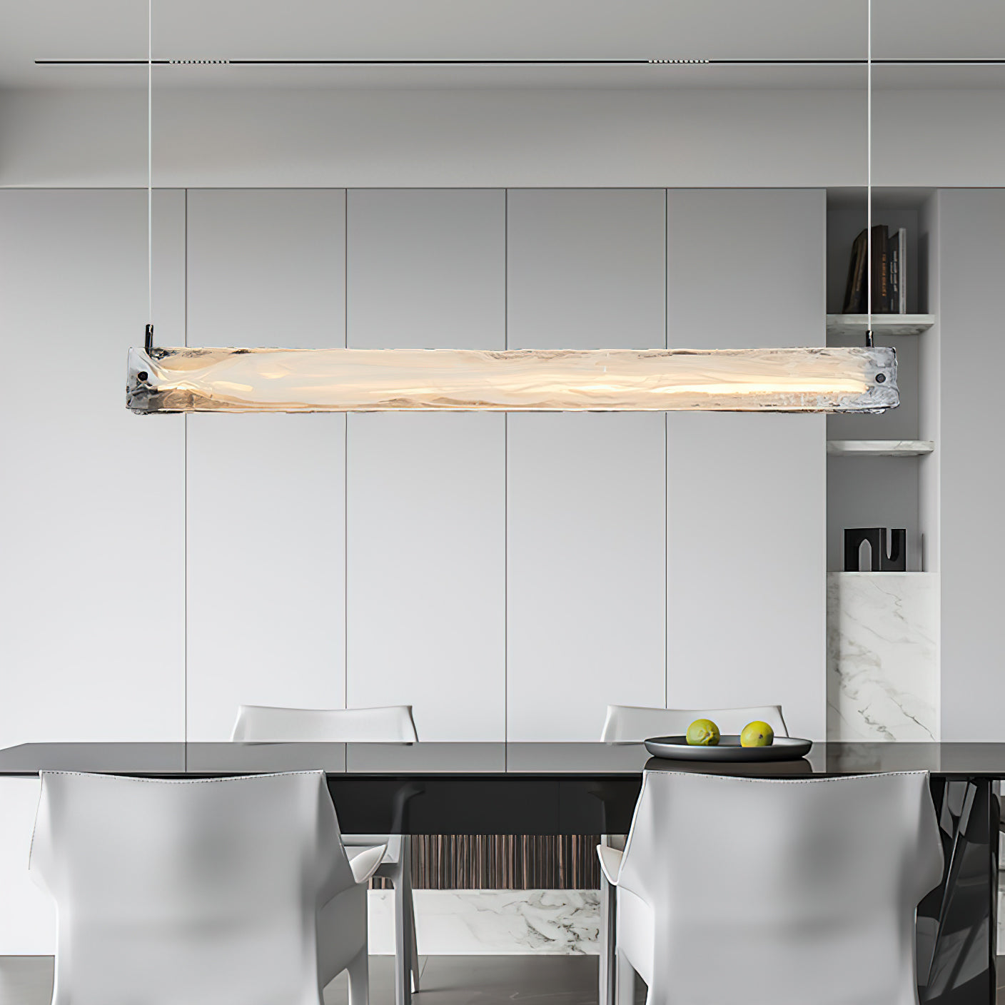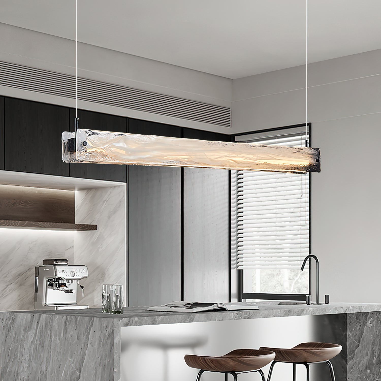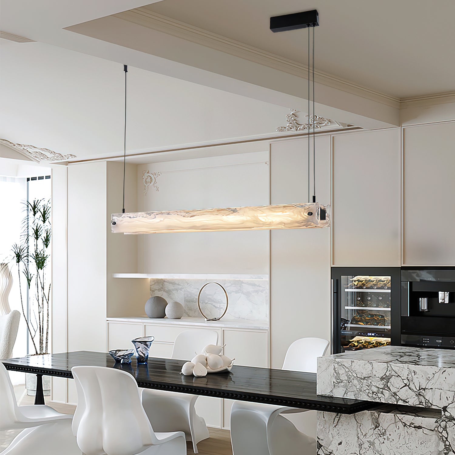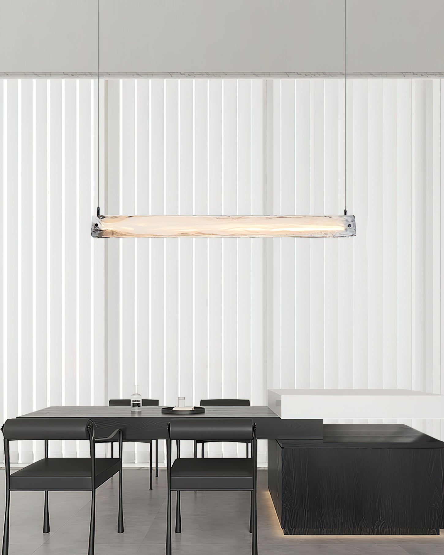 Upgrade your space with the luxurious Saanen Linear Chandelier. Featuring a sleek rectangular design and made from high-quality metal and glass, this chandelier will add a touch of elegance to any room. Available in two sizes, it's perfect for a kitchen island or dining room. Luxury meets modern design for a stunning style.
