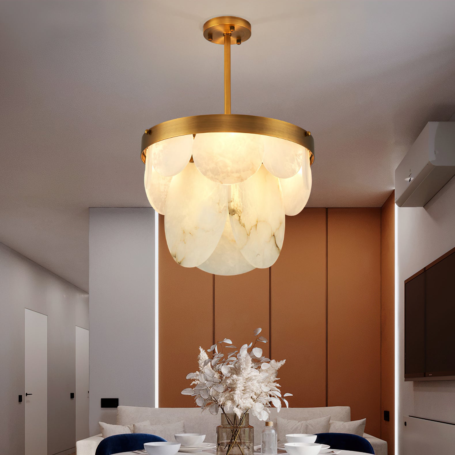 The Sasha Chandelier from Mooijane pairs natural alabaster with polished copper for a refined blend of texture and transparency. Each alabaster element is individually shaped, revealing subtle, organic veining that radiates a warm, ambient glow. Framed by a symmetrical copper structure, it merges vintage charm with contemporary elegance—making it a striking centerpiece for dining rooms, living areas, or entryways.