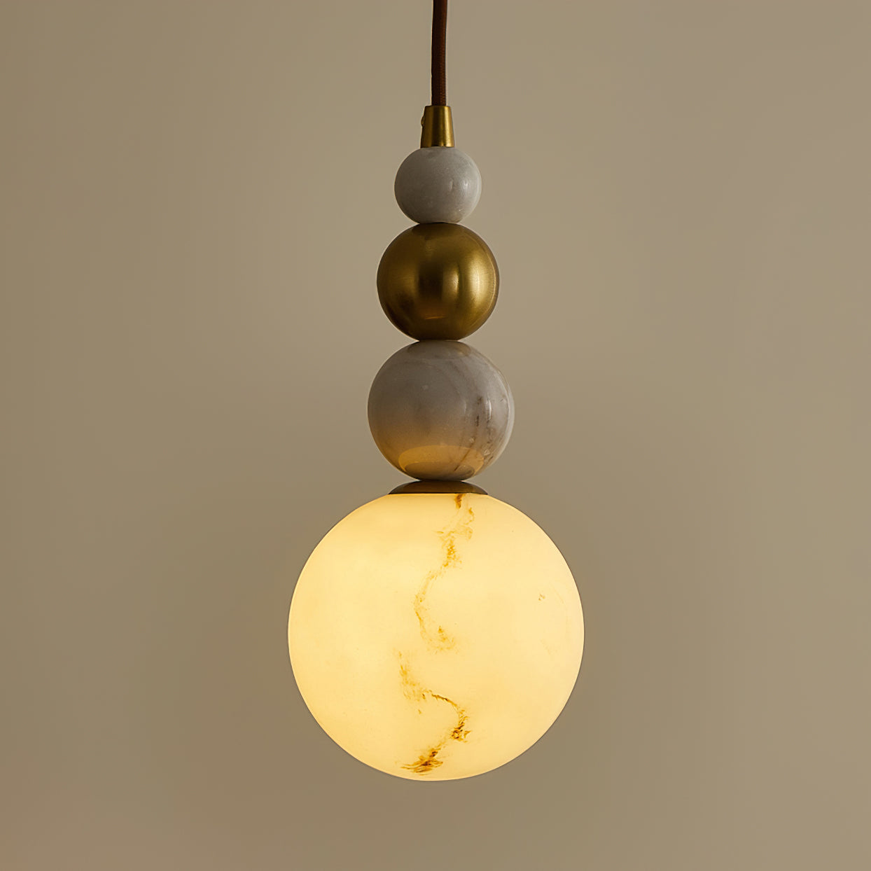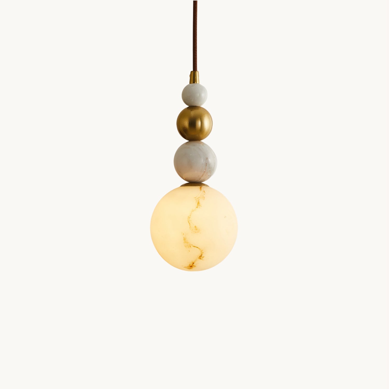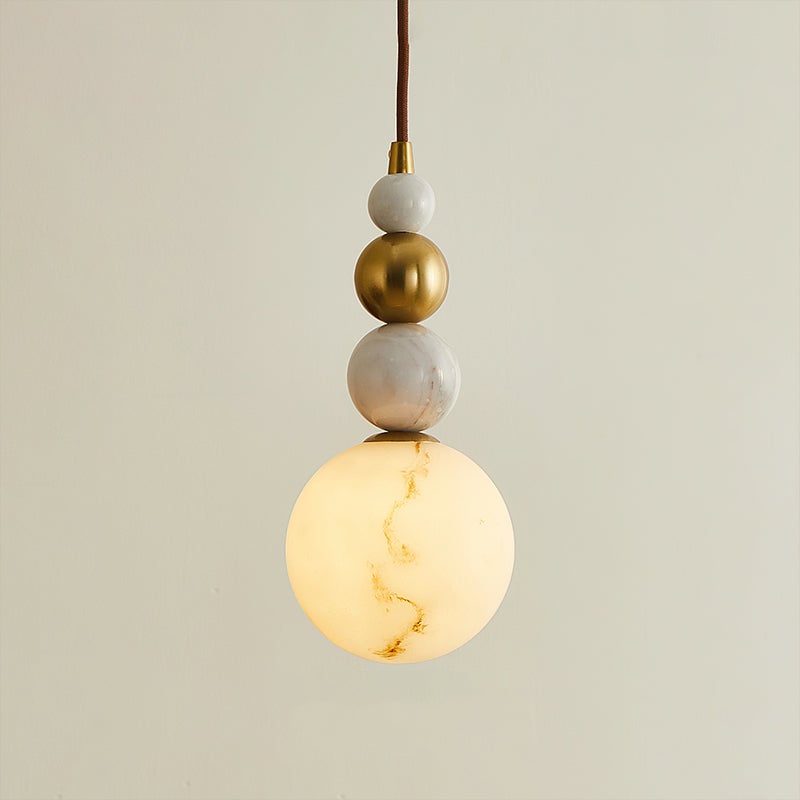 The Savinav Pendant Lamp from Mooijane is a refined interplay of metal, marble, and Imitation alabaster—stacked in a sculptural, vertical rhythm. Its sleek metal spheres radiate a warm sheen, beautifully complemented by the organic veining of marble and the soft translucence of Imitation alabaster. The base glows gently when lit, casting a warm, ambient light that elevates any space.
