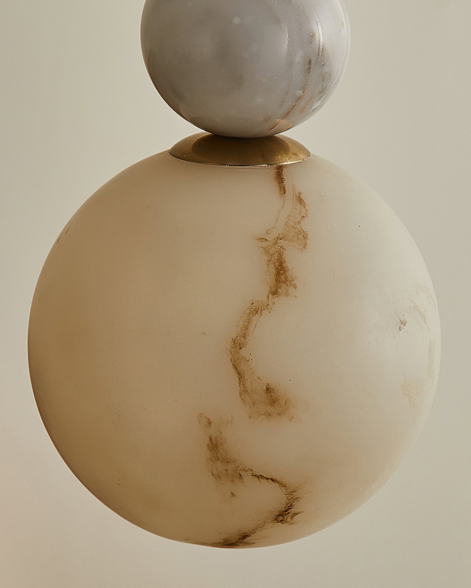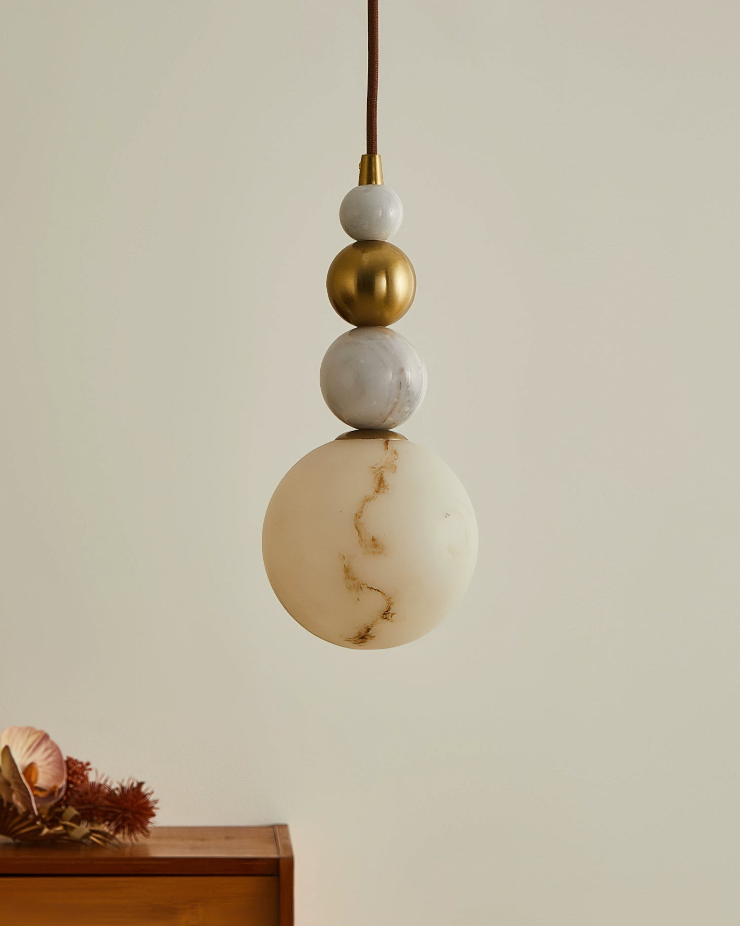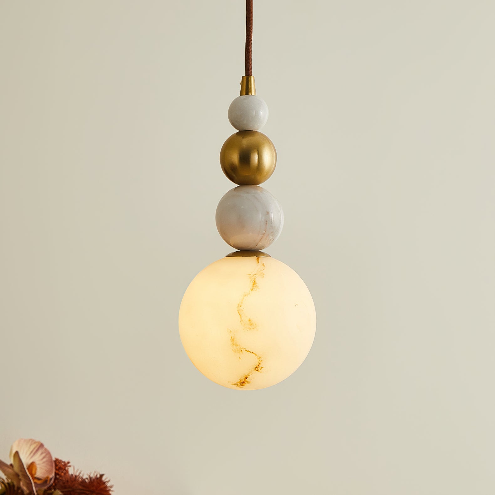 The Savinav Pendant Lamp from Mooijane is a refined interplay of metal, marble, and Imitation alabaster—stacked in a sculptural, vertical rhythm. Its sleek metal spheres radiate a warm sheen, beautifully complemented by the organic veining of marble and the soft translucence of Imitation alabaster. The base glows gently when lit, casting a warm, ambient light that elevates any space.