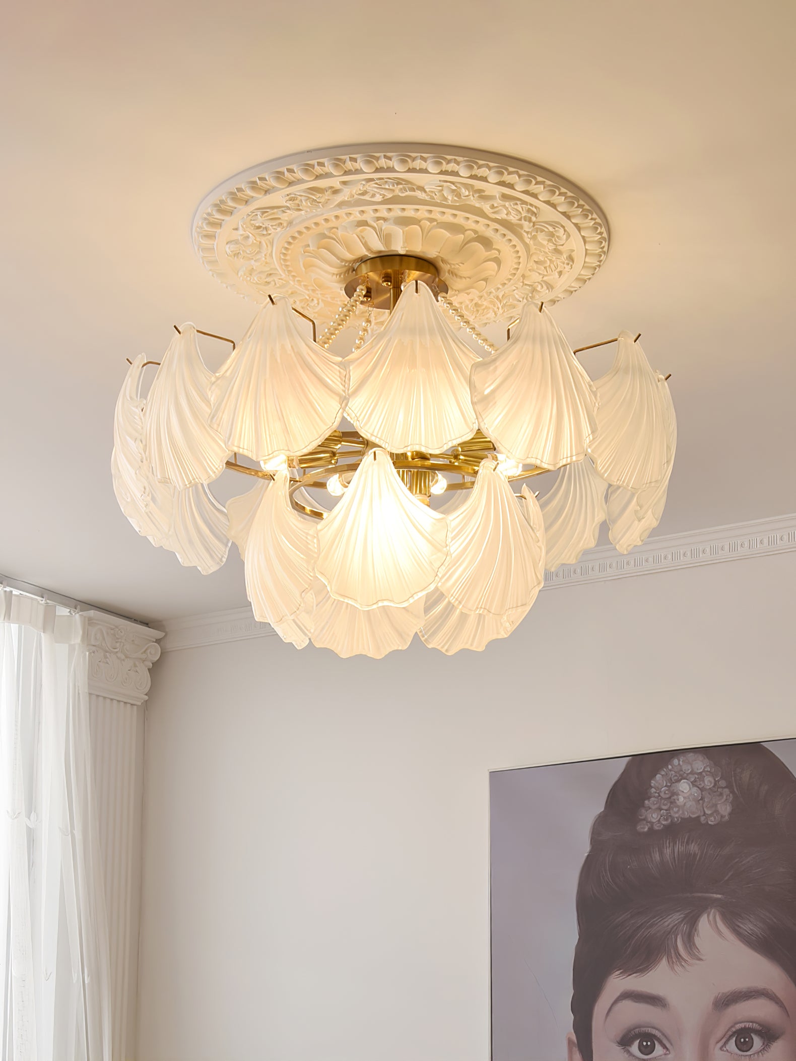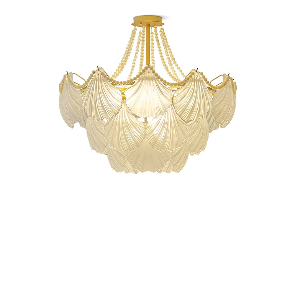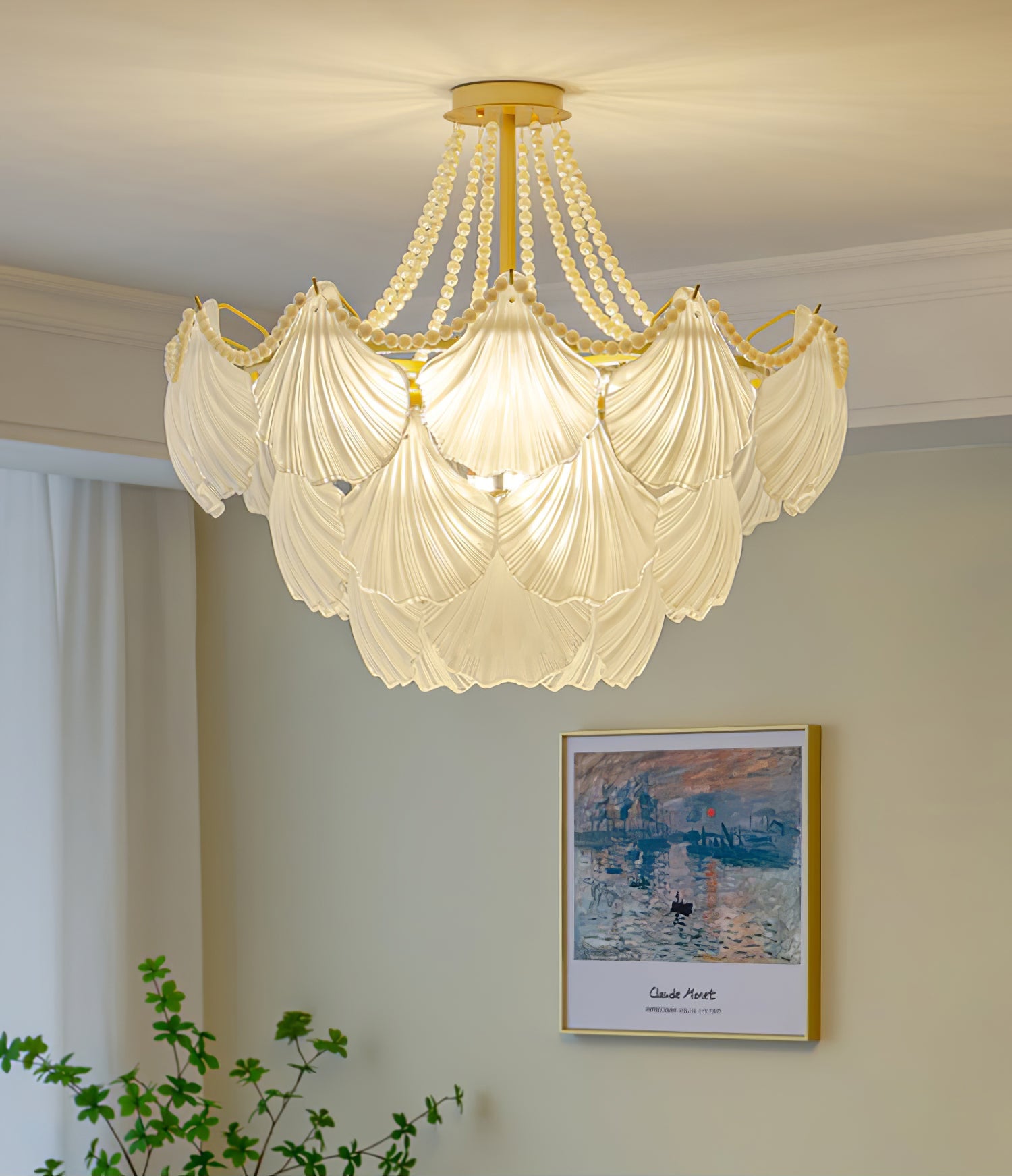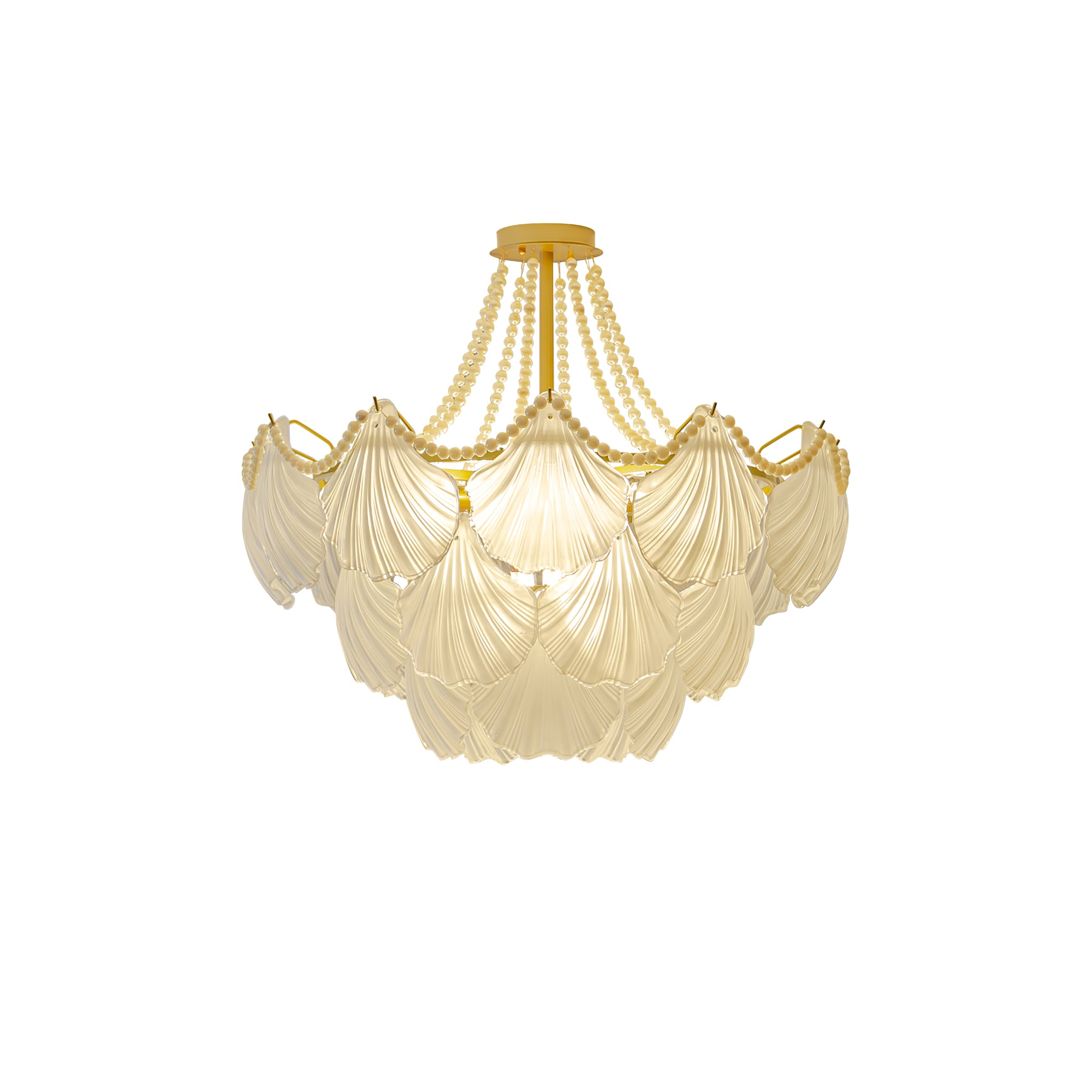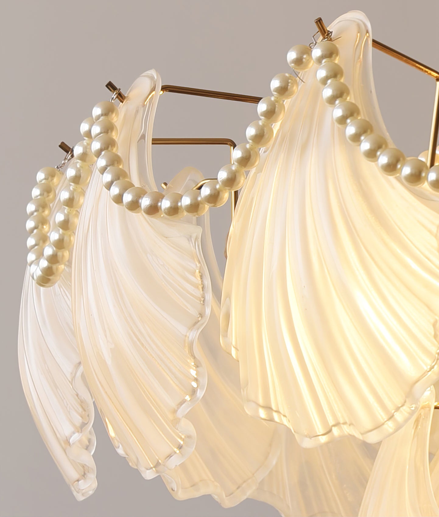 The combination of scallop shape and wrought iron lines and circles reflect the full sense of three-dimensional richness. The lighting design has a sense of hierarchy and depth, and the glass lampshade with diamond texture is comfortable and not dazzling, creating a comfortable light environment.