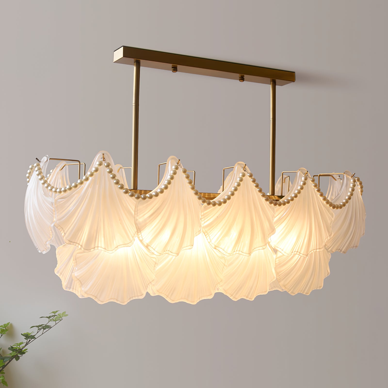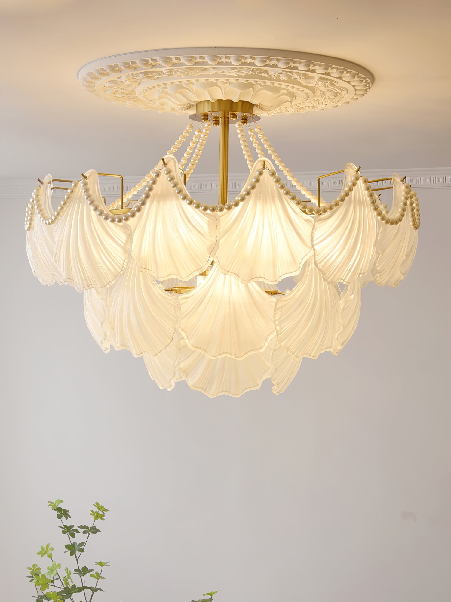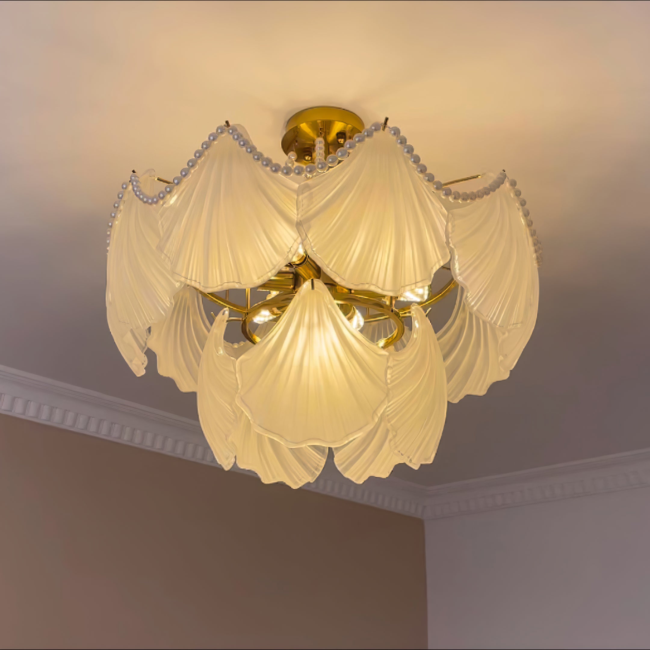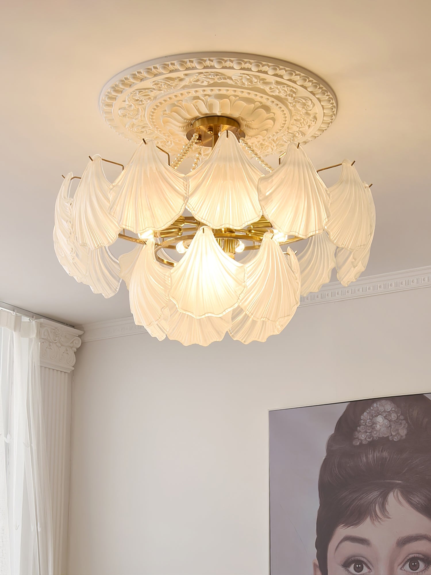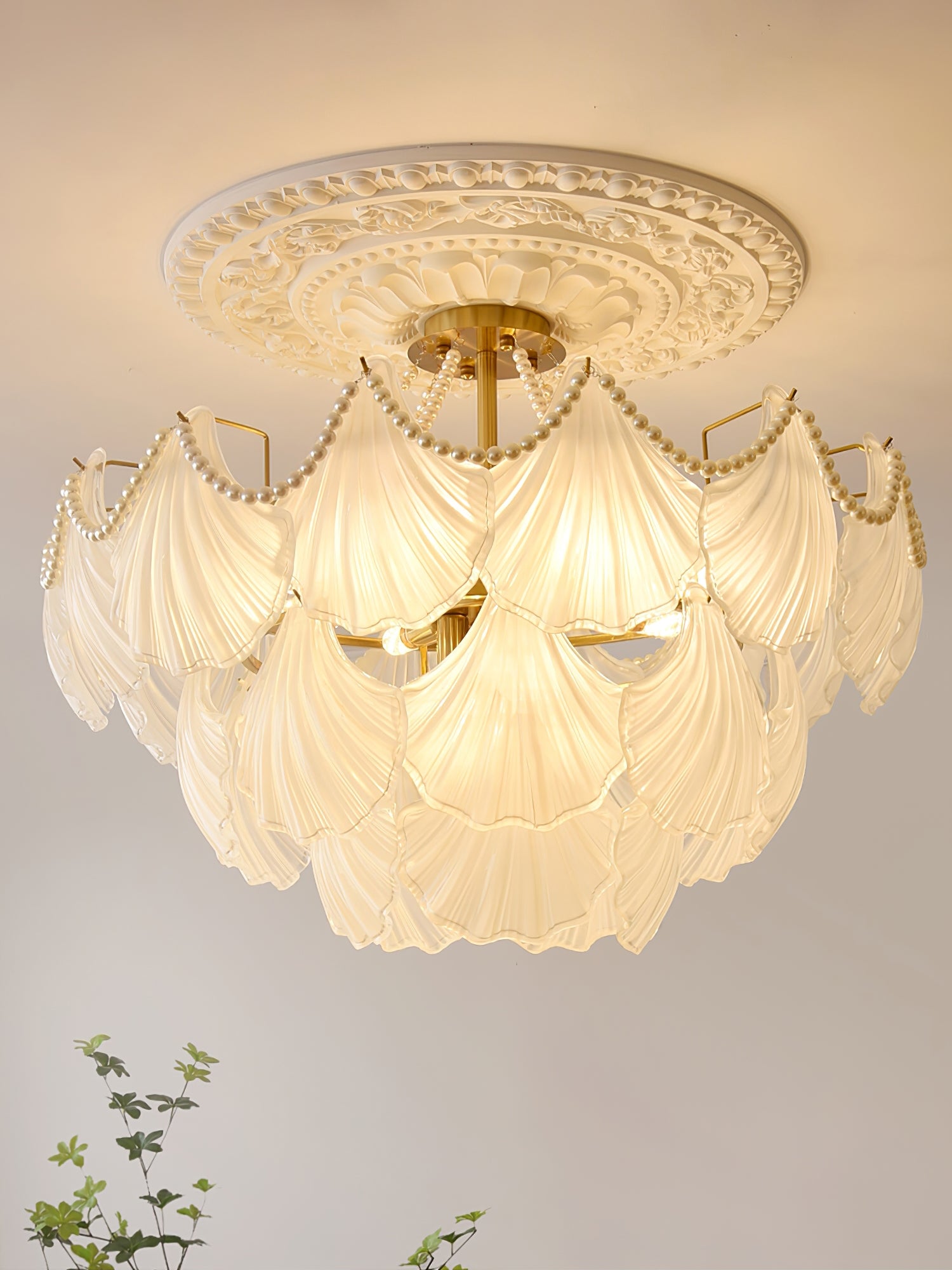 The combination of scallop shape and wrought iron lines and circles reflect the full sense of three-dimensional richness. The lighting design has a sense of hierarchy and depth, and the glass lampshade with diamond texture is comfortable and not dazzling, creating a comfortable light environment.