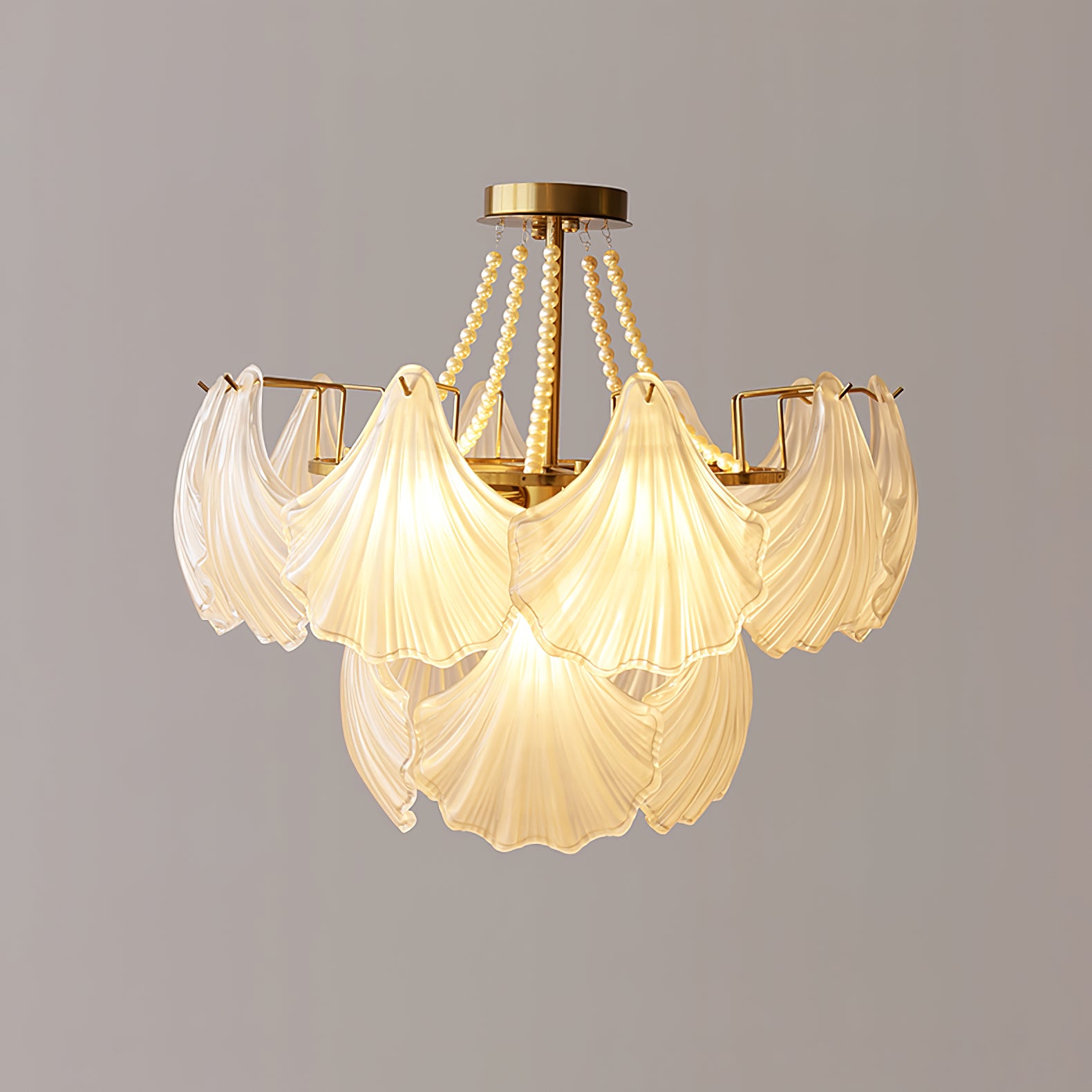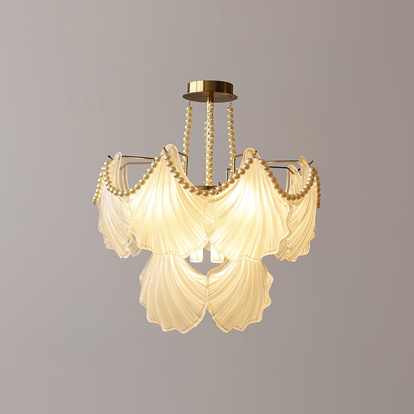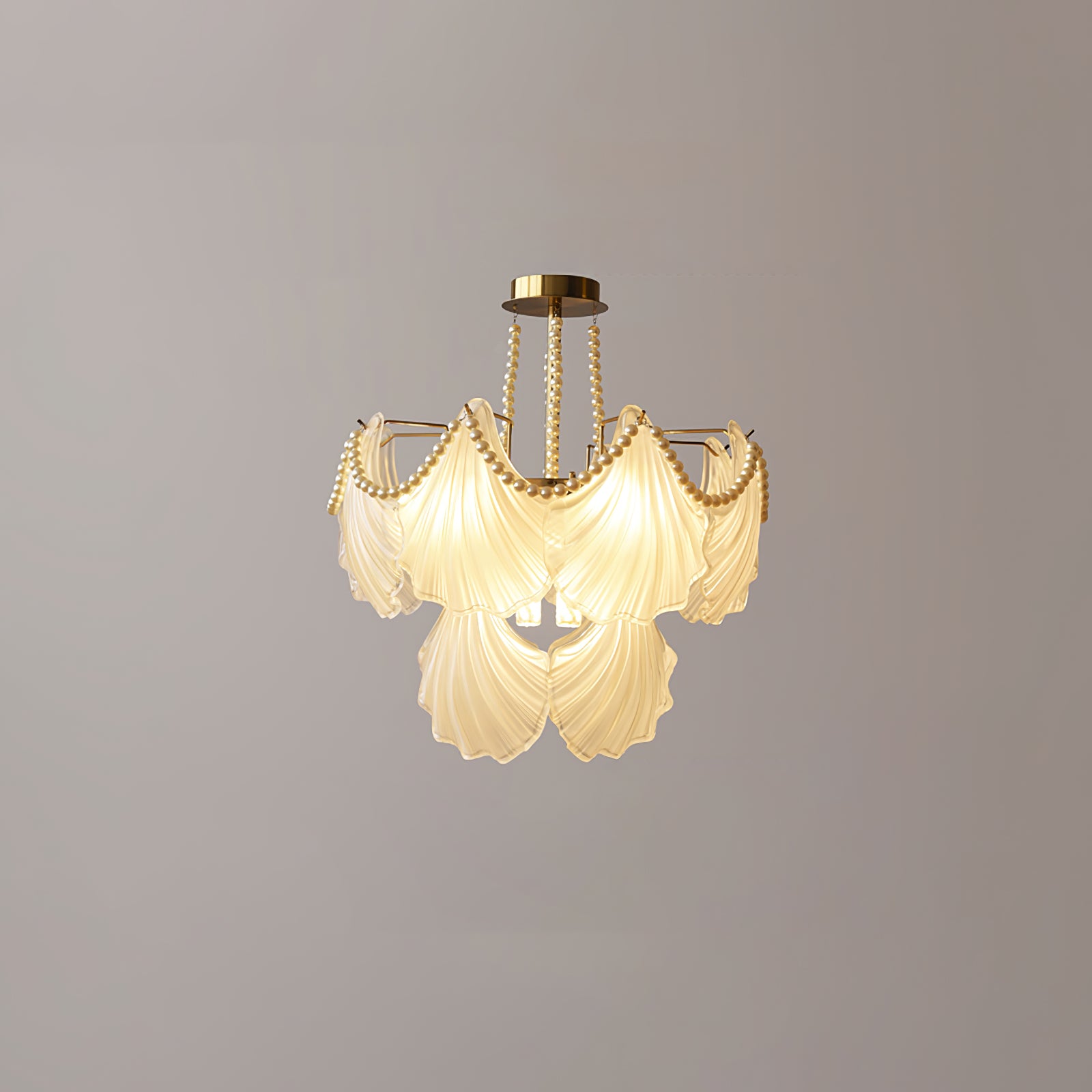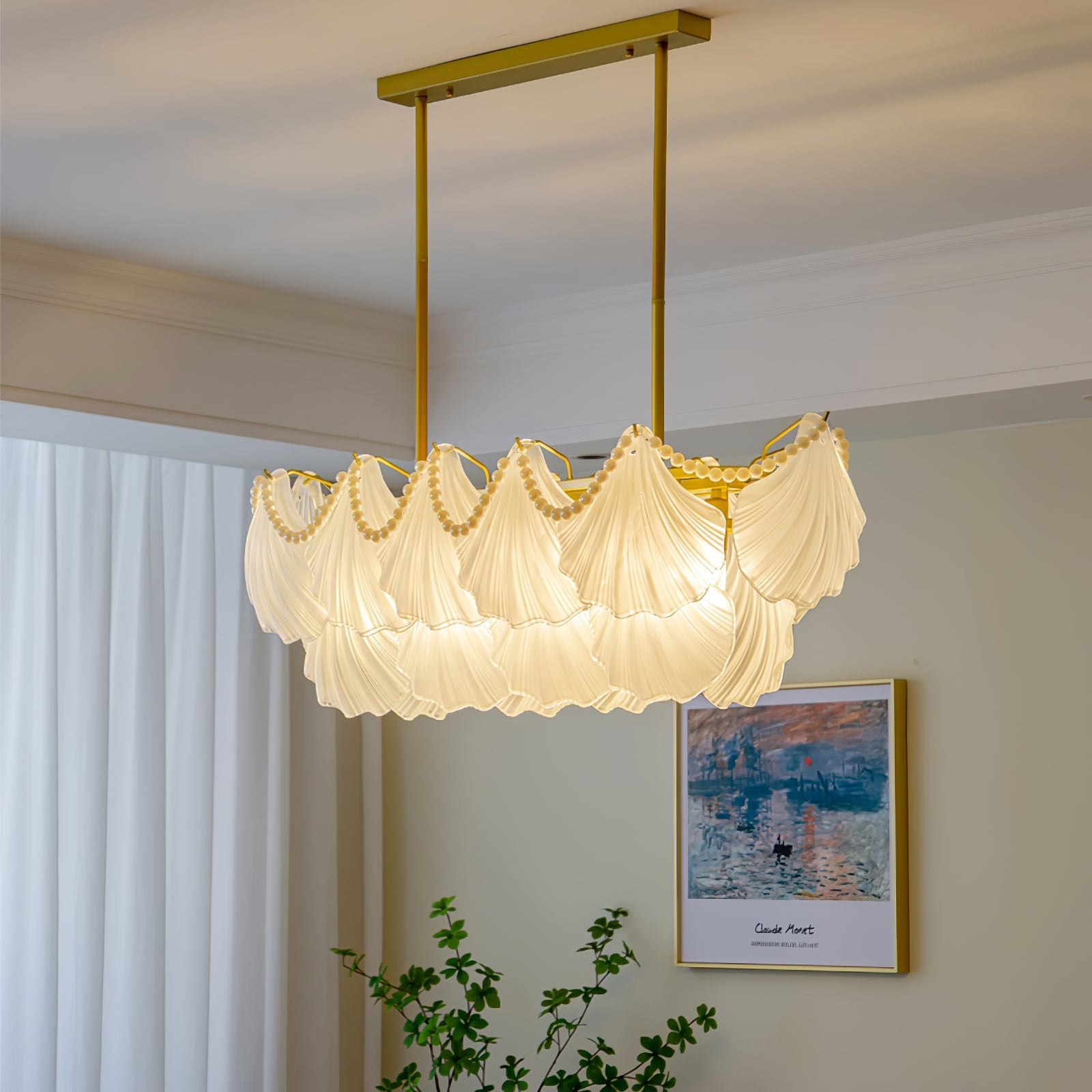 The combination of scallop shape and wrought iron lines and circles reflect the full sense of three-dimensional richness. The lighting design has a sense of hierarchy and depth, and the glass lampshade with diamond texture is comfortable and not dazzling, creating a comfortable light environment.
