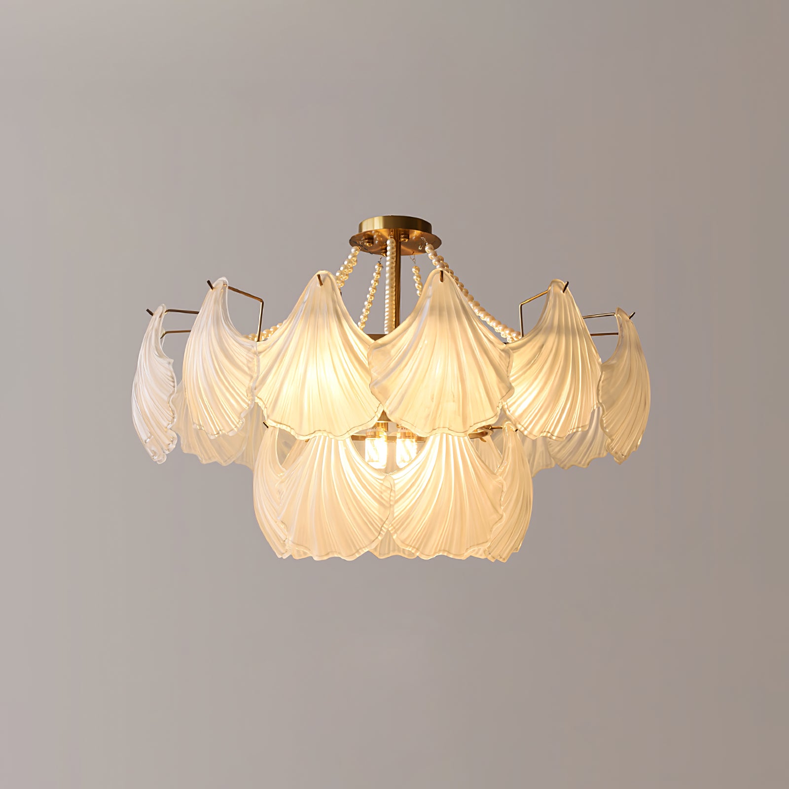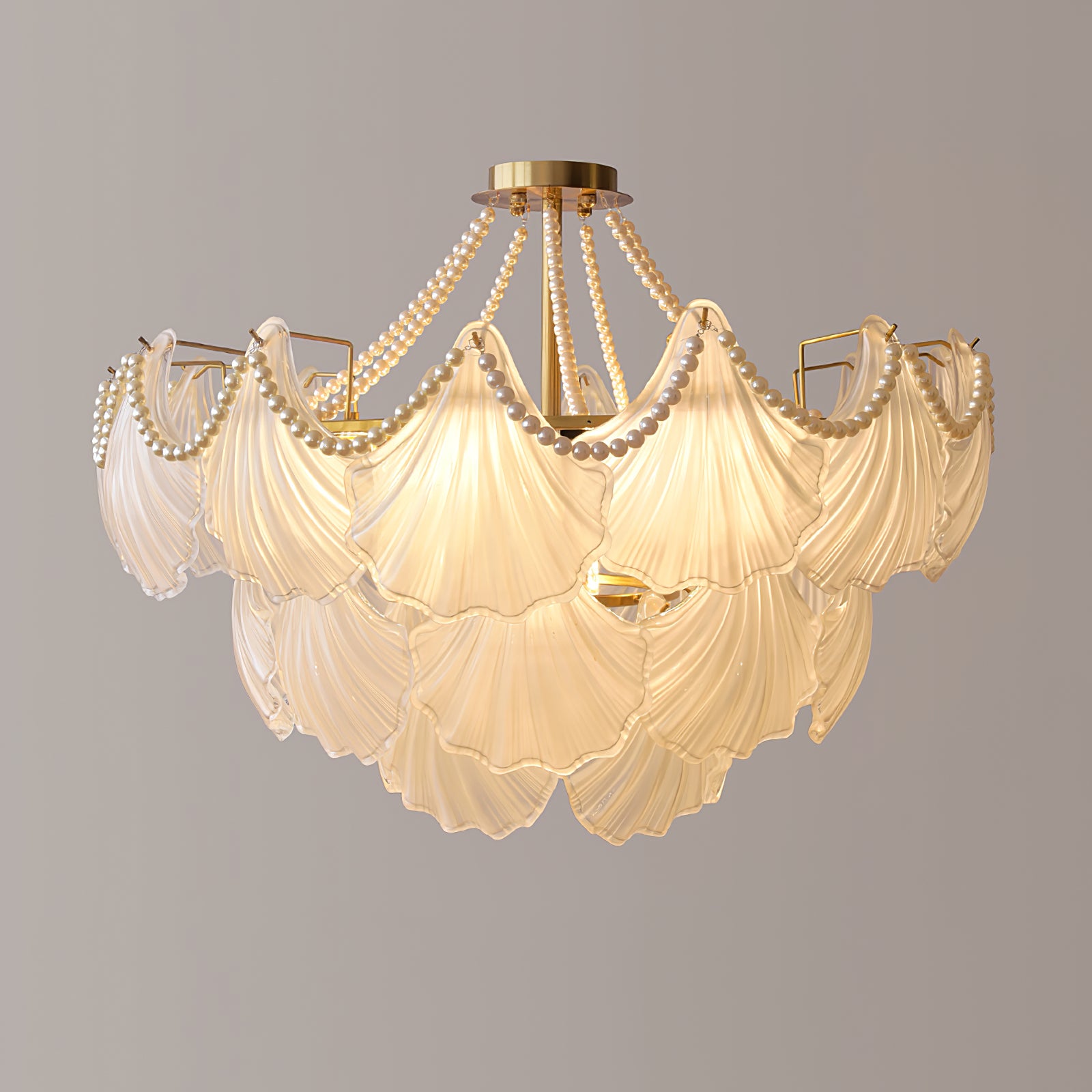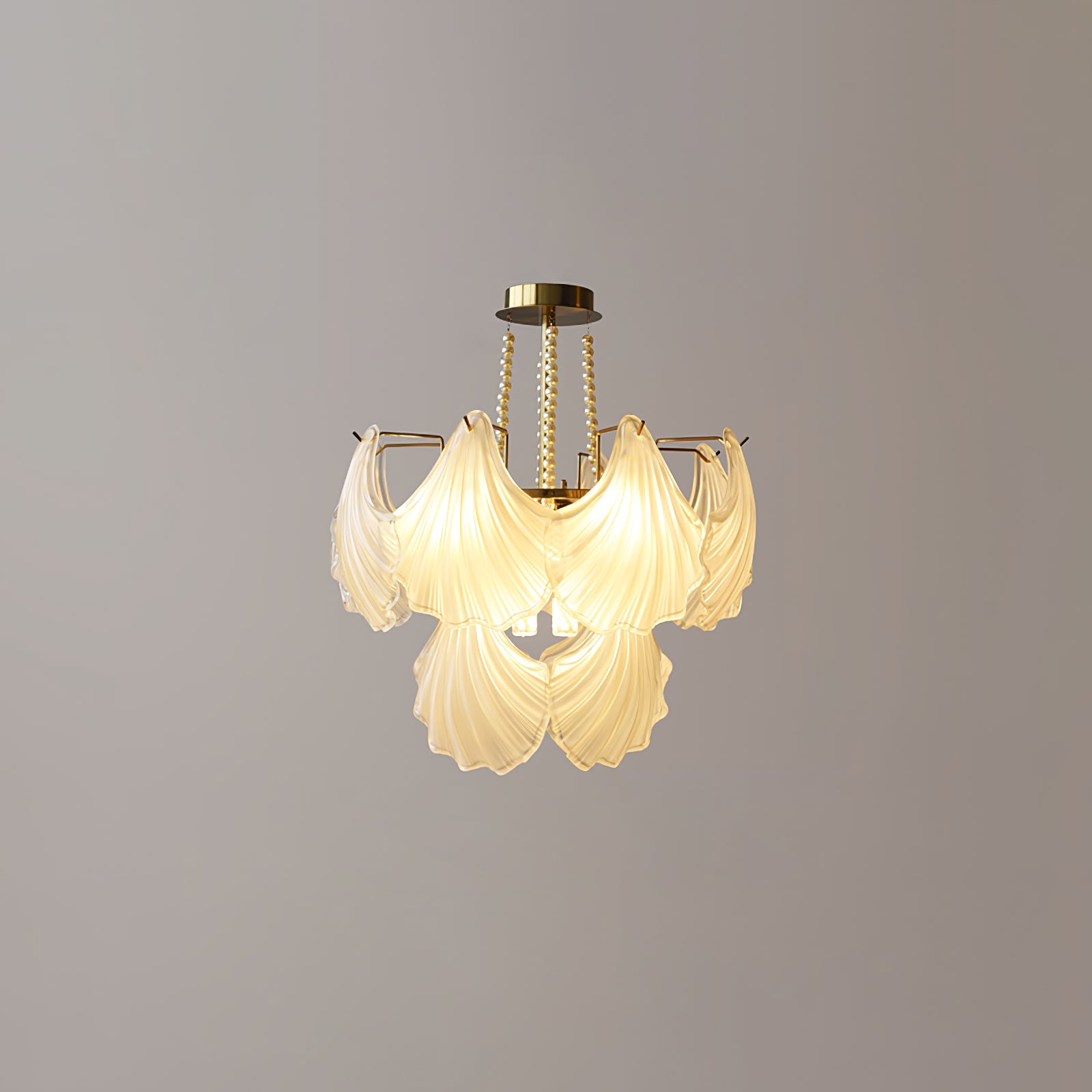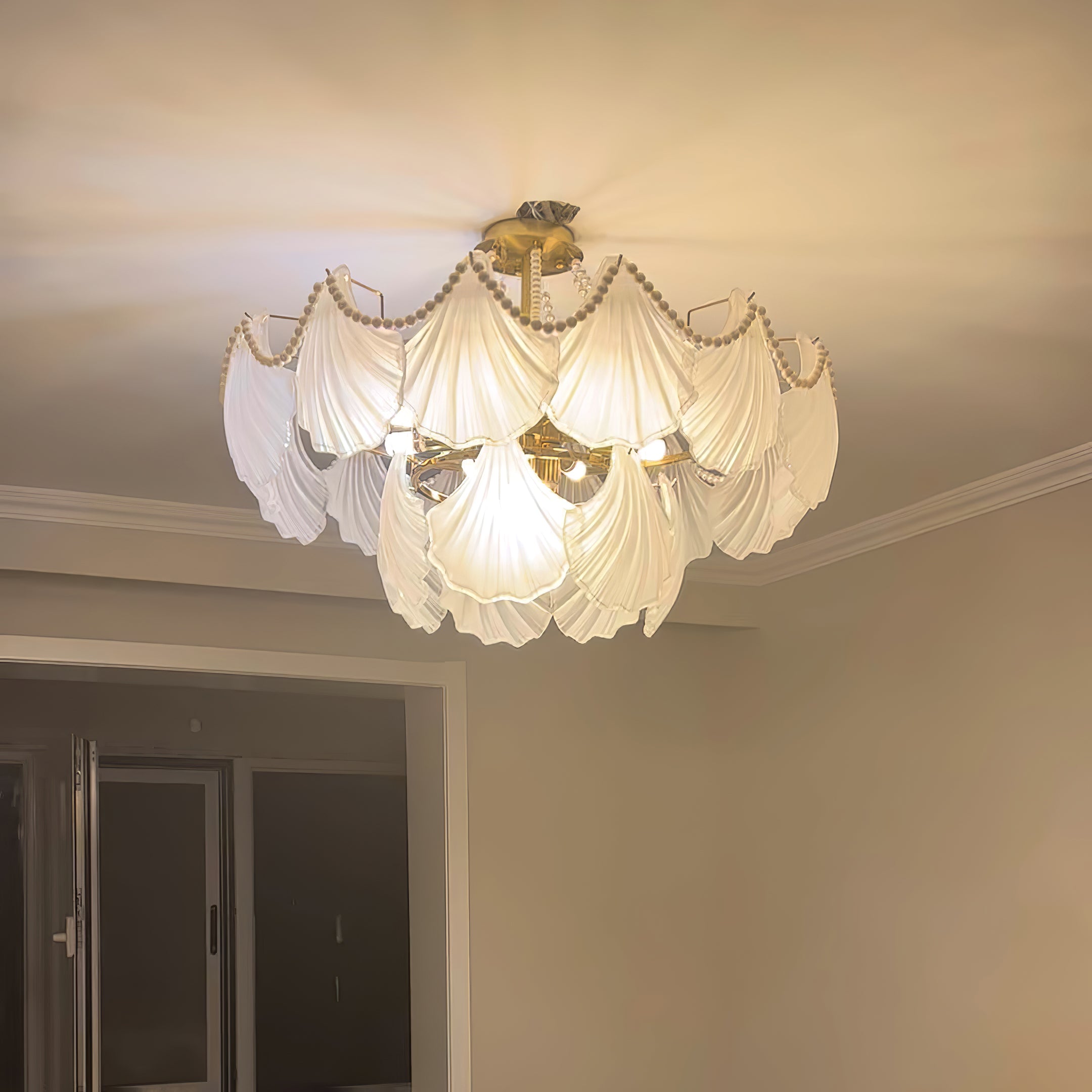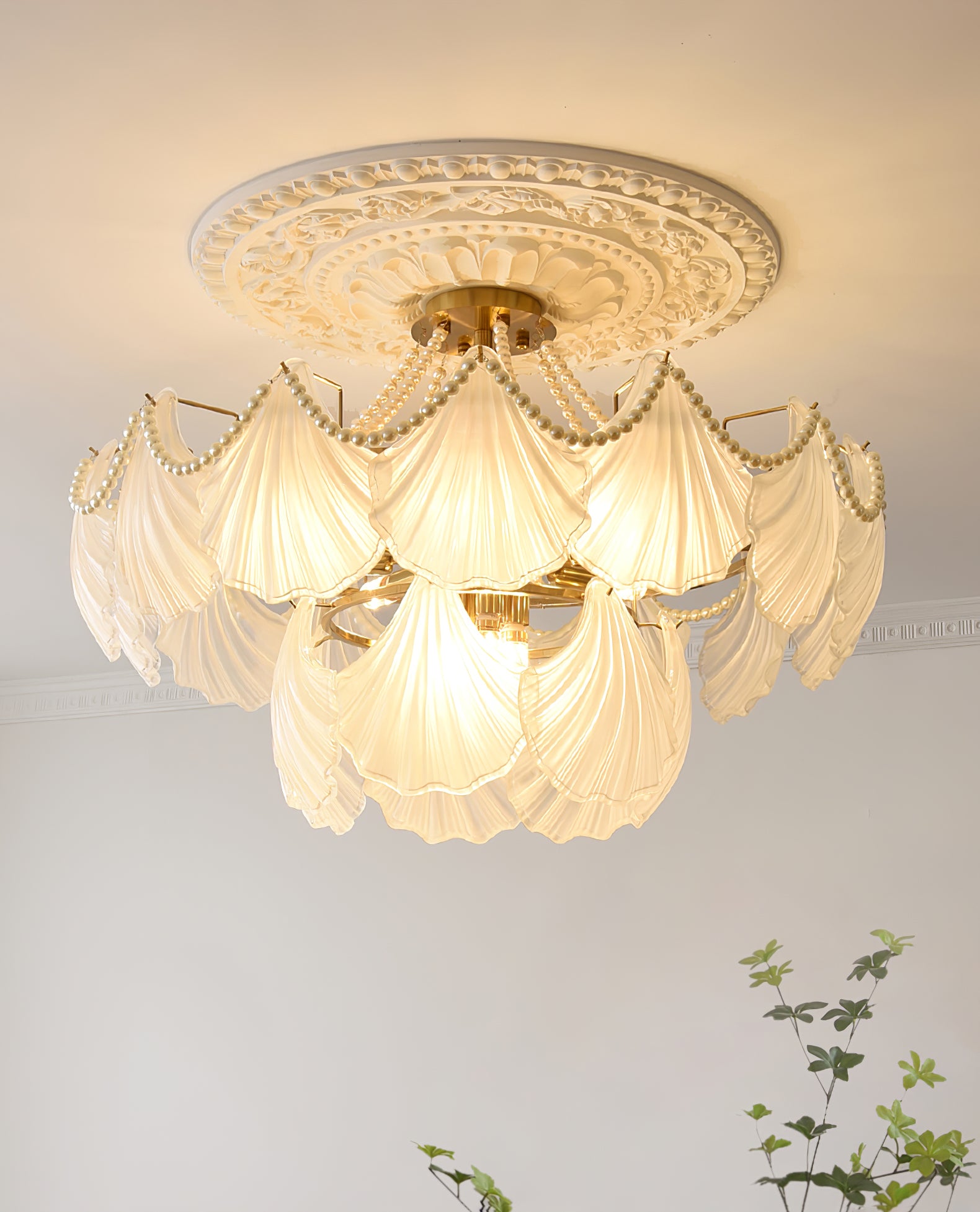 The combination of scallop shape and wrought iron lines and circles reflect the full sense of three-dimensional richness. The lighting design has a sense of hierarchy and depth, and the glass lampshade with diamond texture is comfortable and not dazzling, creating a comfortable light environment.