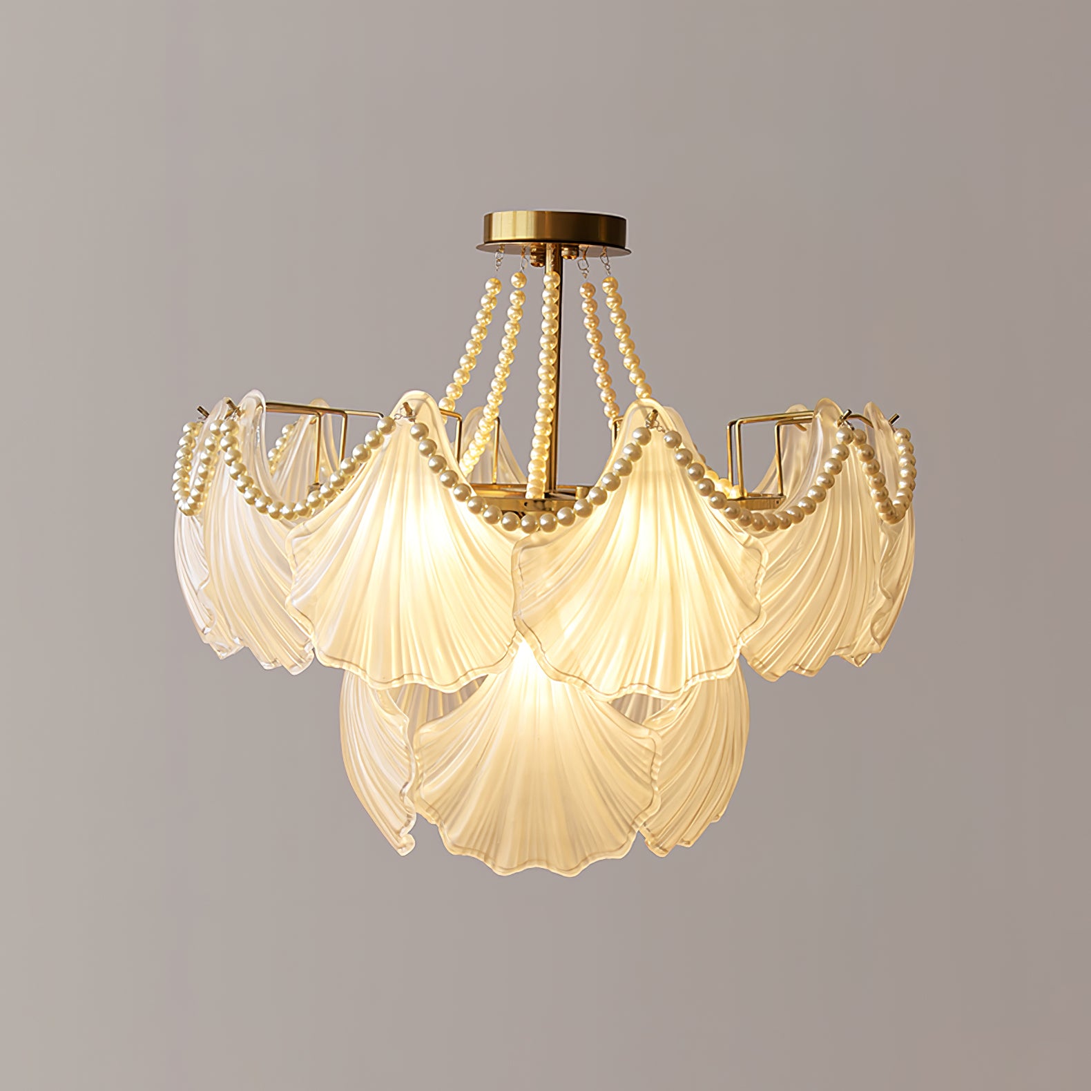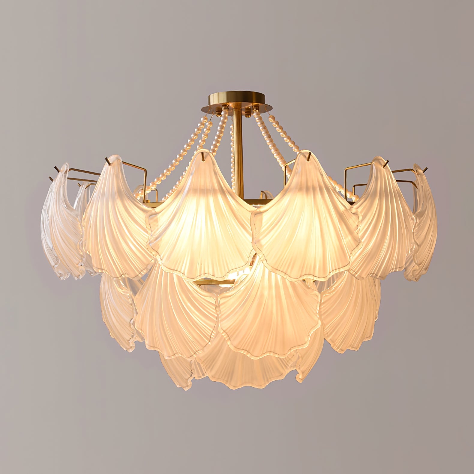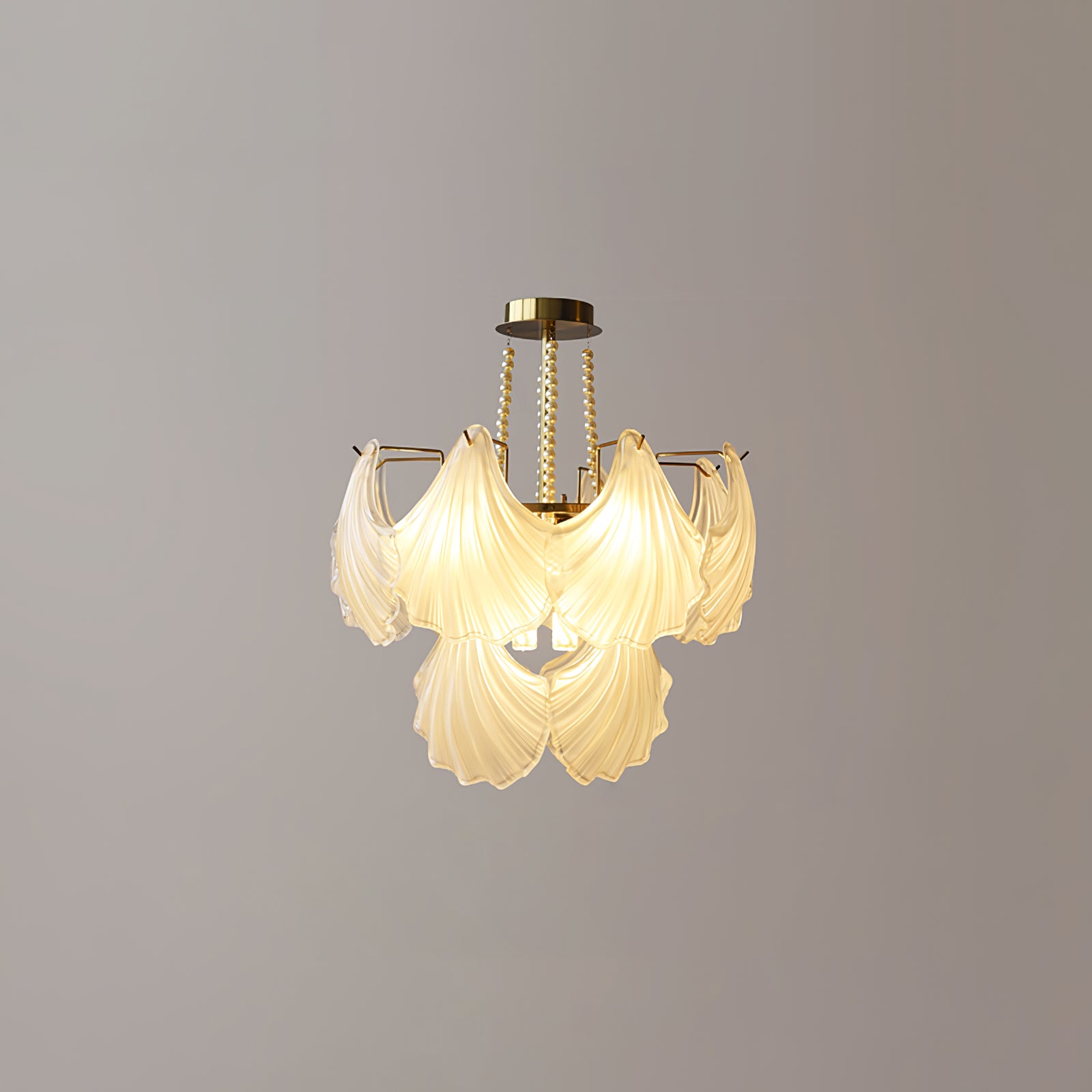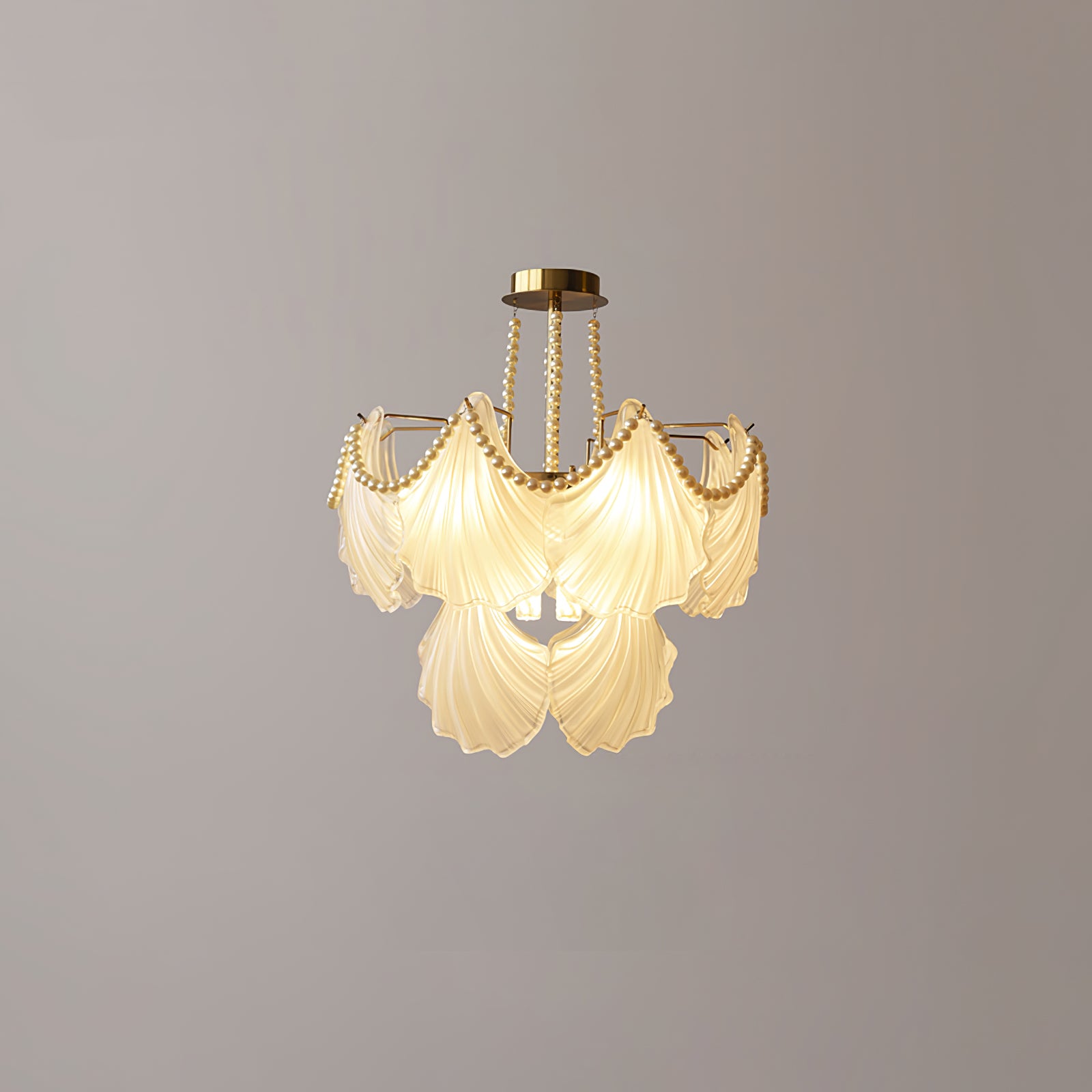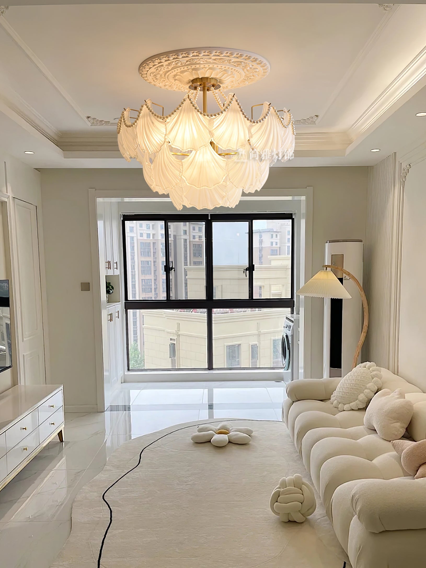 The combination of scallop shape and wrought iron lines and circles reflect the full sense of three-dimensional richness. The lighting design has a sense of hierarchy and depth, and the glass lampshade with diamond texture is comfortable and not dazzling, creating a comfortable light environment.