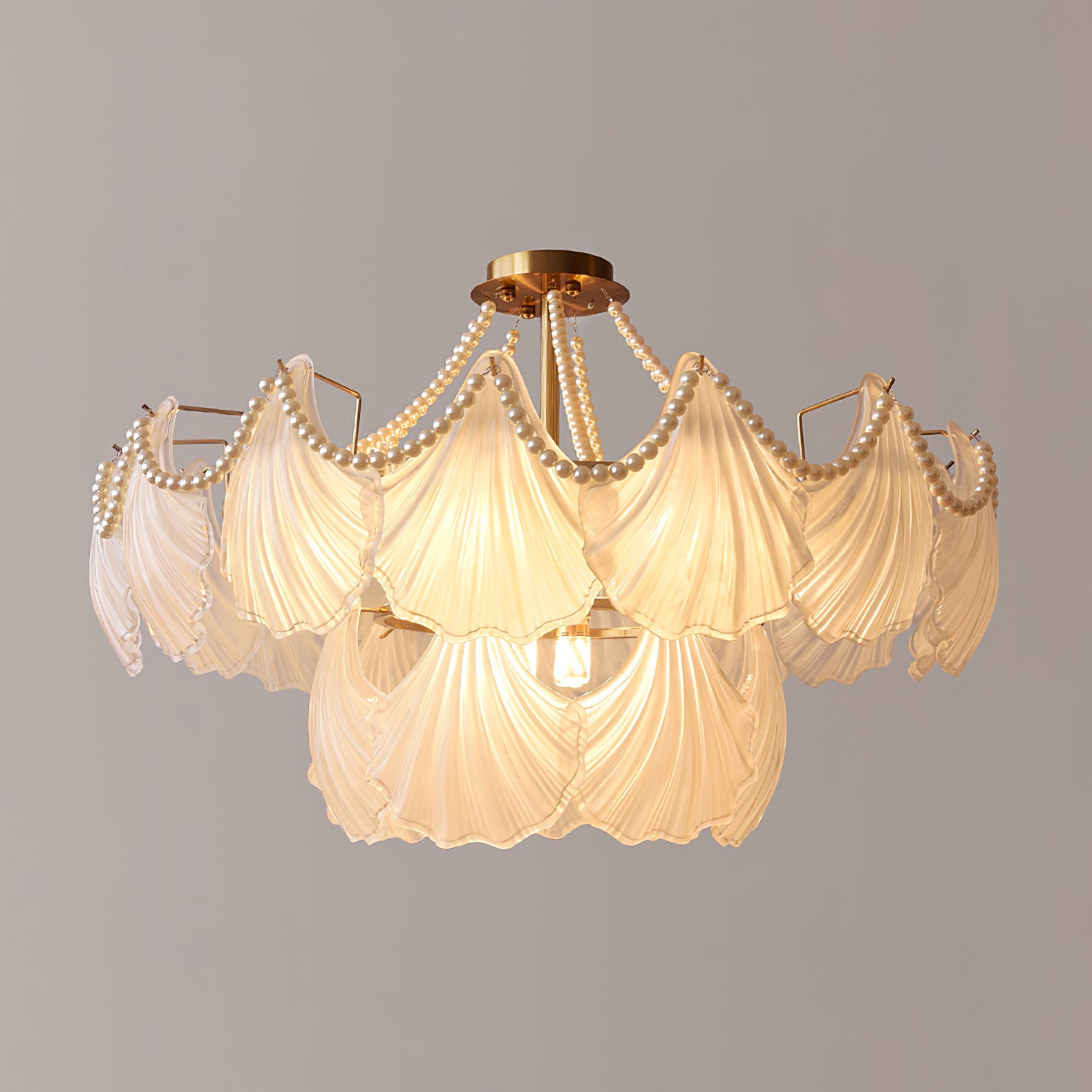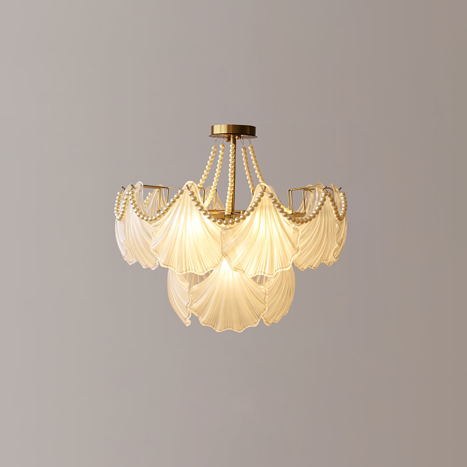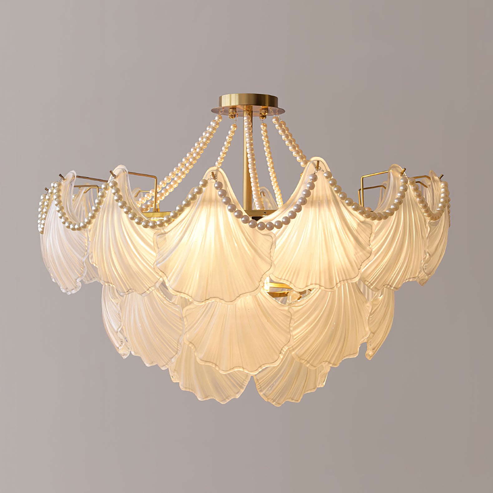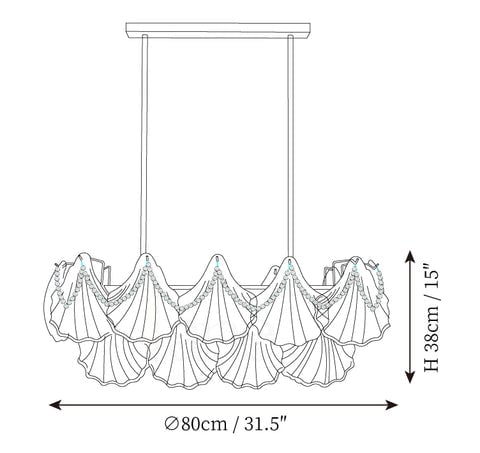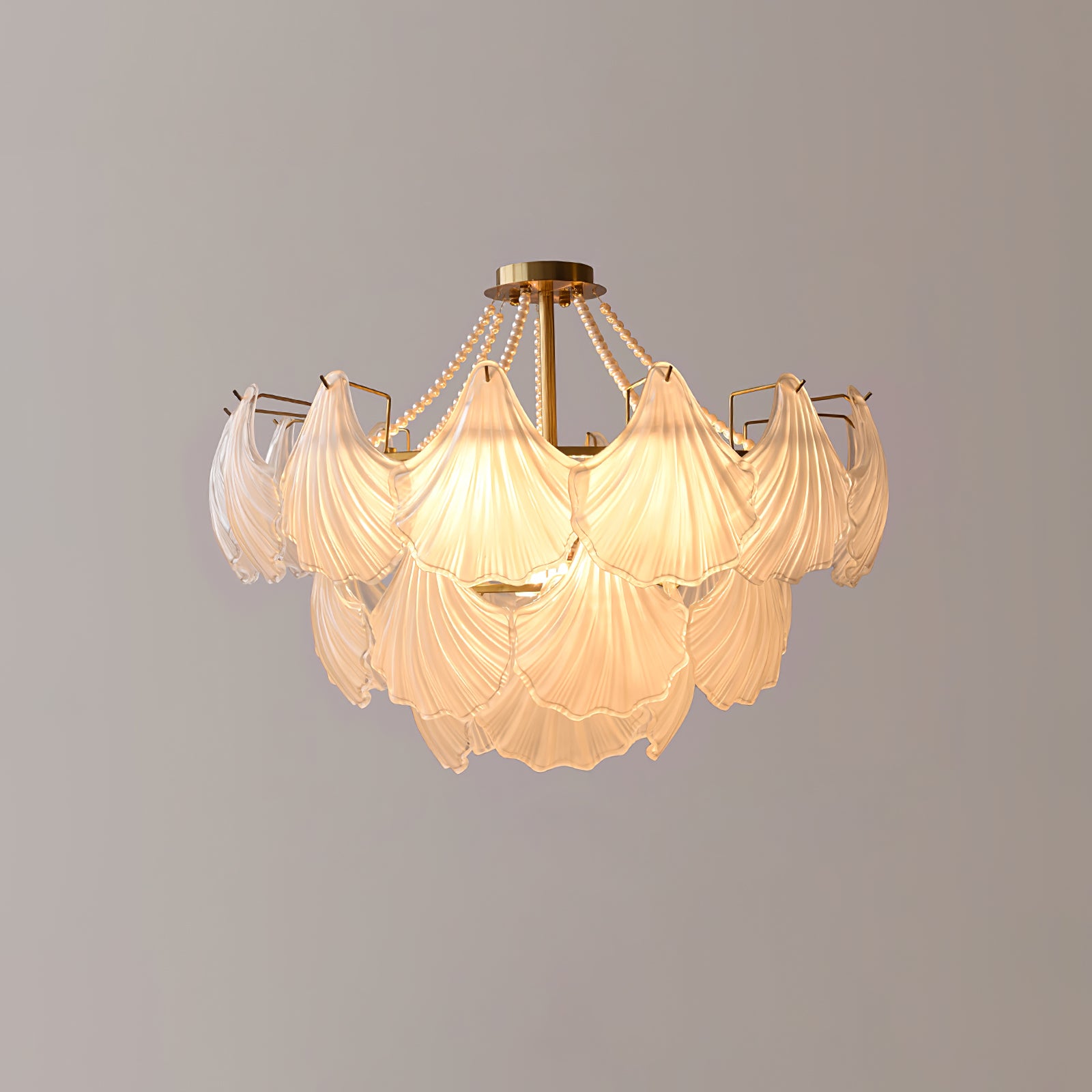 The combination of scallop shape and wrought iron lines and circles reflect the full sense of three-dimensional richness. The lighting design has a sense of hierarchy and depth, and the glass lampshade with diamond texture is comfortable and not dazzling, creating a comfortable light environment.