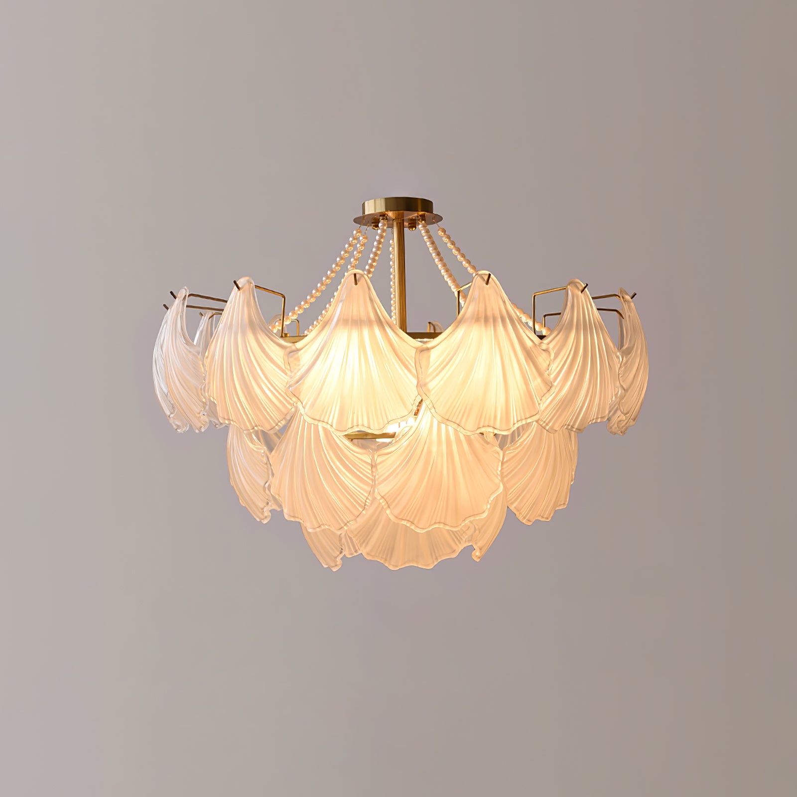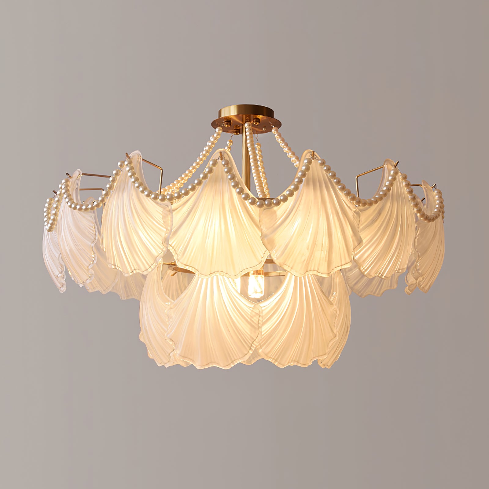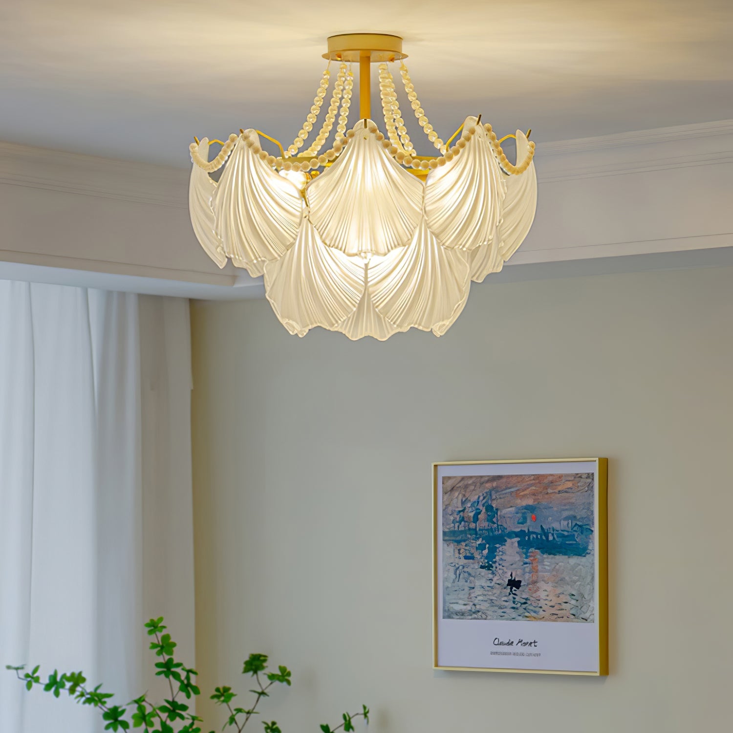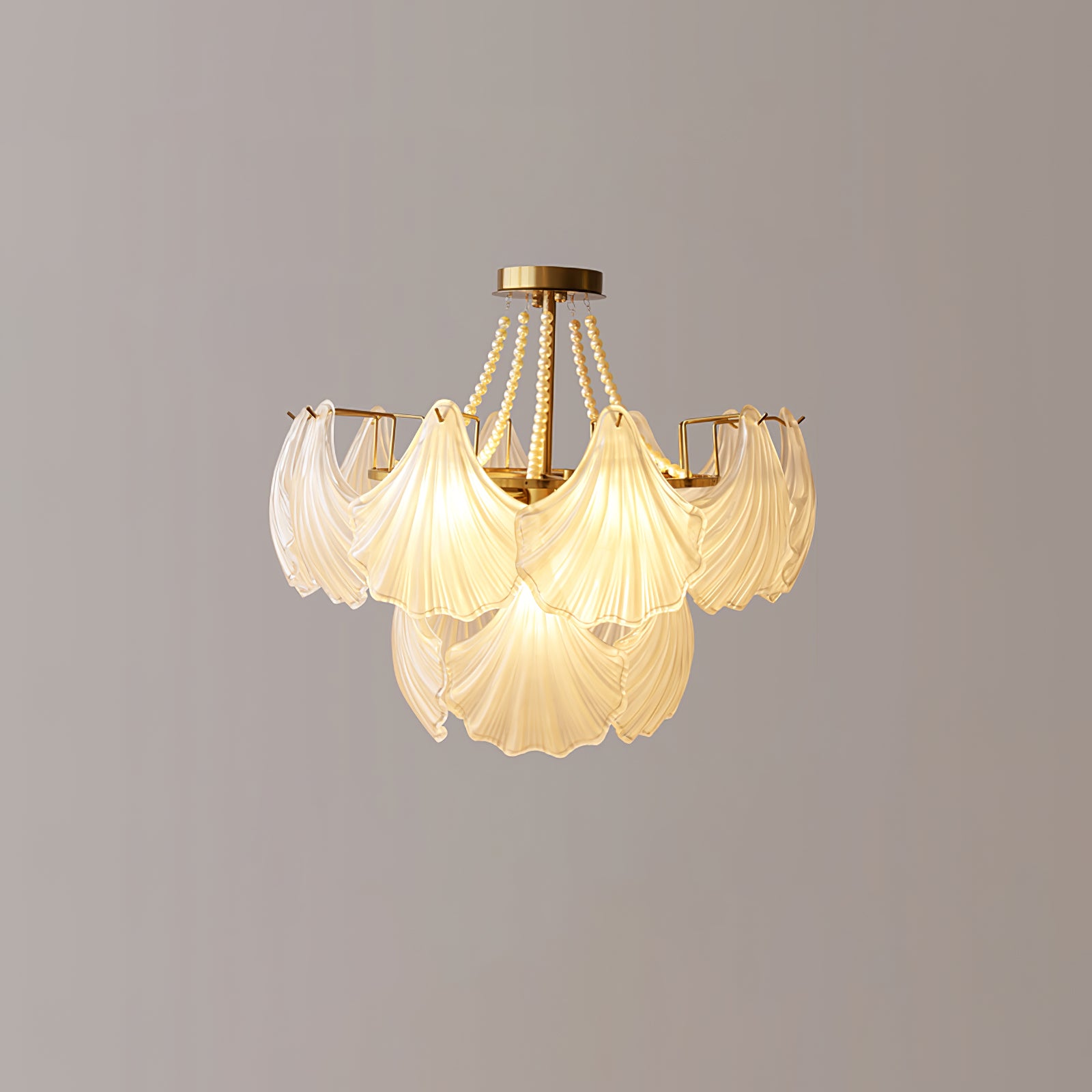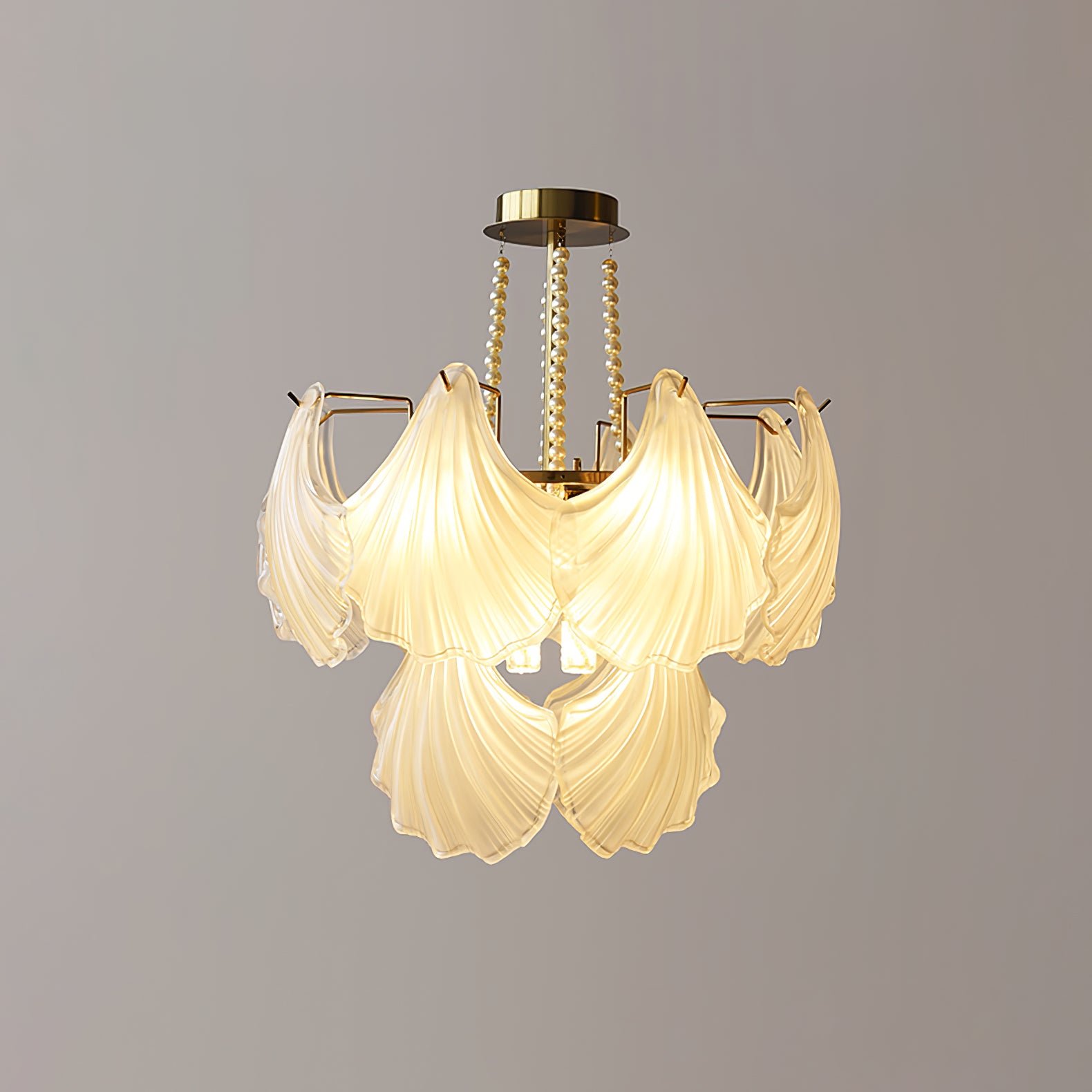 The combination of scallop shape and wrought iron lines and circles reflect the full sense of three-dimensional richness. The lighting design has a sense of hierarchy and depth, and the glass lampshade with diamond texture is comfortable and not dazzling, creating a comfortable light environment.