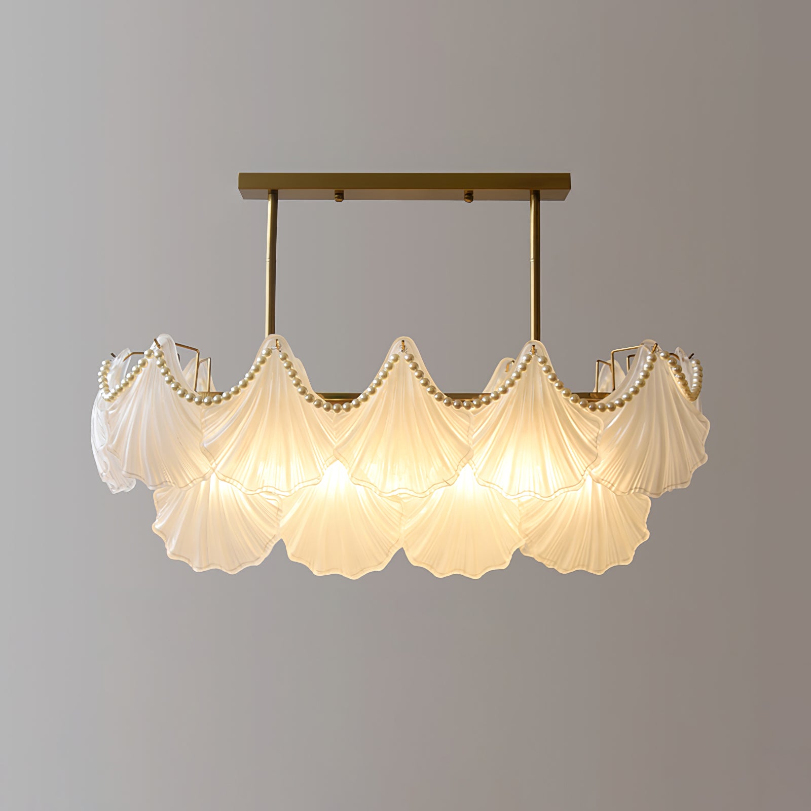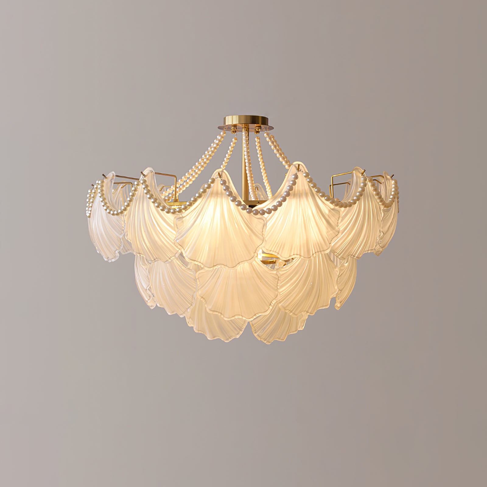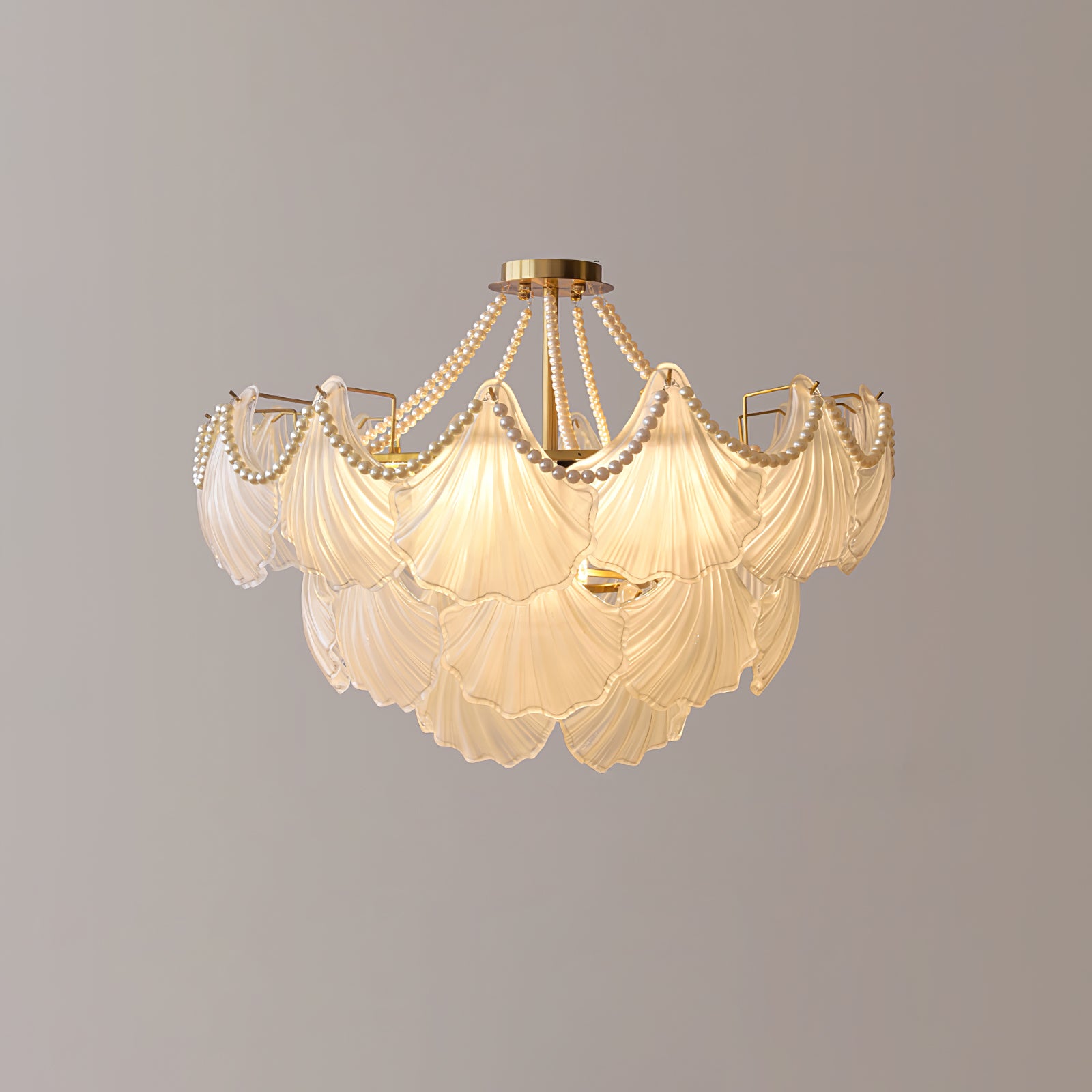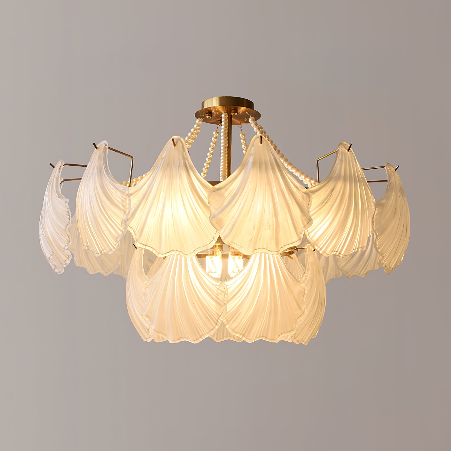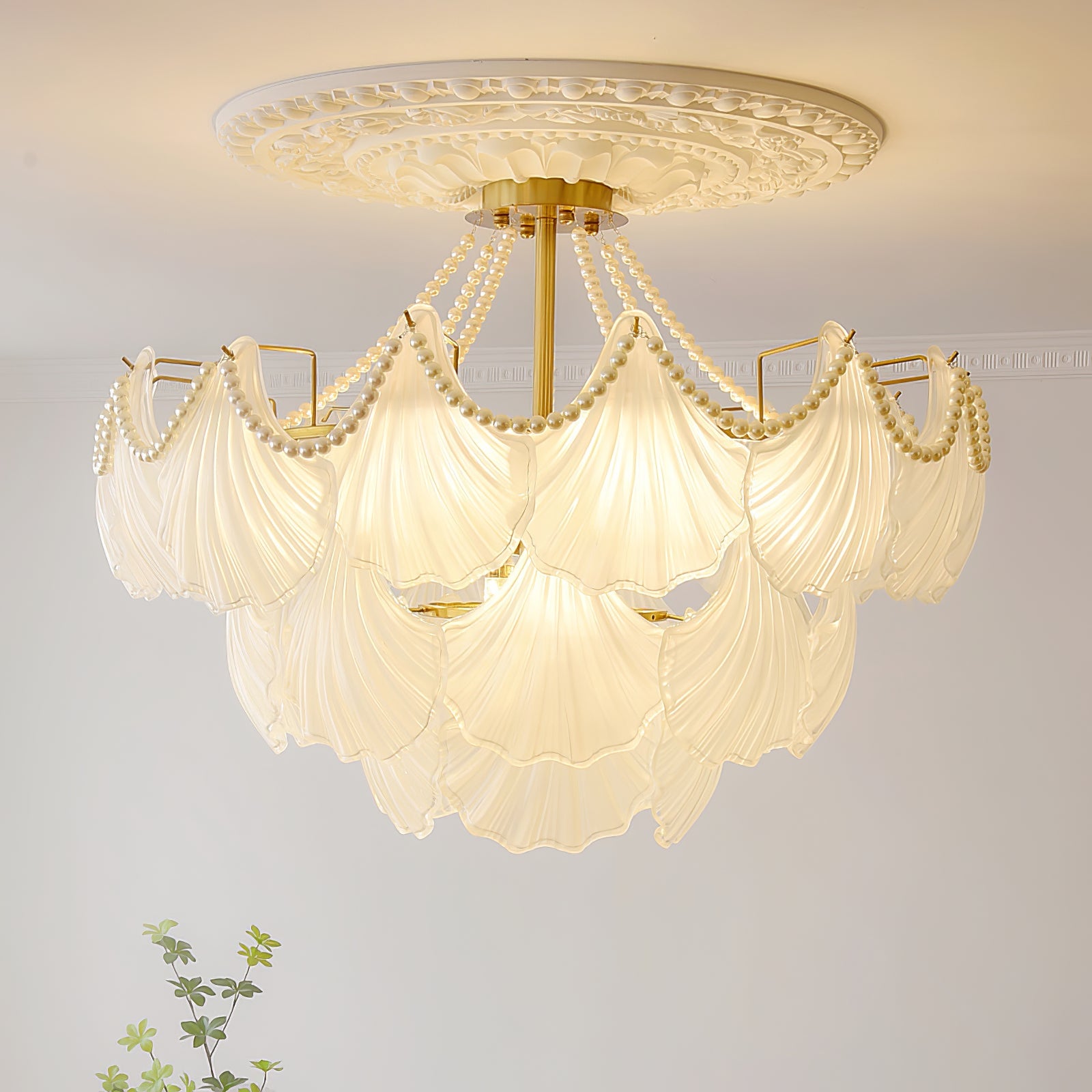 The combination of scallop shape and wrought iron lines and circles reflect the full sense of three-dimensional richness. The lighting design has a sense of hierarchy and depth, and the glass lampshade with diamond texture is comfortable and not dazzling, creating a comfortable light environment.