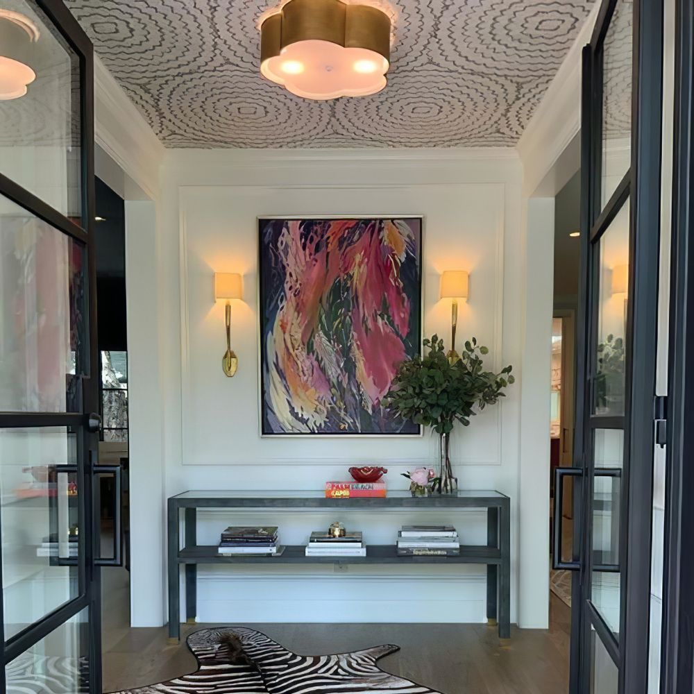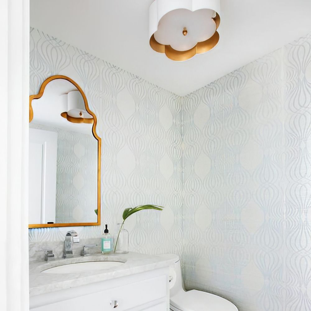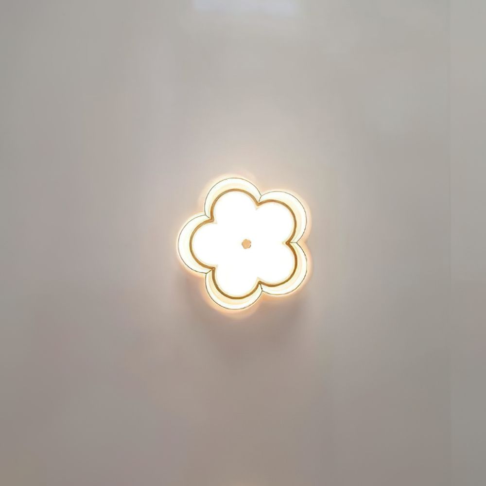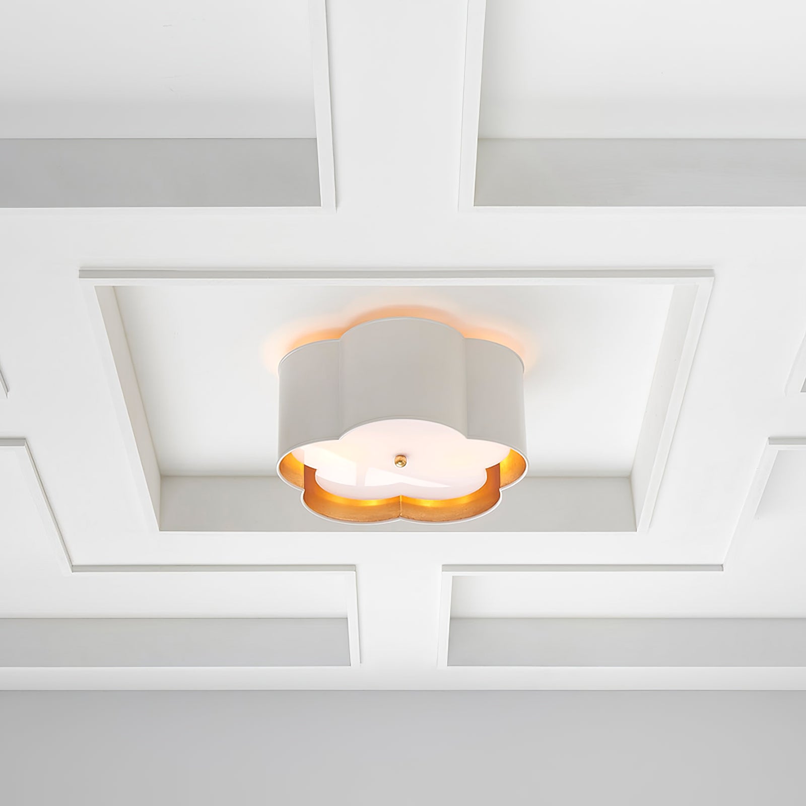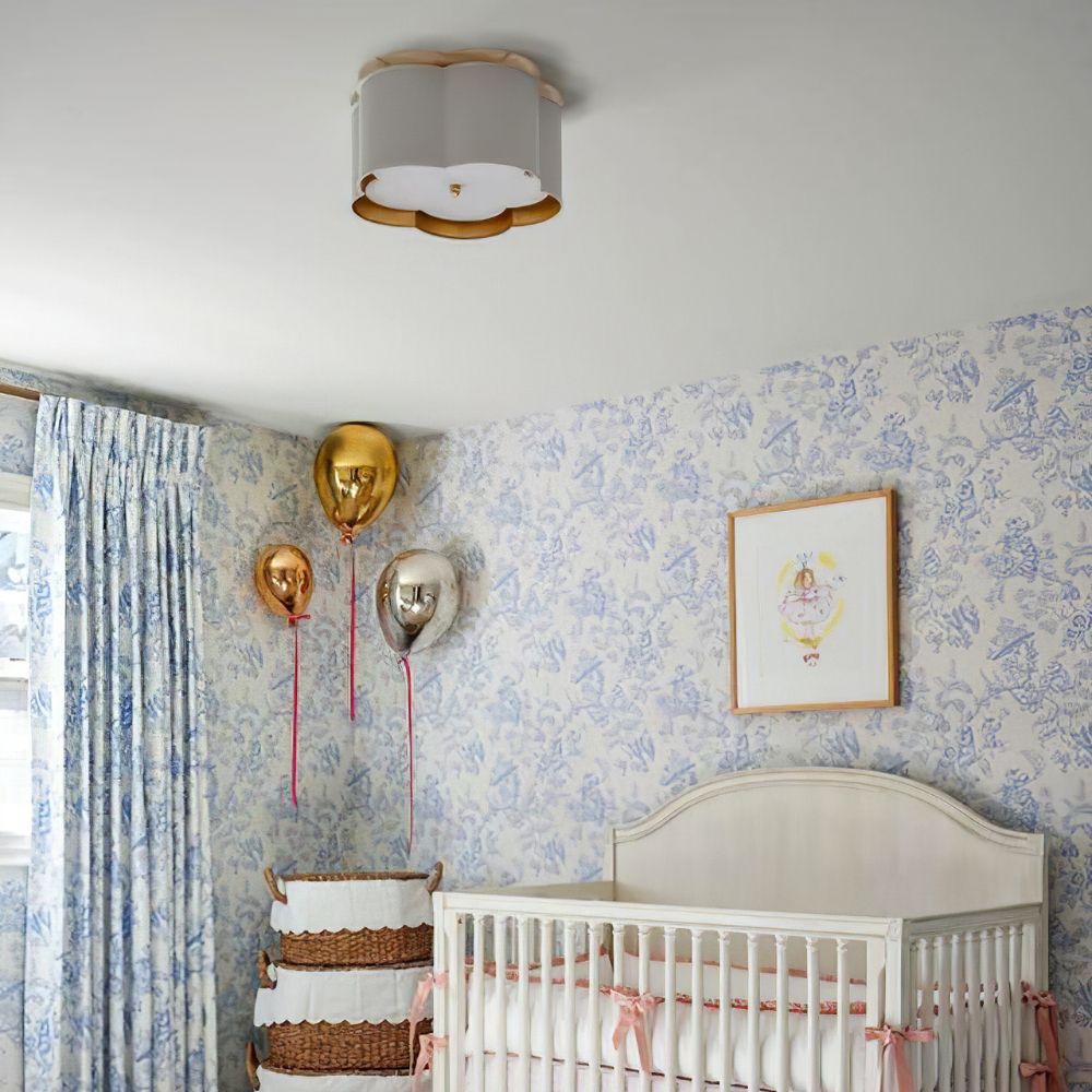 The Scalloped Gold Trim Ceiling Light is a sophisticated and chic ceiling lamp featuring an elegant and modern design. The lampshade is outlined with soft wavy lines, showcasing a unique decorative quality. The outline, reminiscent of four-leaf petals, evokes natural and romantic elements. The exterior of the lamp is adorned in pure white tones, which lend simplicity and elegance, while the lining is embellished with a golden decorative layer, adding a touch of luxury to the overall design, all while emitting a warm golden glow when illuminated.