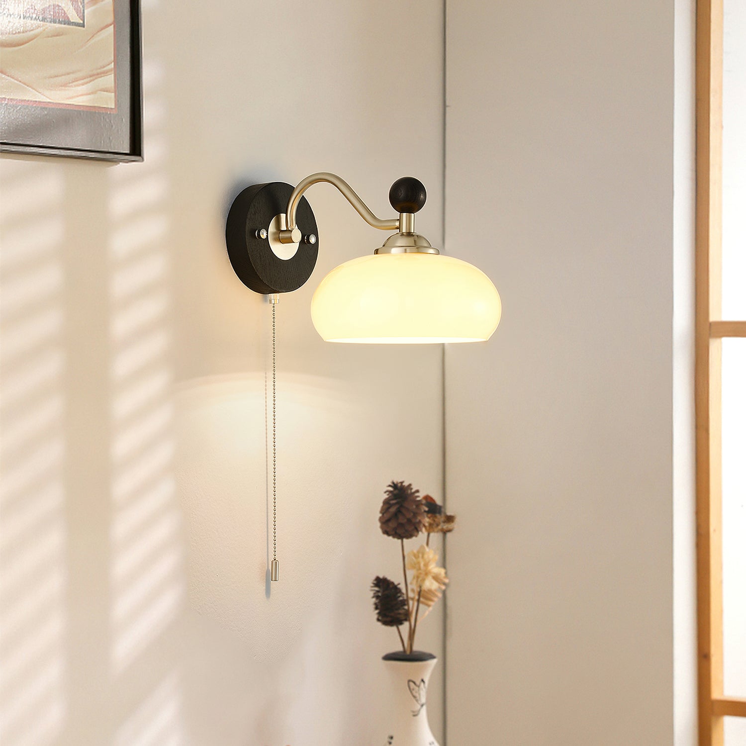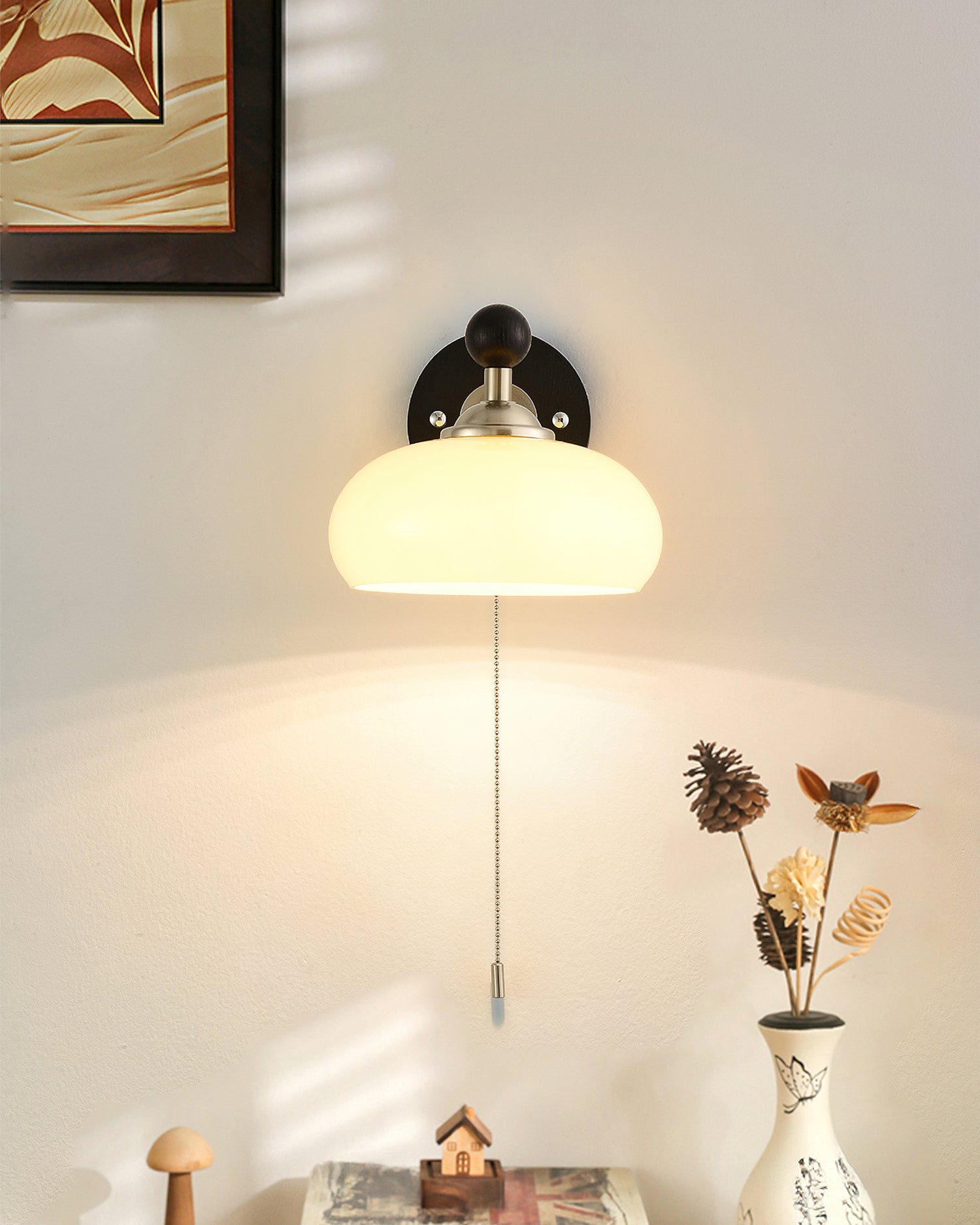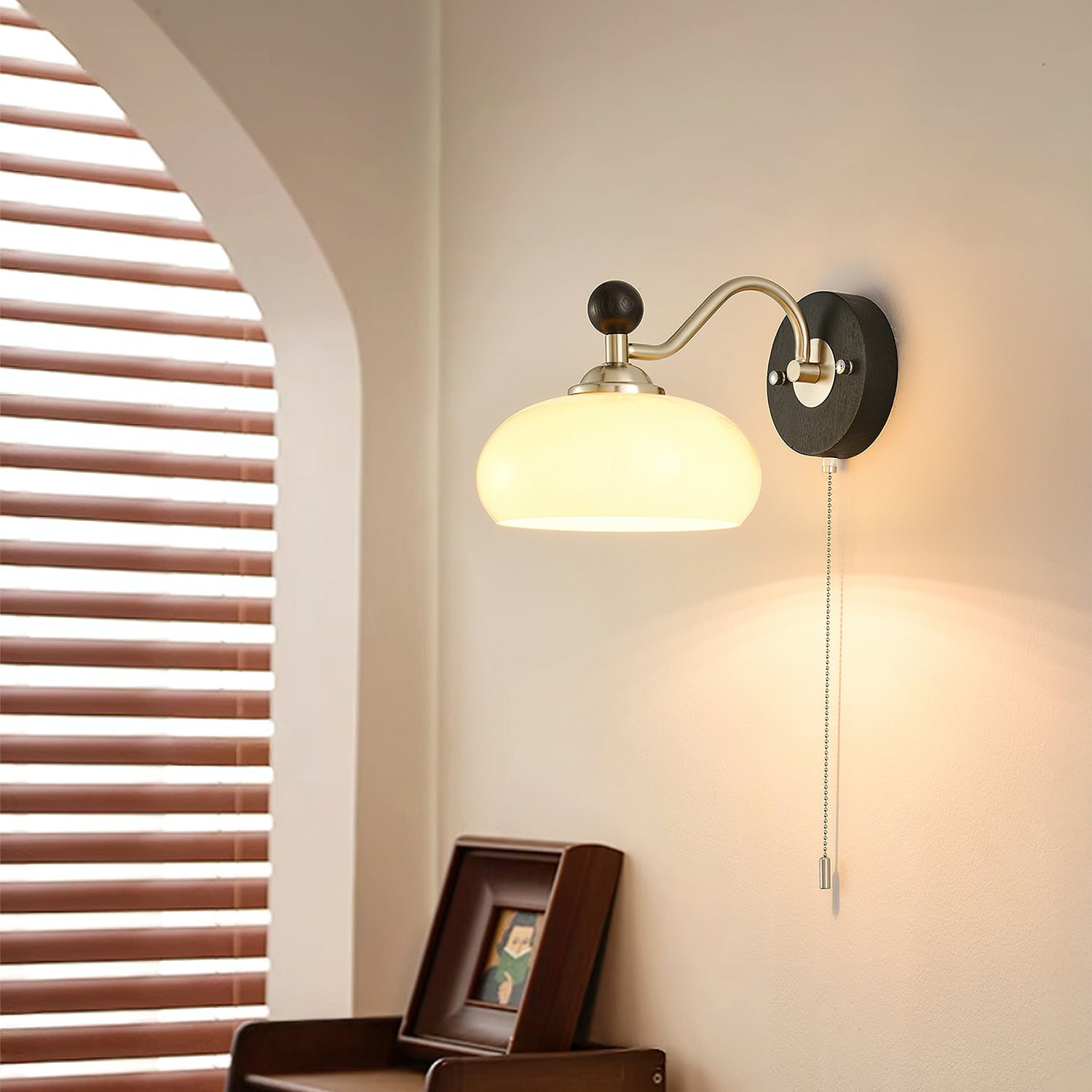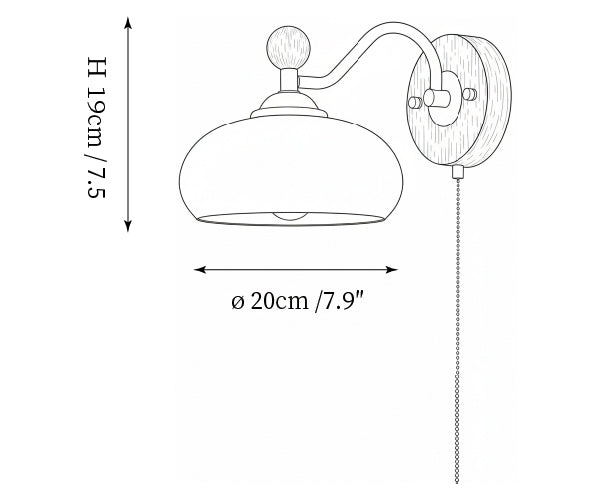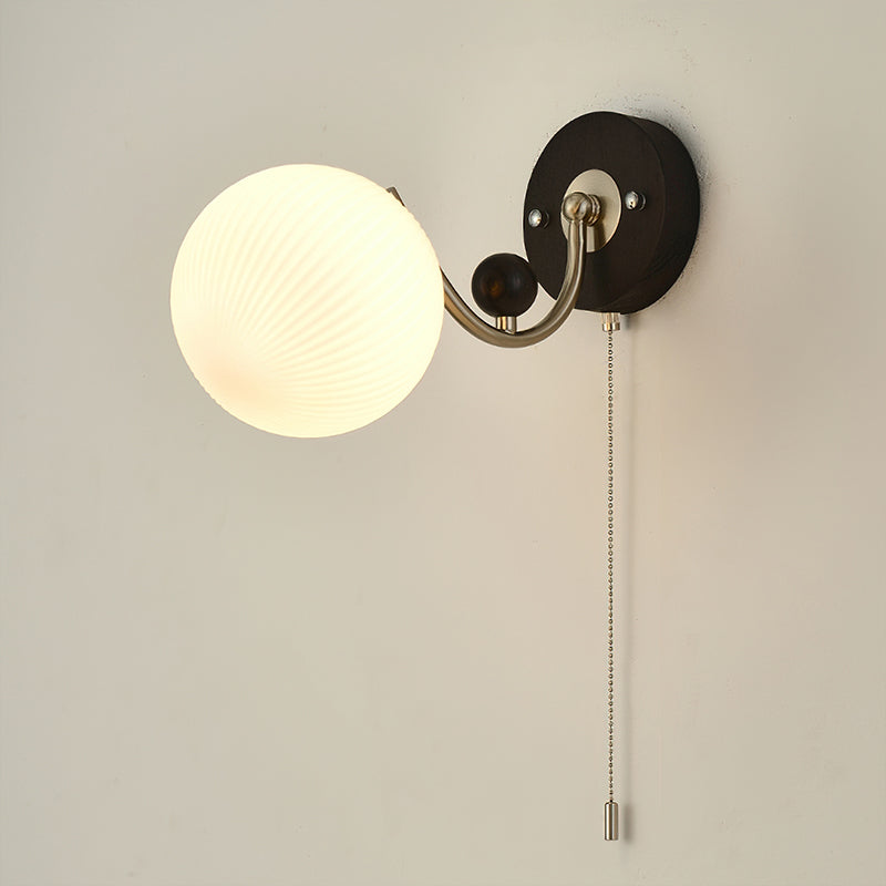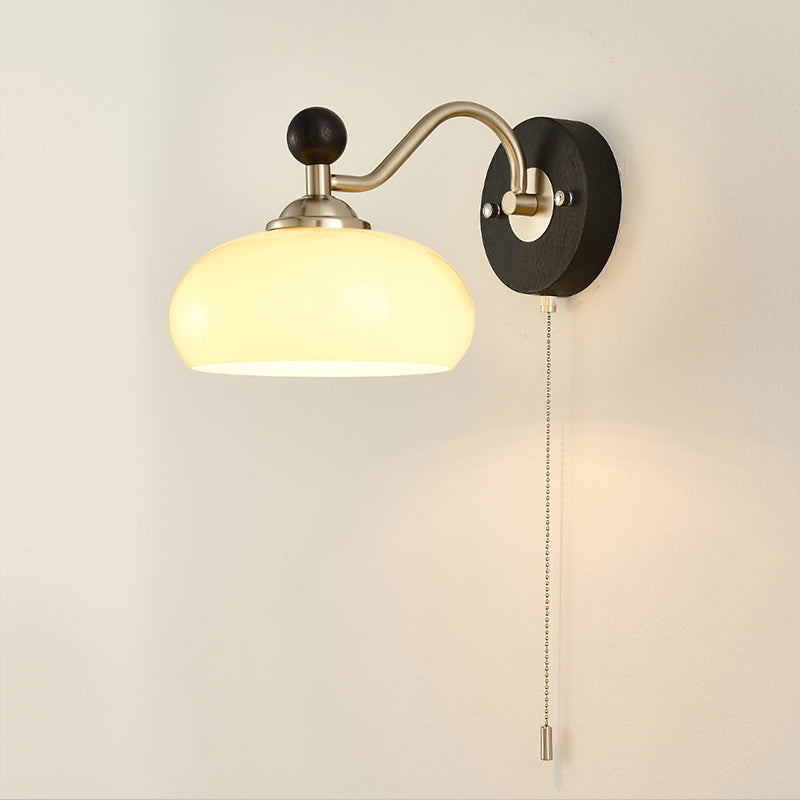 The Serelli Wall Lamp from Mooijane blends industrial and organic elements with sleek design. A round dark wood base supports a metal arm and a softly curved glass shade that diffuses warm light, while the pull-chain switch adds a vintage touch. Perfect for reading corners, bedside walls, or living spaces, it provides functional lighting with sophisticated style.