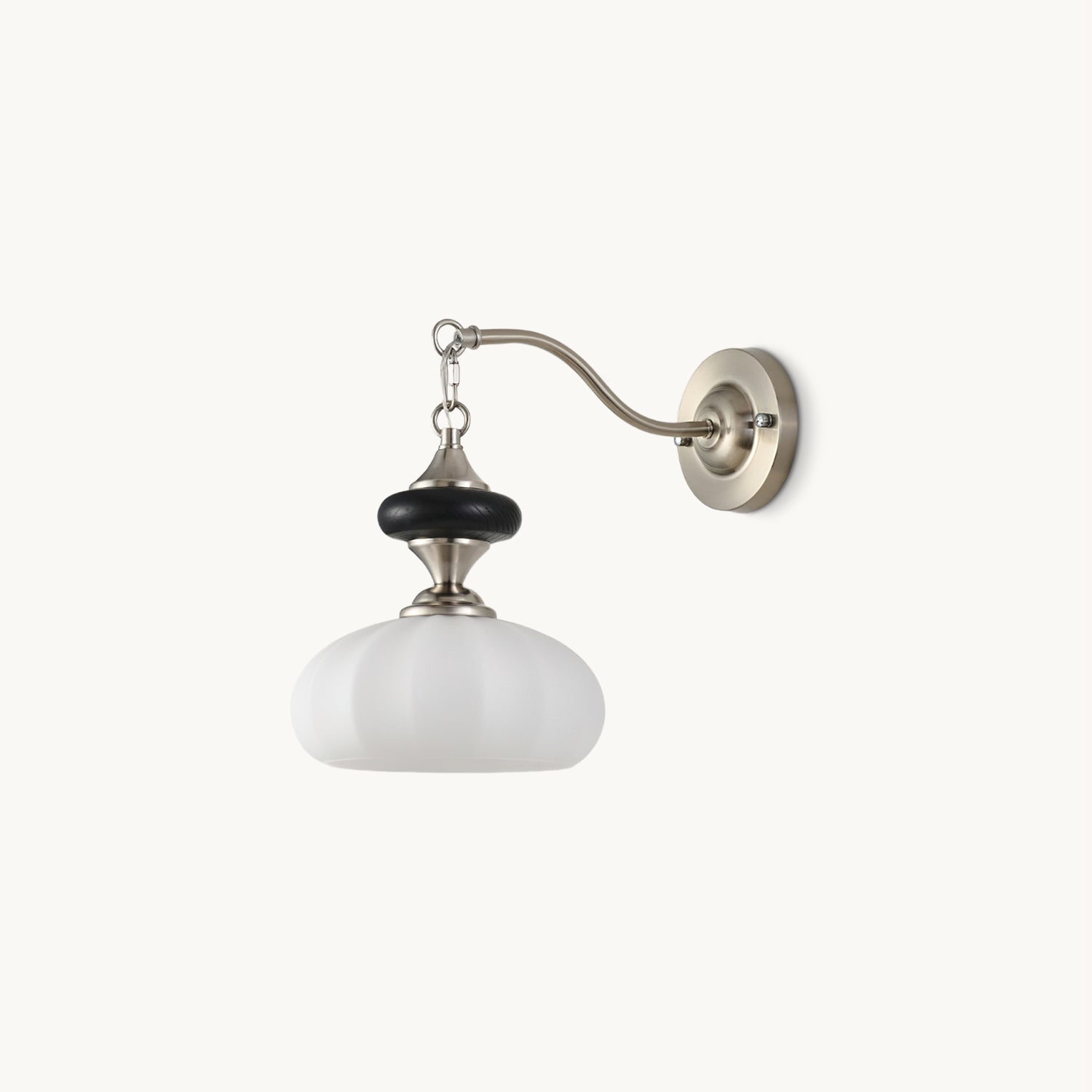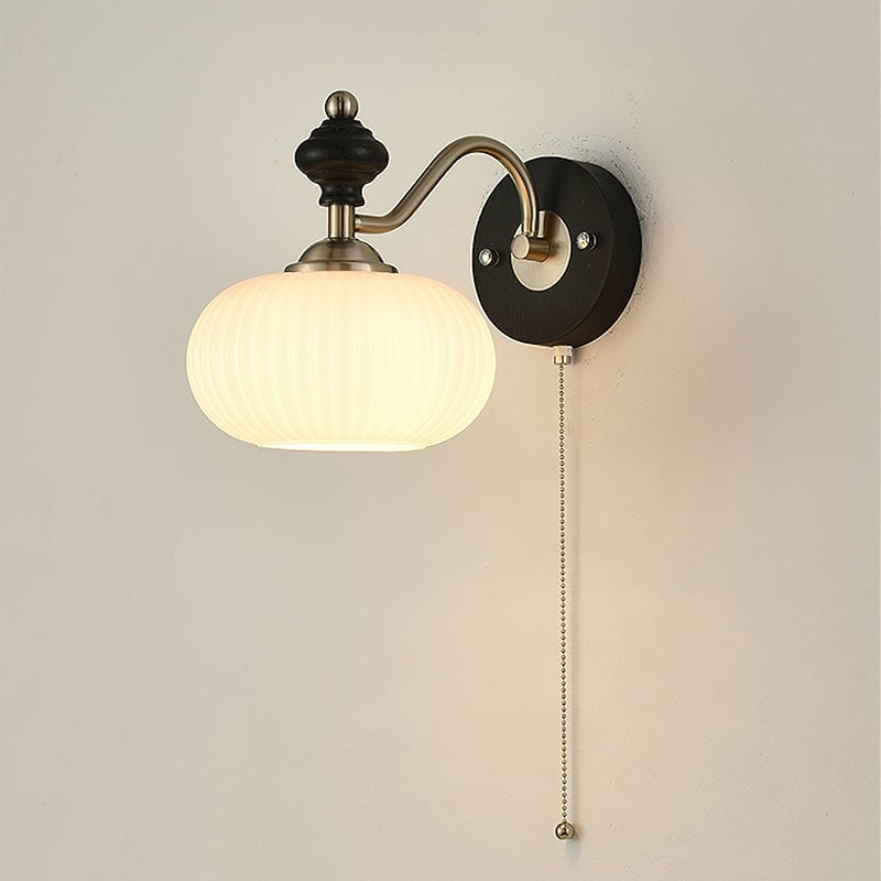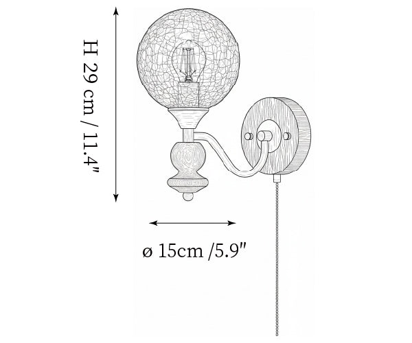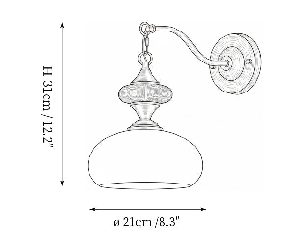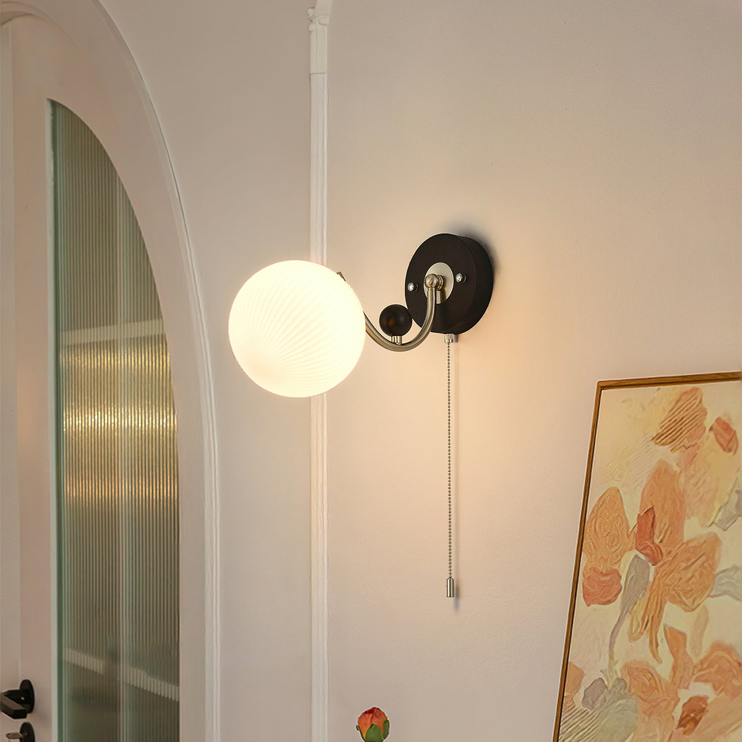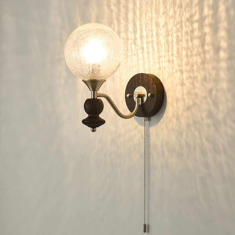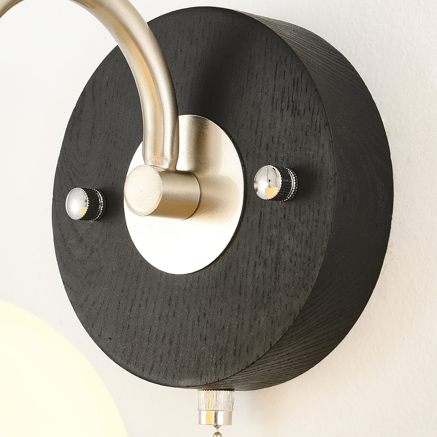 The Serelli Wall Lamp from Mooijane blends industrial and organic elements with sleek design. A round dark wood base supports a metal arm and a softly curved glass shade that diffuses warm light, while the pull-chain switch adds a vintage touch. Perfect for reading corners, bedside walls, or living spaces, it provides functional lighting with sophisticated style.