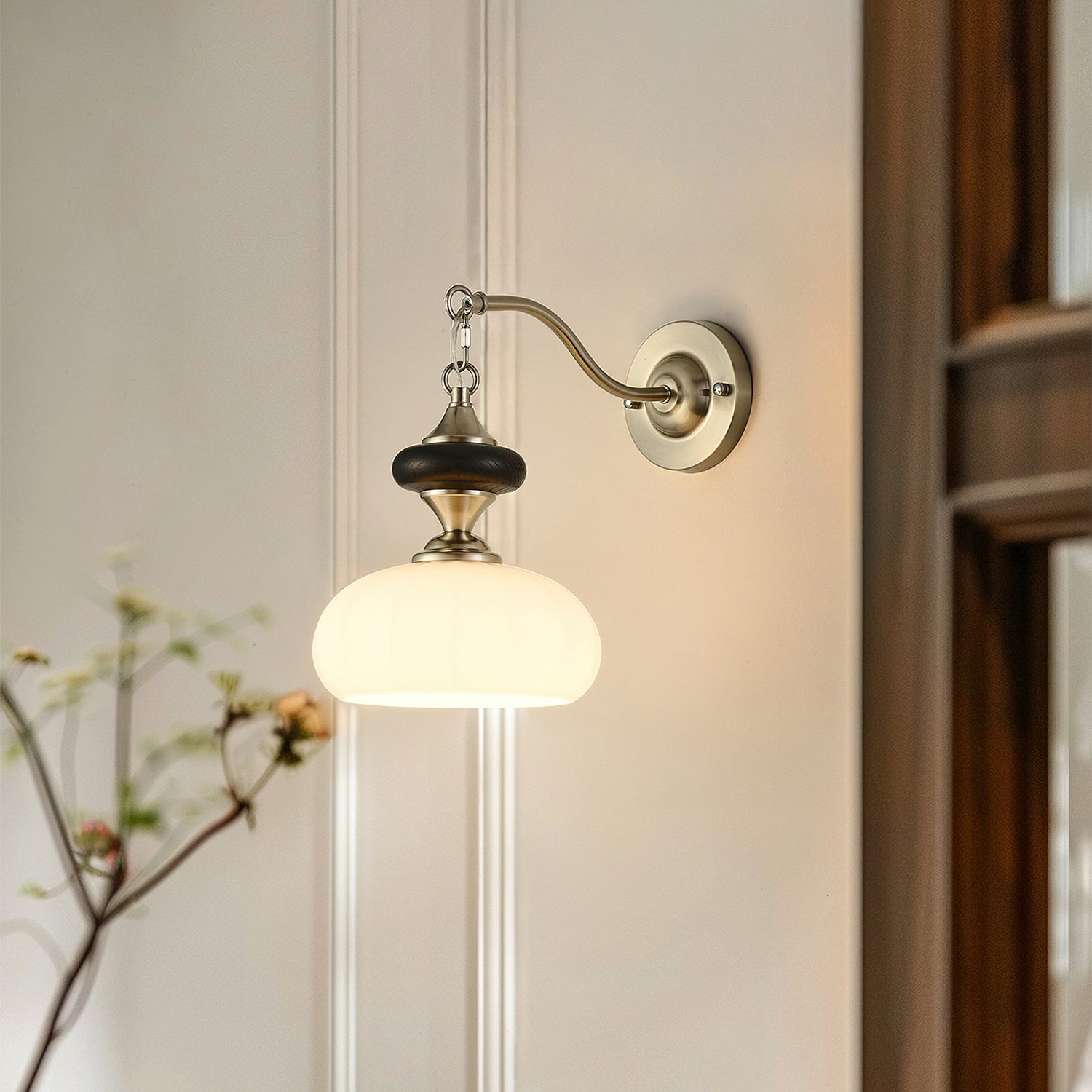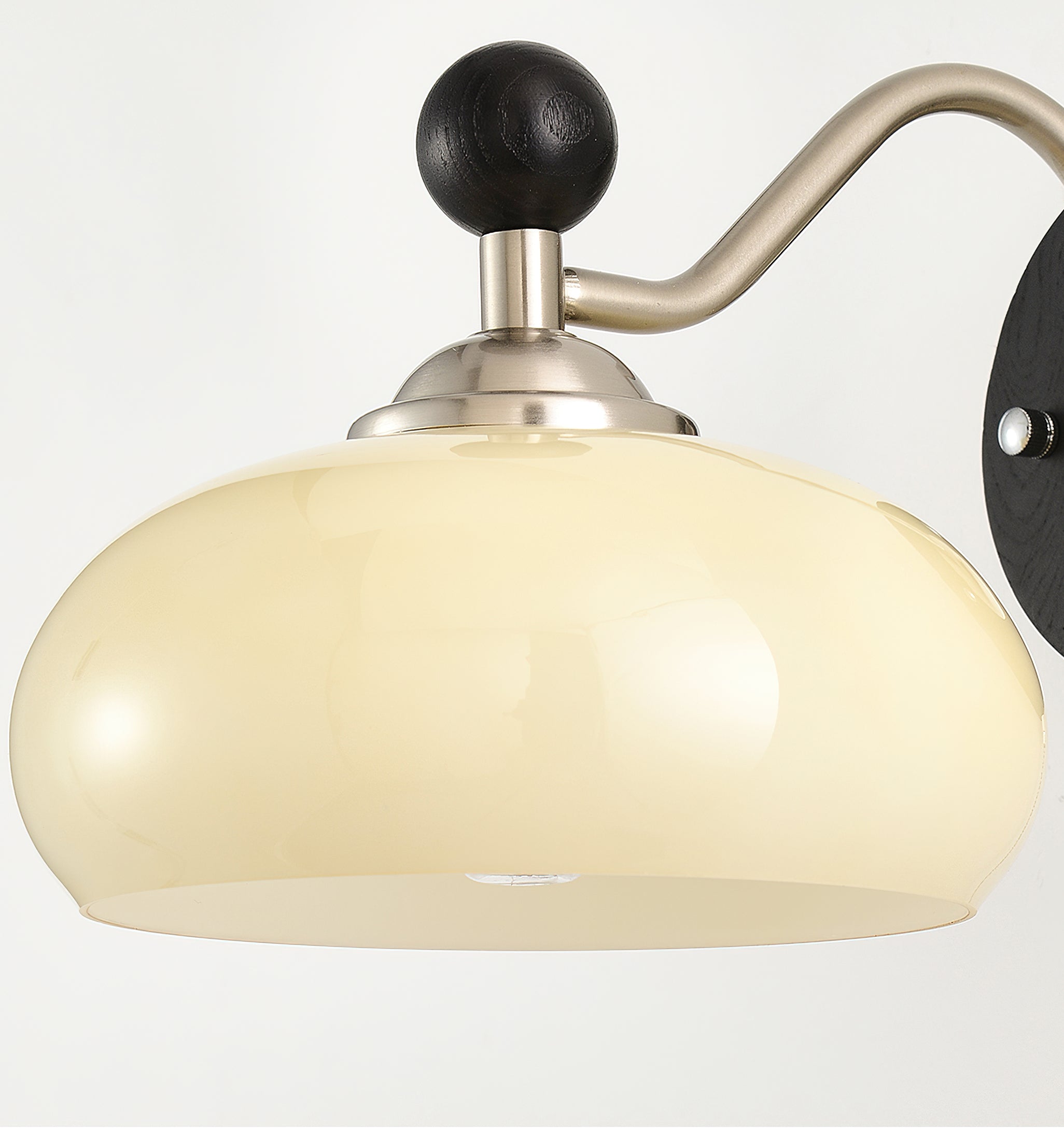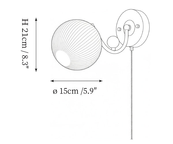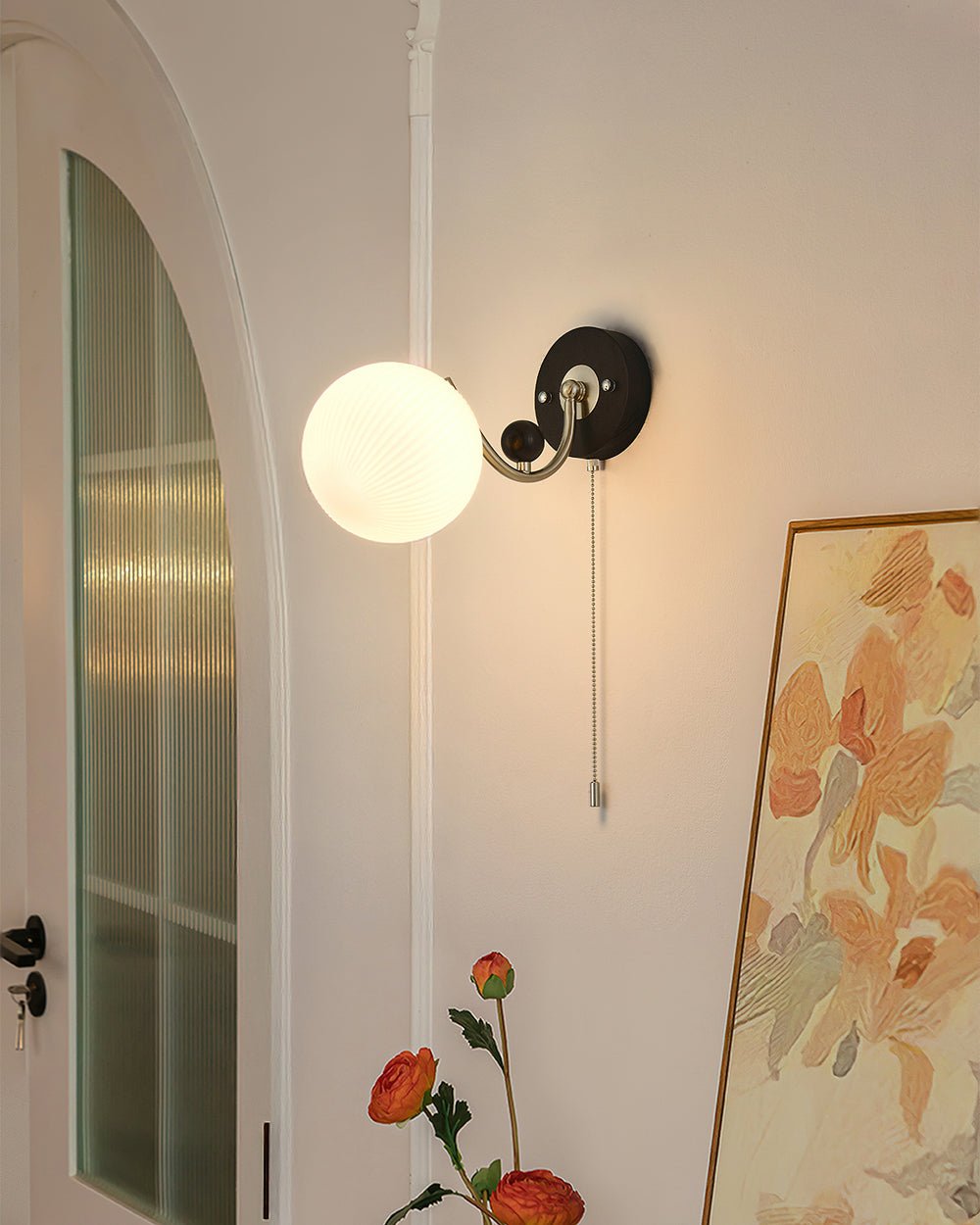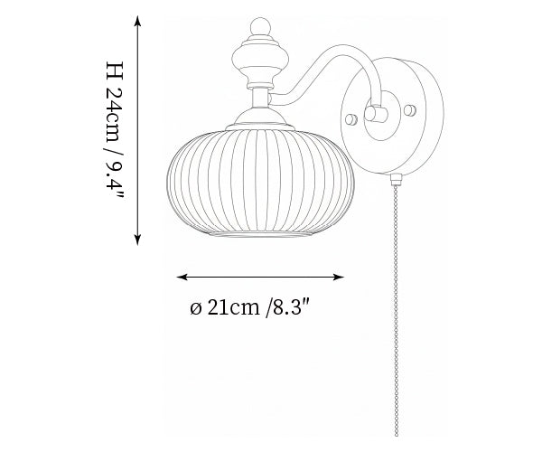 The Serelli Wall Lamp from Mooijane blends industrial and organic elements with sleek design. A round dark wood base supports a metal arm and a softly curved glass shade that diffuses warm light, while the pull-chain switch adds a vintage touch. Perfect for reading corners, bedside walls, or living spaces, it provides functional lighting with sophisticated style.