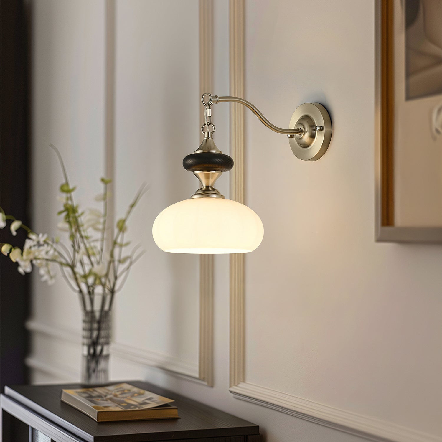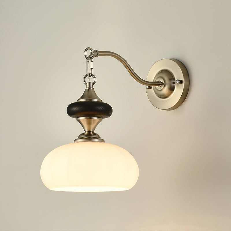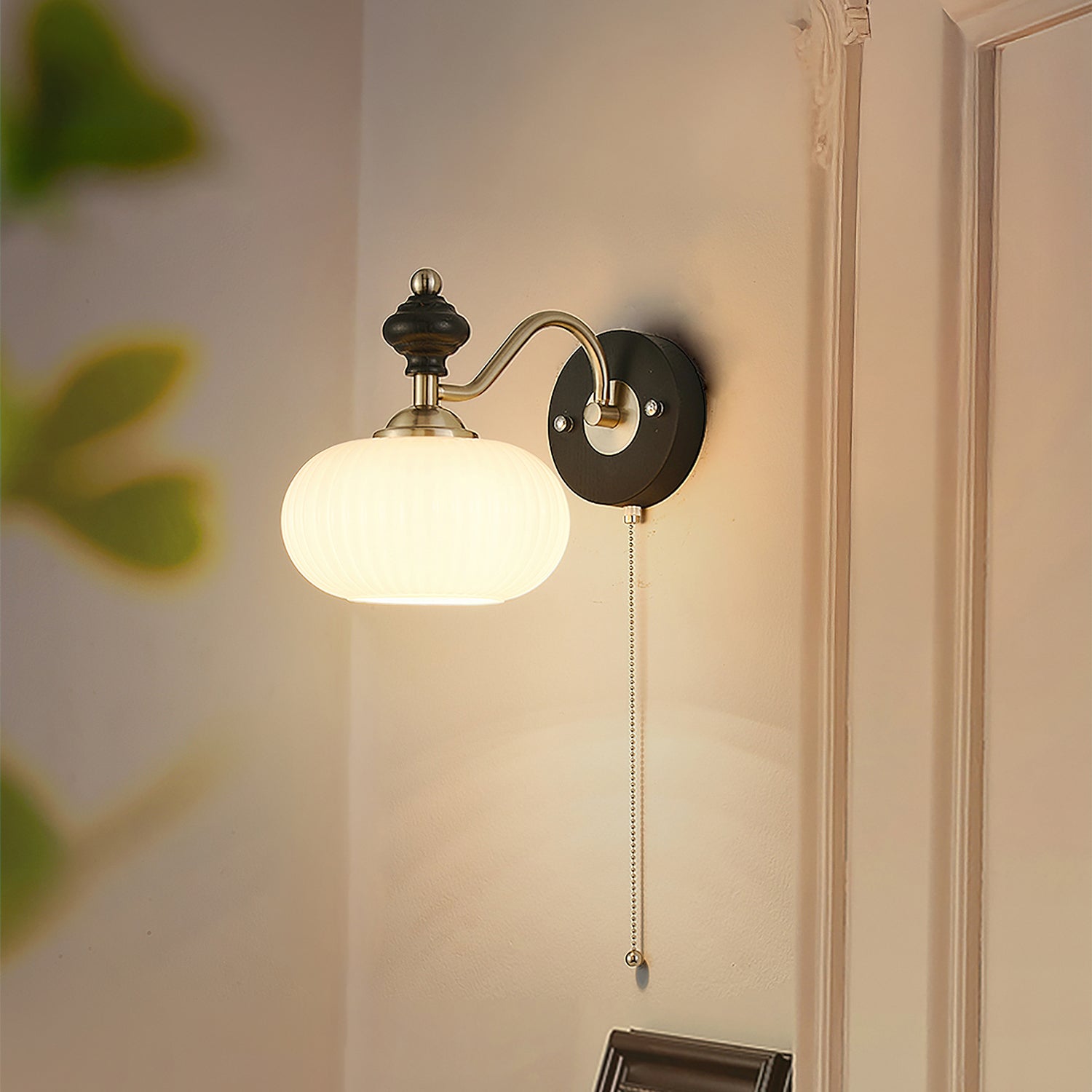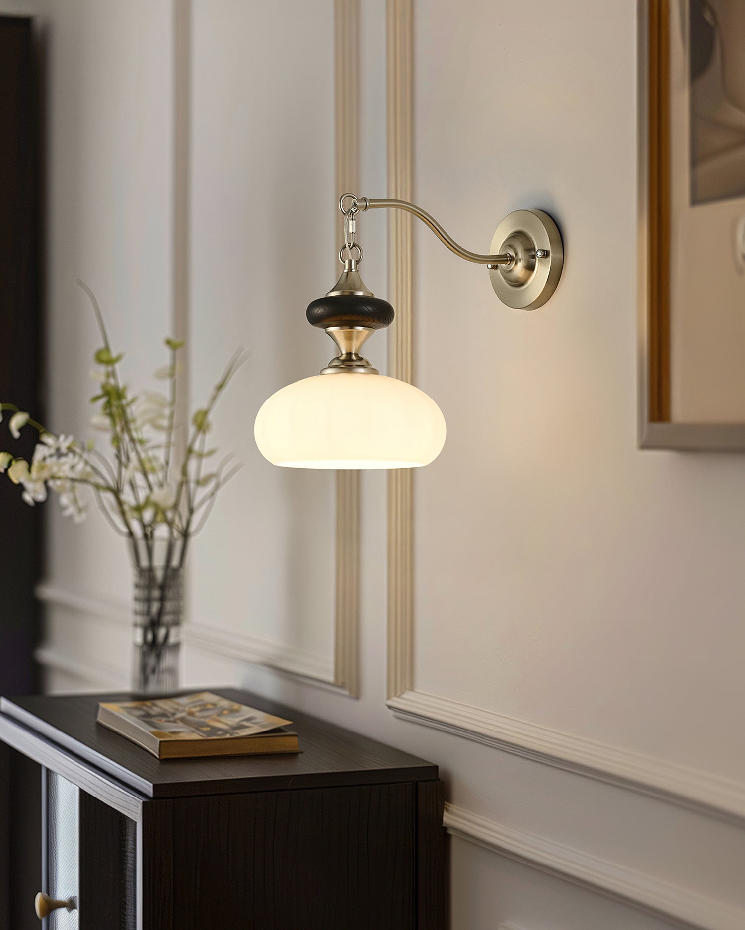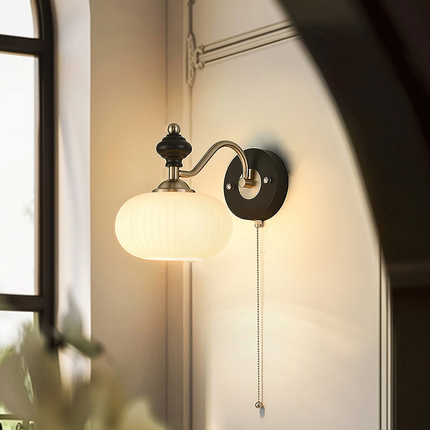 The Serelli Wall Lamp from Mooijane blends industrial and organic elements with sleek design. A round dark wood base supports a metal arm and a softly curved glass shade that diffuses warm light, while the pull-chain switch adds a vintage touch. Perfect for reading corners, bedside walls, or living spaces, it provides functional lighting with sophisticated style.