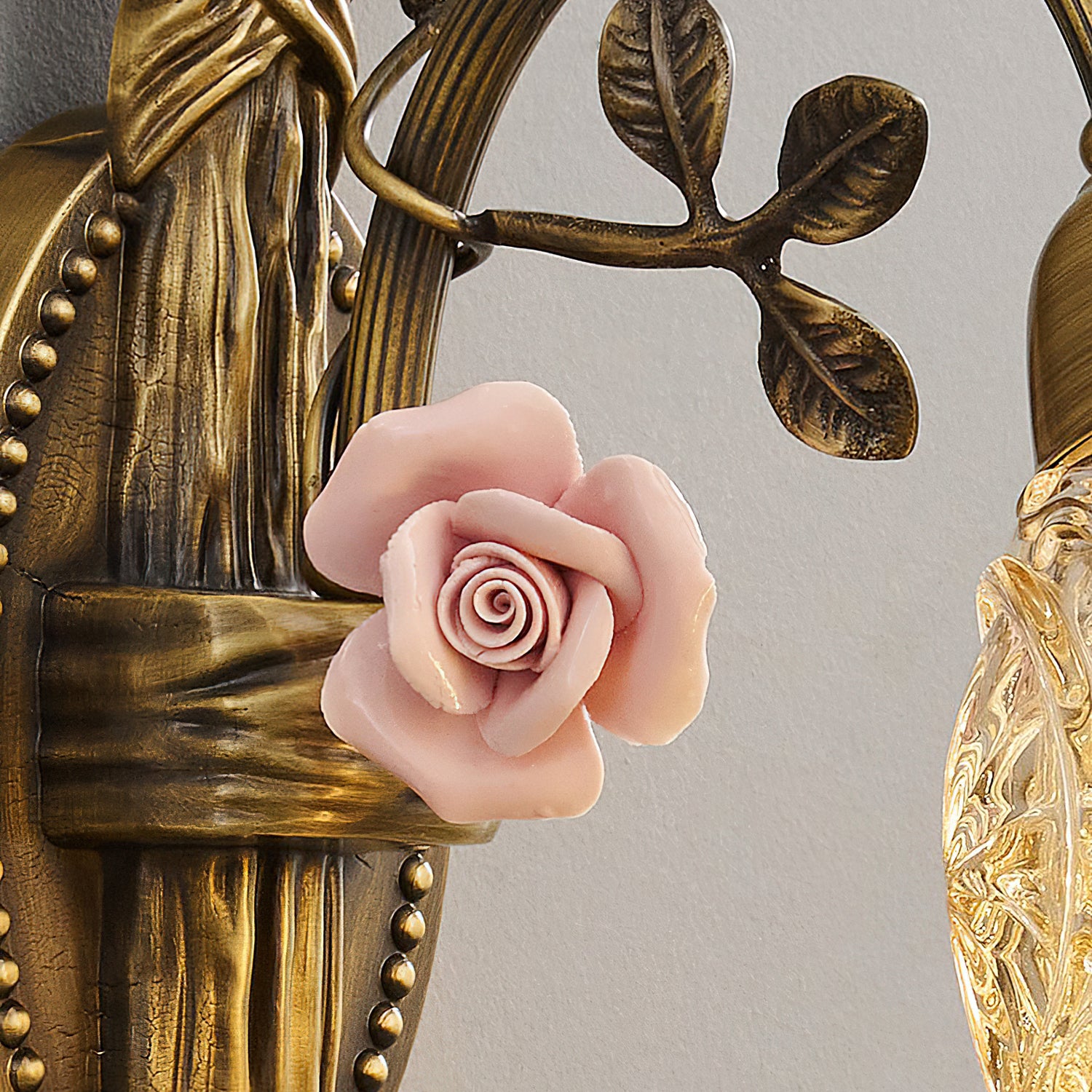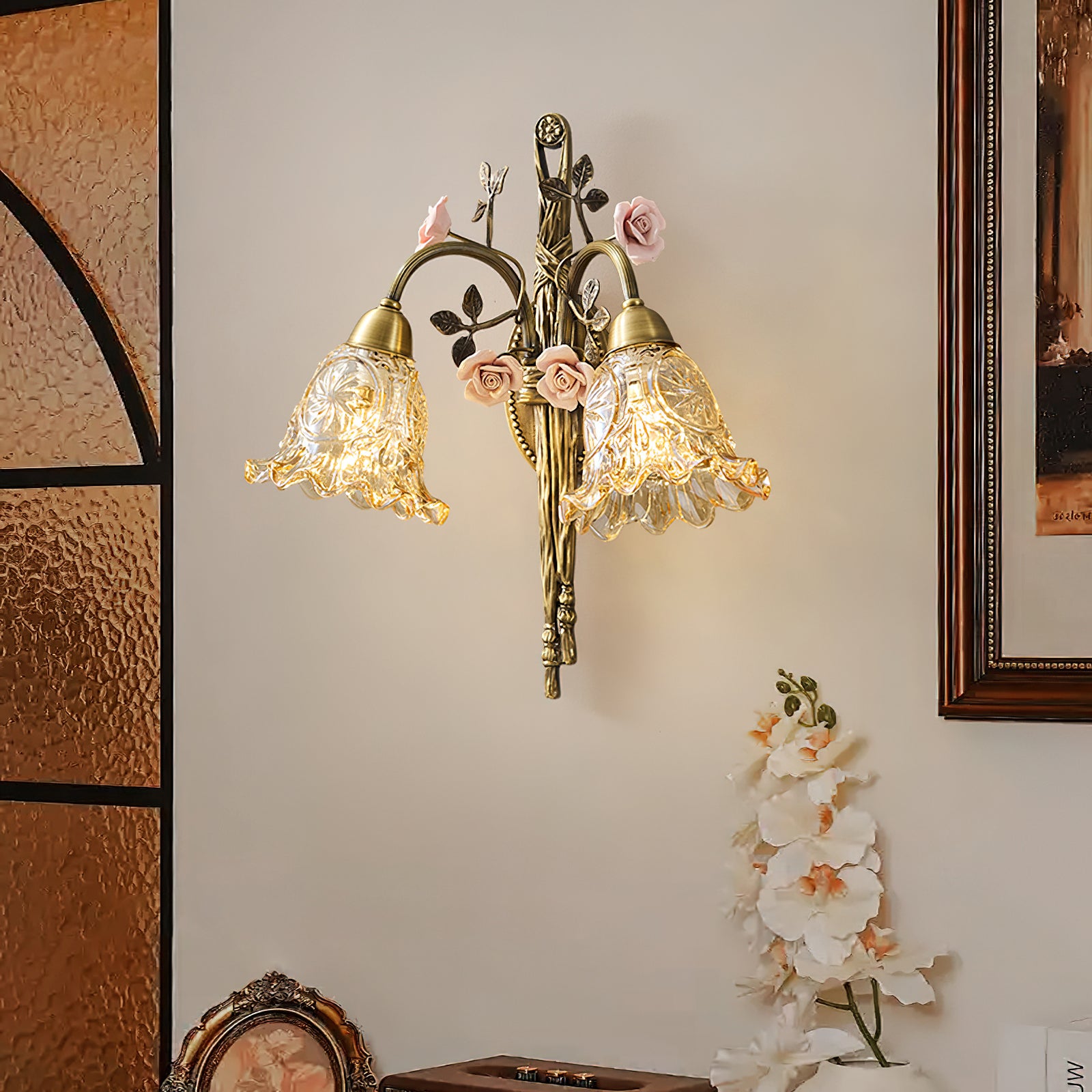The Serivon Wall Lamp by Mooijane captures the grace of blooming florals through its blend of brass and glass craftsmanship. Sculpted brass branches with delicately detailed leaves and soft pink blossoms create a romantic, French-inspired charm. Embossed glass shades with petal-like edges gently diffuse the light, casting a warm, dreamy glow. Ideal for bedrooms, hallways, or living spaces, this wall lamp brings a touch of poetic elegance to any interior.