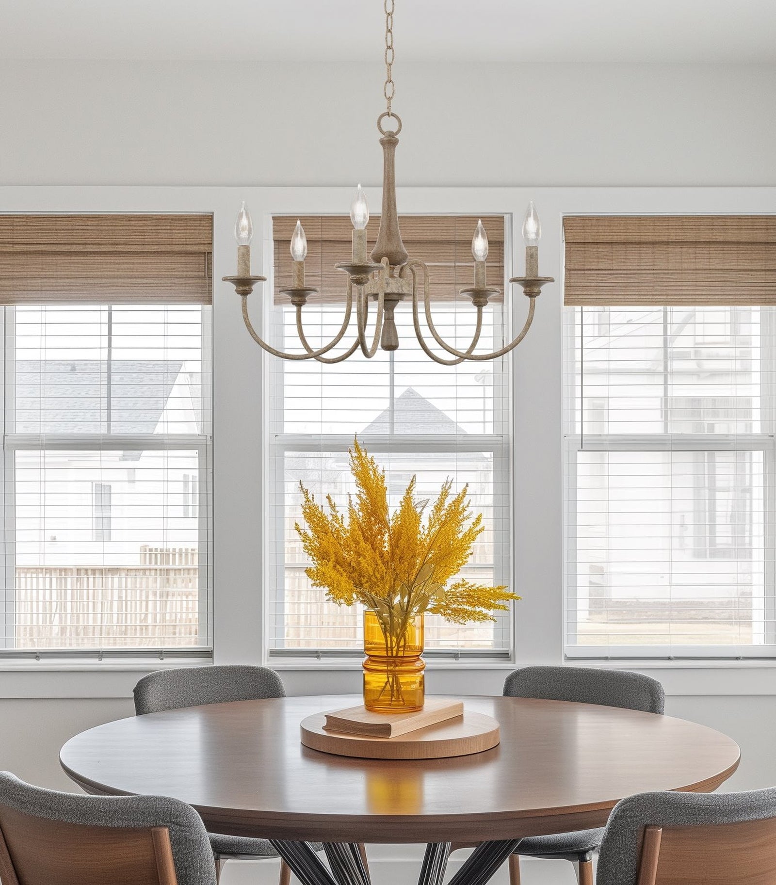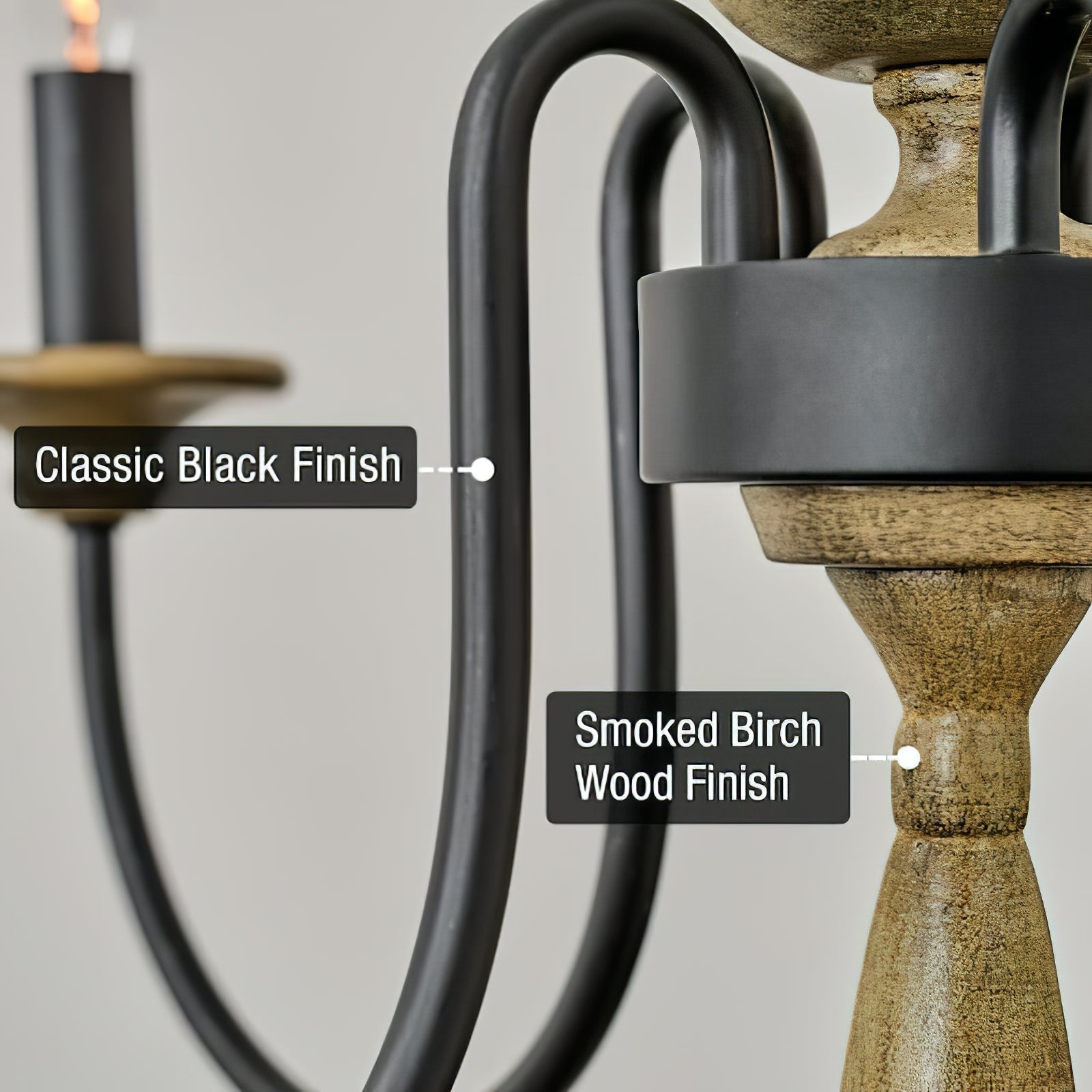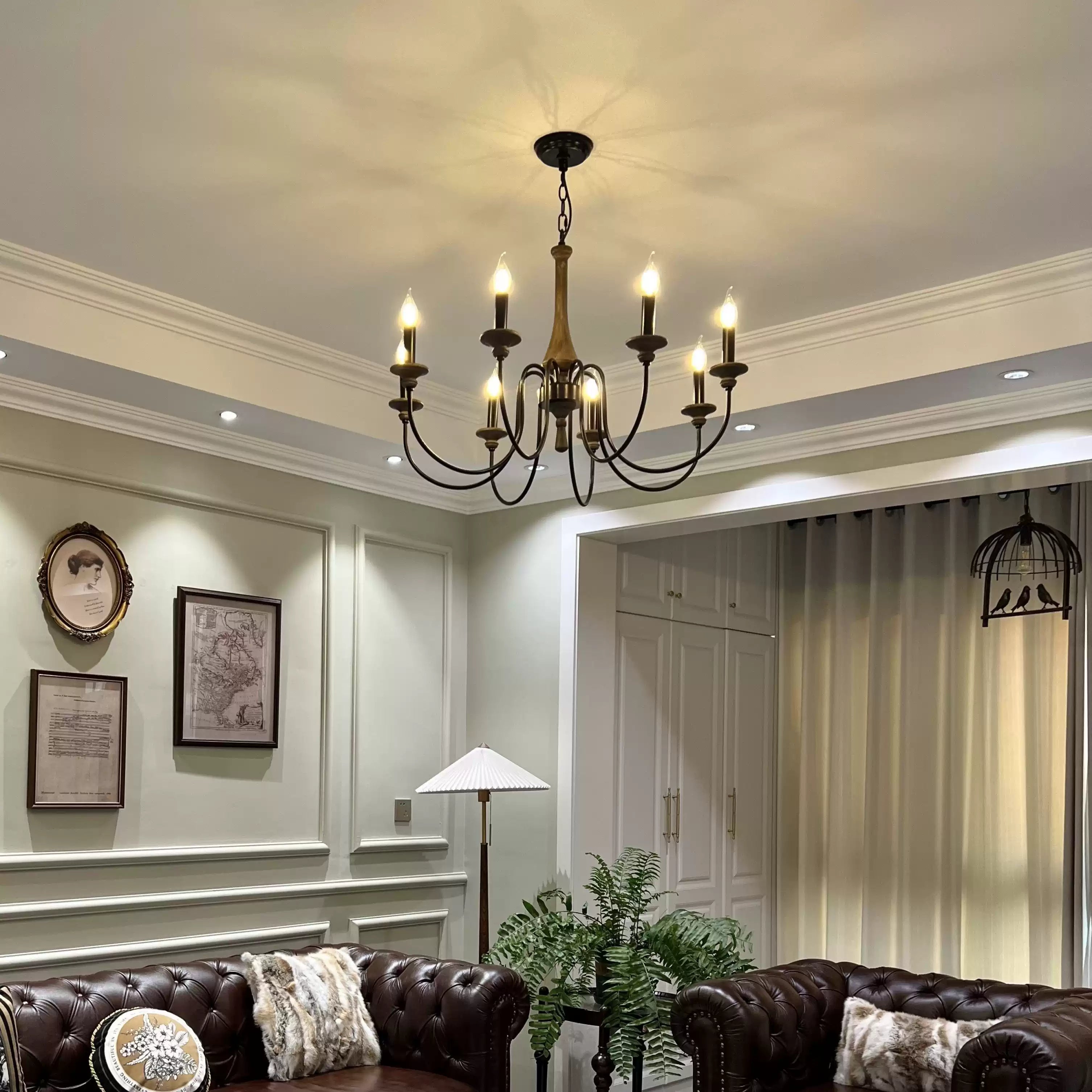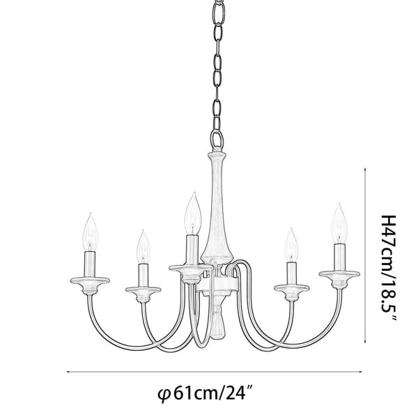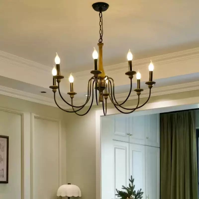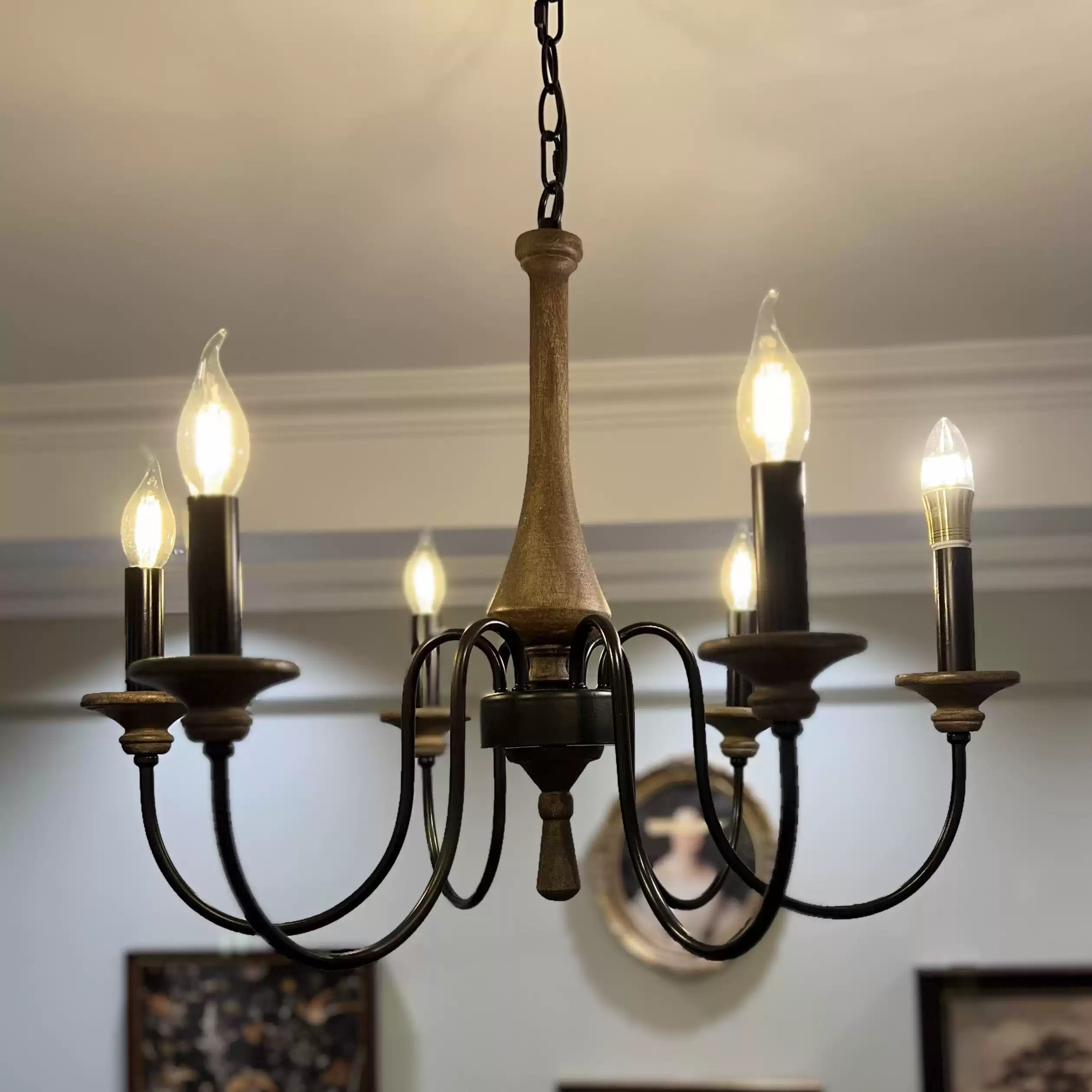 This Shebrew Country Chandelier embodies rustic charm with its wood-toned central column and gracefully curved black metal arms, delivering a cozy, traditional aesthetic. The six candle-style light holders, complete with faux flame-tipped bulbs, evoke a vintage feel, while the blend of natural wood and metal offers a perfect harmony of rustic and industrial design. Ideal for dining rooms or living areas, this chandelier casts a warm, inviting glow, making it an excellent choice for farmhouse or classic interiors. The chain suspension further enhances its vintage appeal, making it a standout centerpiece.