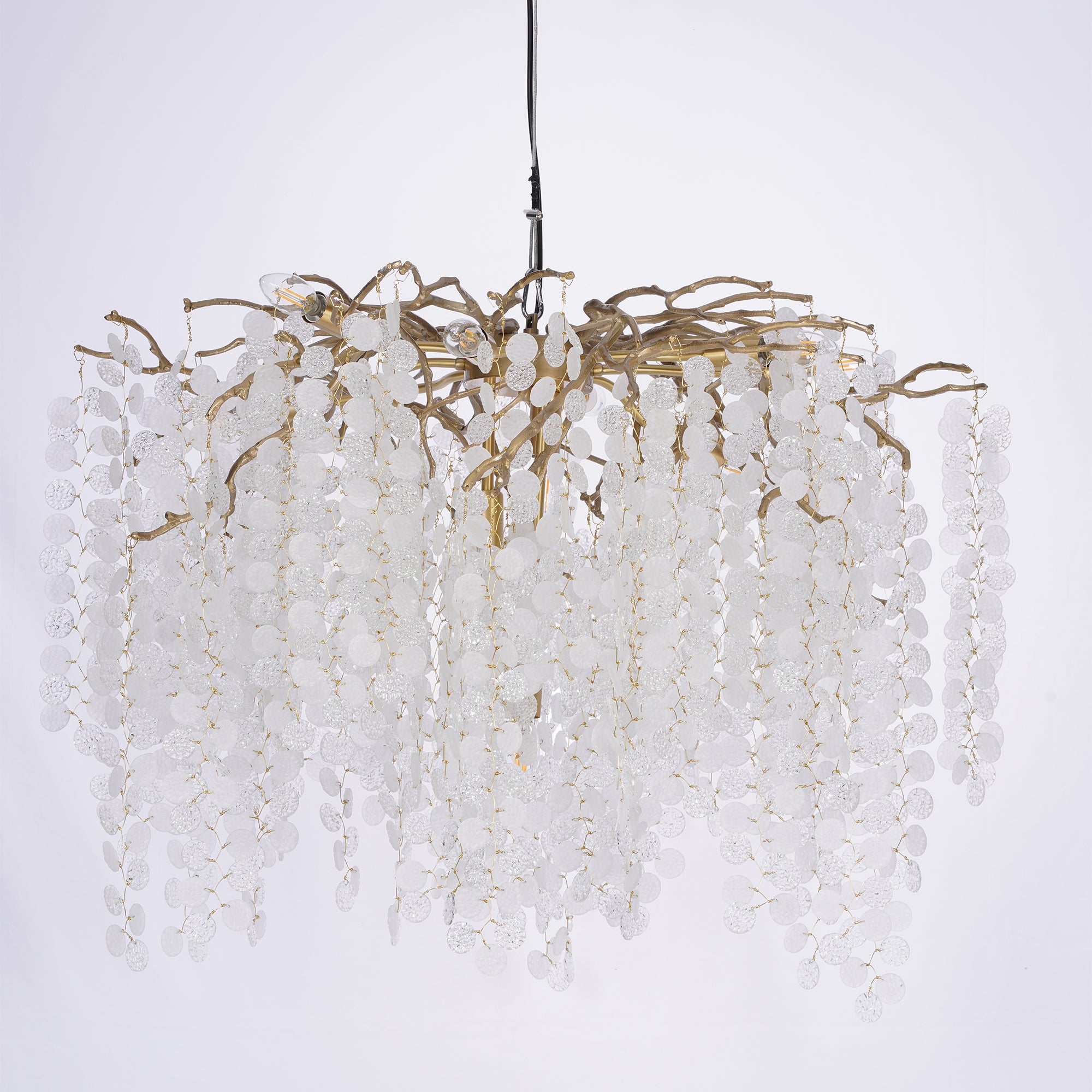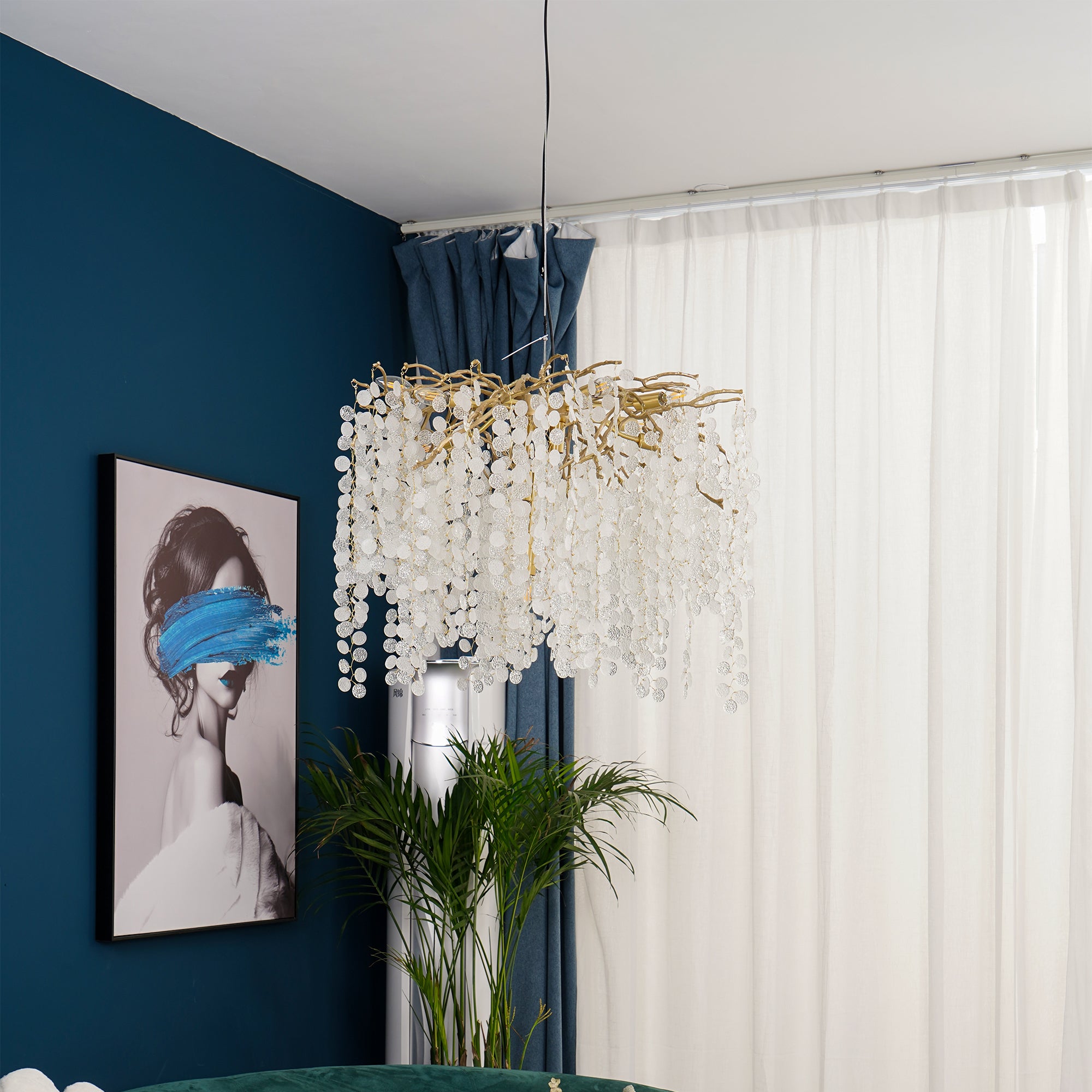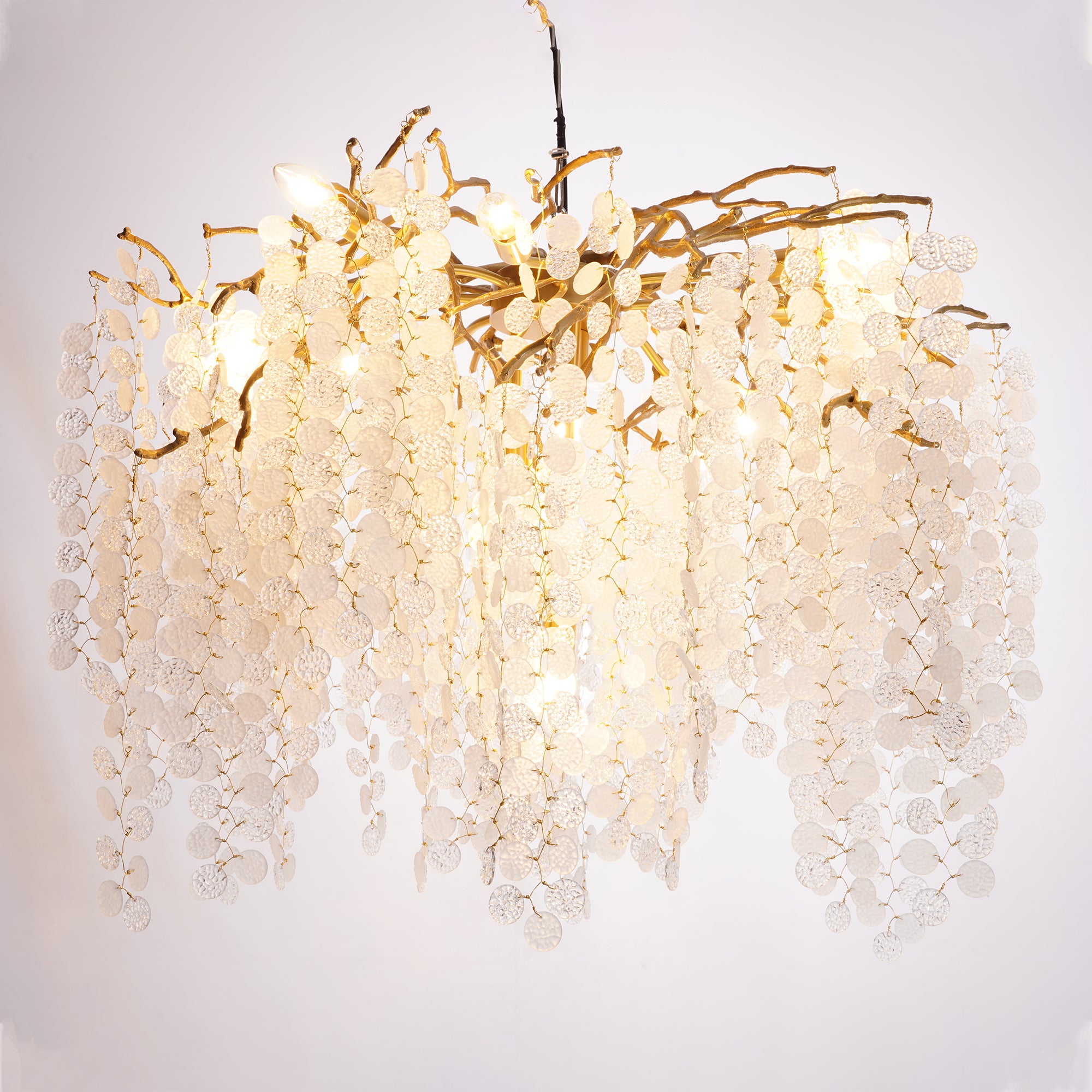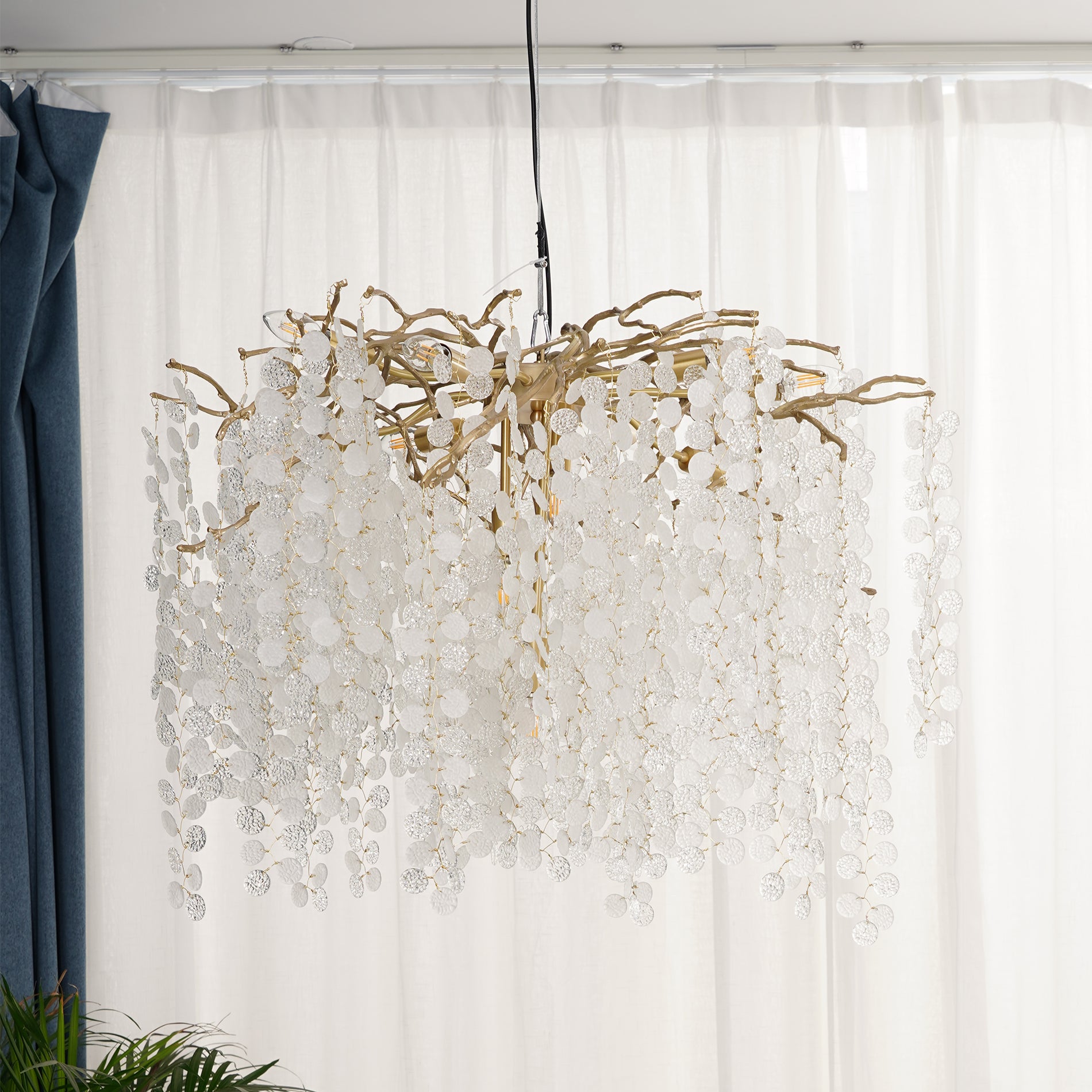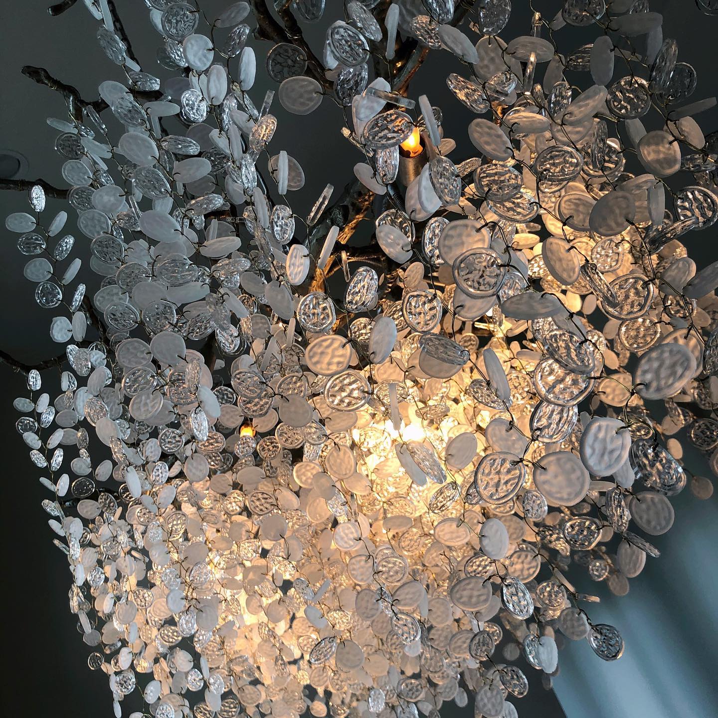 Like dewdrops under a forest canopy, the Shiro Noda Chandelier collection displays glistening glass coins that cascade from organic leaves and branches. A modern nod to nature, this collection is natural in contemporary settings. This chandelier is large enough to hang in a great room, foyer, or dining and living room with high ceilings.