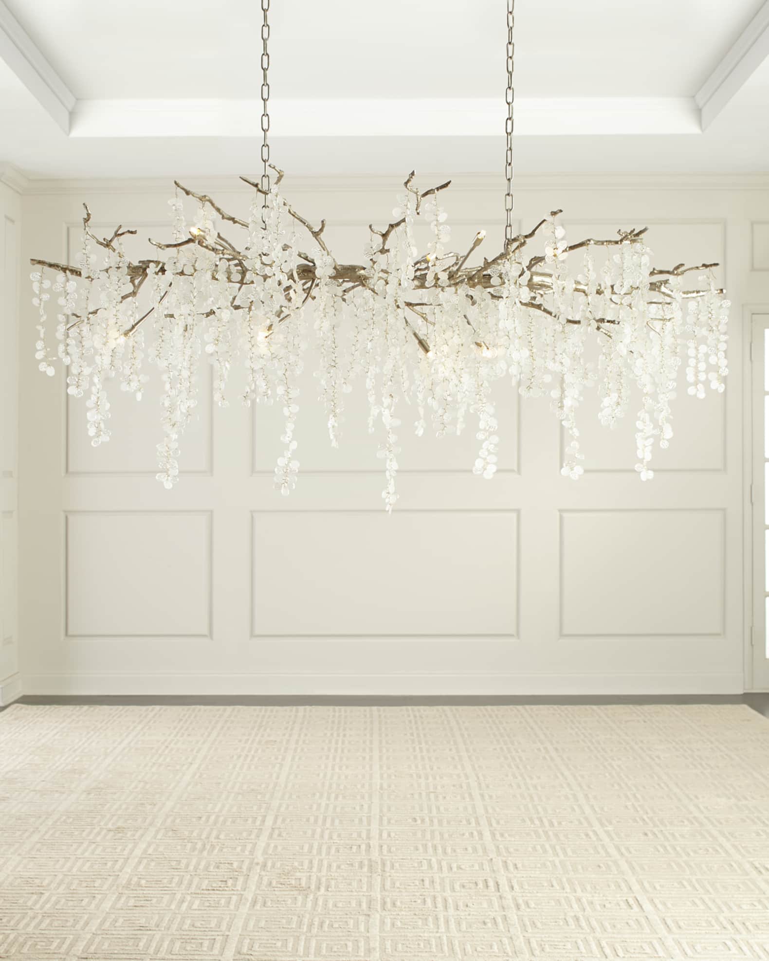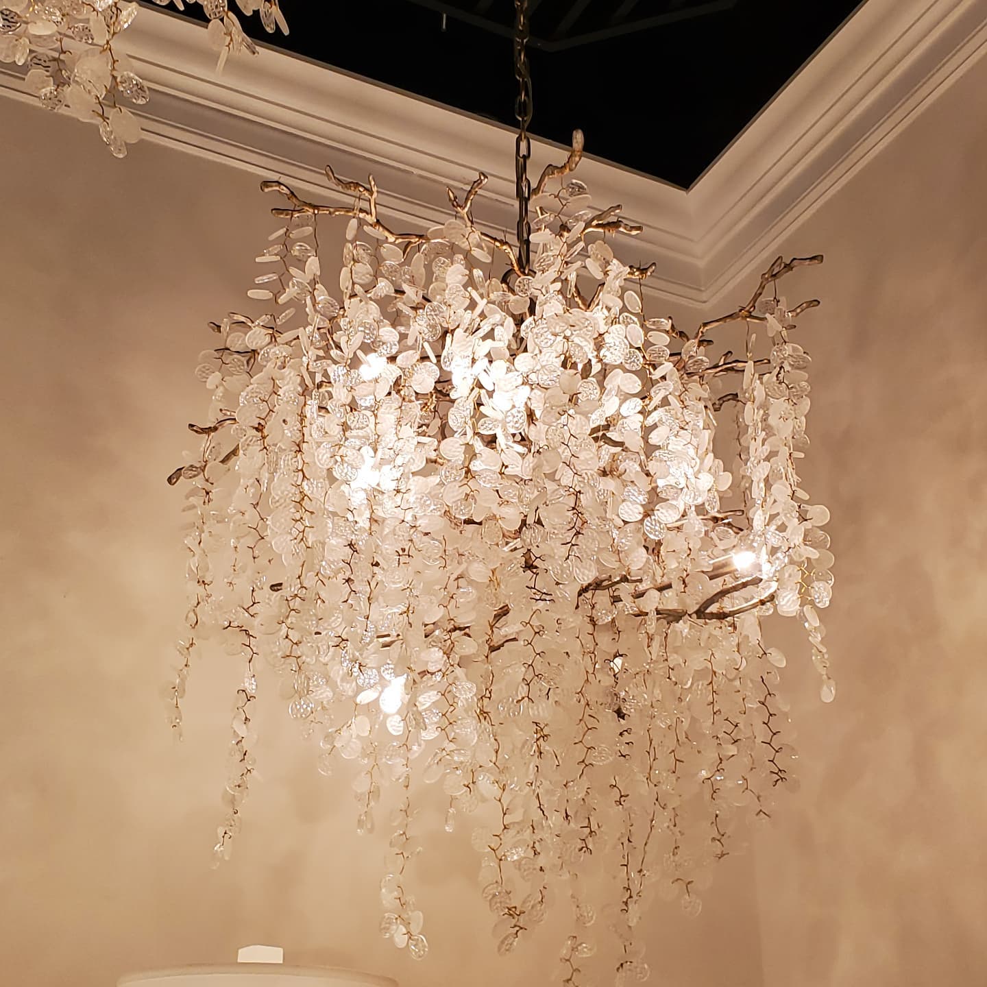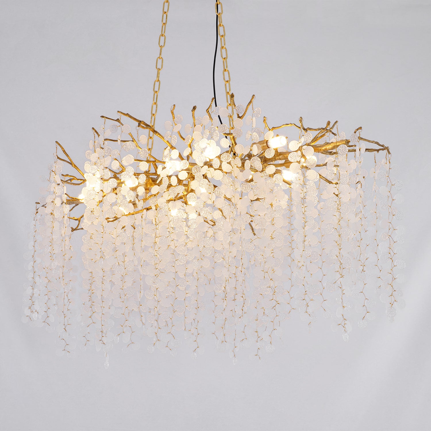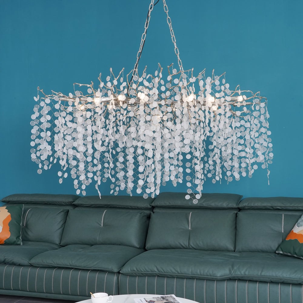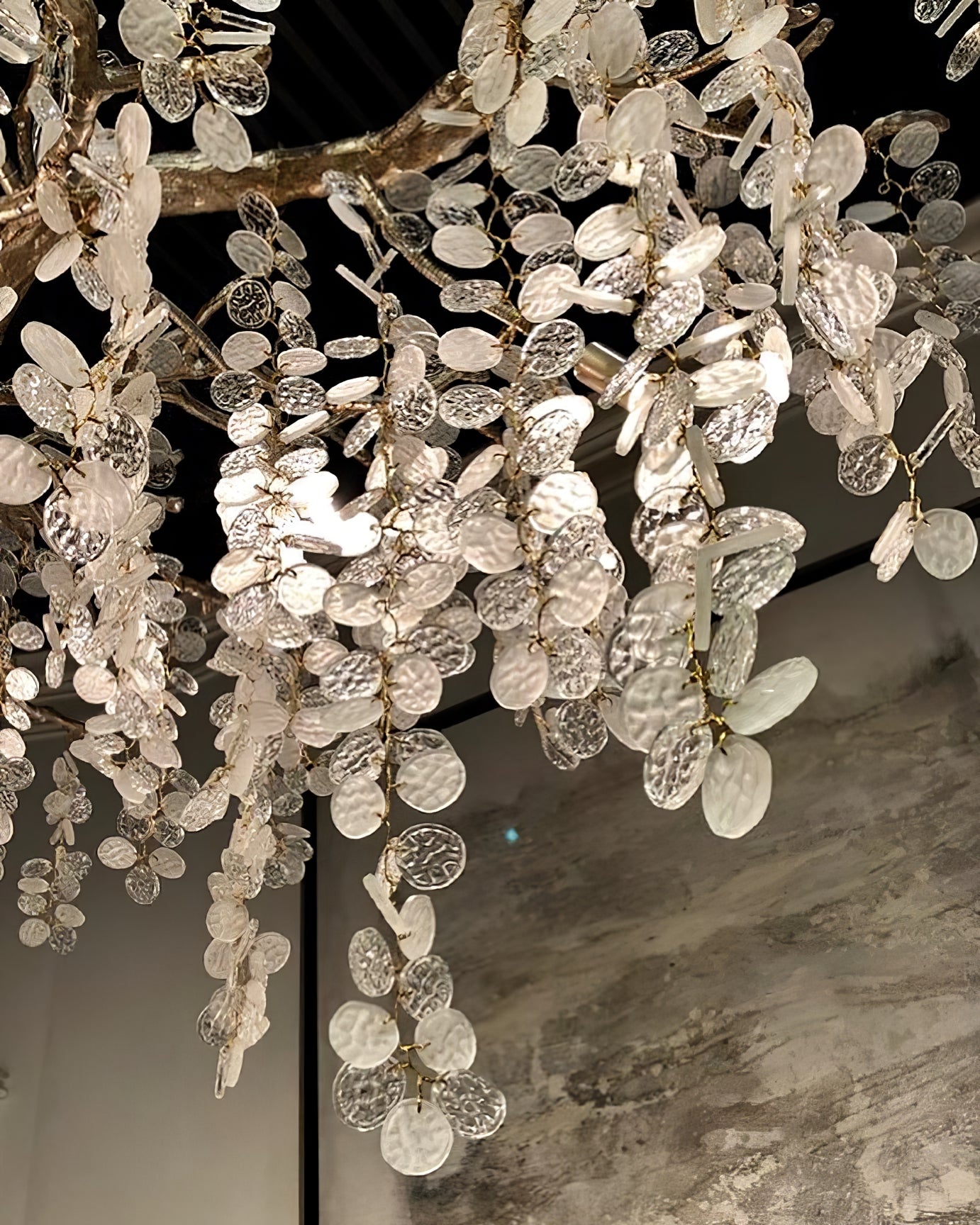 Like dewdrops under a forest canopy, the Shiro Noda Chandelier collection displays glistening glass coins that cascade from organic leaves and branches. A modern nod to nature, this collection is natural in contemporary settings. This chandelier is large enough to hang in a great room, foyer, or dining and living room with high ceilings.