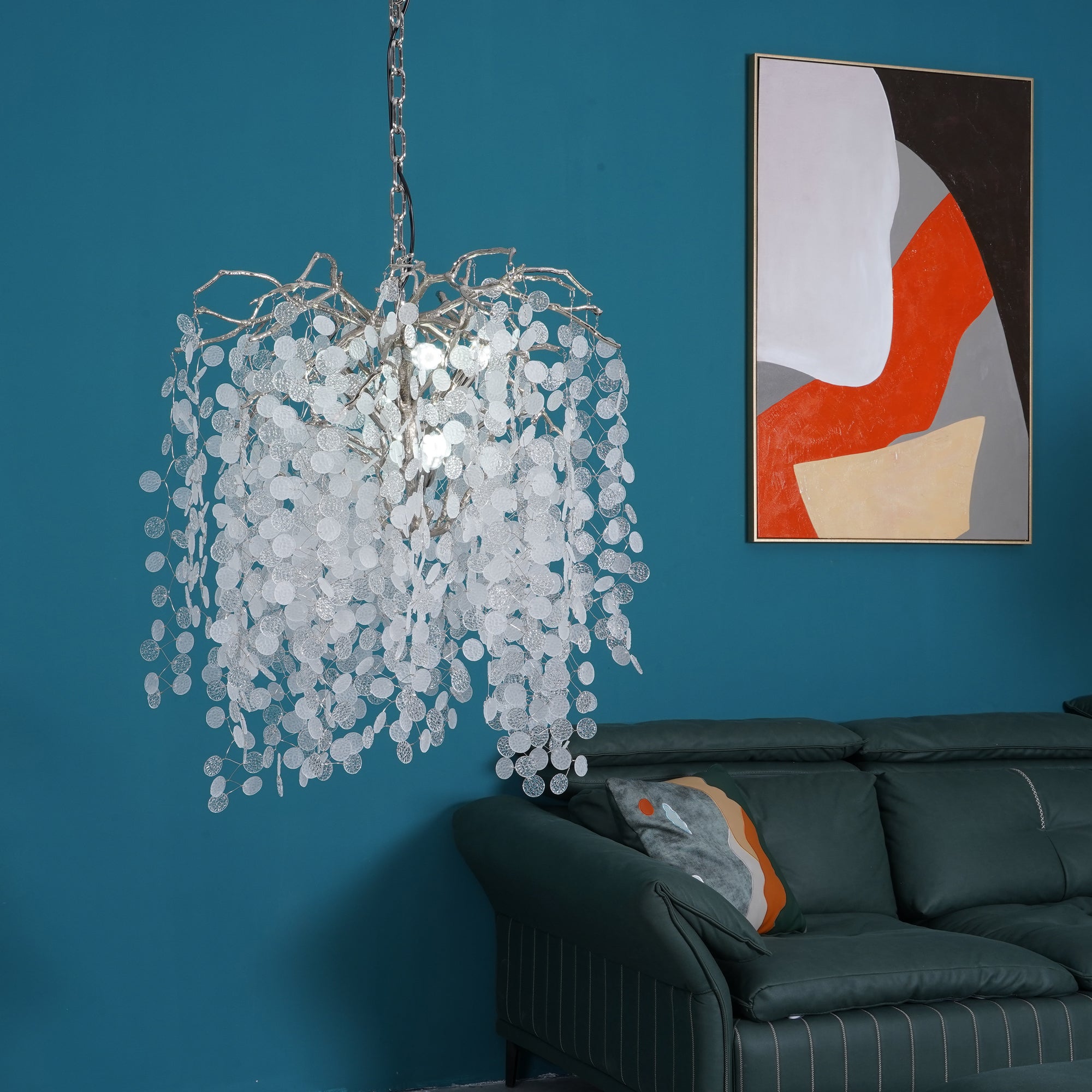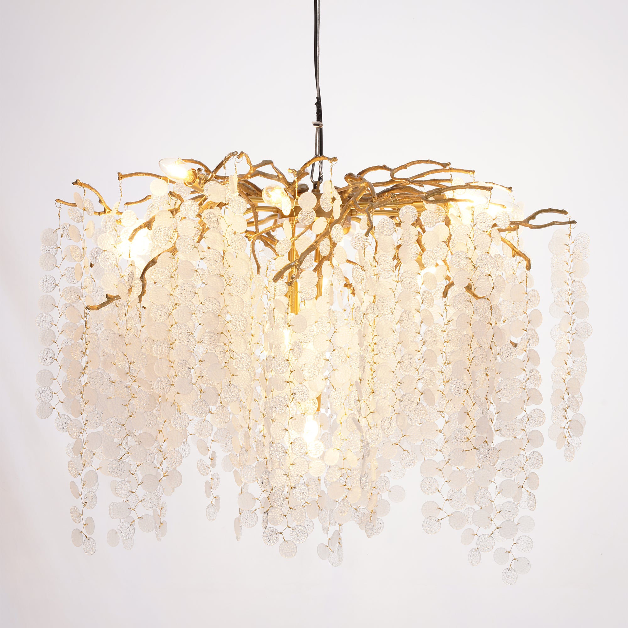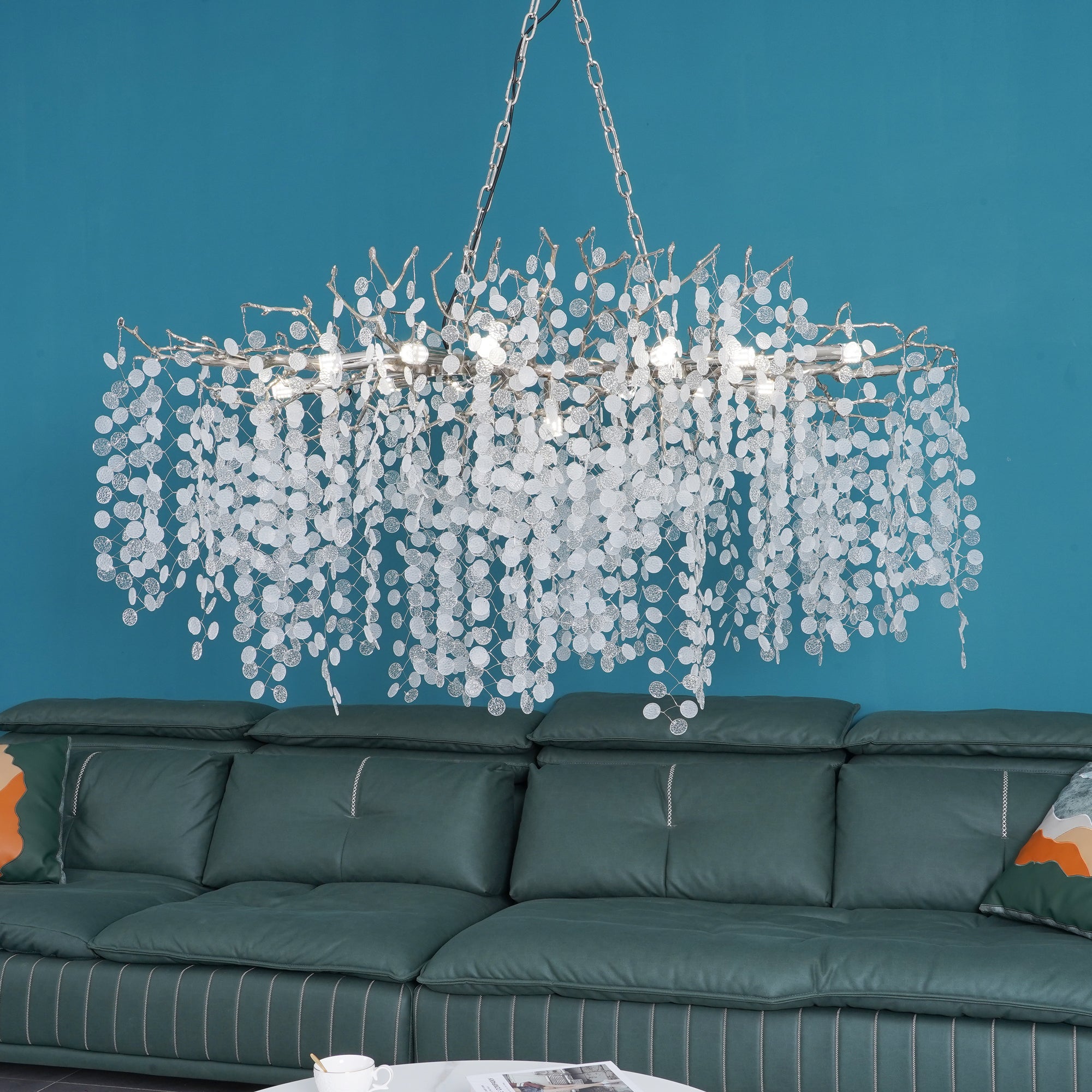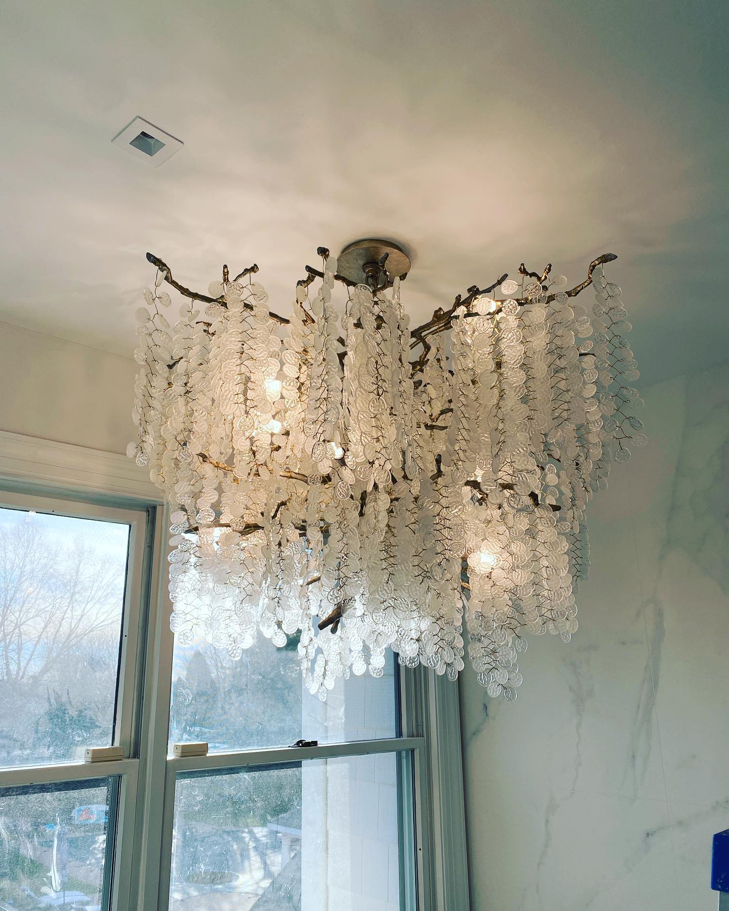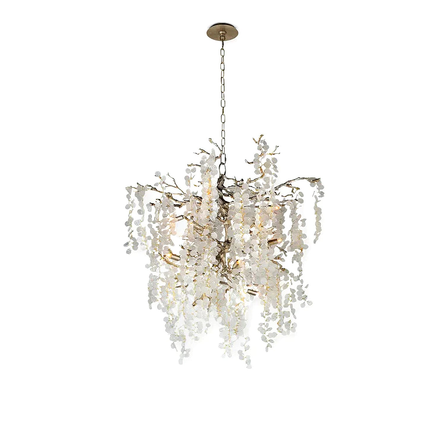 Like dewdrops under a forest canopy, the Shiro Noda Chandelier collection displays glistening glass coins that cascade from organic leaves and branches. A modern nod to nature, this collection is natural in contemporary settings. This chandelier is large enough to hang in a great room, foyer, or dining and living room with high ceilings.