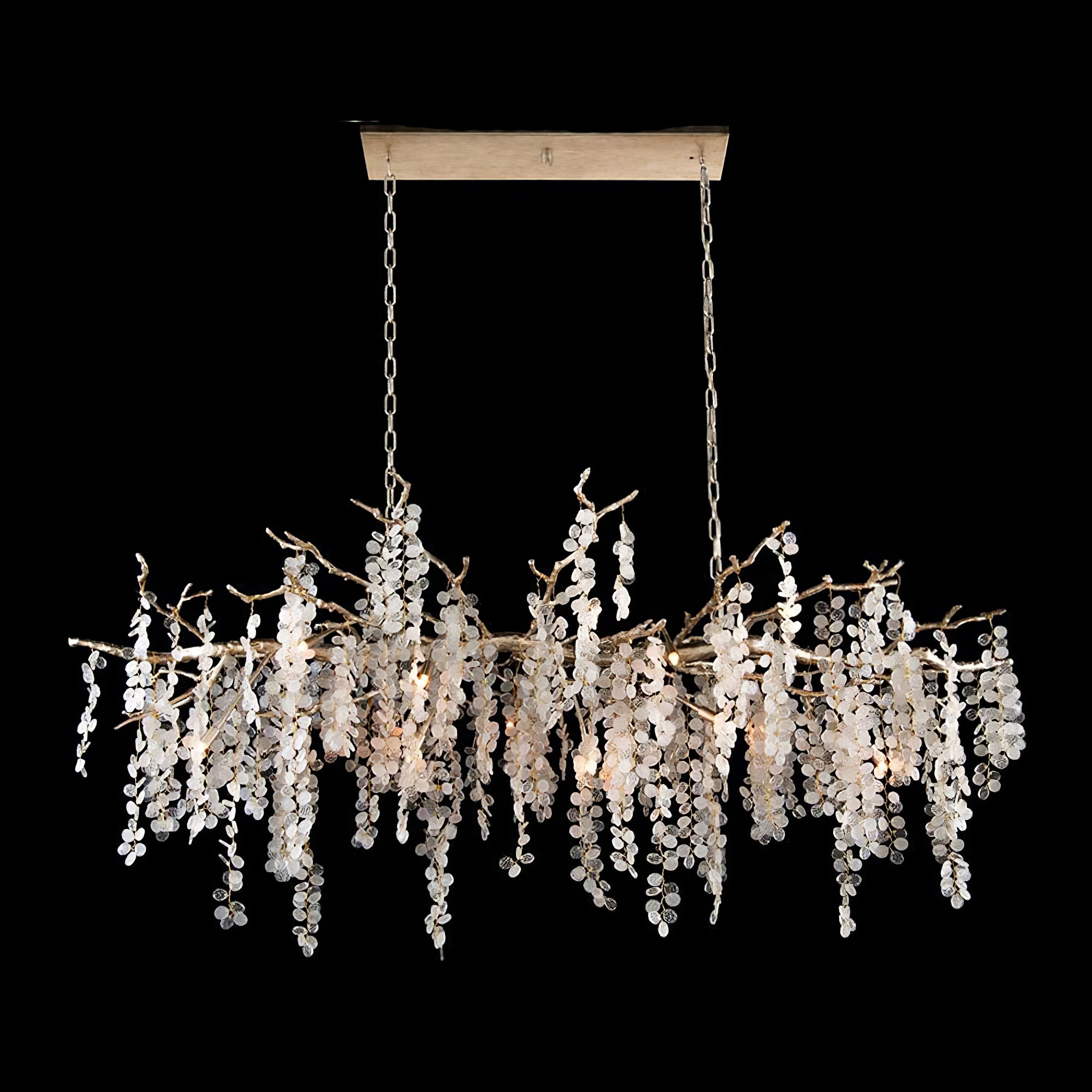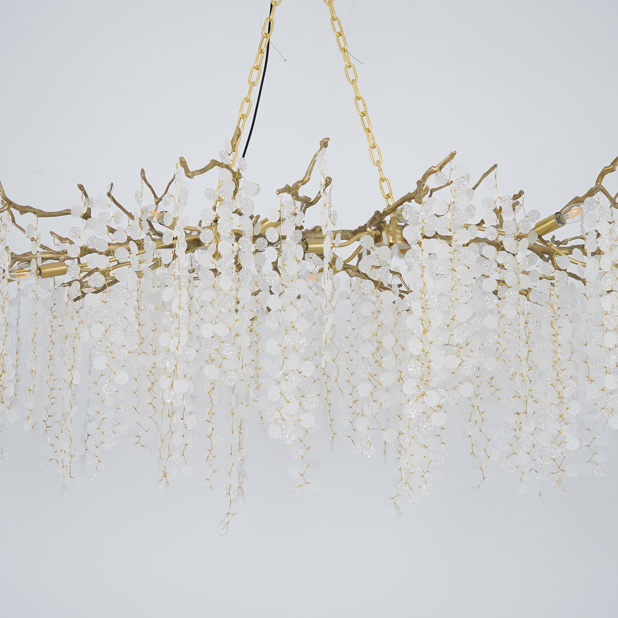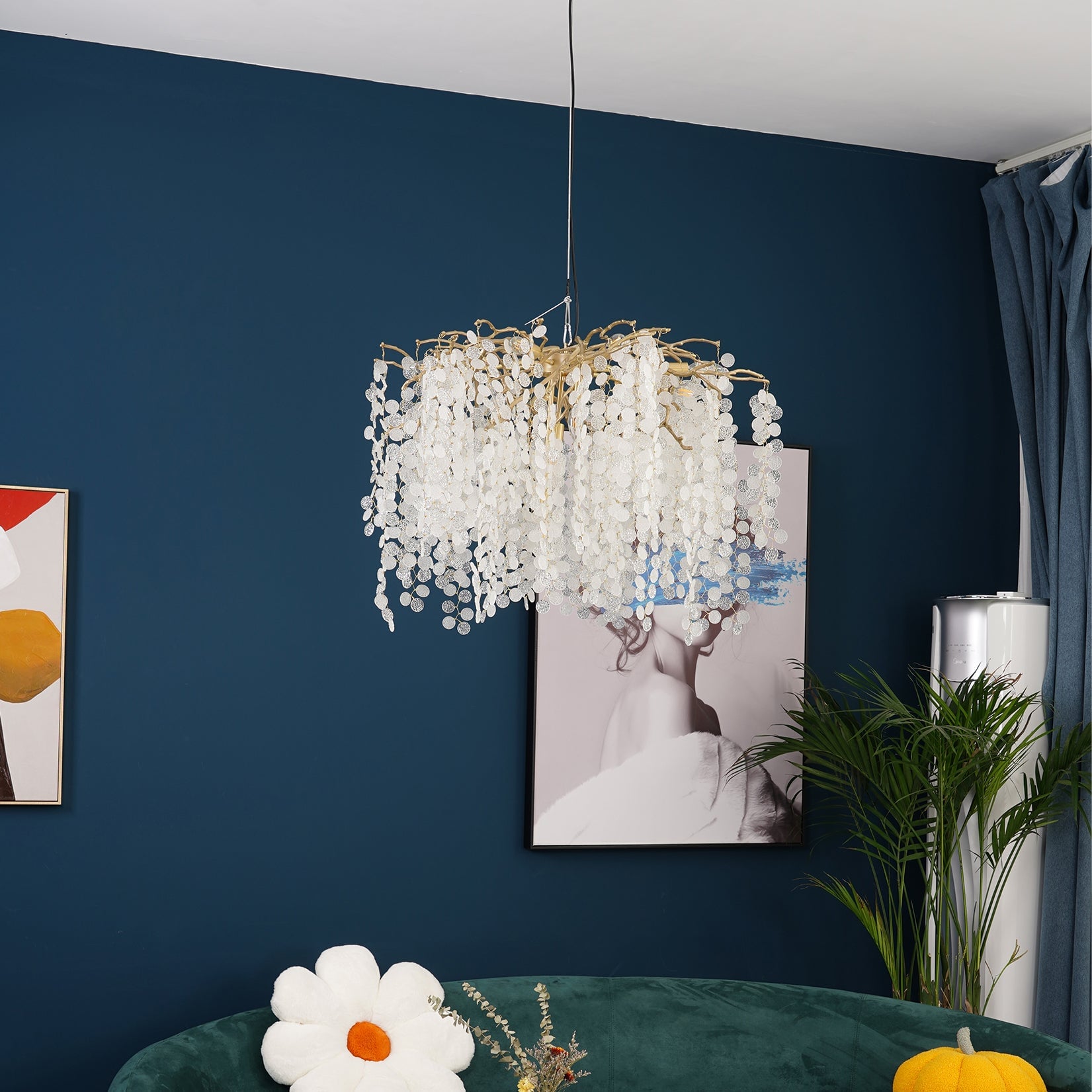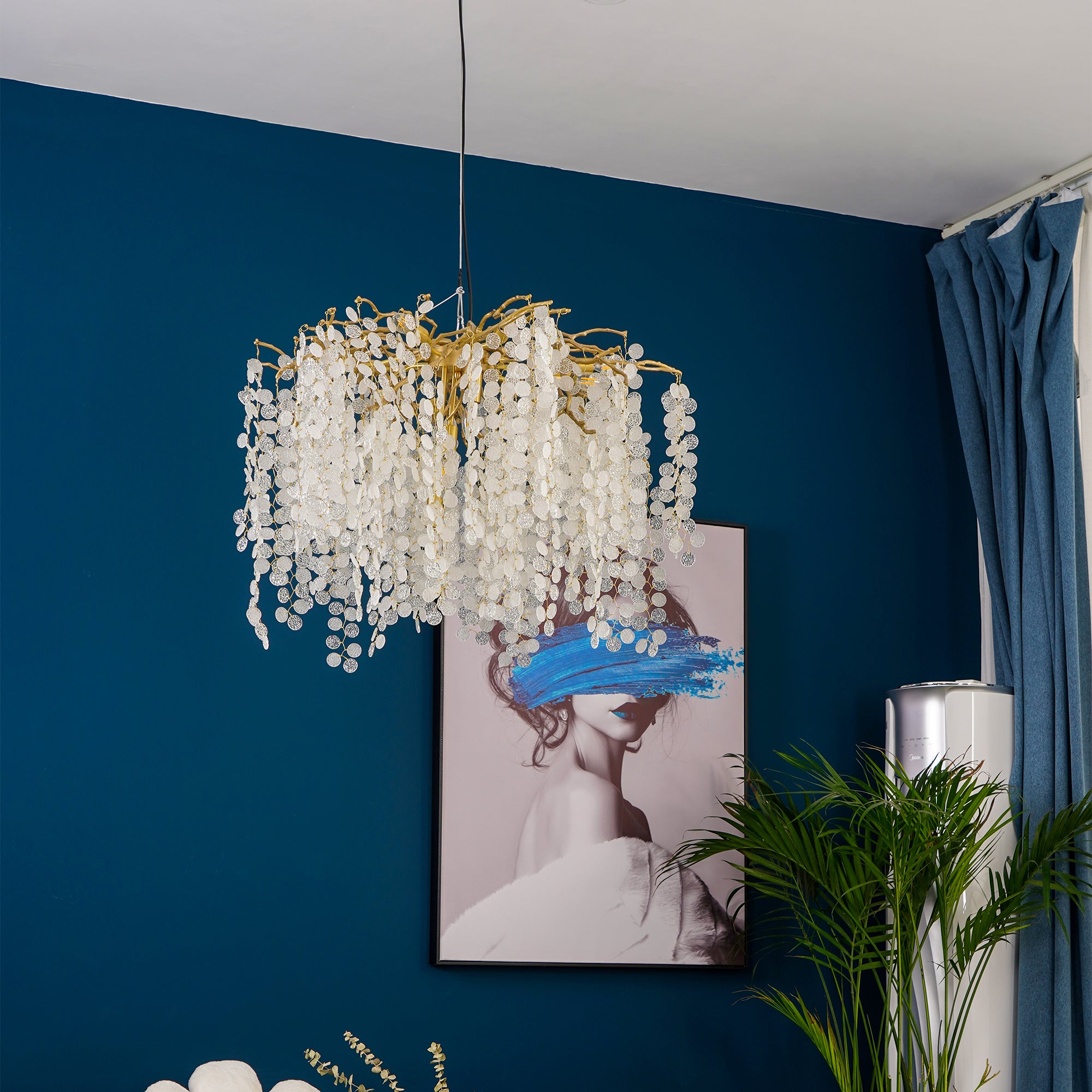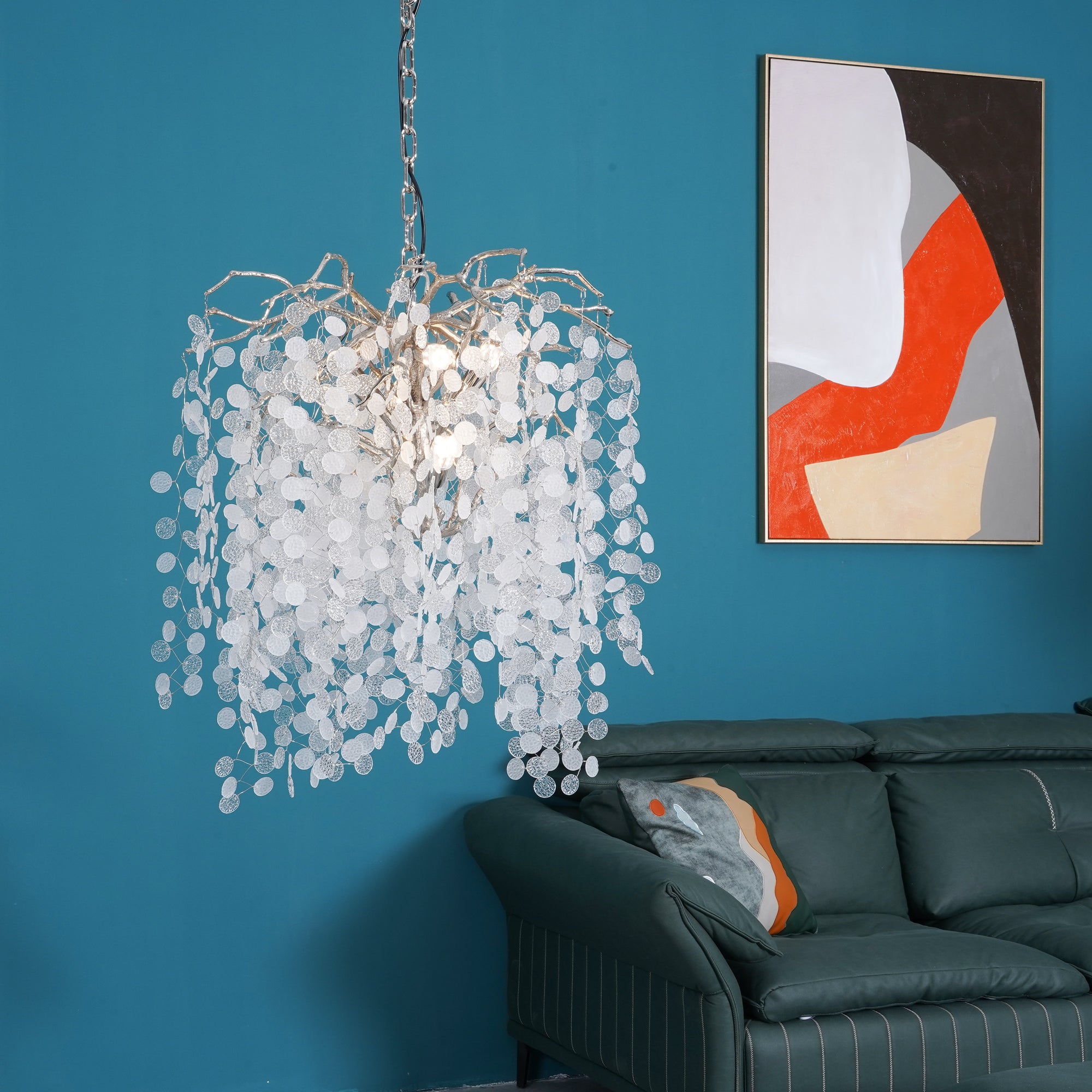 Like dewdrops under a forest canopy, the Shiro Noda Chandelier collection displays glistening glass coins that cascade from organic leaves and branches. A modern nod to nature, this collection is natural in contemporary settings. This chandelier is large enough to hang in a great room, foyer, or dining and living room with high ceilings.