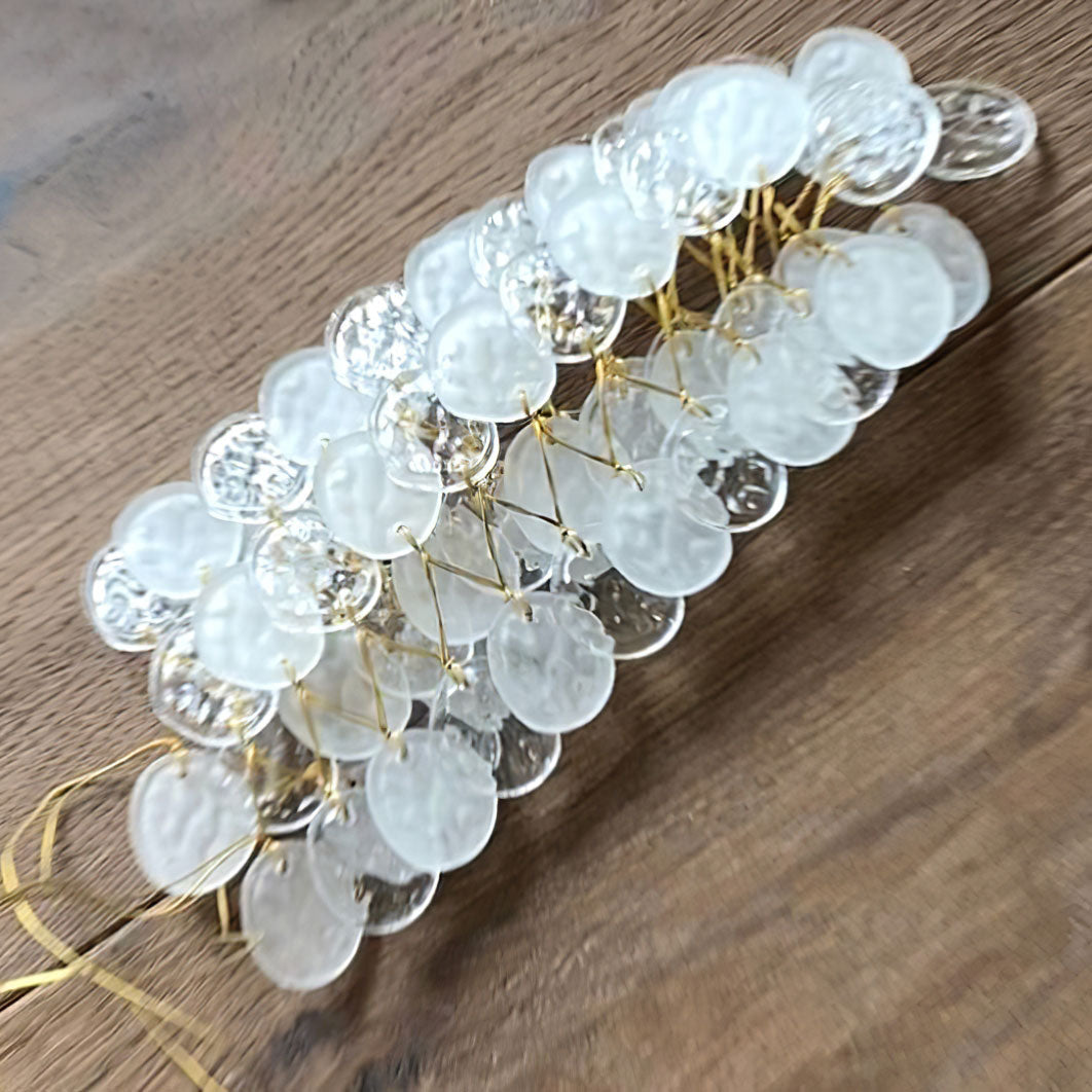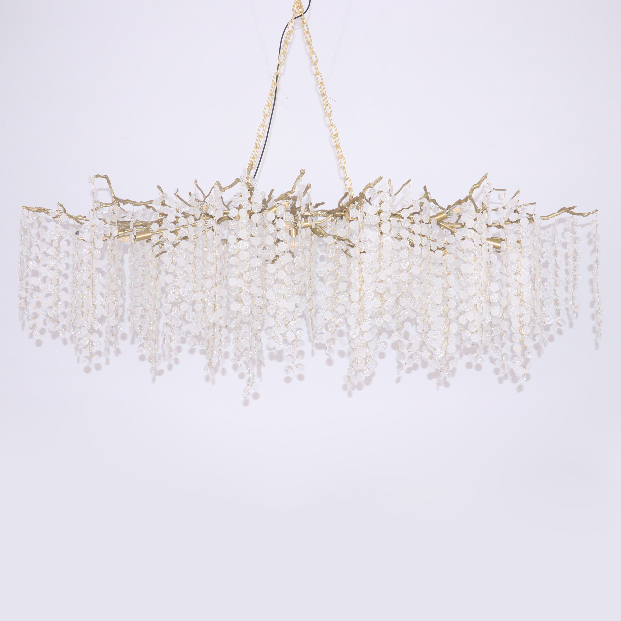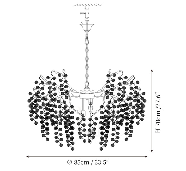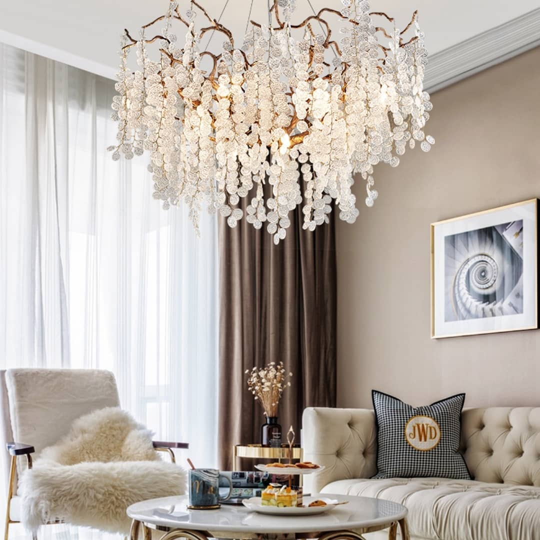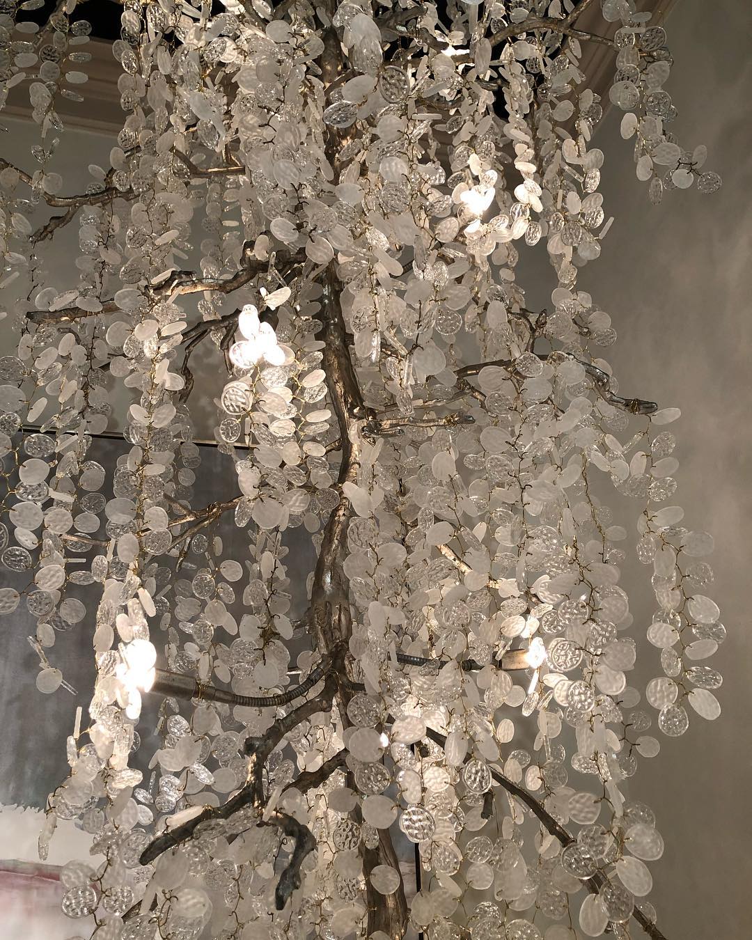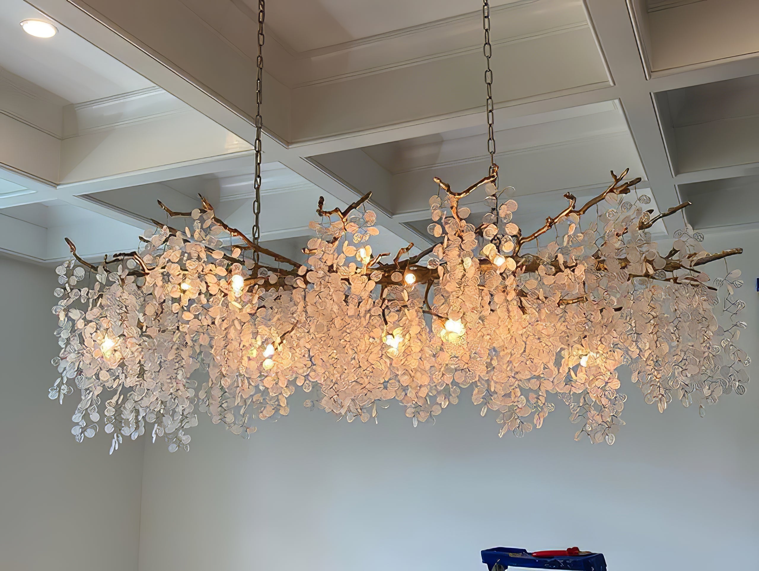 Like dewdrops under a forest canopy, the Shiro Noda Chandelier collection displays glistening glass coins that cascade from organic leaves and branches. A modern nod to nature, this collection is natural in contemporary settings. This chandelier is large enough to hang in a great room, foyer, or dining and living room with high ceilings.