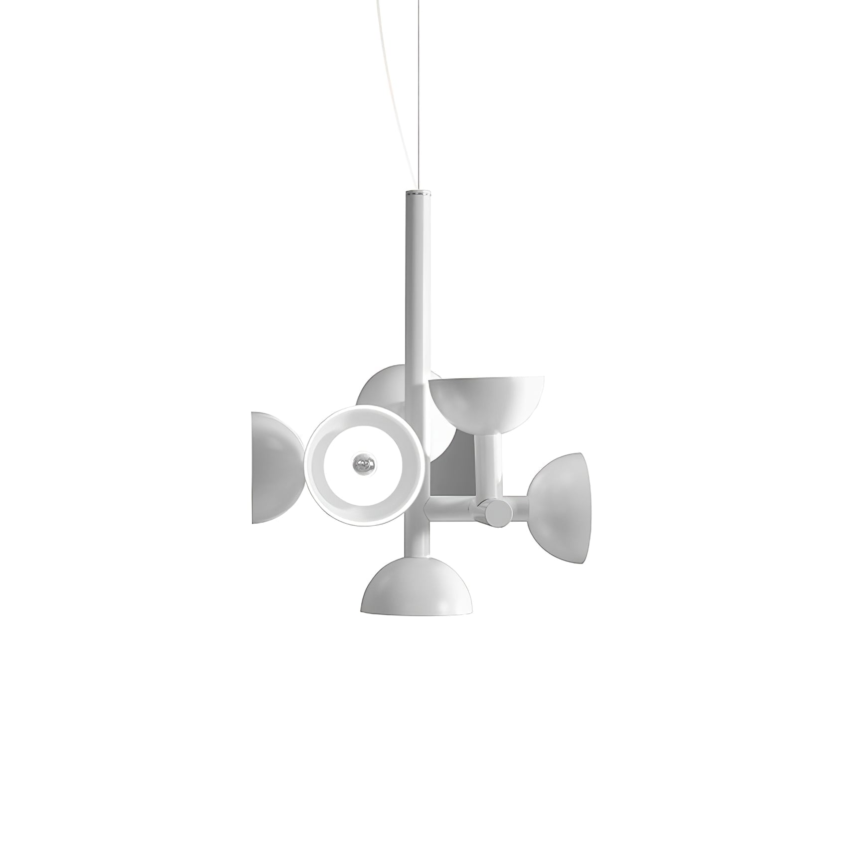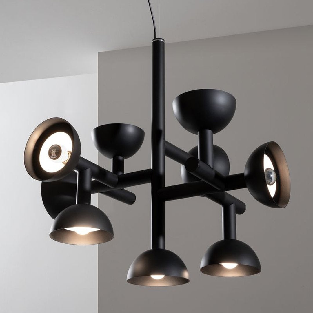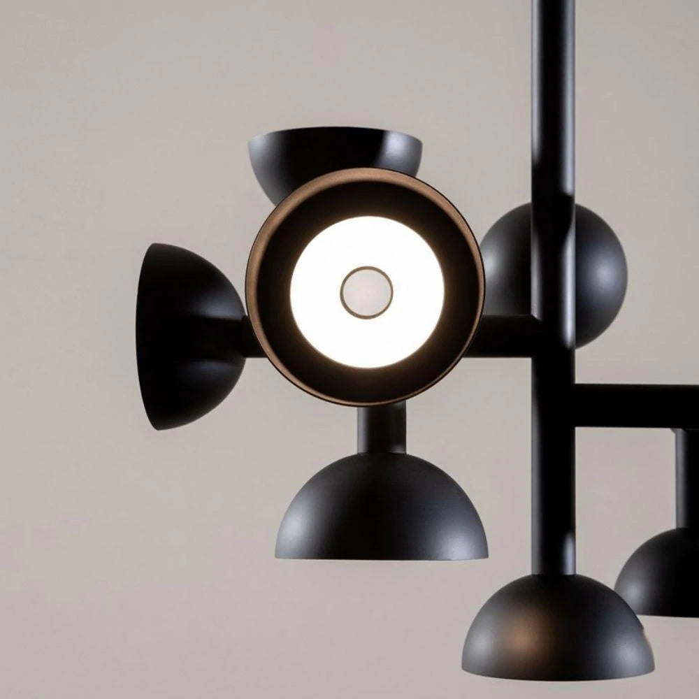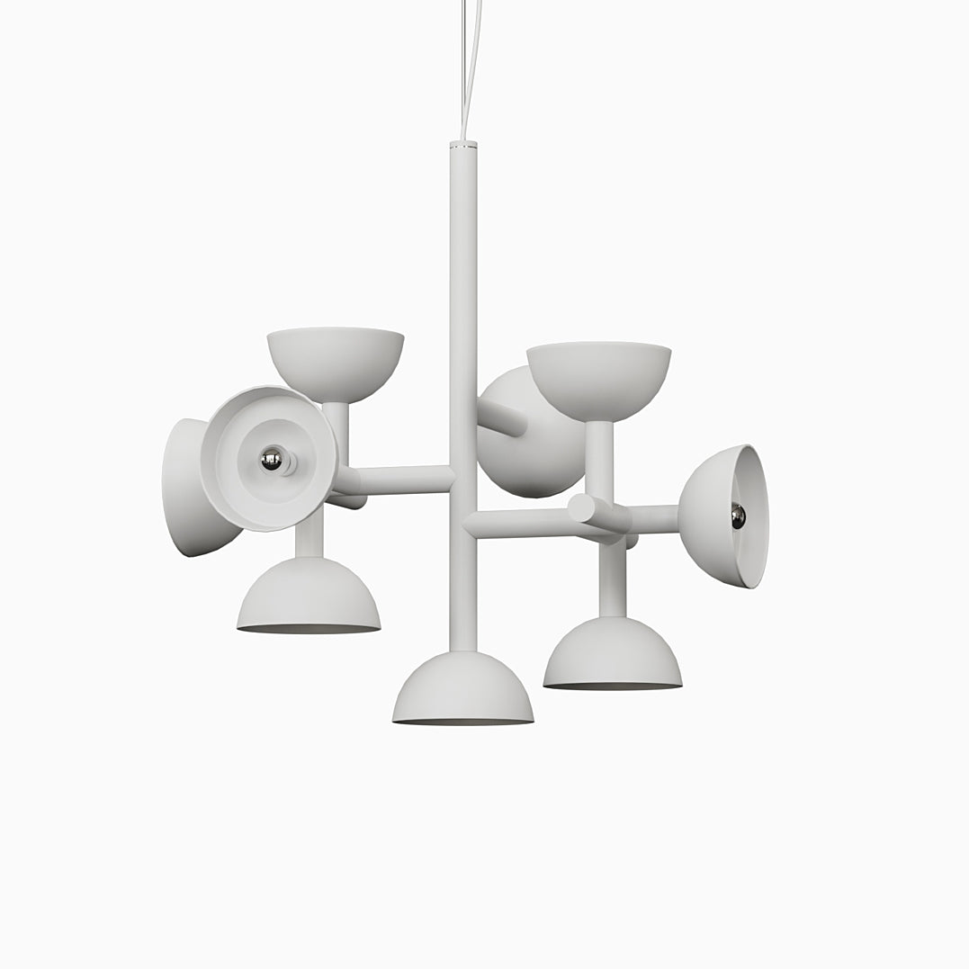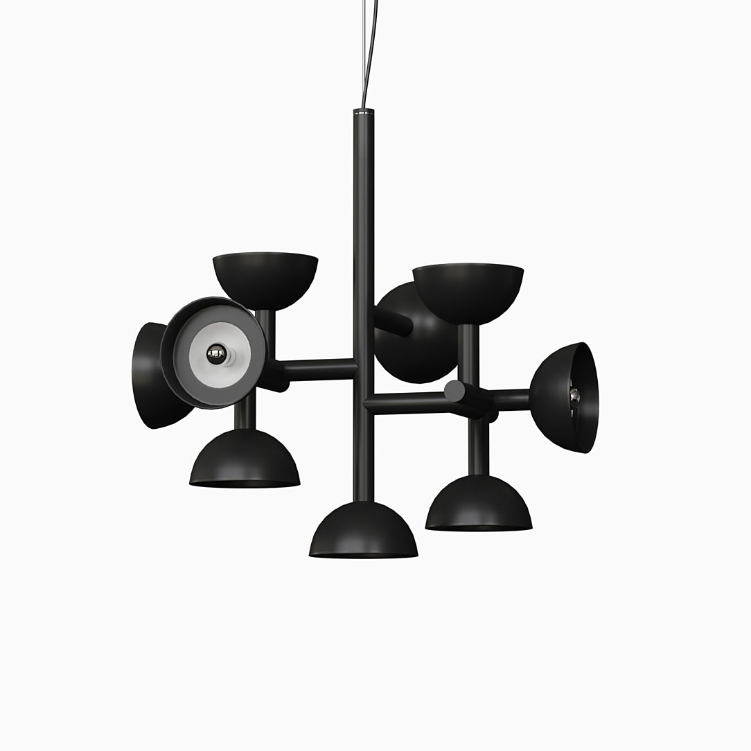 Sibyl, the voice of light. A central iron rod juts out into horizontal and vertical arms capped with domes that diffuse light. Bursts of light are channeled in all directions like sound waves from a suspended frame that animates the surrounding space with an expressive graphic boldness inspired by De Stijl. Evoking the myth of the sibyls, who were famously interrogated to elicit prophecies, this light was designed as if it were sound traveling through space, making its radiant voice heard as it exudes a sense of both poeticism and practicality.