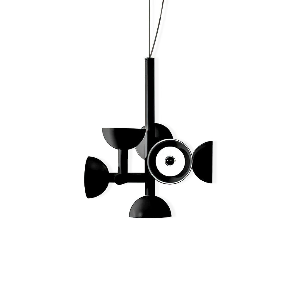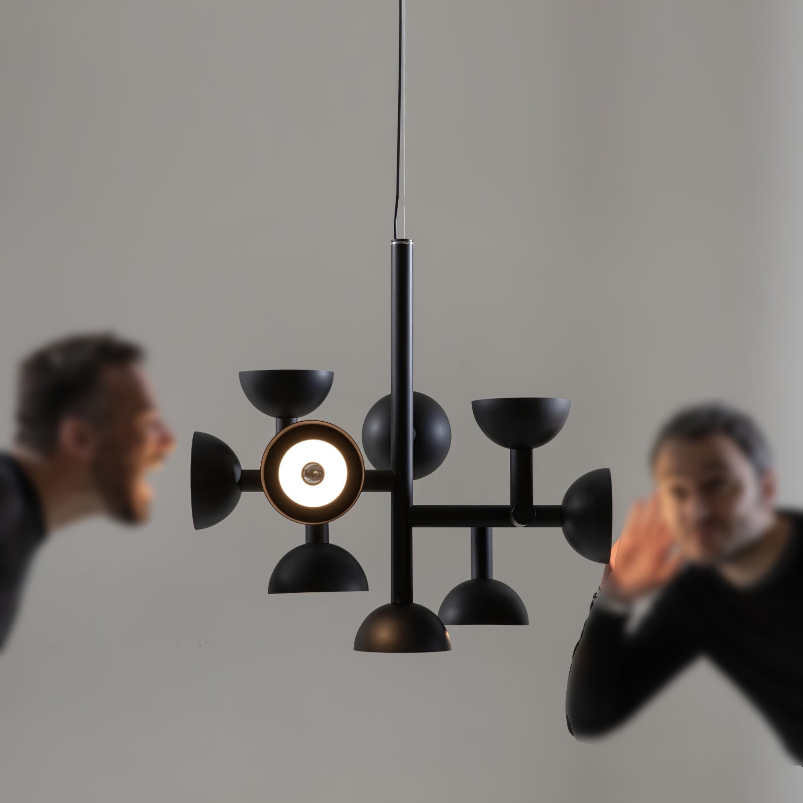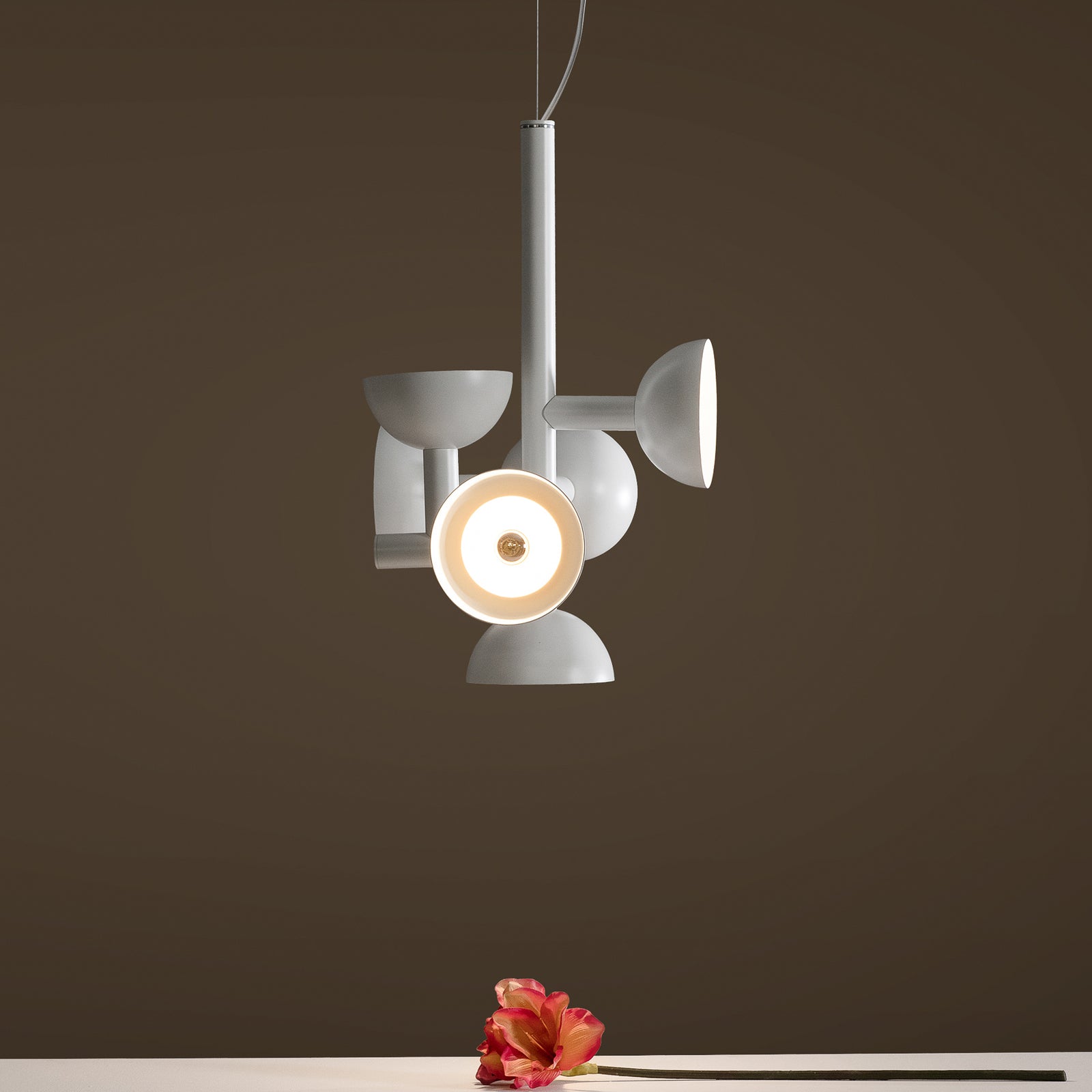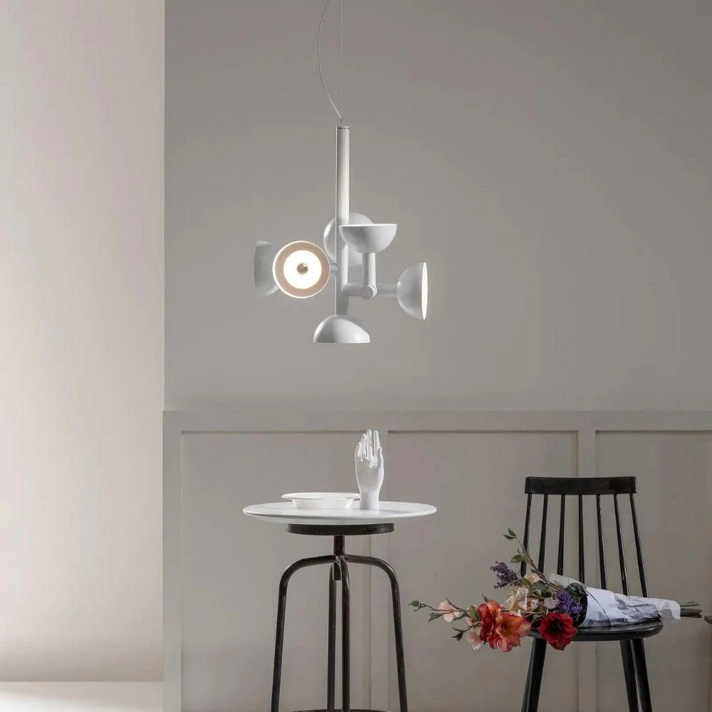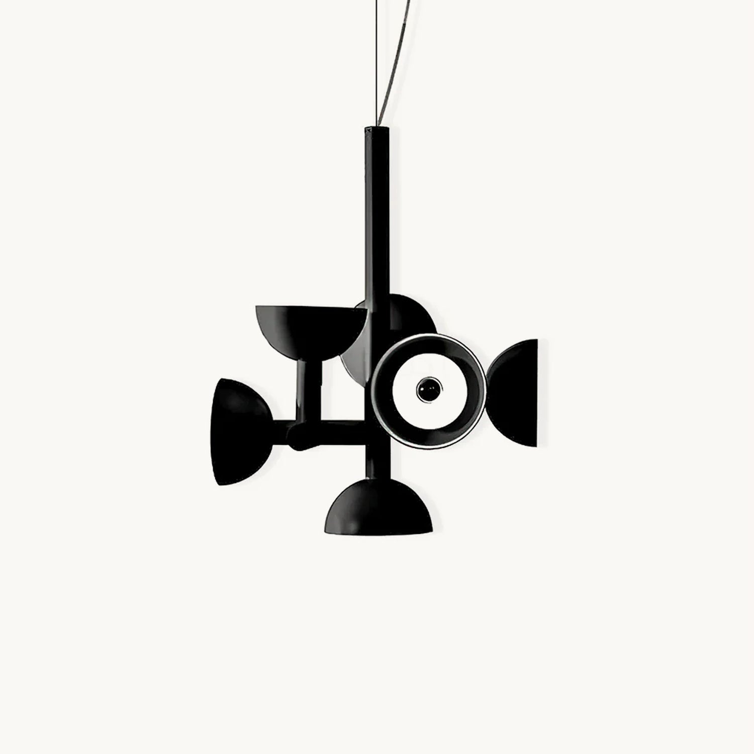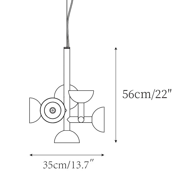 Sibyl, the voice of light. A central iron rod juts out into horizontal and vertical arms capped with domes that diffuse light. Bursts of light are channeled in all directions like sound waves from a suspended frame that animates the surrounding space with an expressive graphic boldness inspired by De Stijl. Evoking the myth of the sibyls, who were famously interrogated to elicit prophecies, this light was designed as if it were sound traveling through space, making its radiant voice heard as it exudes a sense of both poeticism and practicality.