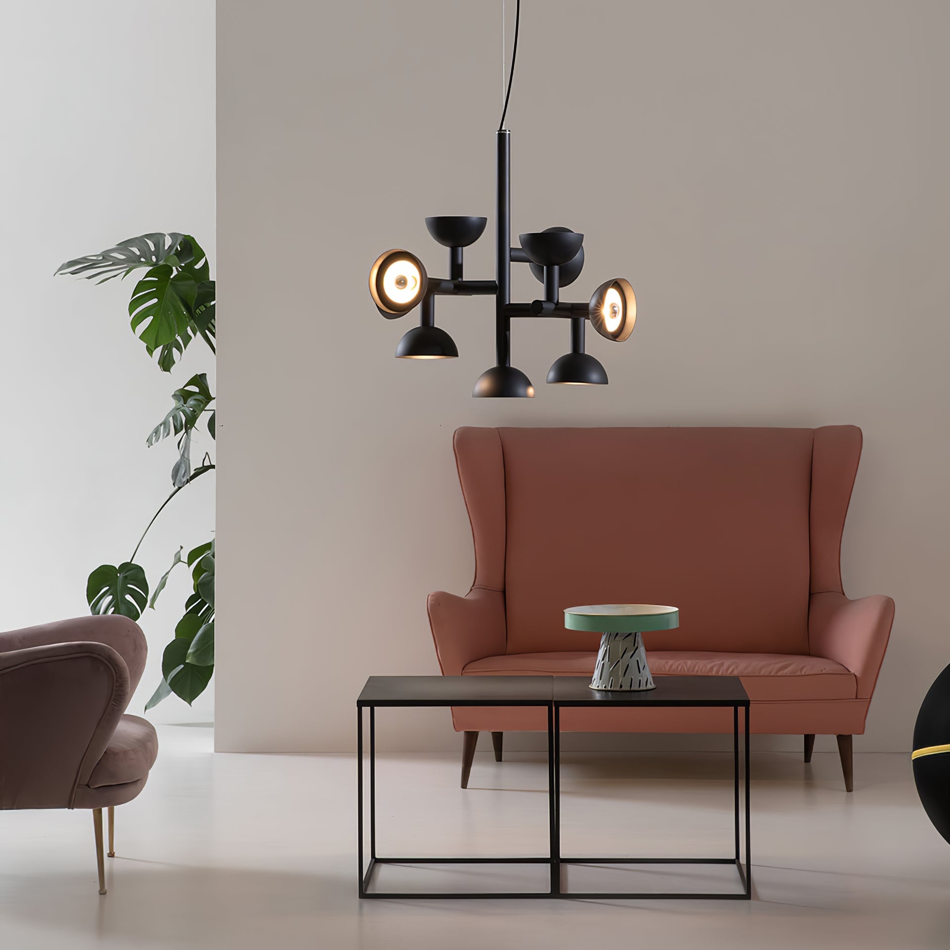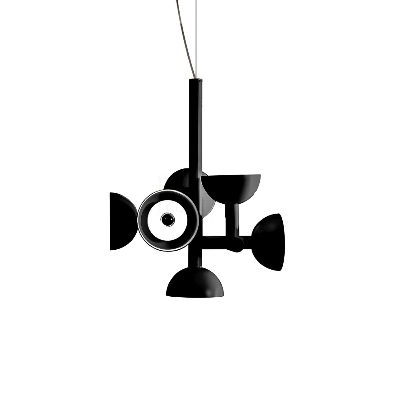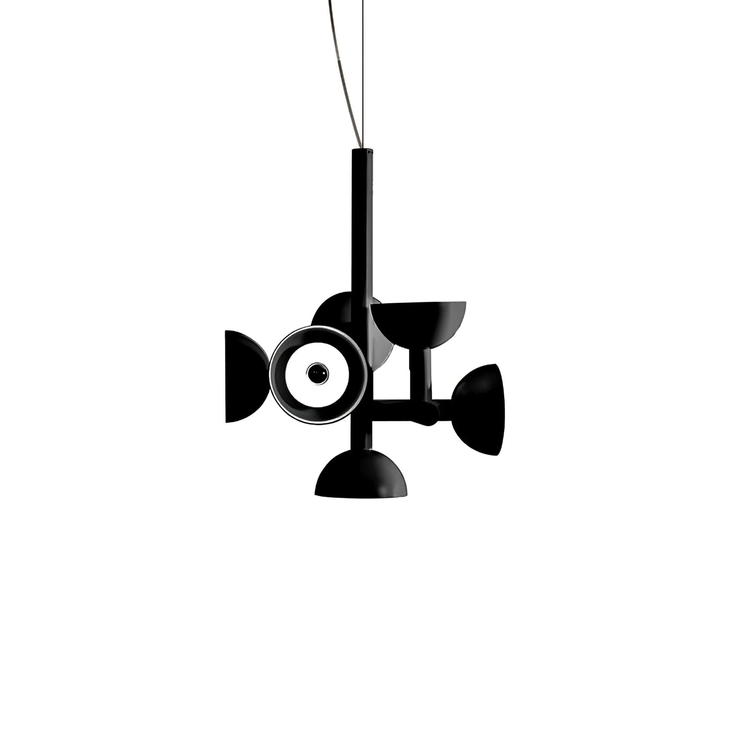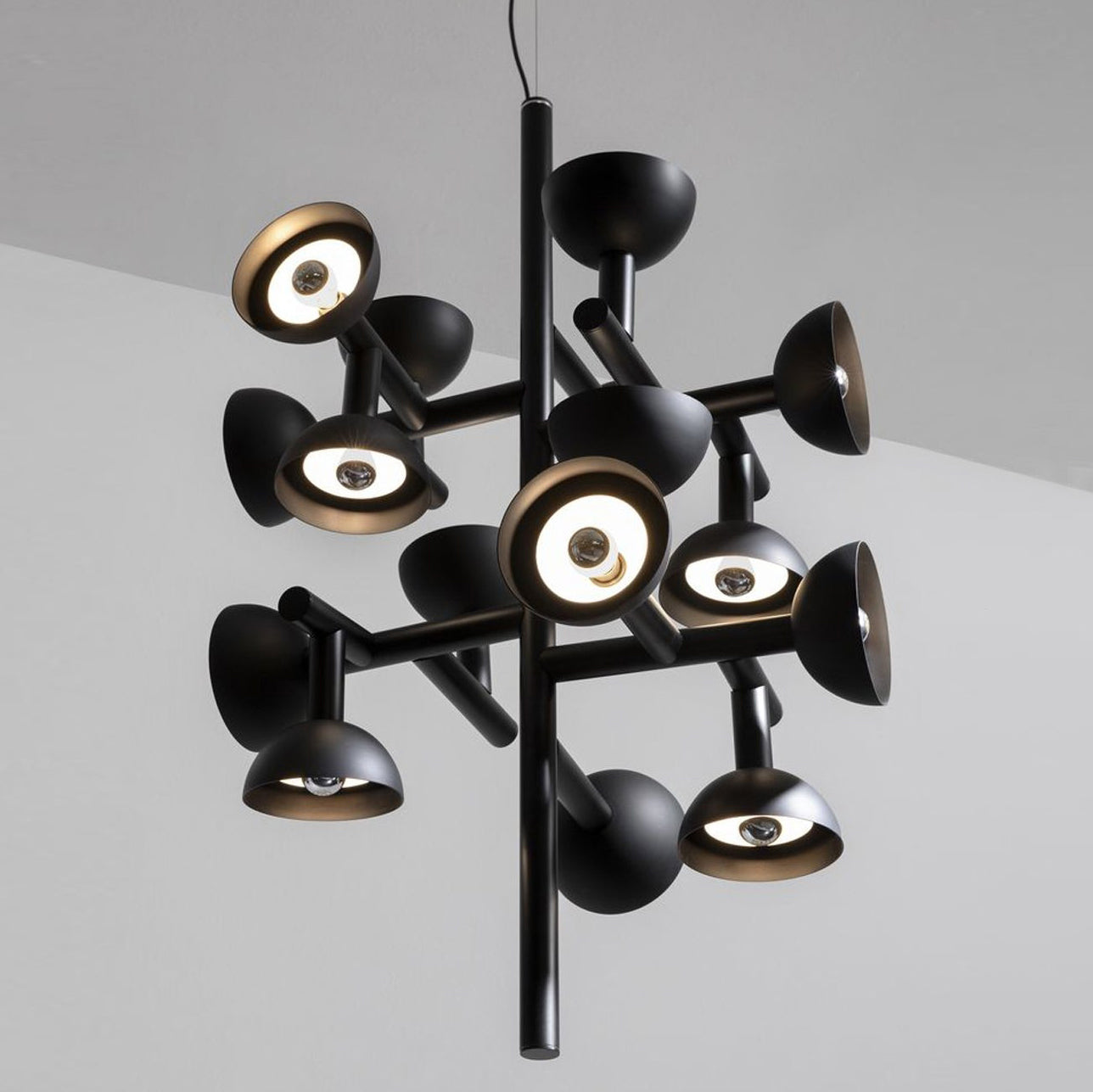 Sibyl, the voice of light. A central iron rod juts out into horizontal and vertical arms capped with domes that diffuse light. Bursts of light are channeled in all directions like sound waves from a suspended frame that animates the surrounding space with an expressive graphic boldness inspired by De Stijl. Evoking the myth of the sibyls, who were famously interrogated to elicit prophecies, this light was designed as if it were sound traveling through space, making its radiant voice heard as it exudes a sense of both poeticism and practicality.