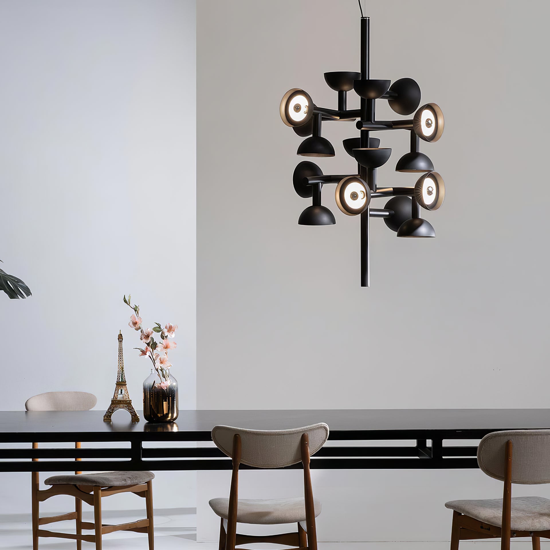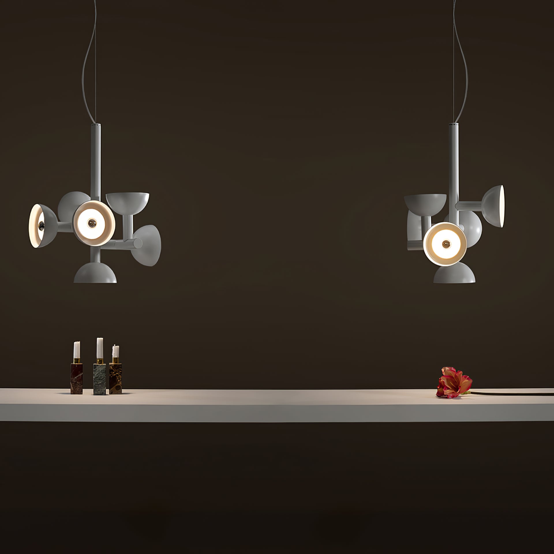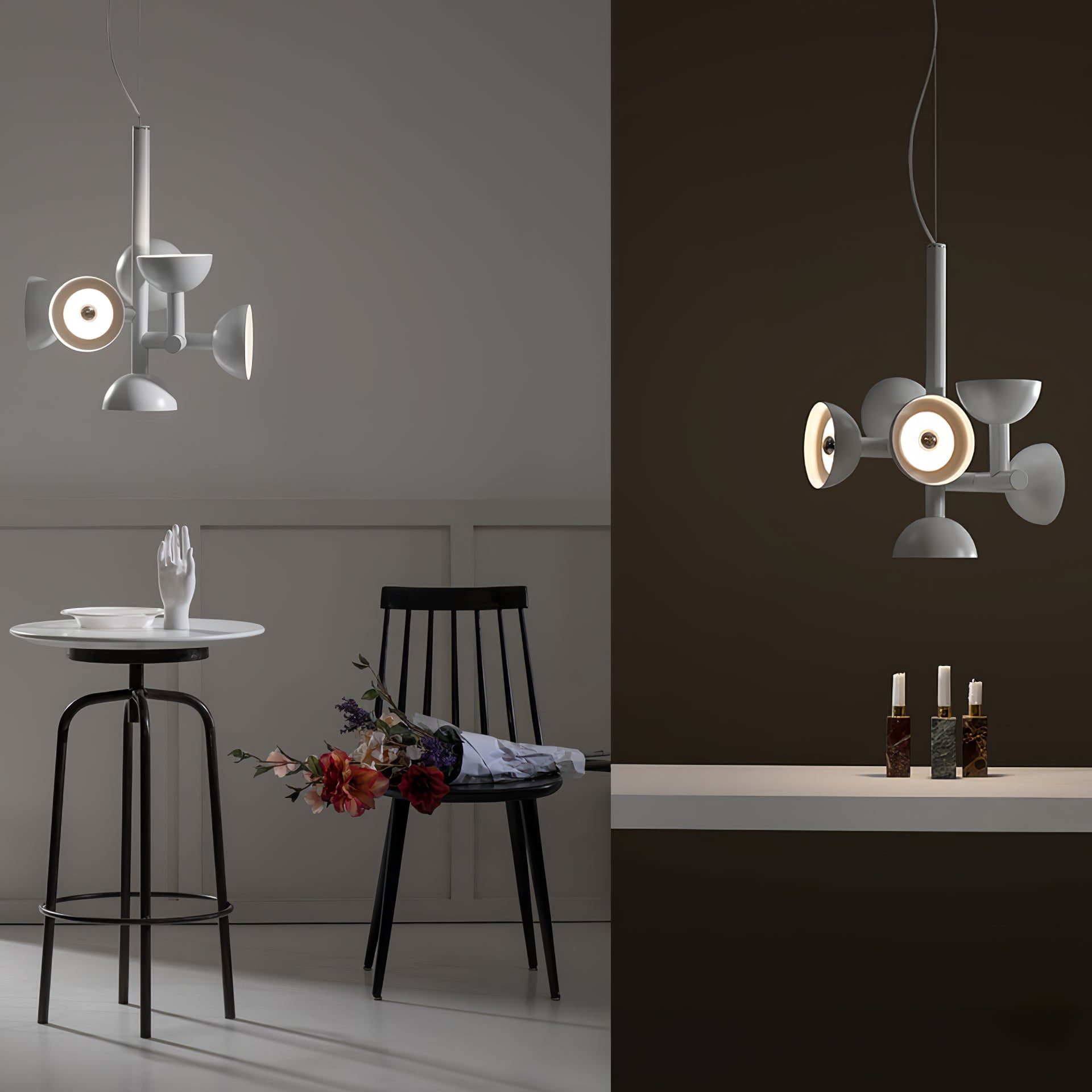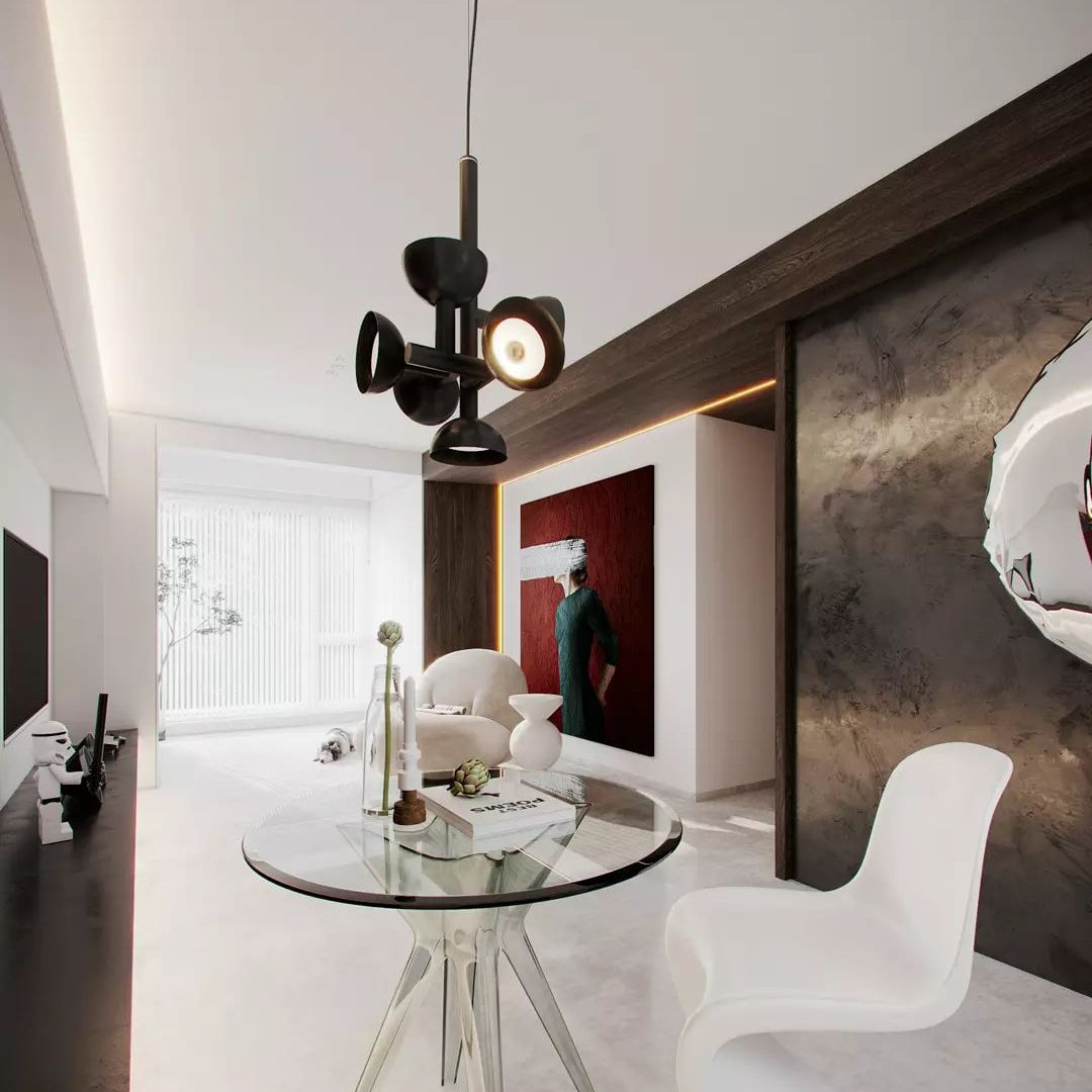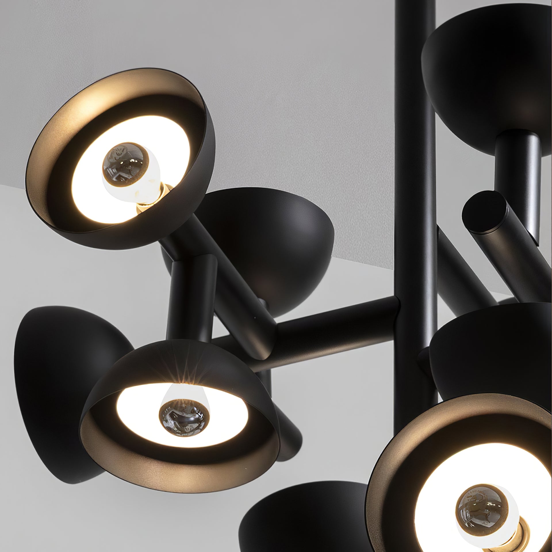 Sibyl, the voice of light. A central iron rod juts out into horizontal and vertical arms capped with domes that diffuse light. Bursts of light are channeled in all directions like sound waves from a suspended frame that animates the surrounding space with an expressive graphic boldness inspired by De Stijl. Evoking the myth of the sibyls, who were famously interrogated to elicit prophecies, this light was designed as if it were sound traveling through space, making its radiant voice heard as it exudes a sense of both poeticism and practicality.