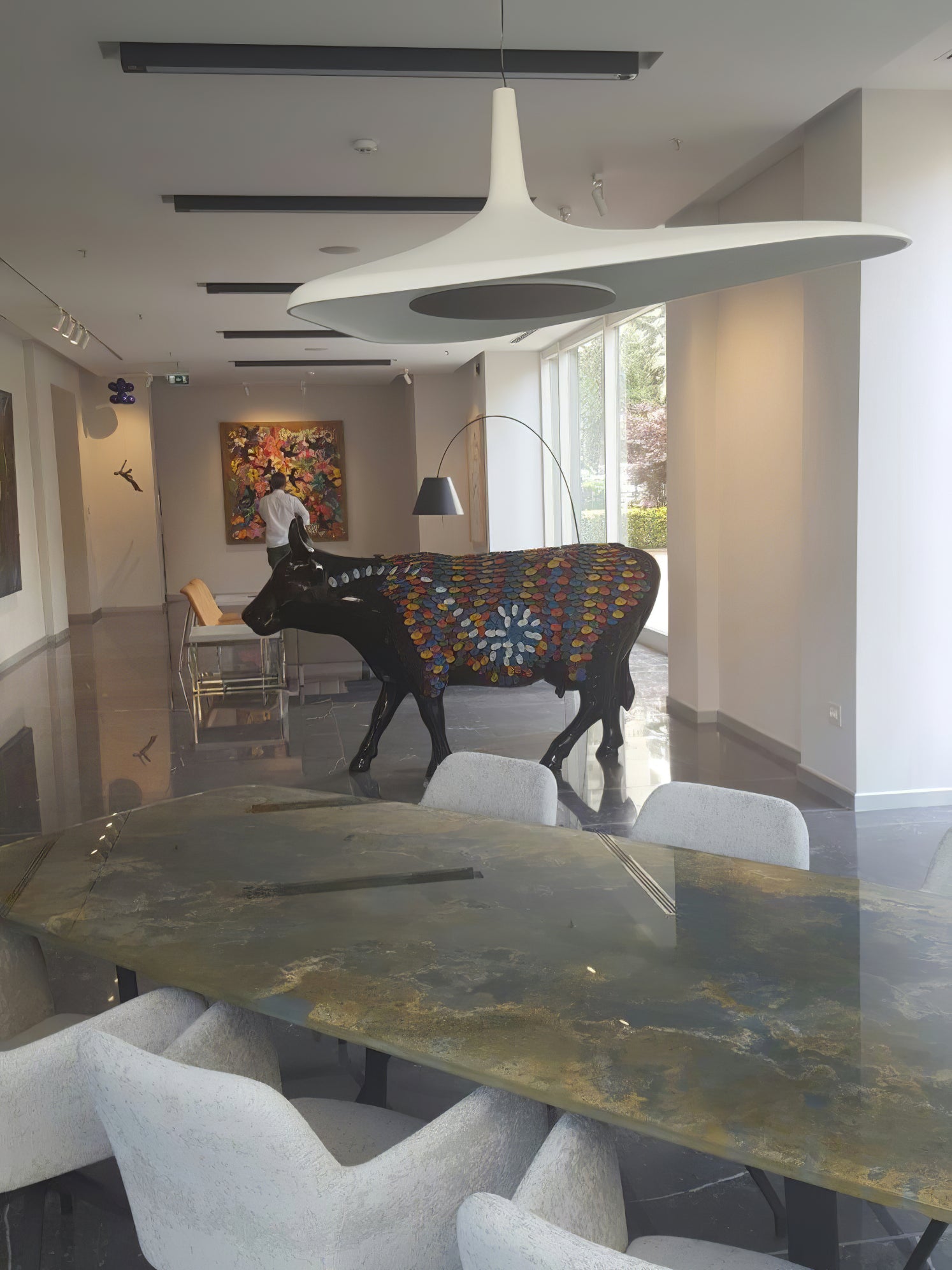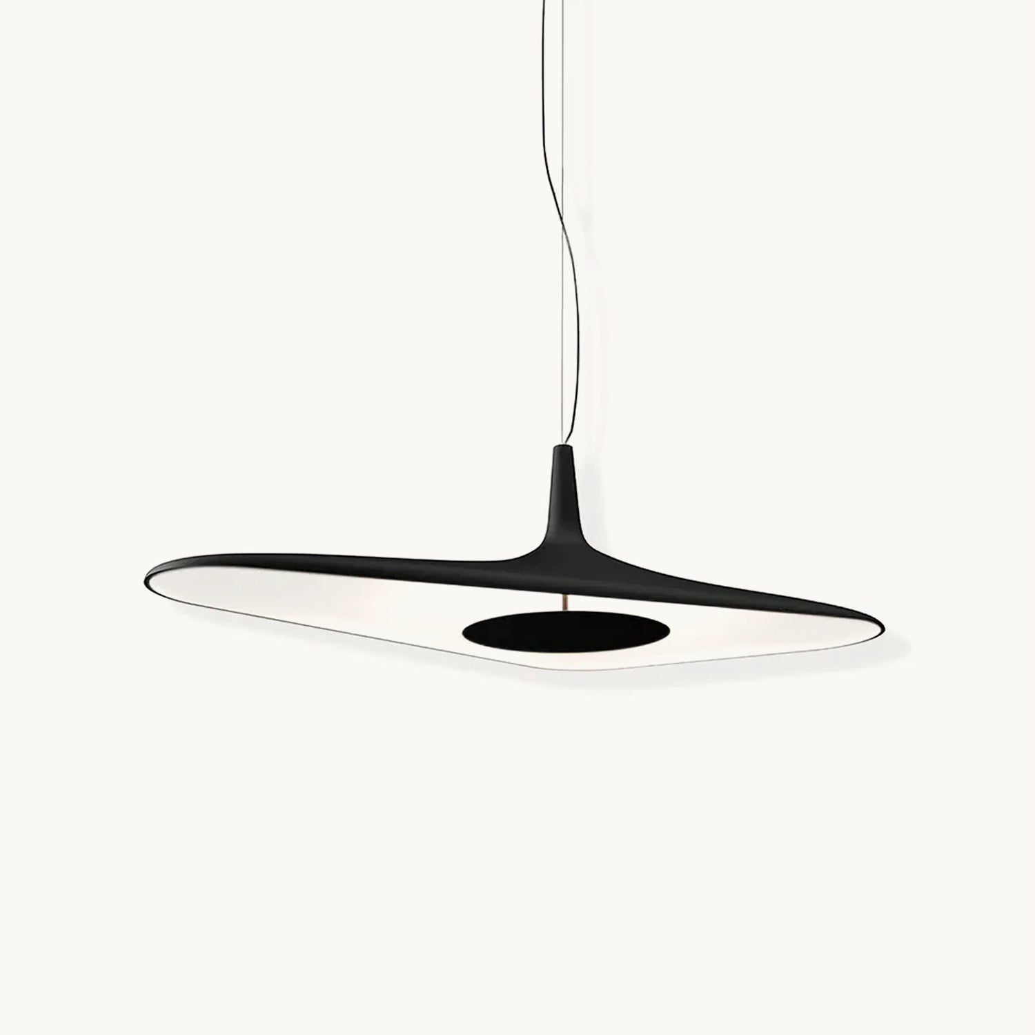 Supported by a single asymmetrical cable, the lamp maintains its barycentric balance thanks to the thickness of the body which varies from 8 to 25 mm, and is proposed as a slender and aerial lighting element, capable of bringing light with discretion and elegance. It is an object that defies the laws of statics, thanks to the technology that allows a design to the limit of the impossible.