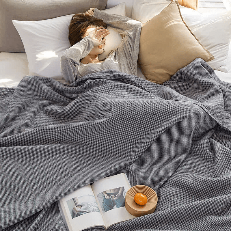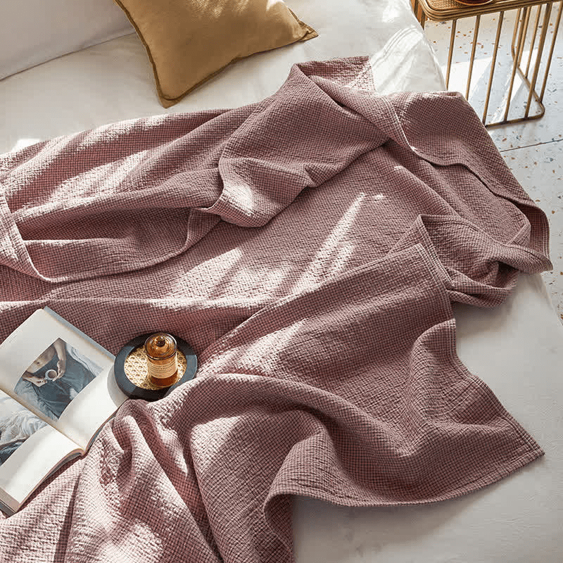 The simple solid color and grid pattern can add a distinctive charm to diverse home styles. Its reversible design adds reliable strength for use and washing. Adopted with reactive printing and jacquard technology. This quilt is suitable as a daily blanket for summer or a bedsheet on your bed. It also can be used as an air conditioning blanket, airplane blanket, bedside towel, sofa blanket, or shawl blanket.