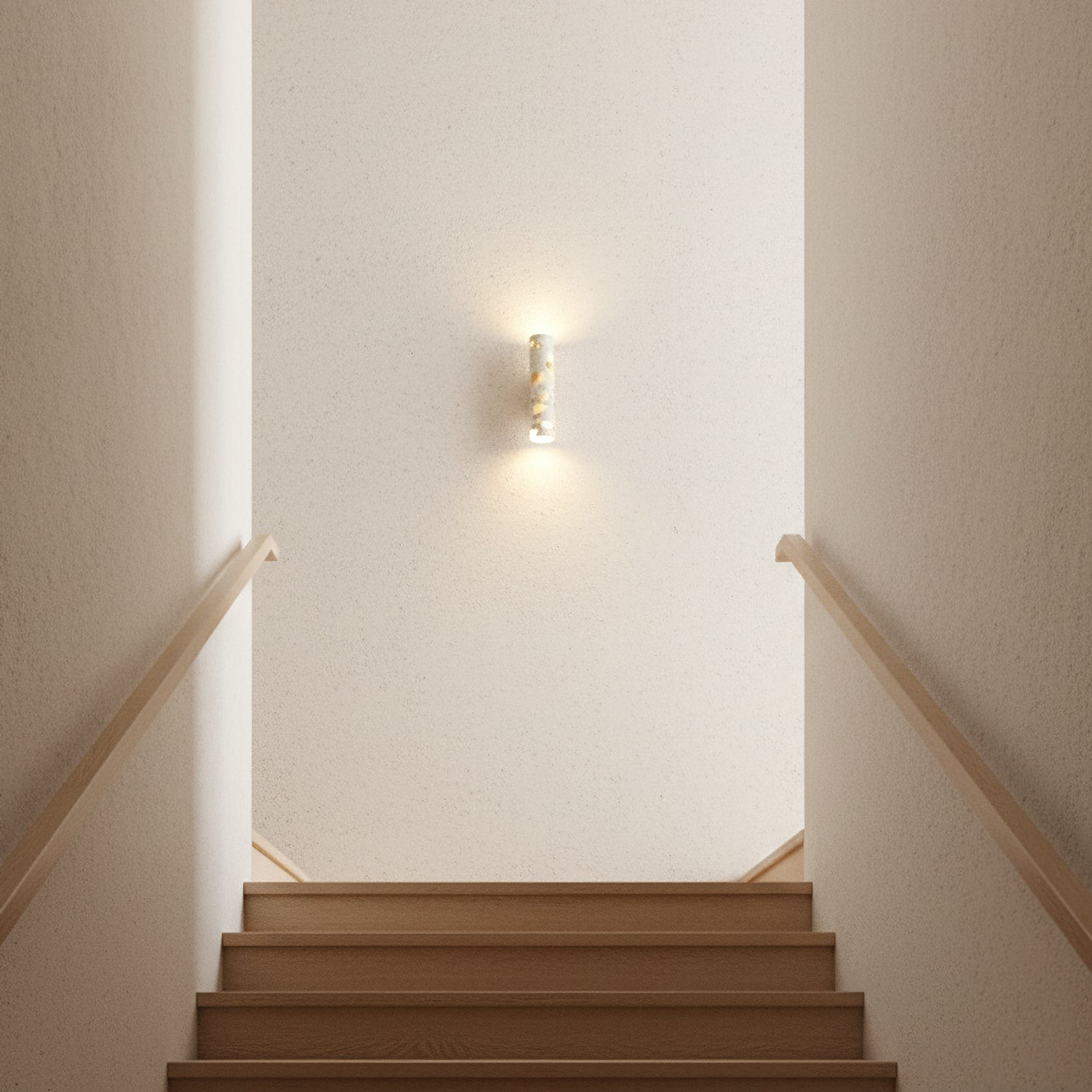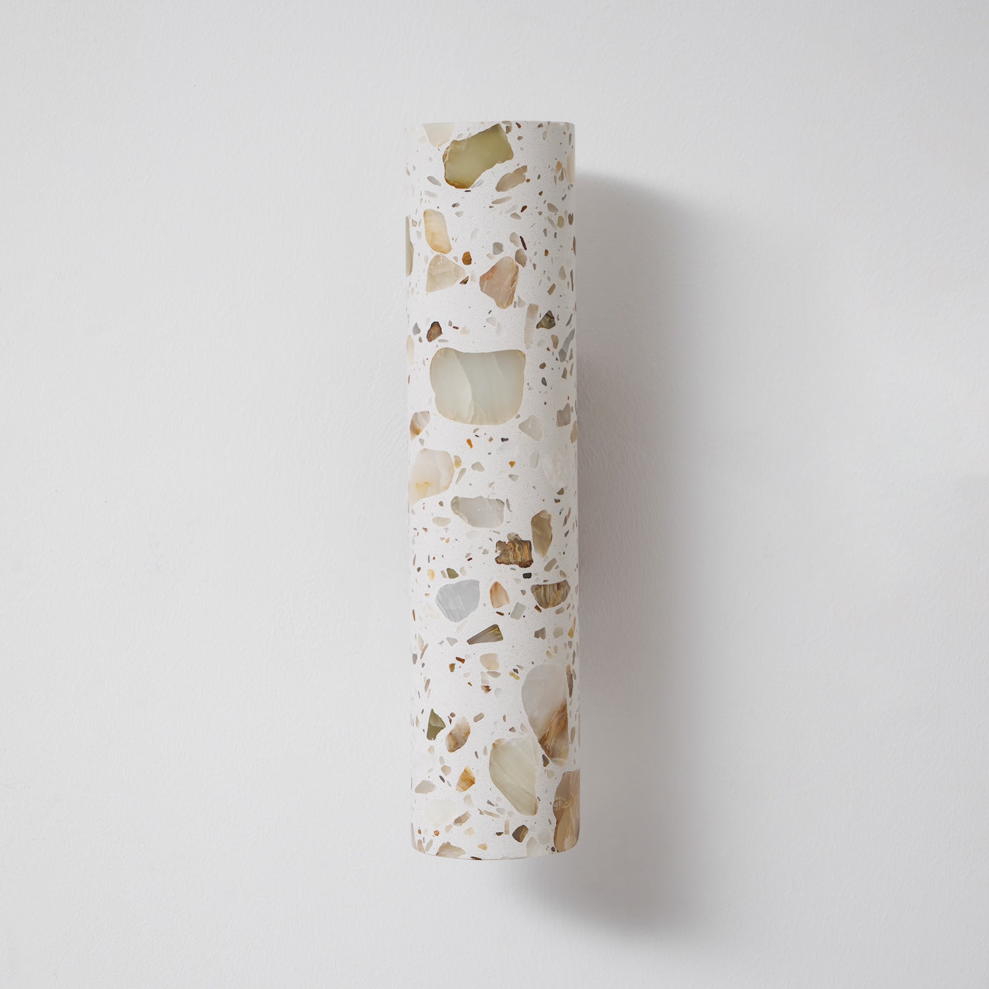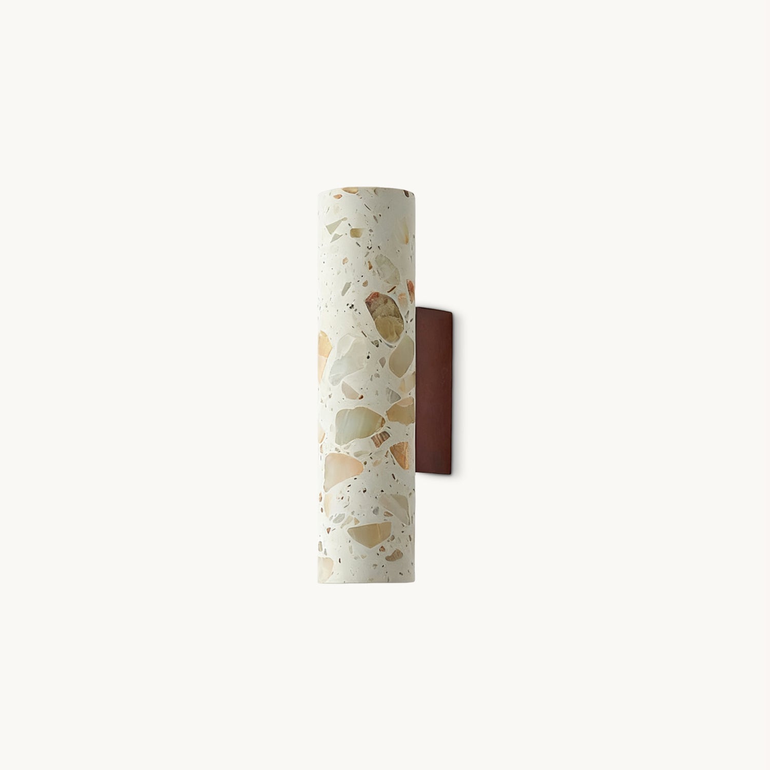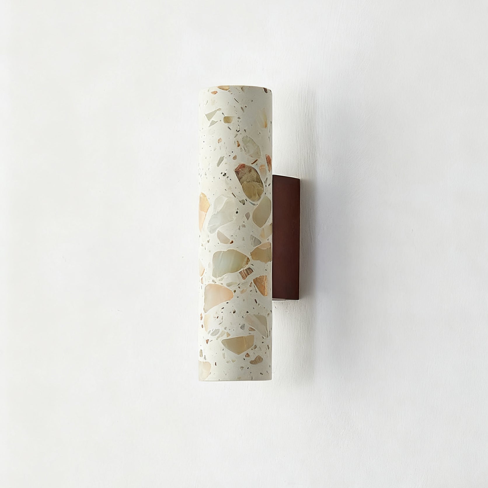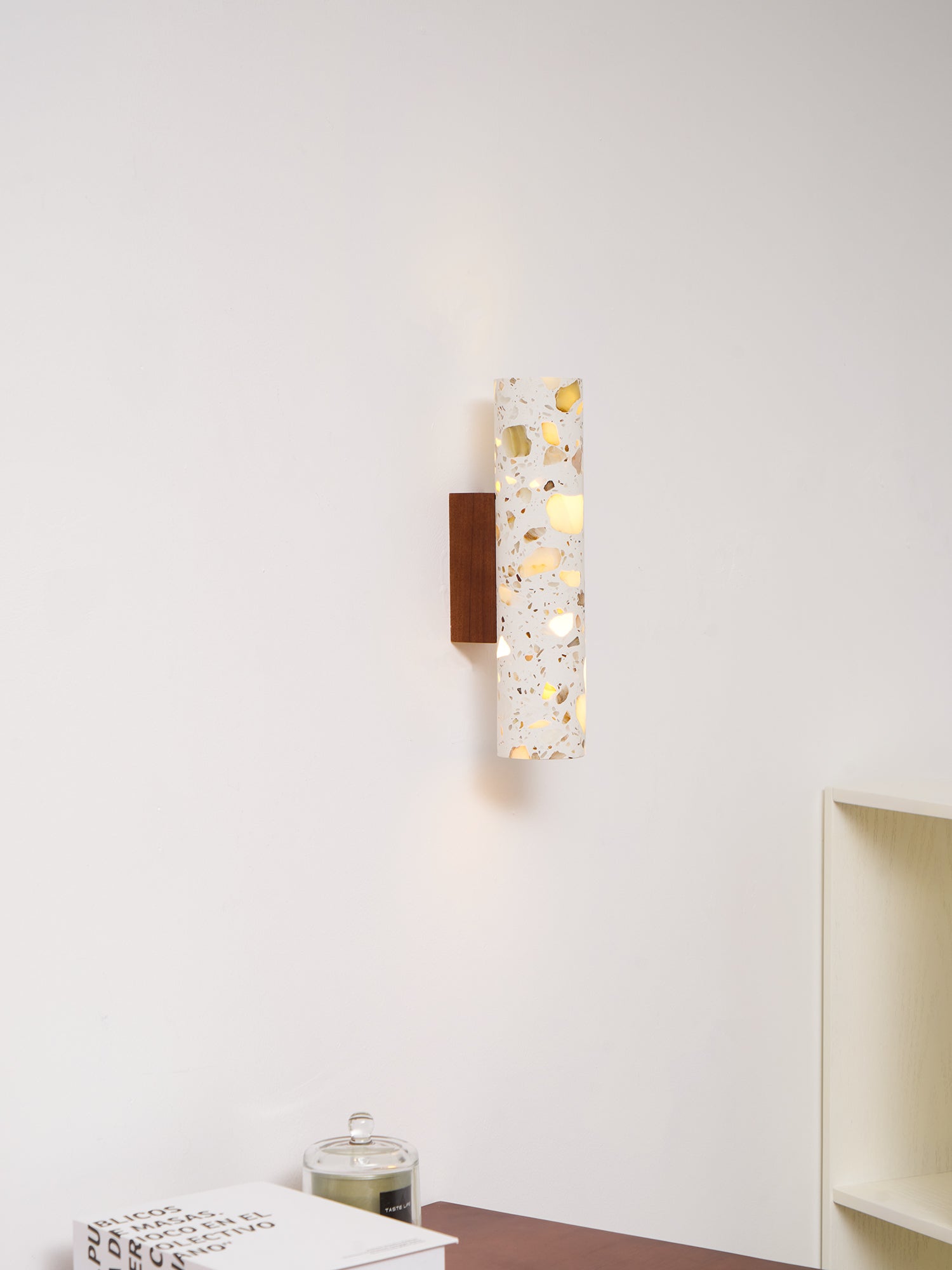 The Solis Column Wall Lamp from Mooijane blends timeless design with natural materials. Its cylindrical terrazzo shade, crafted from high-quality marble chips, features a unique, organic surface pattern that adds sophistication to any space. Complemented by a sturdy wood mounting base, the warm, earthy tones of the terrazzo contrast beautifully with the smoothness of the wood.