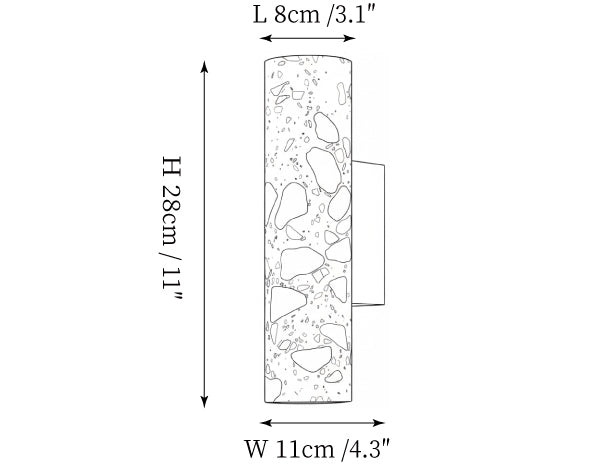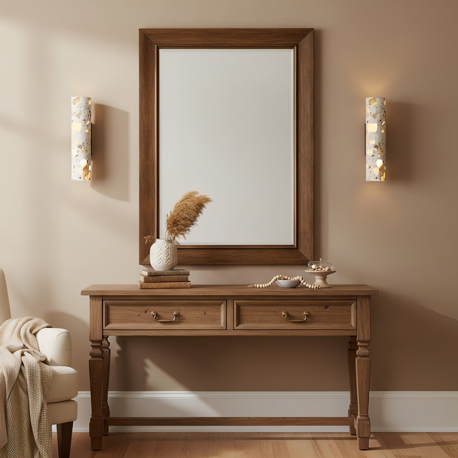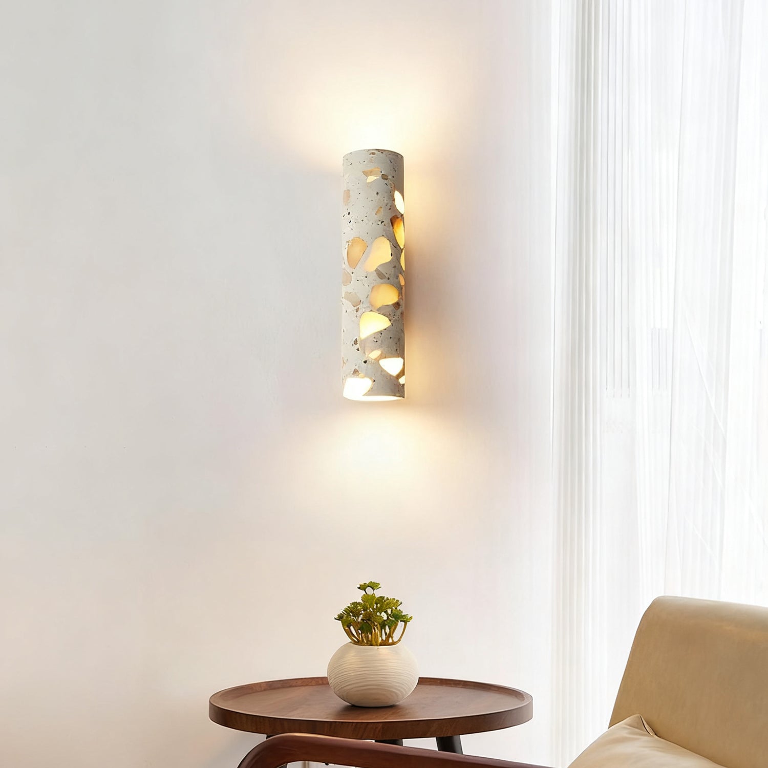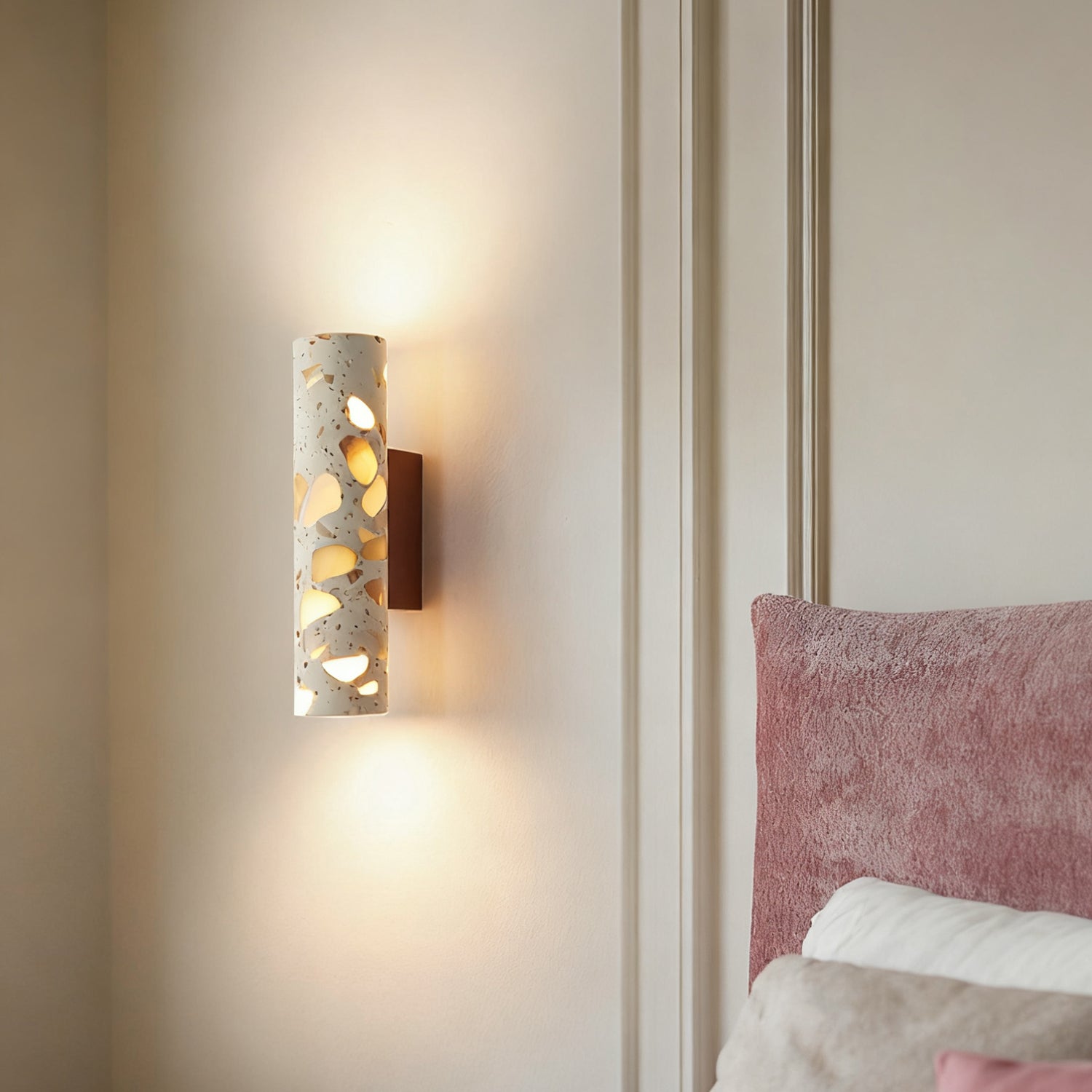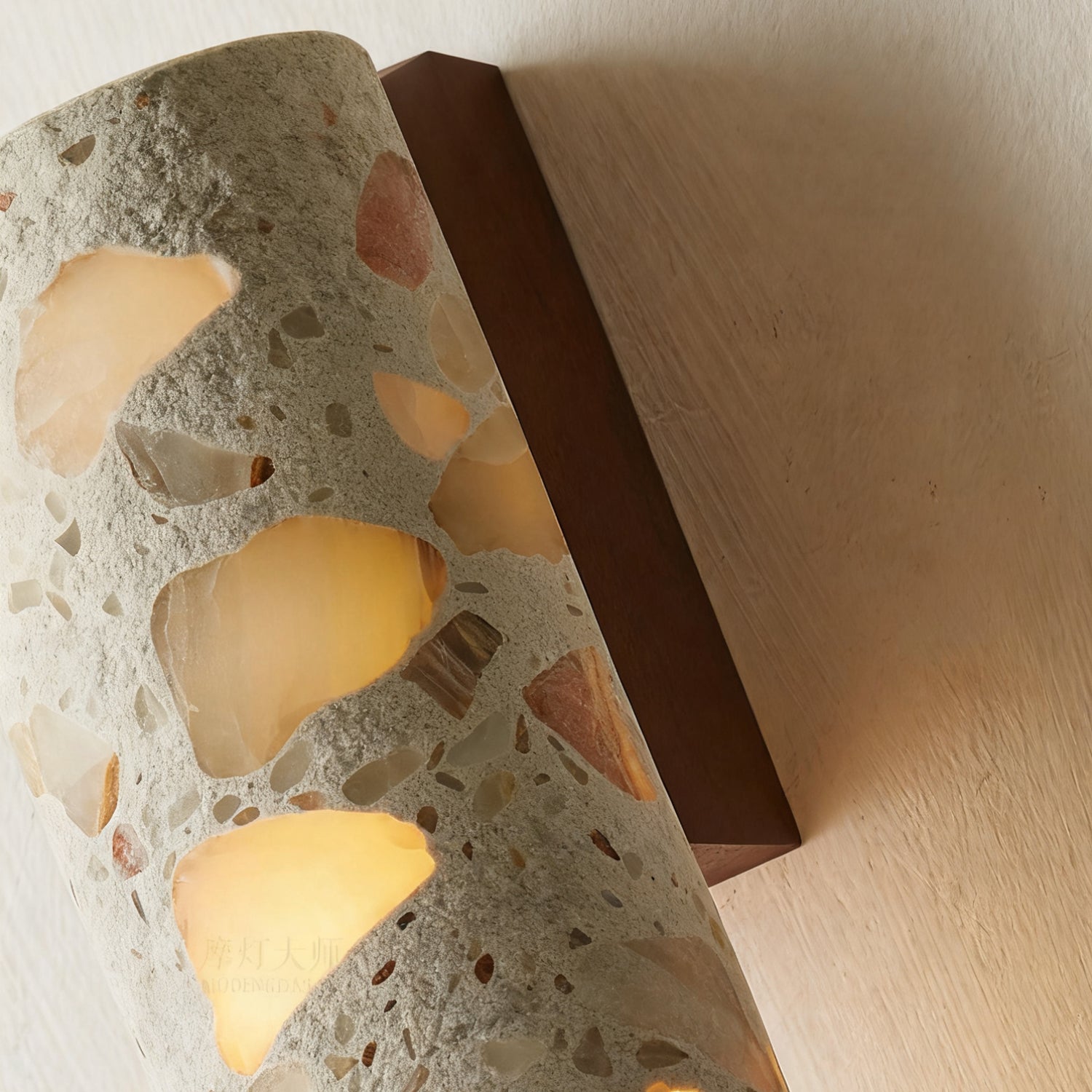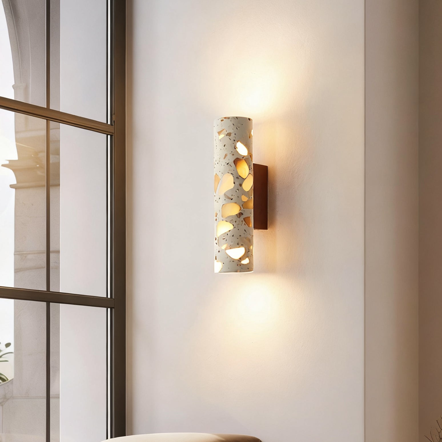 The Solis Column Wall Lamp from Mooijane blends timeless design with natural materials. Its cylindrical terrazzo shade, crafted from high-quality marble chips, features a unique, organic surface pattern that adds sophistication to any space. Complemented by a sturdy wood mounting base, the warm, earthy tones of the terrazzo contrast beautifully with the smoothness of the wood.