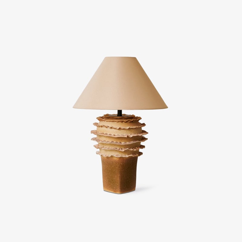 The Sonoran Table Lamp from Mooijane blends natural materials and artistic craftsmanship in a refined, sculptural design. Its ceramic base features hand-glazed, layered wave patterns inspired by rocks and petals, offering rich texture and visual depth. A soft beige fabric shade complements the form, diffusing light warmly and gently. Supported by a concealed metal pole for added stability, this piece brings organic elegance to living rooms, bedrooms, or reading nooks.