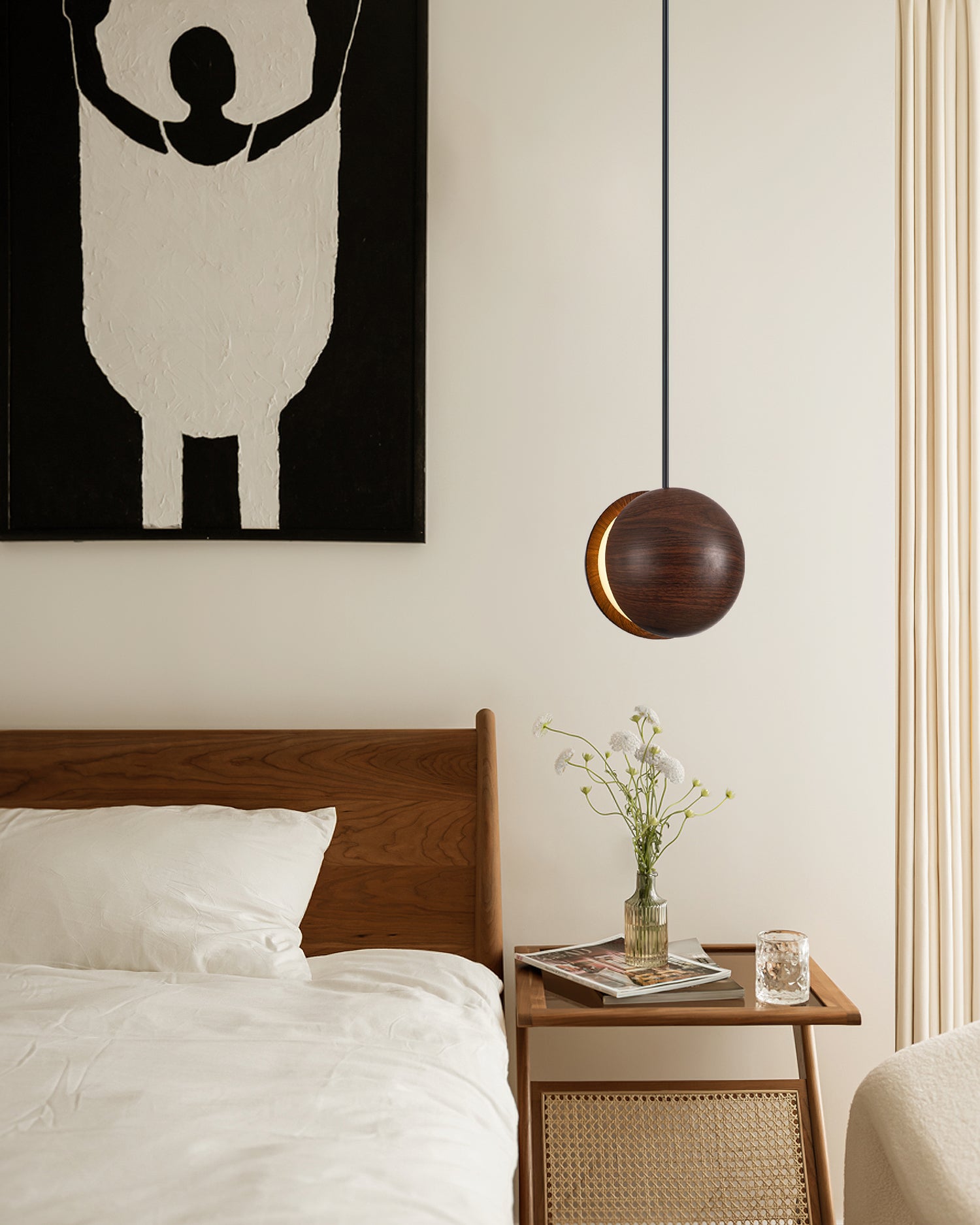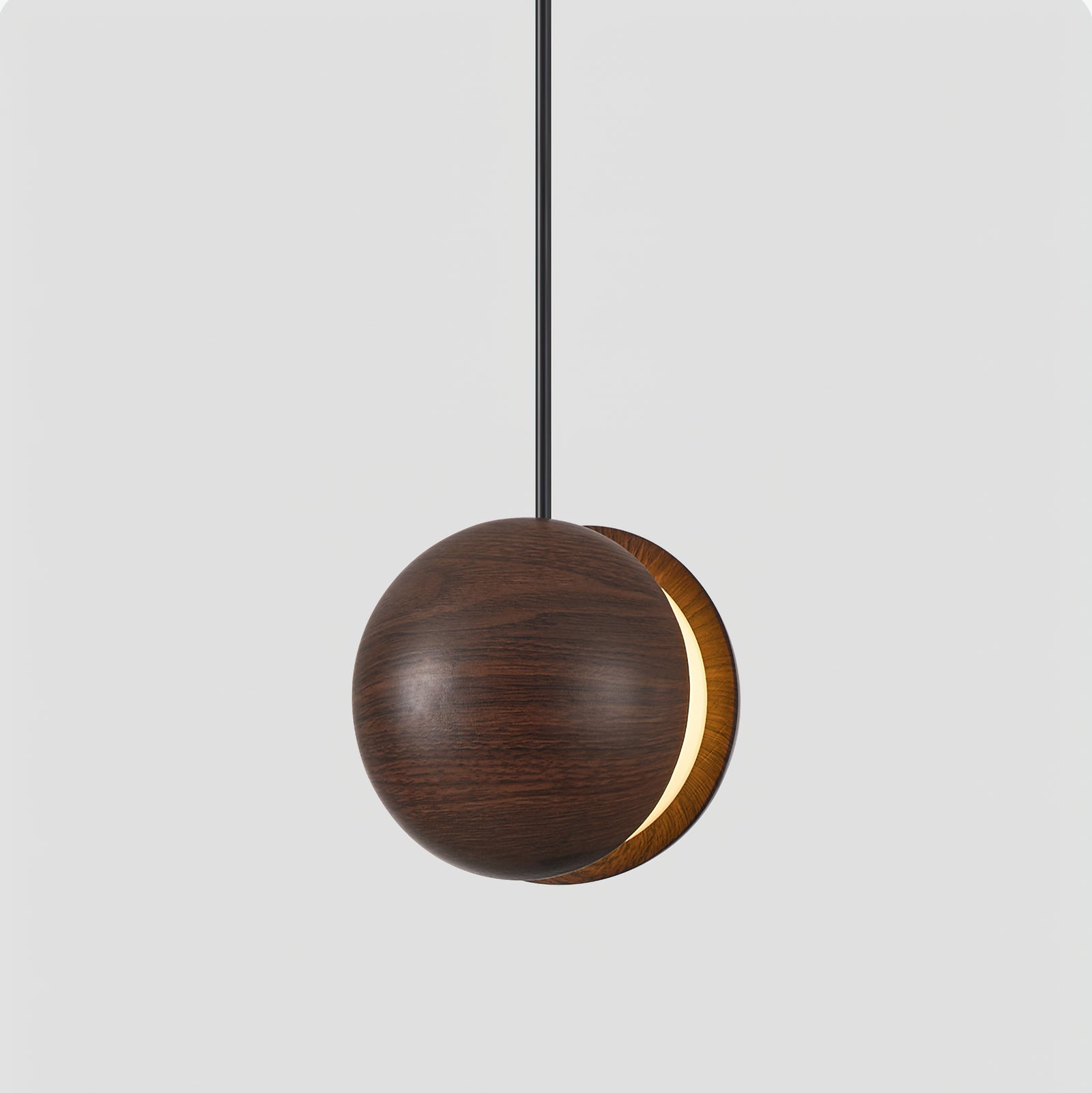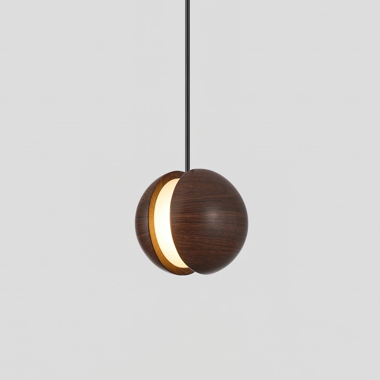 The Stalvos Pendant Lamp by Mooijane, with its simple spherical shape and rich walnut grain, adds a sense of warmth and comfort to any interior. Its two-part walnut-colored resin shade, separated by a delicate gap, casts a soft, moonlit glow, creating a tranquil and enchanting atmosphere. Blending the natural warmth of walnut with a modern, minimalist design, it's an elegant choice for bedside lighting, dining room space, or a cozy reading nook.