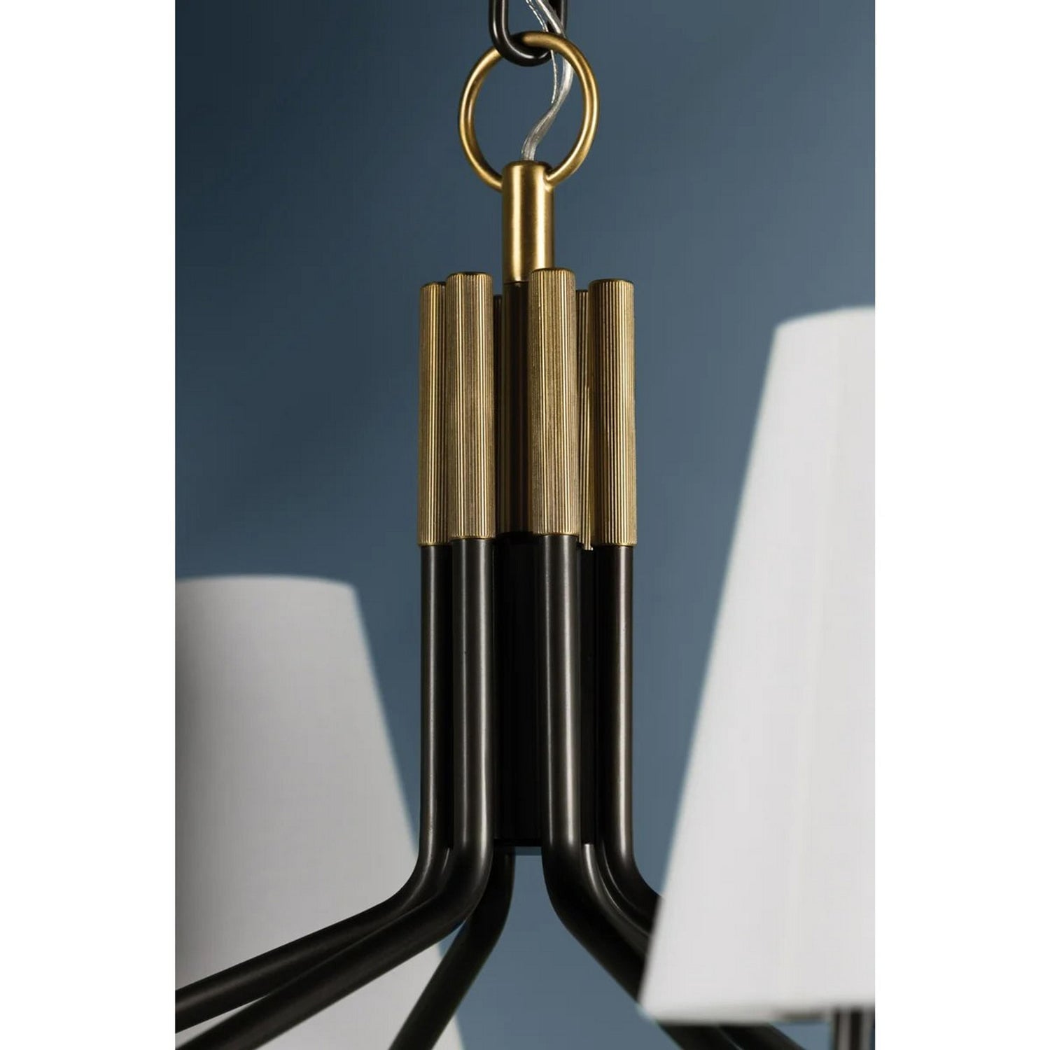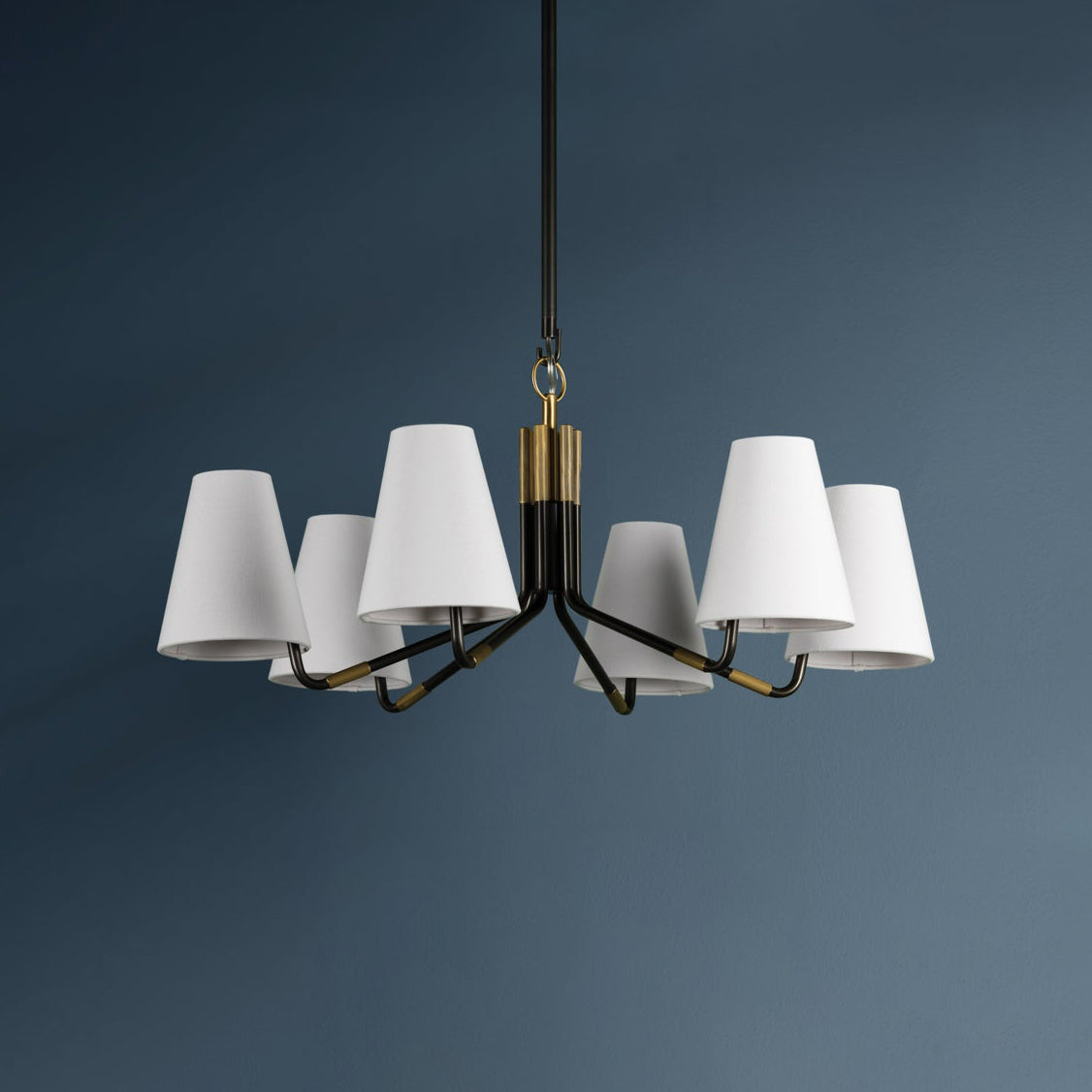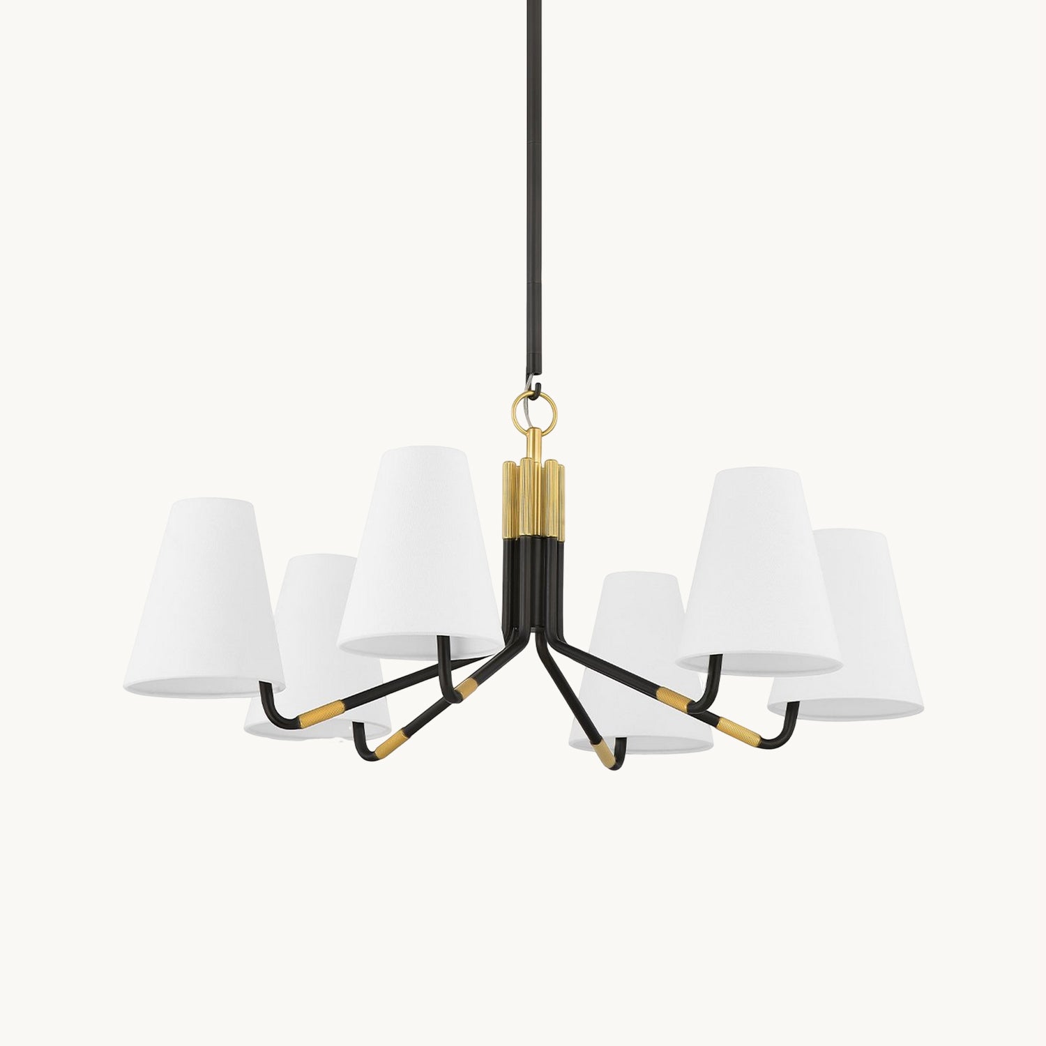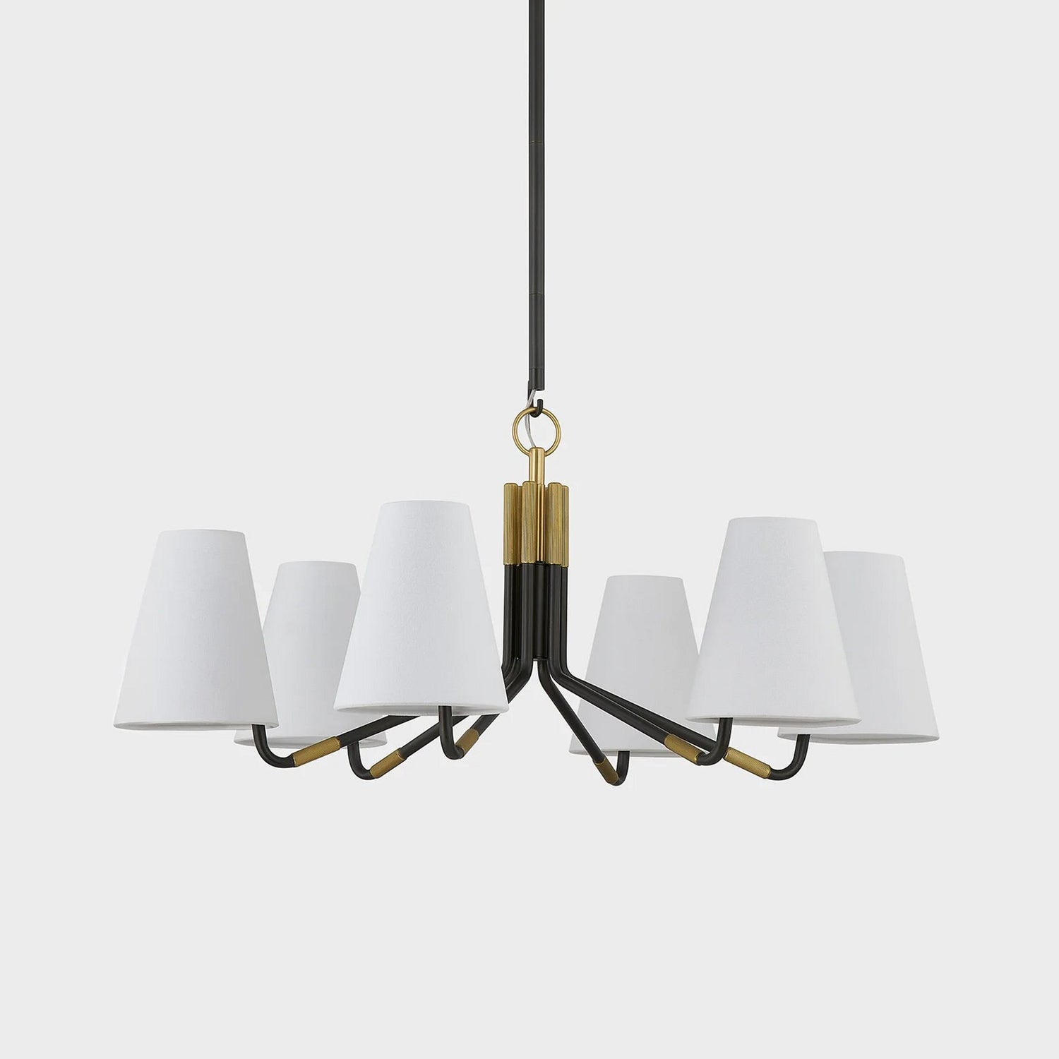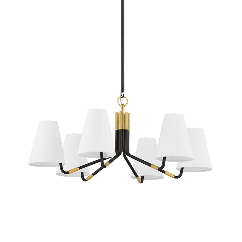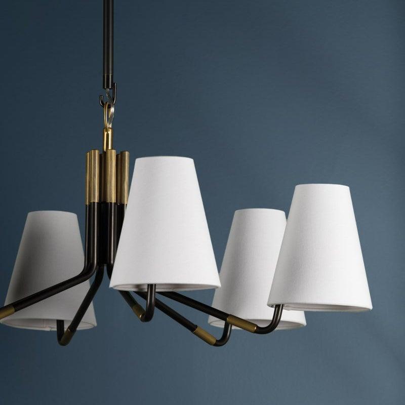 The Stanwyck Chandelier, designed by Mooijane, seamlessly blends traditional elegance with modern details. Its slender antique brass arms, accented with a brass cap and knurled band, support an off-center white linen shade for added visual appeal. The delicate hook and loop detailing adds a touch of sophistication and timelessness, making it the perfect addition to any space.