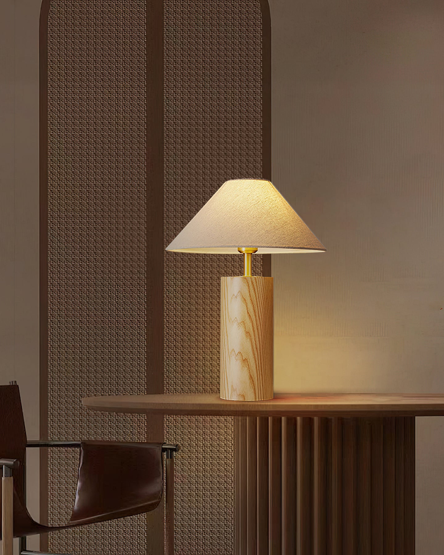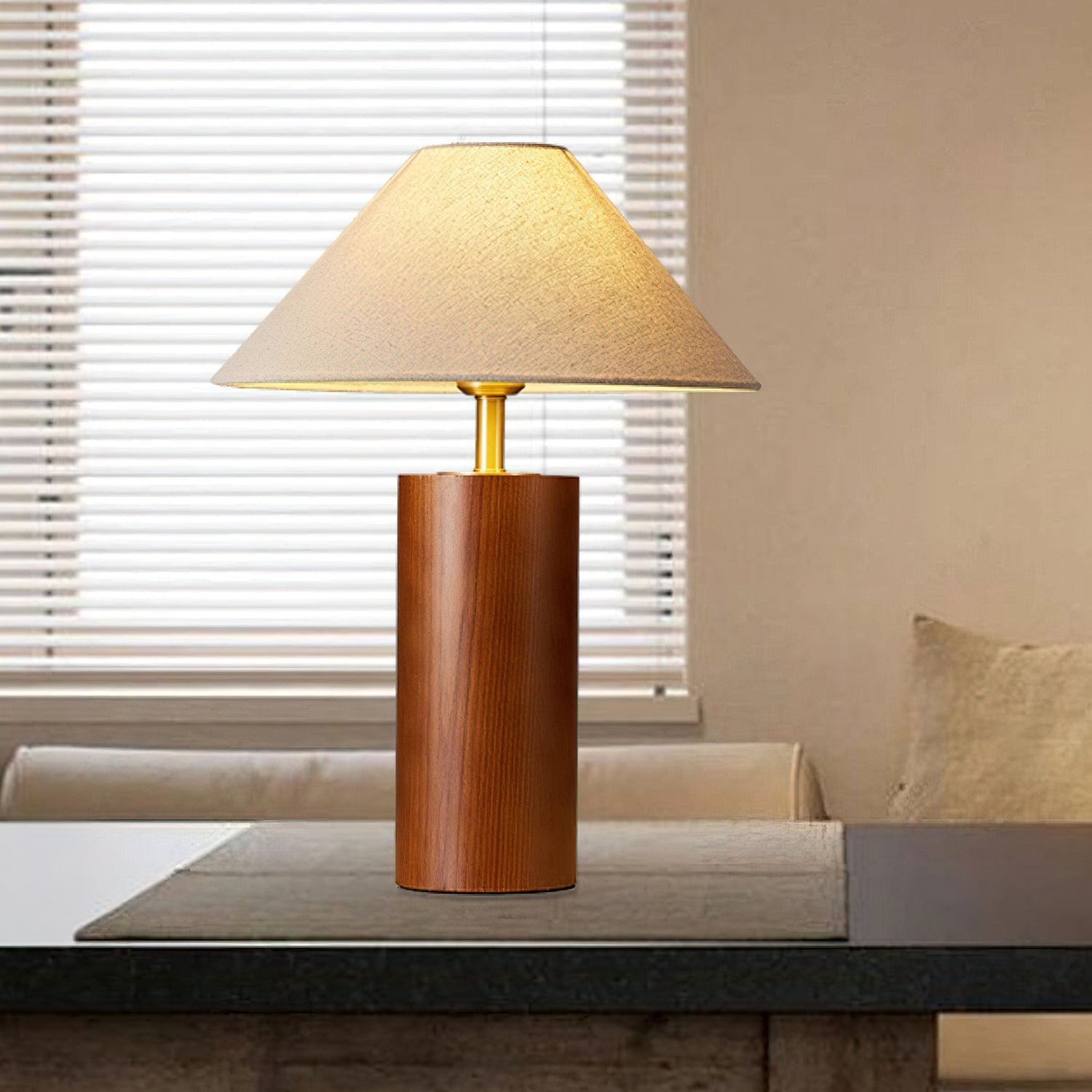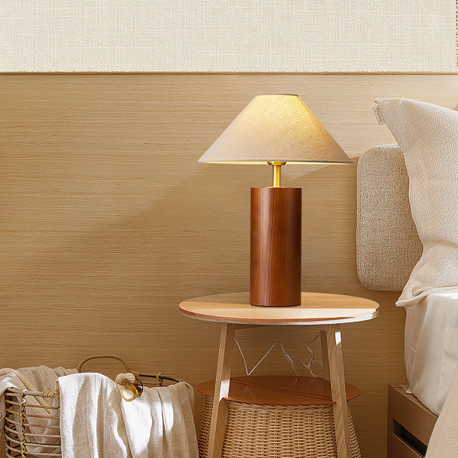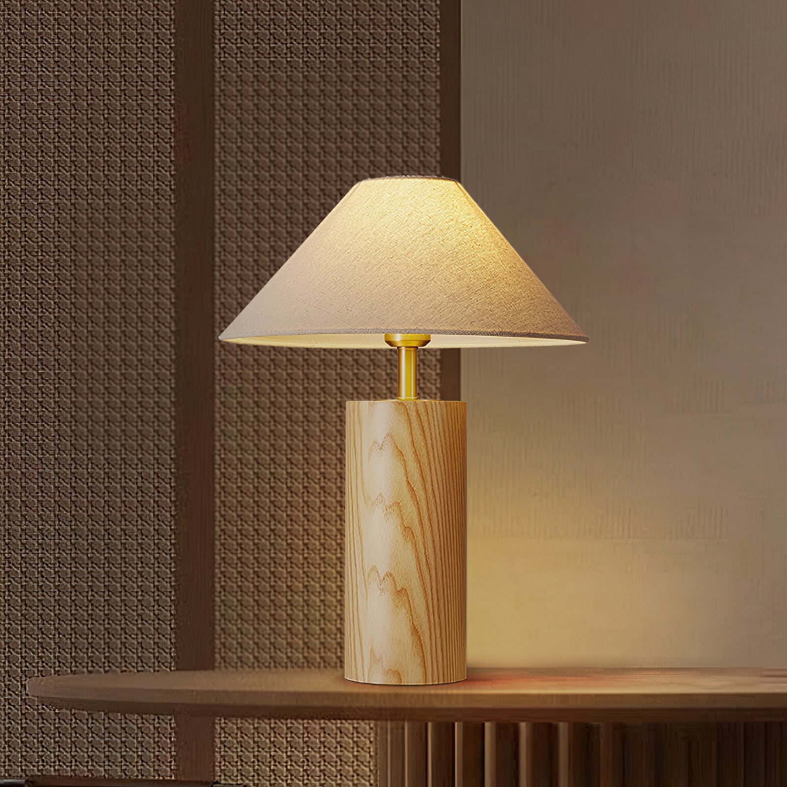 Elevate your space with the Starr Wood Table Lamp from Mooijane. Crafted with a walnut or natural wood base and a sleek brass neck, its classic design exudes an air of sophistication. The textured beige shade emits a warm, homey glow, perfect for creating a serene atmosphere.