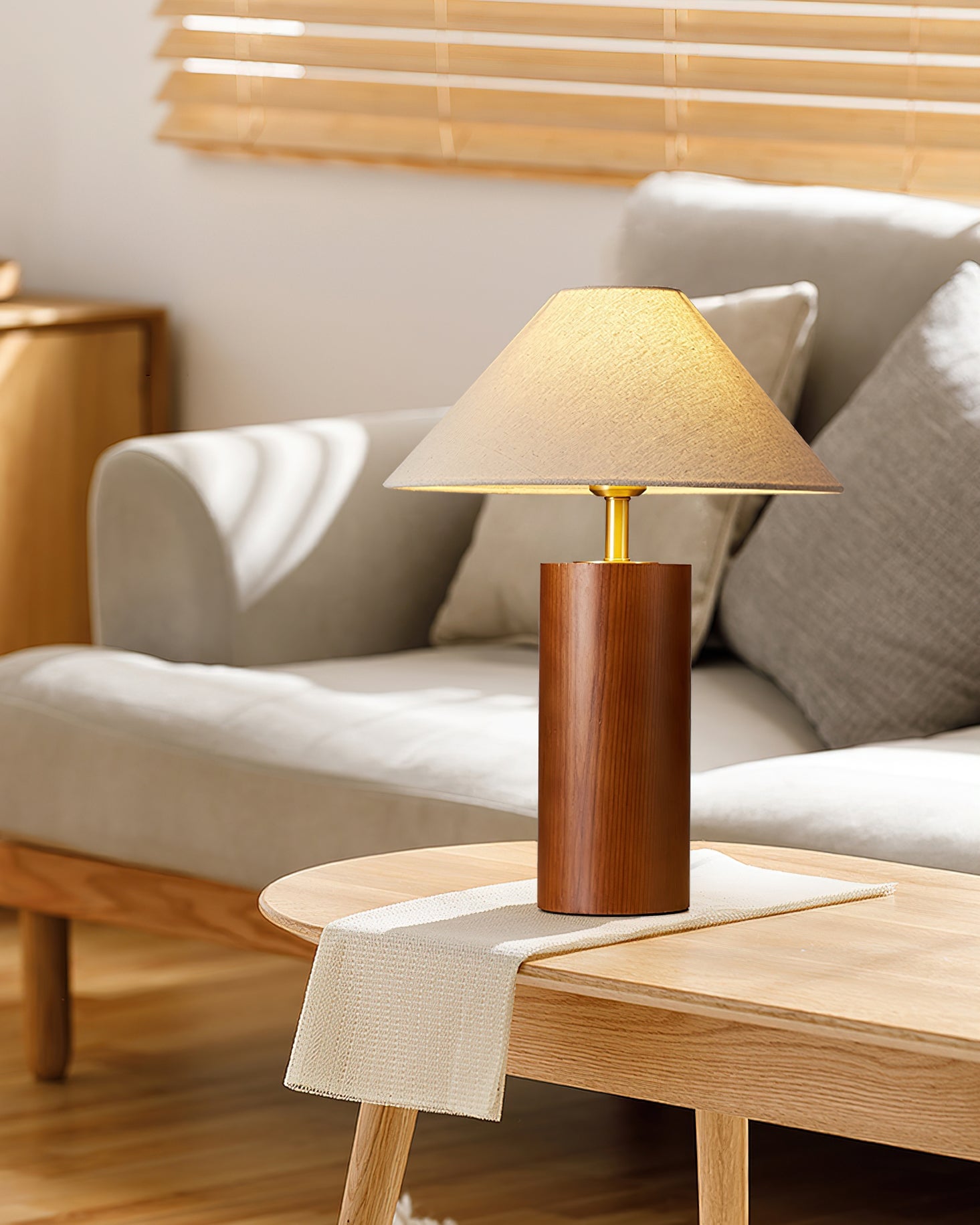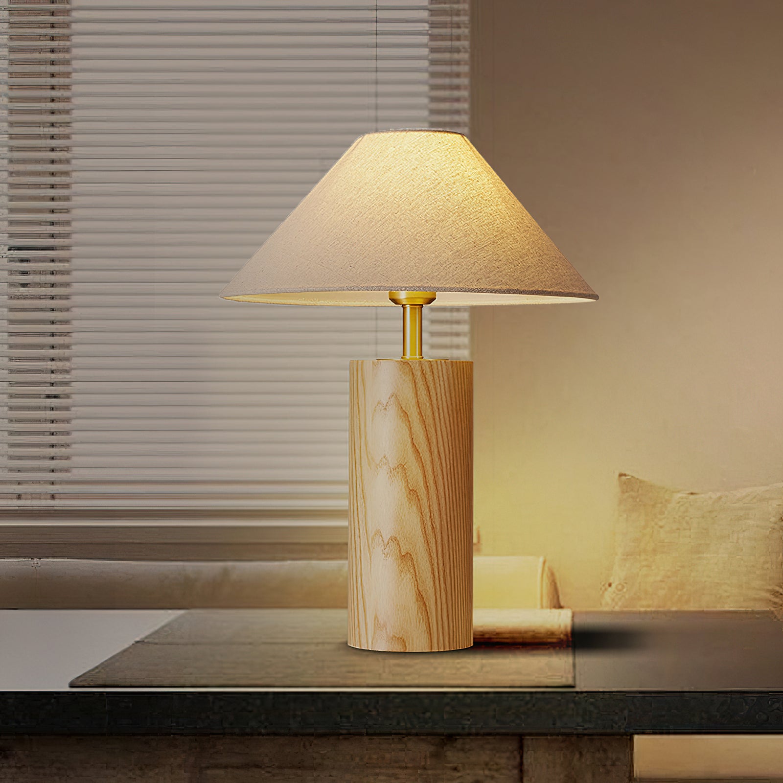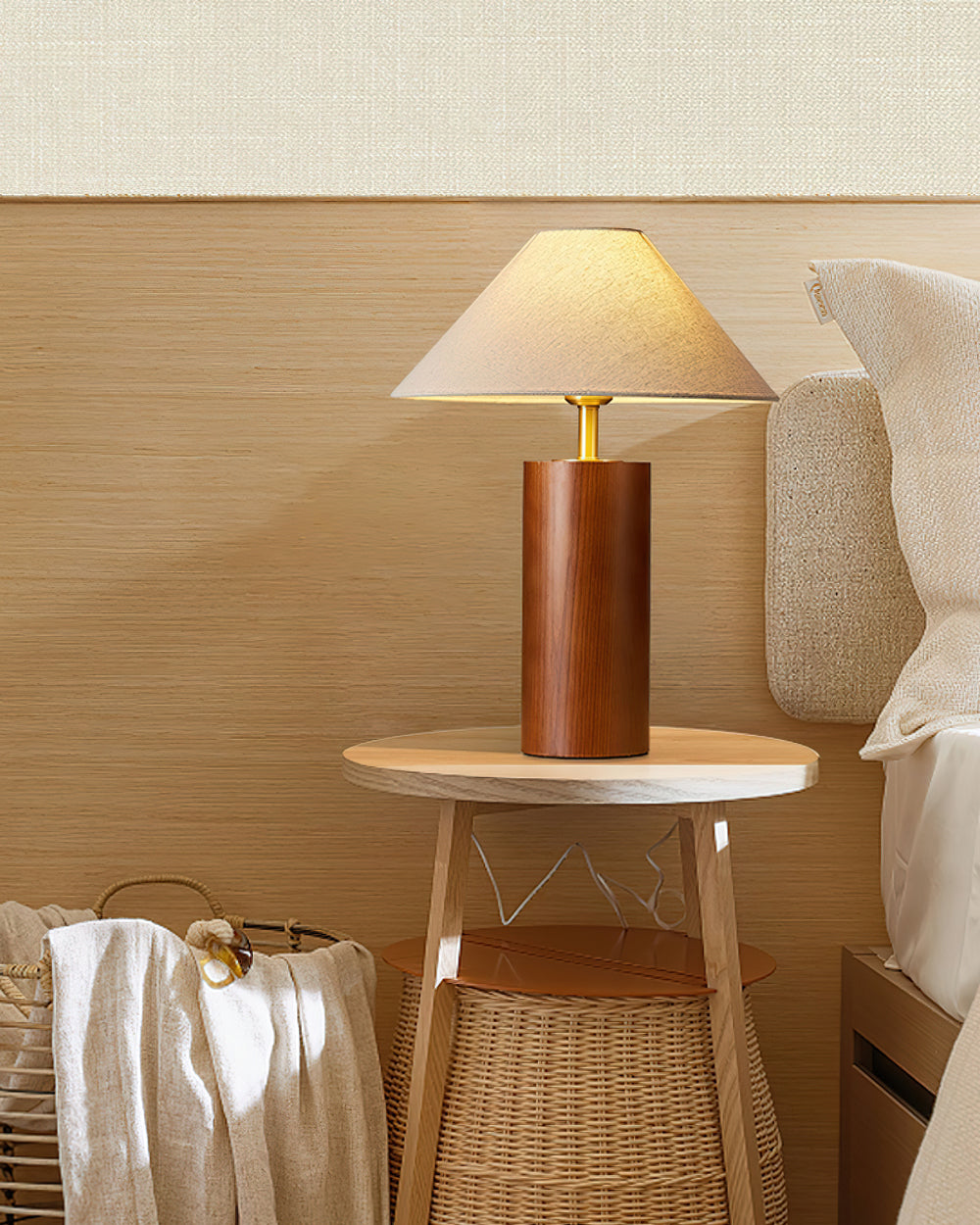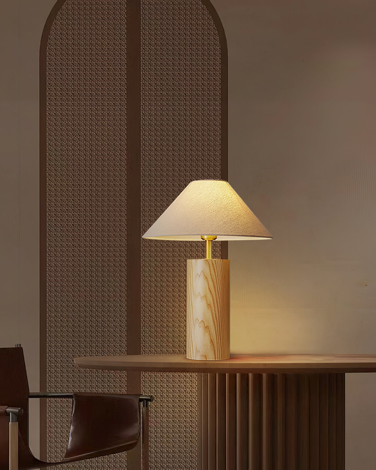 Elevate your space with the Starr Wood Table Lamp from Mooijane. Crafted with a walnut or natural wood base and a sleek brass neck, its classic design exudes an air of sophistication. The textured beige shade emits a warm, homey glow, perfect for creating a serene atmosphere.