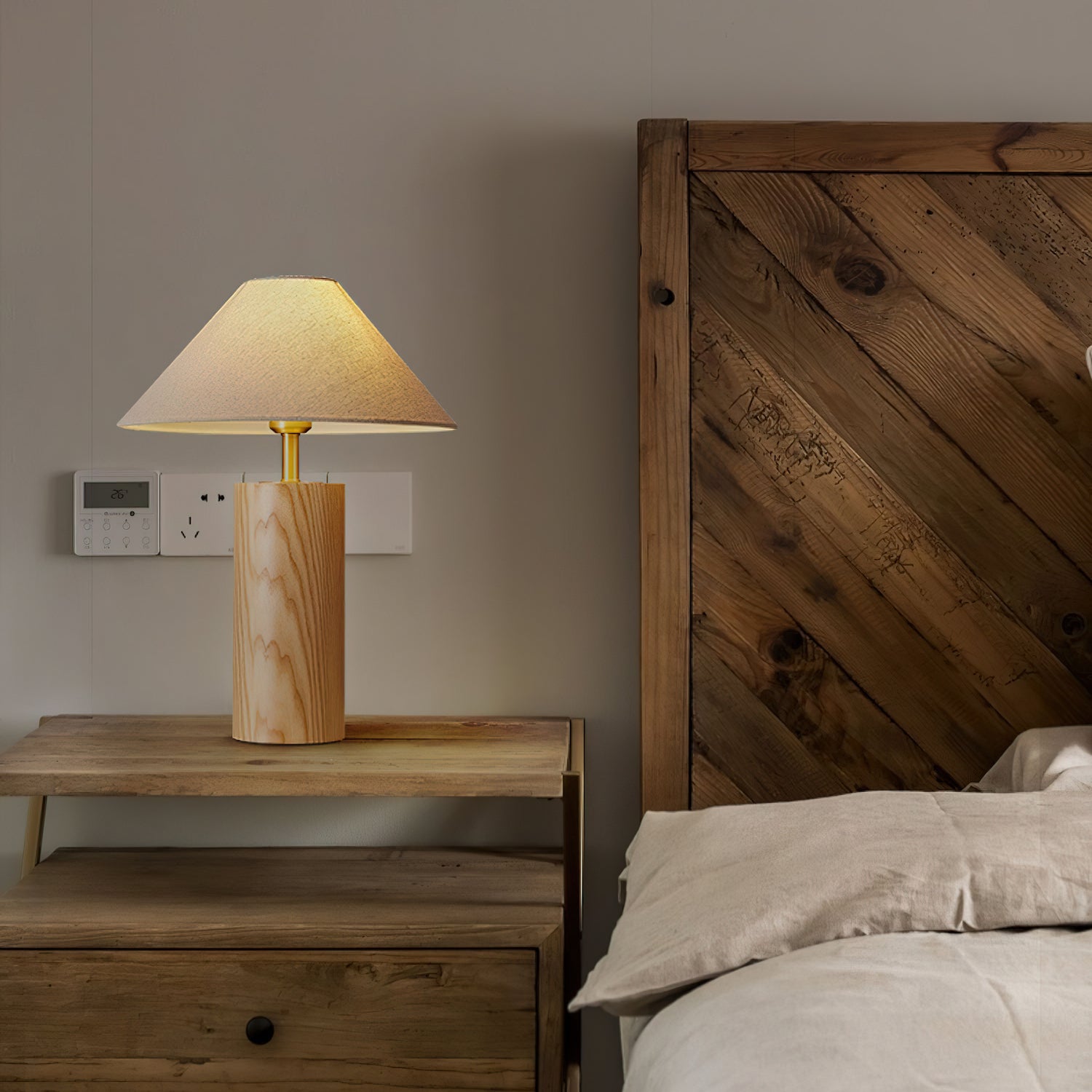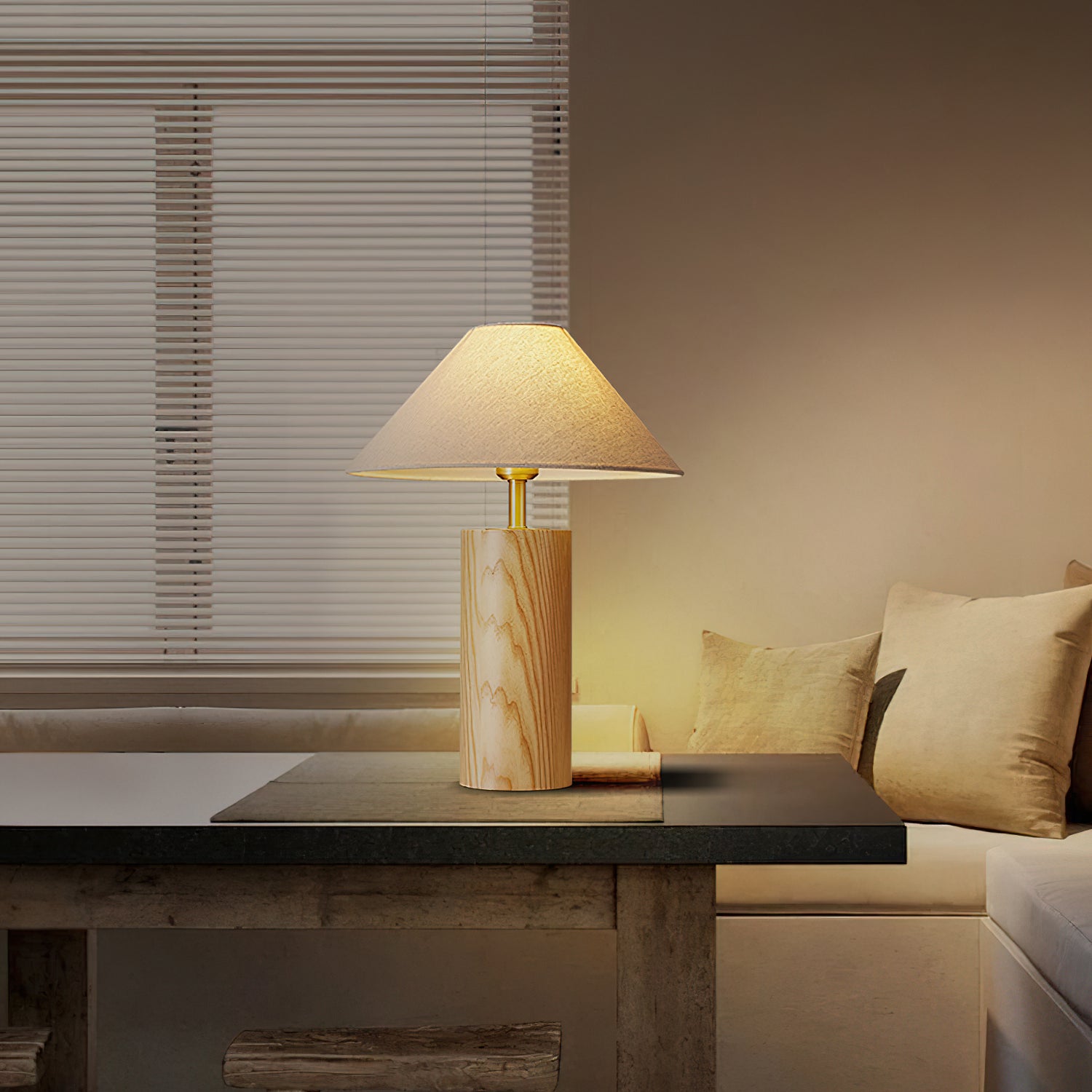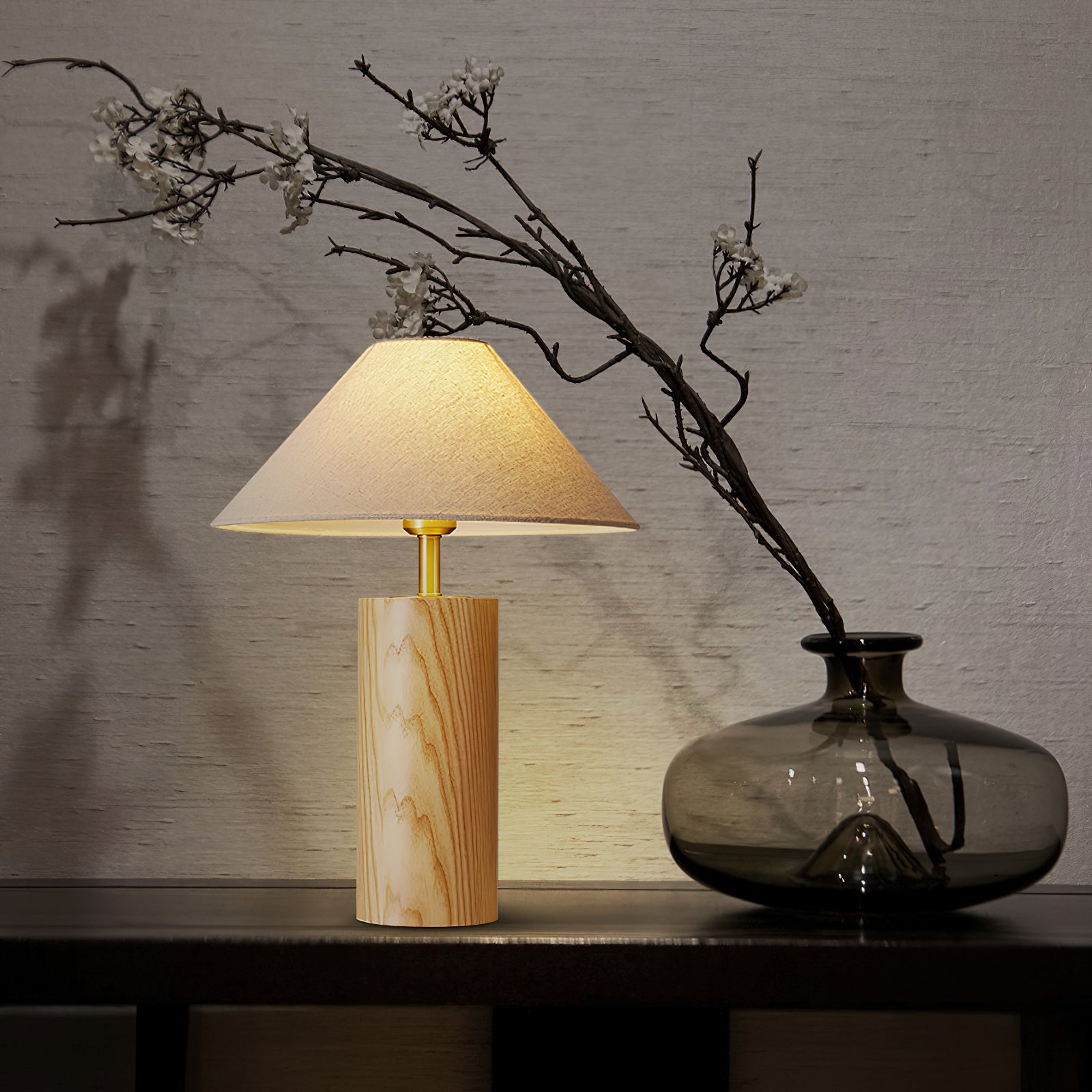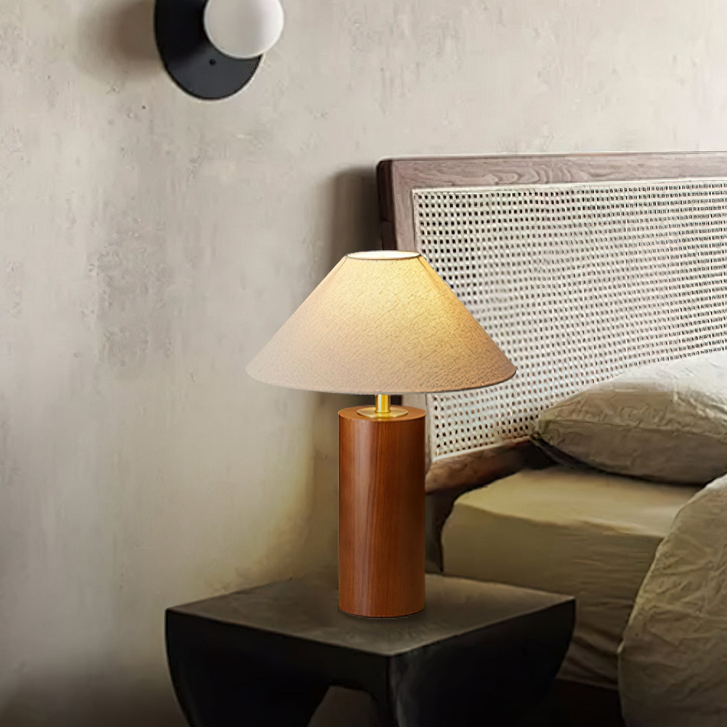 Elevate your space with the Starr Wood Table Lamp from Mooijane. Crafted with a walnut or natural wood base and a sleek brass neck, its classic design exudes an air of sophistication. The textured beige shade emits a warm, homey glow, perfect for creating a serene atmosphere.