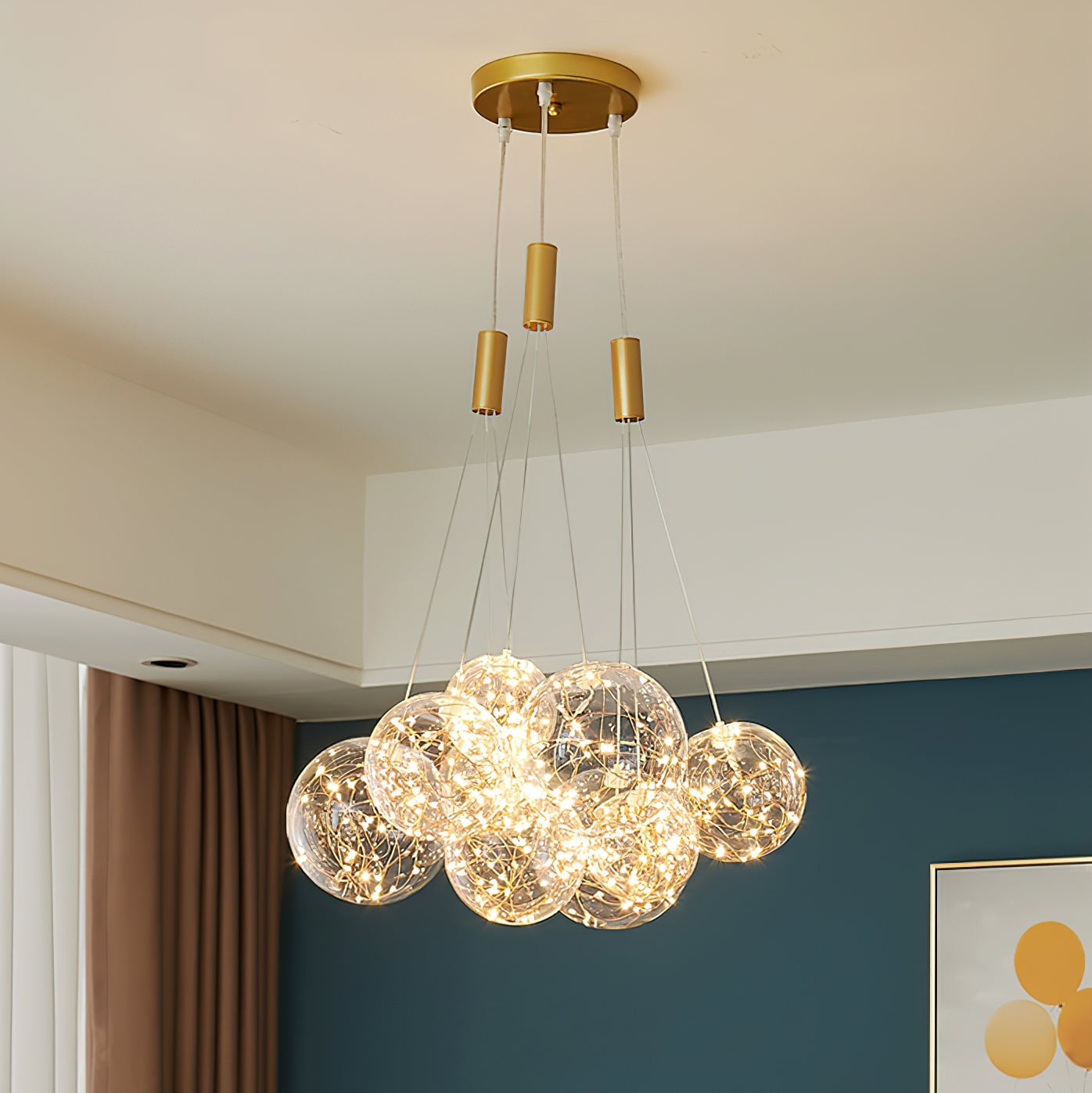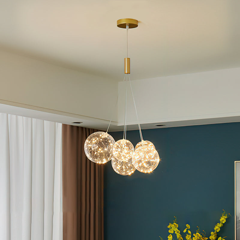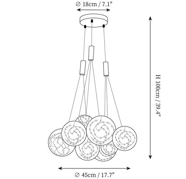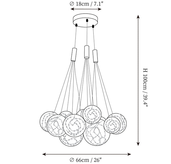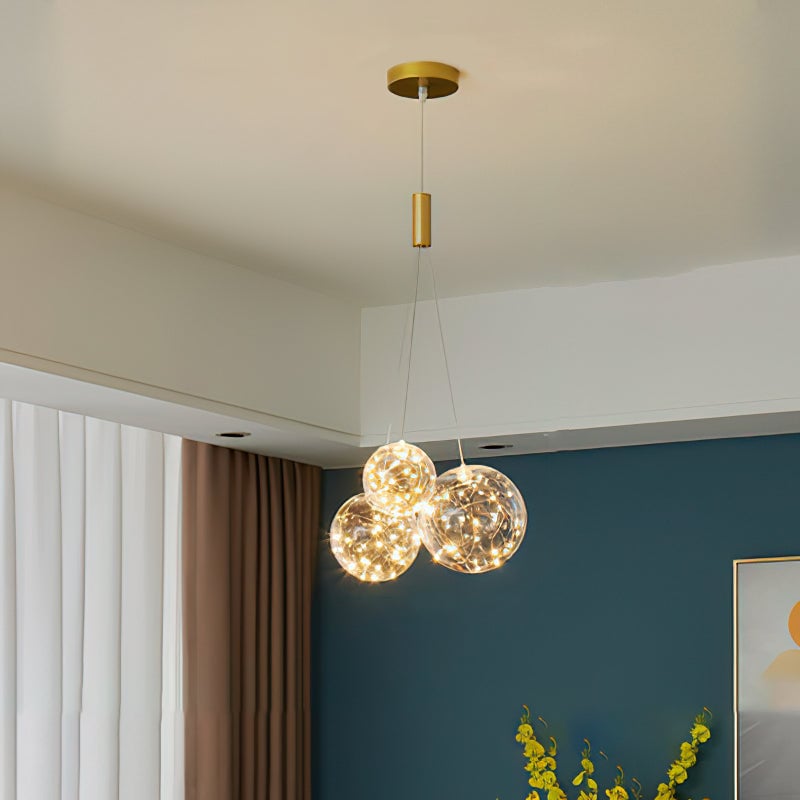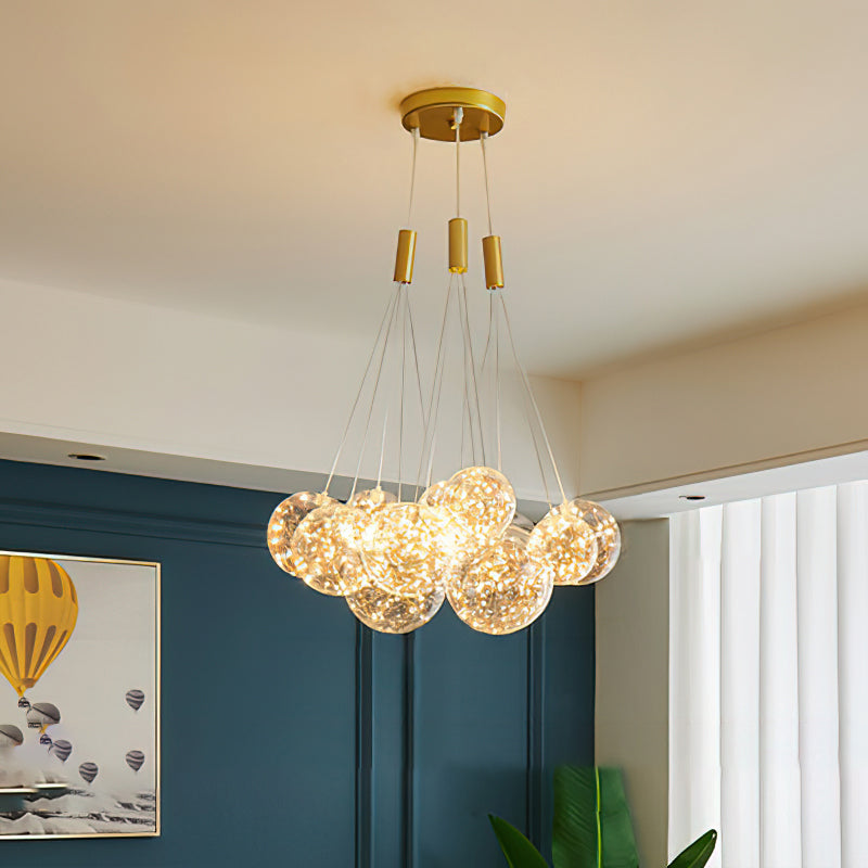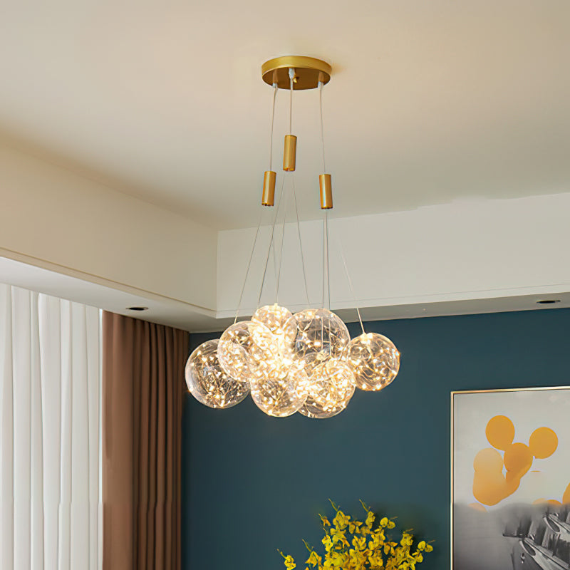Add a touch of glamour to your living space with this exquisite Starry Sky Chandelier. Crafted from glass suspended and needle gloss ball chandeliers for an eye-catching three-dimensional effect, the chandelier is further accentuated by bubble gloss detailing for a shimmering, luxurious finish. Transform your home into a regal abode with this unique, stylish piece.