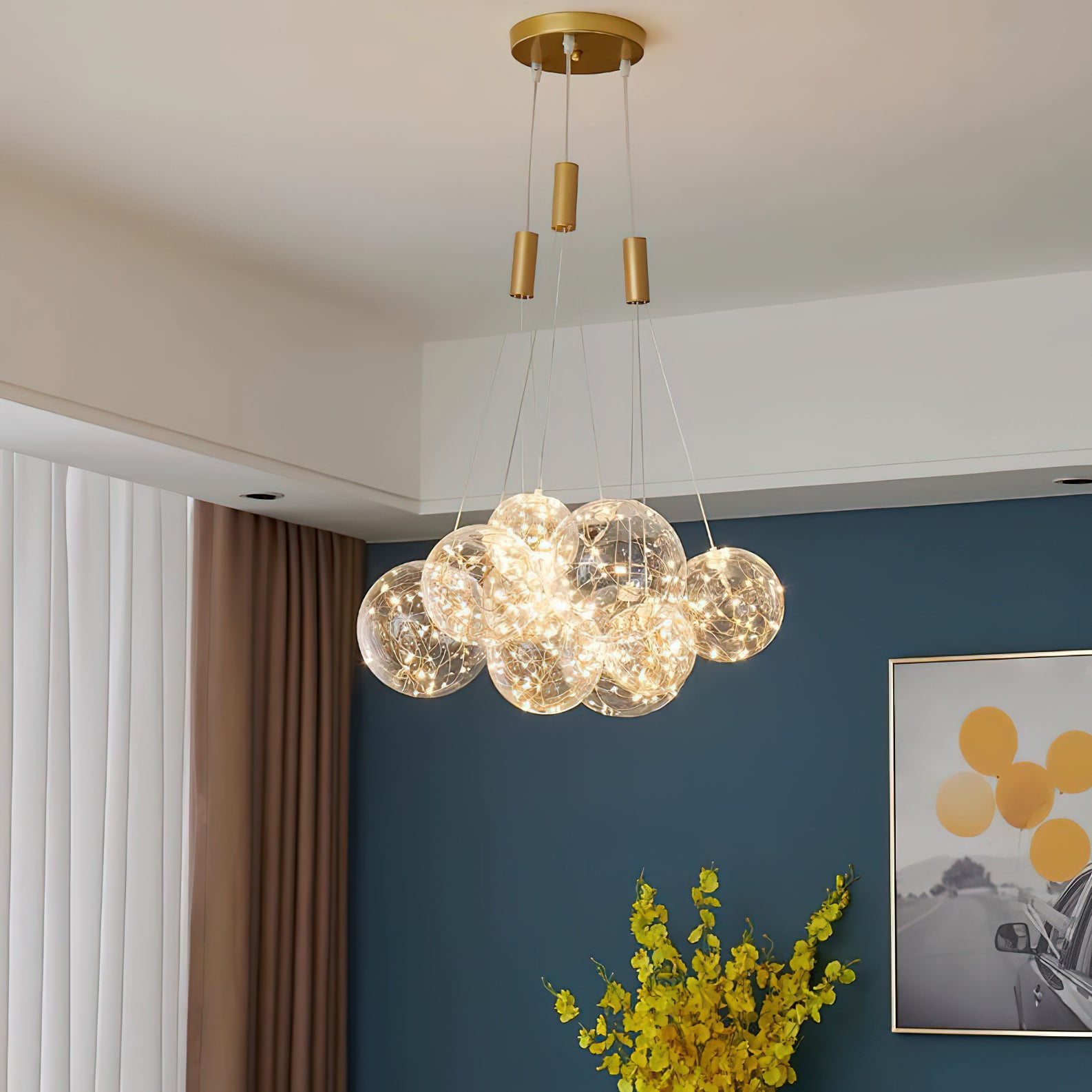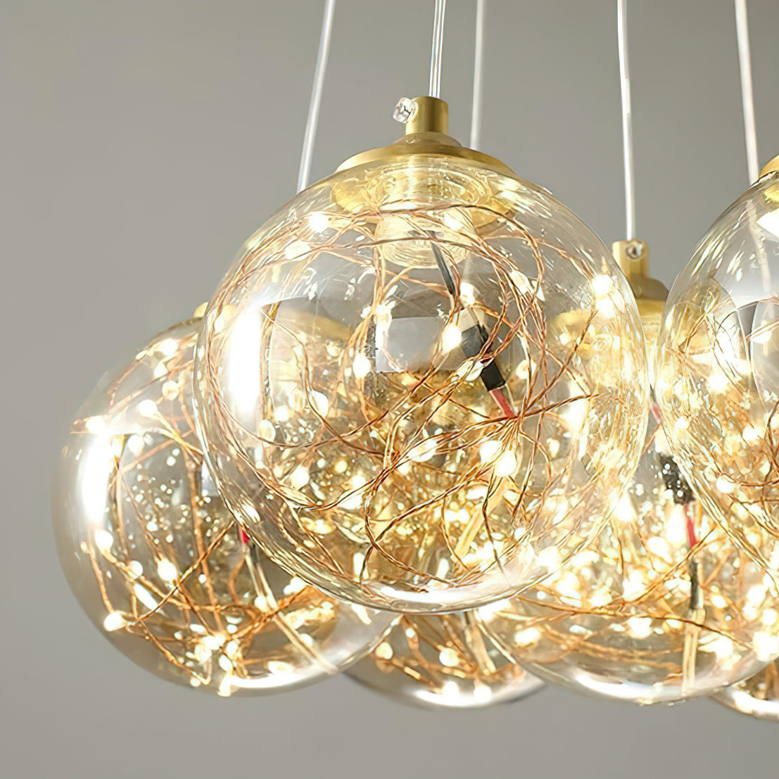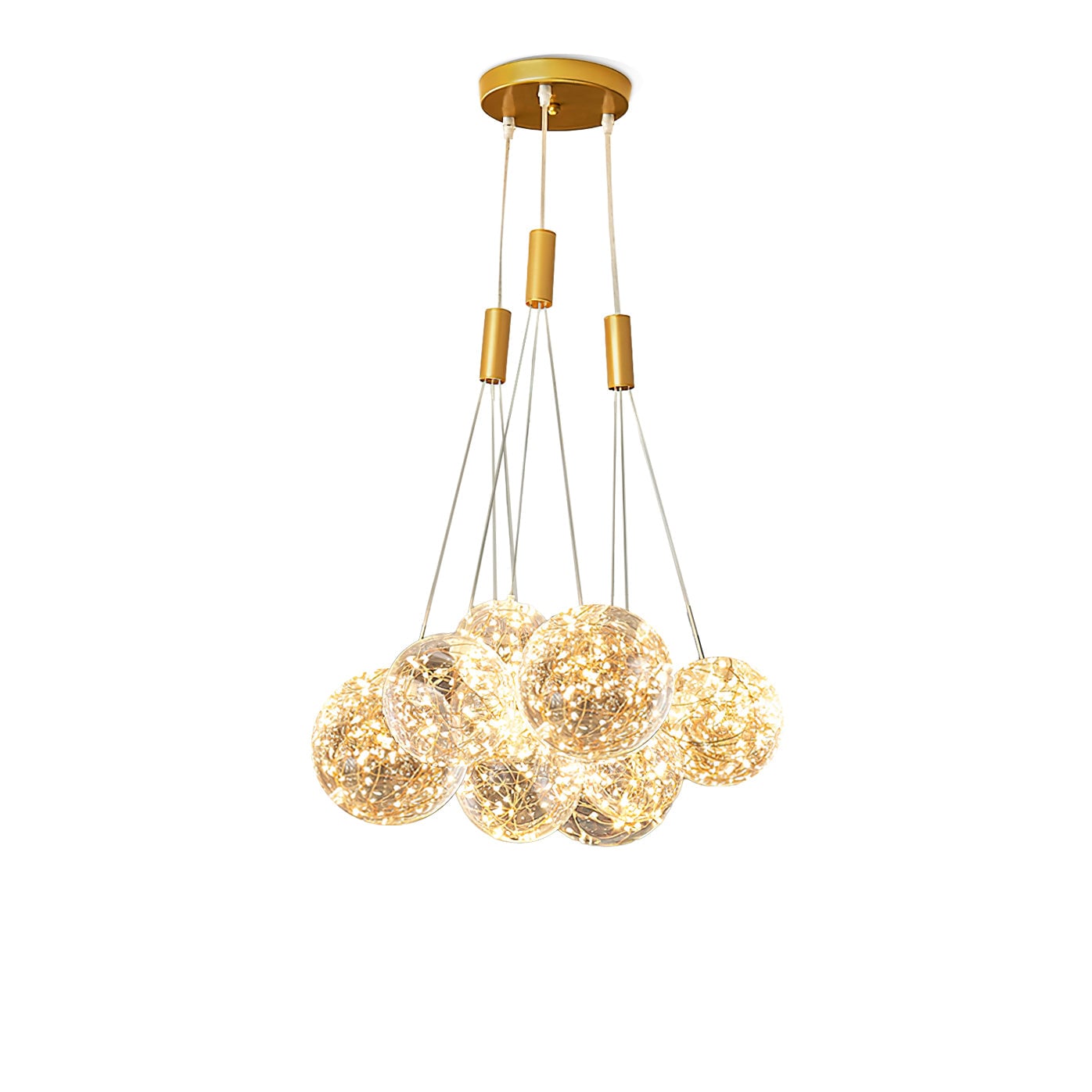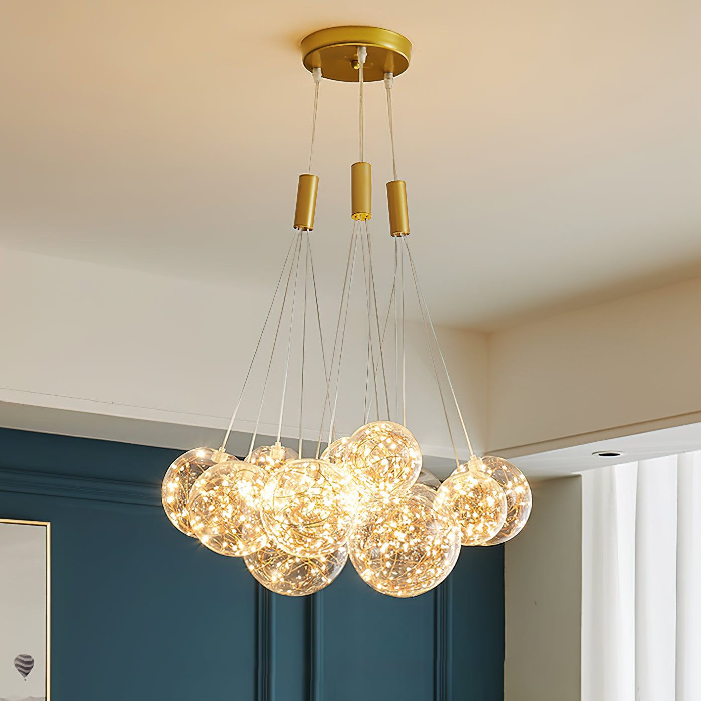 Add a touch of glamour to your living space with this exquisite Starry Sky Chandelier. Crafted from glass suspended and needle gloss ball chandeliers for an eye-catching three-dimensional effect, the chandelier is further accentuated by bubble gloss detailing for a shimmering, luxurious finish. Transform your home into a regal abode with this unique, stylish piece.