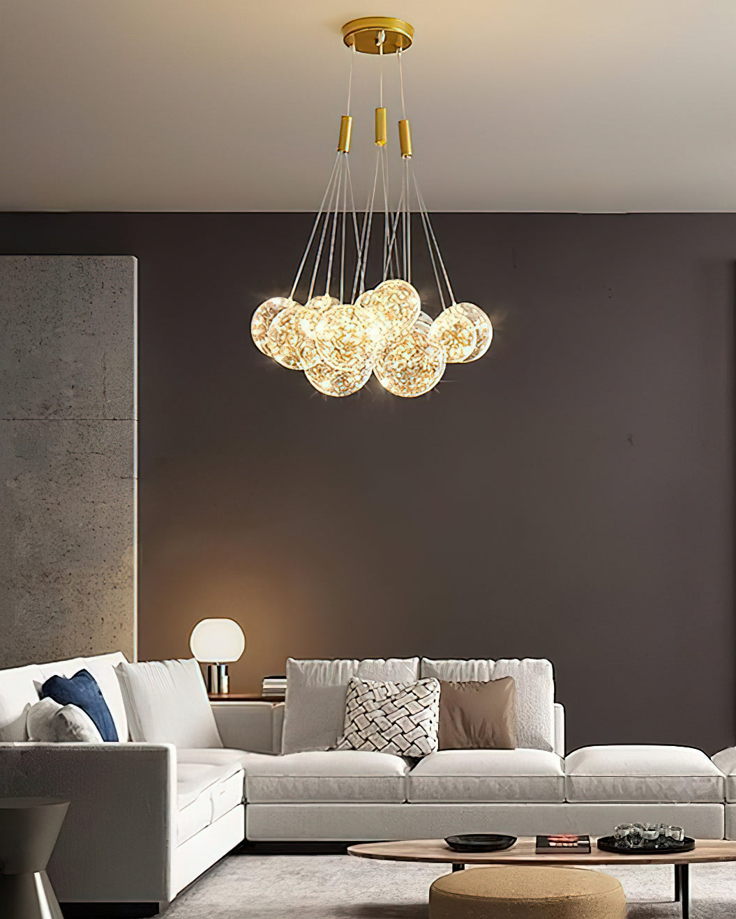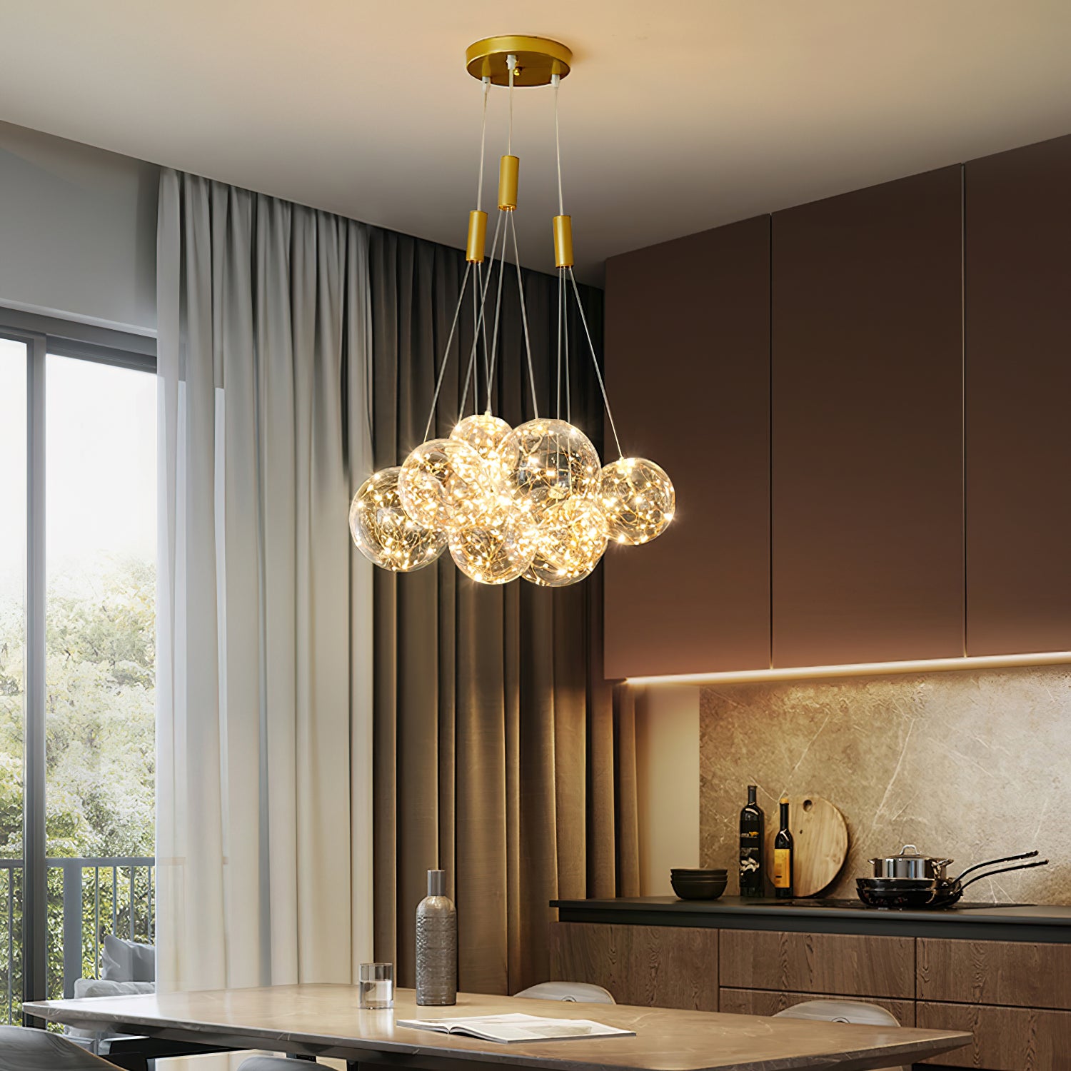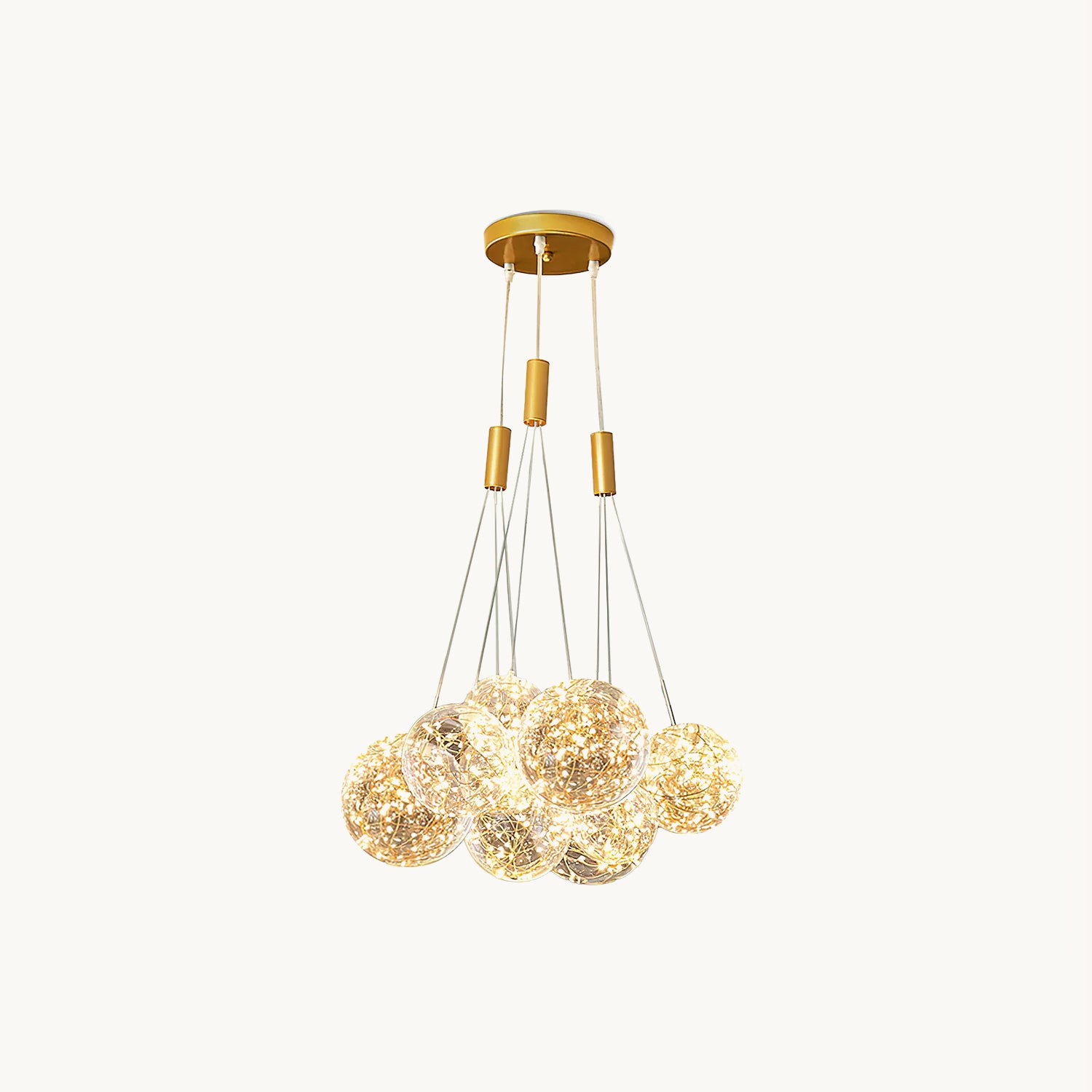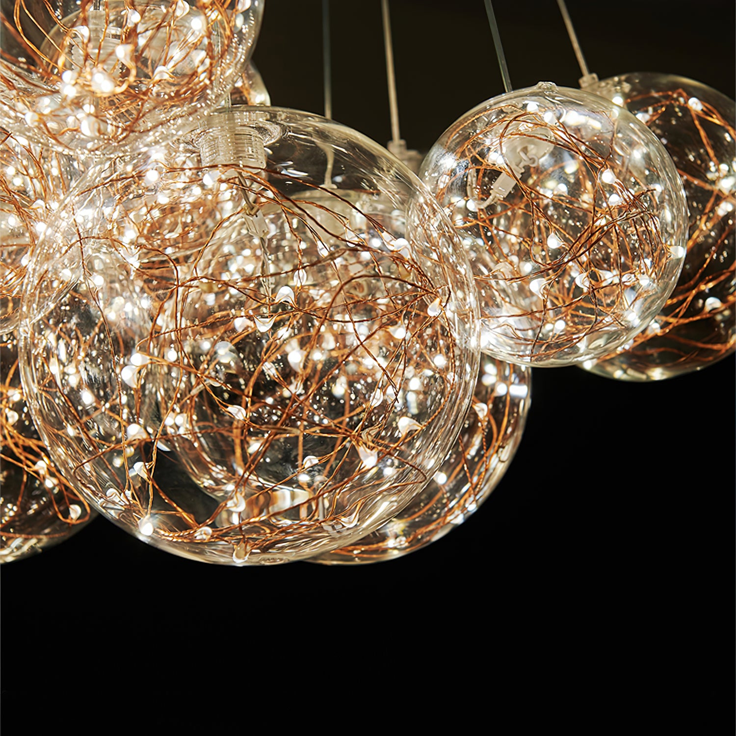 Add a touch of glamour to your living space with this exquisite Starry Sky Chandelier. Crafted from glass suspended and needle gloss ball chandeliers for an eye-catching three-dimensional effect, the chandelier is further accentuated by bubble gloss detailing for a shimmering, luxurious finish. Transform your home into a regal abode with this unique, stylish piece.