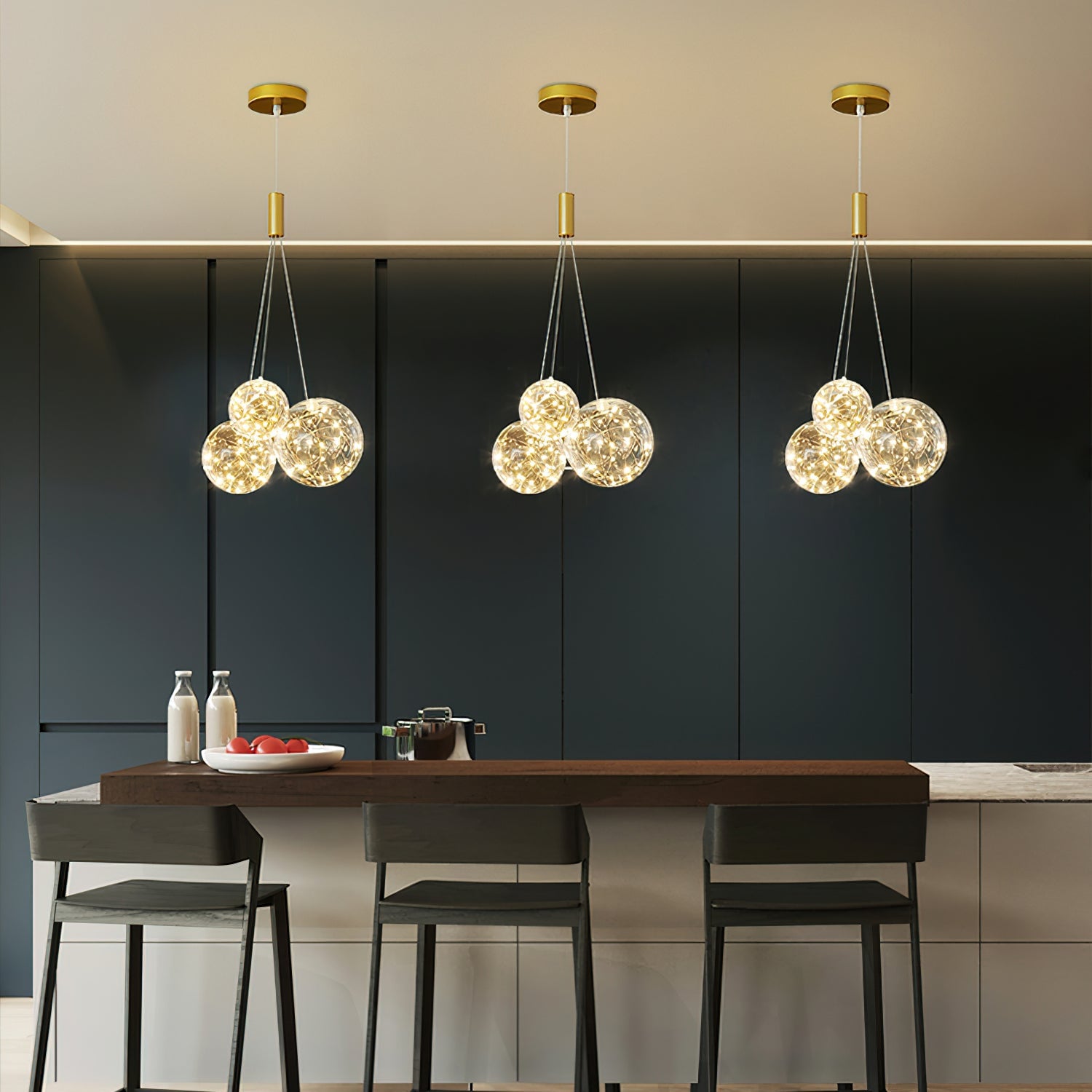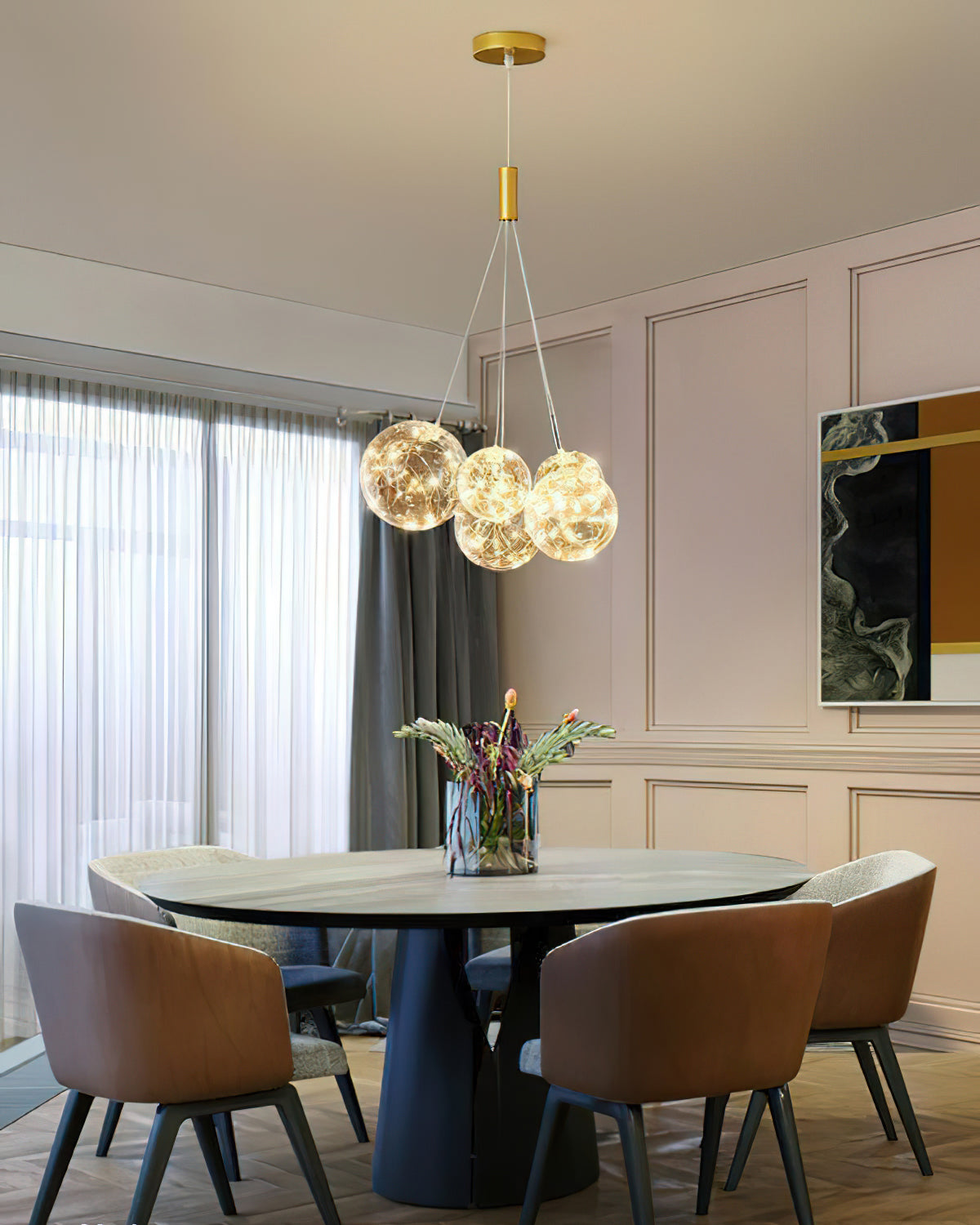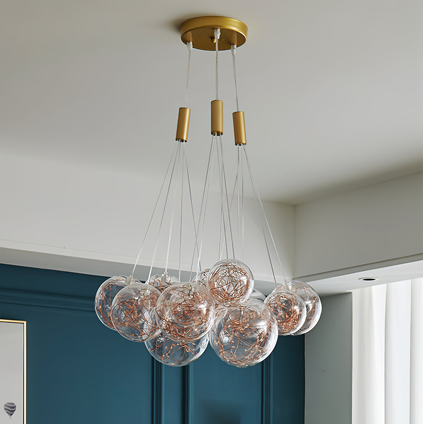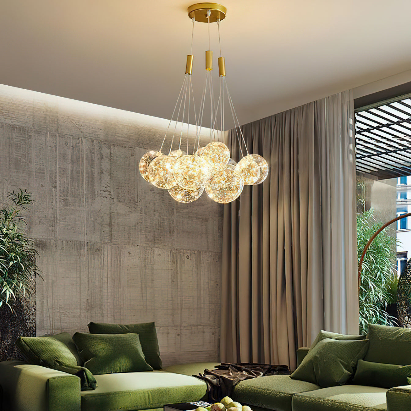 Add a touch of glamour to your living space with this exquisite Starry Sky Chandelier. Crafted from glass suspended and needle gloss ball chandeliers for an eye-catching three-dimensional effect, the chandelier is further accentuated by bubble gloss detailing for a shimmering, luxurious finish. Transform your home into a regal abode with this unique, stylish piece.