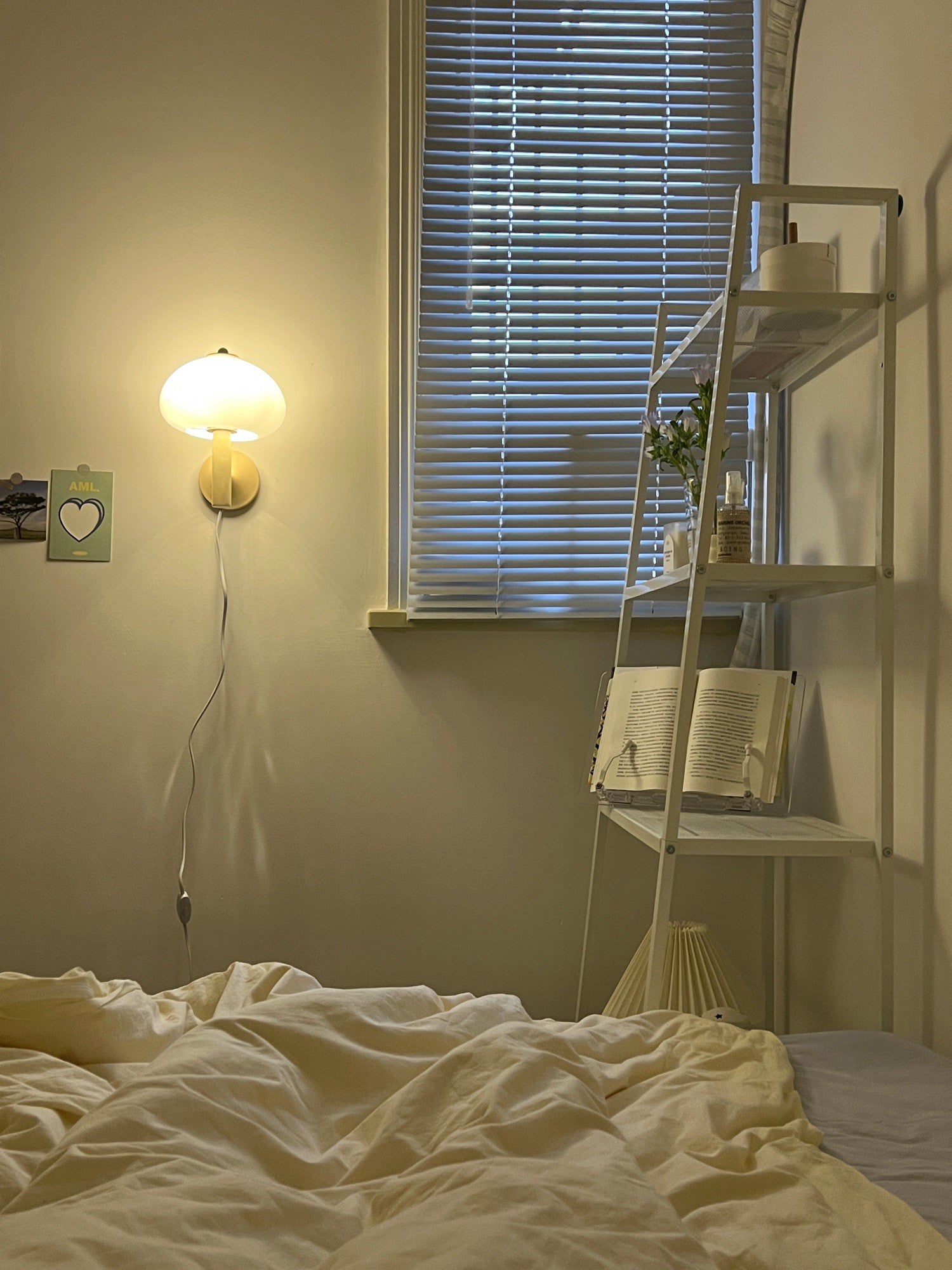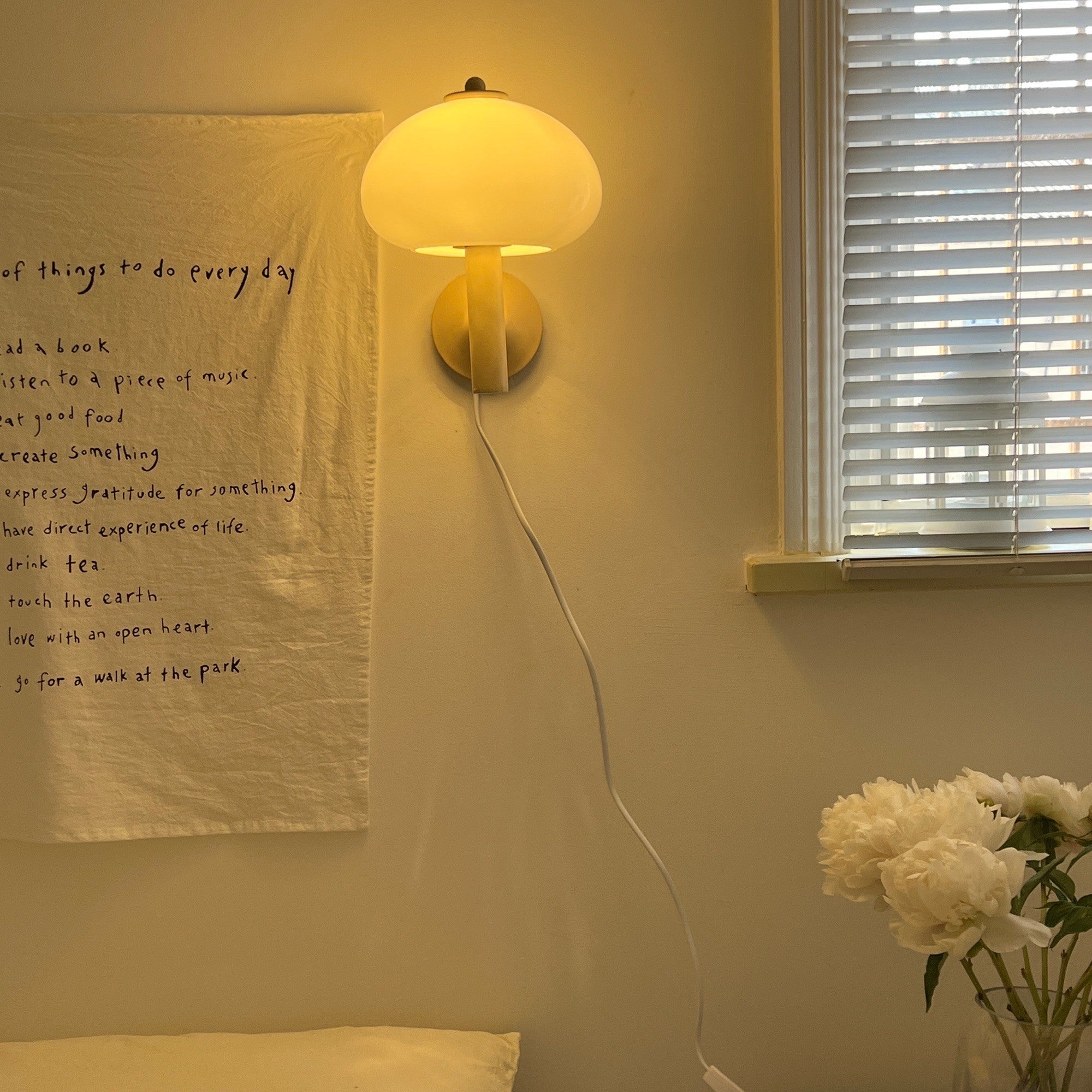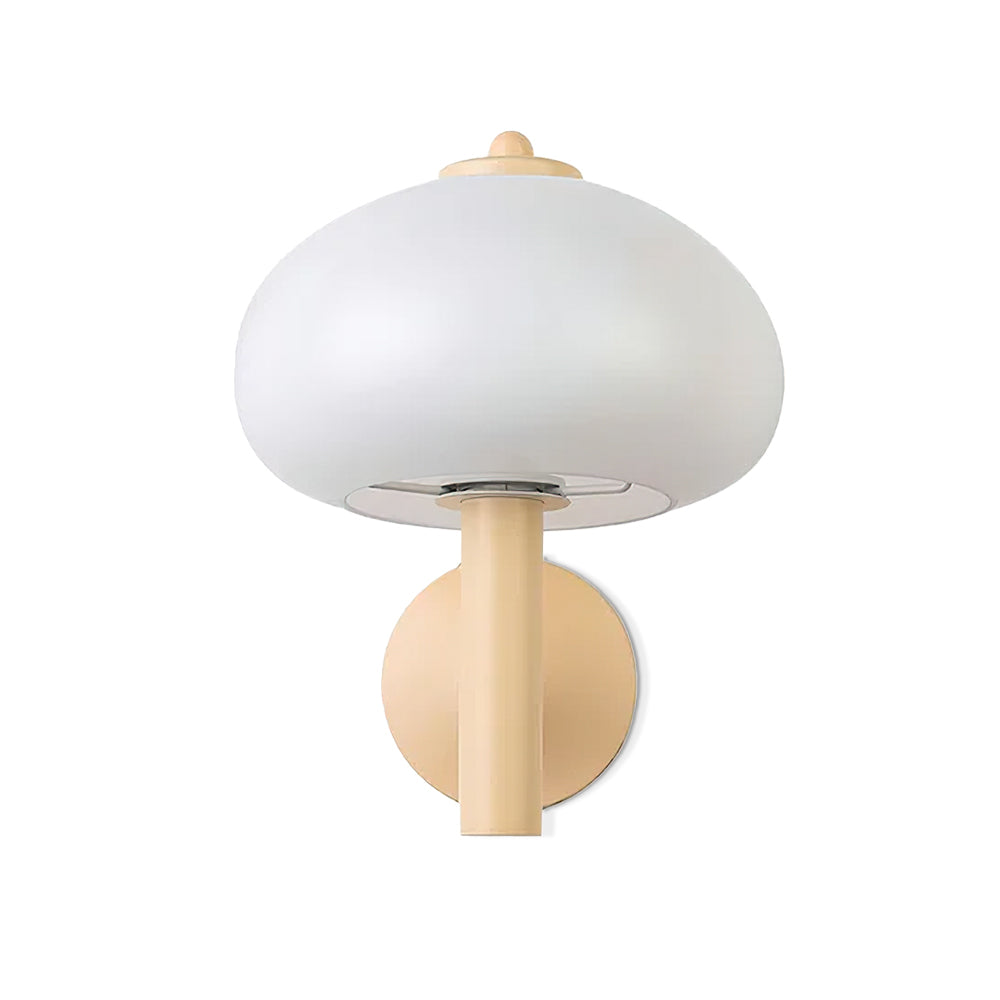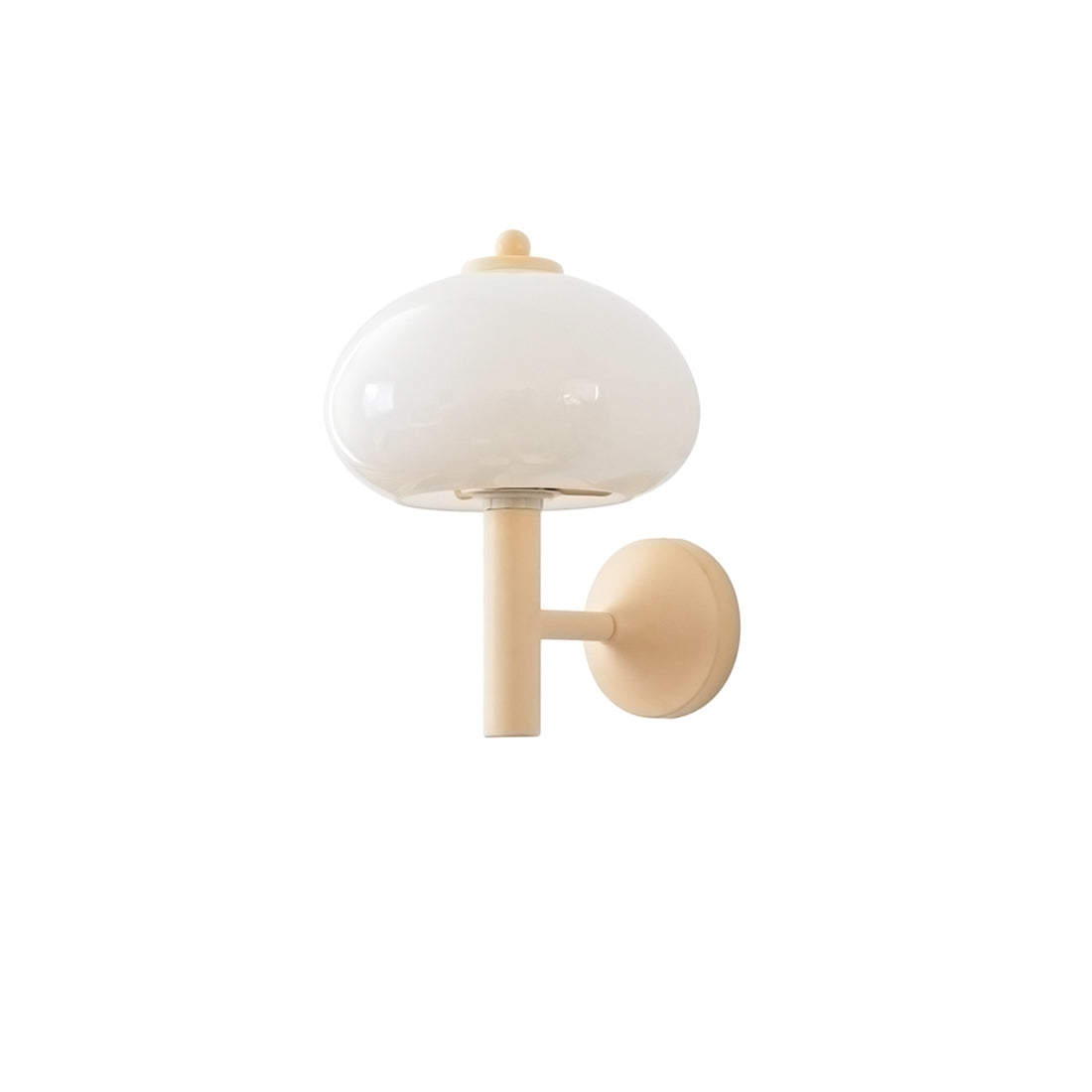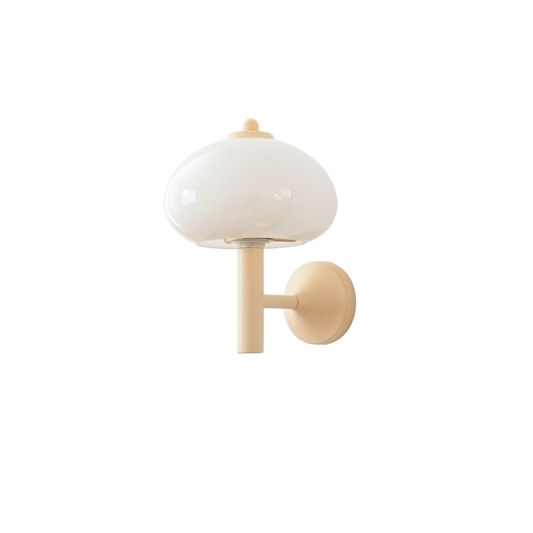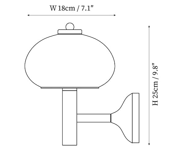2019 marks the relaunch of a timeless, beautiful classic. Playfully nicknamed the Mushroom is an elegant and full-of-history wall lamp. Beautiful light brown metal wall lamp with a curved neck and white glass shade.