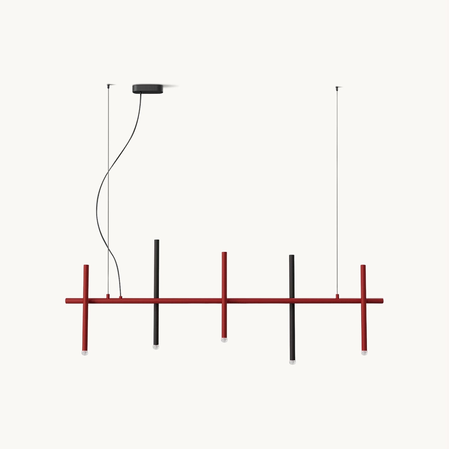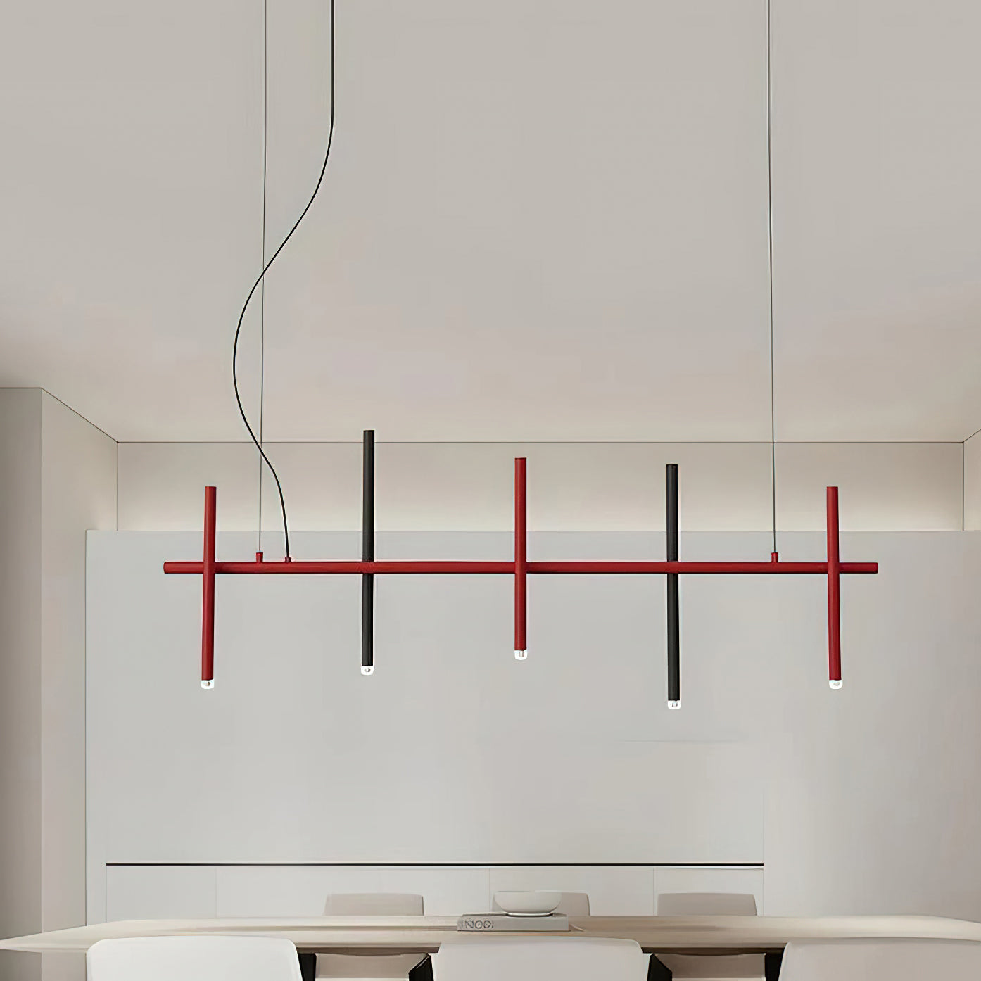 The Stelvio Pendant Lamp from Mooijane features a striking interplay of minimalist geometry and bold contrast. Crafted from durable metal with a matte red and black finish, its vertical and horizontal lines form a sculptural silhouette reminiscent of a modern art installation. An embedded acrylic diffuser at the base of the vertical rod provides soft, glare-free illumination. Ideal for dining areas, workspaces, or contemporary interiors, Stelvio blends functional lighting with architectural elegance.