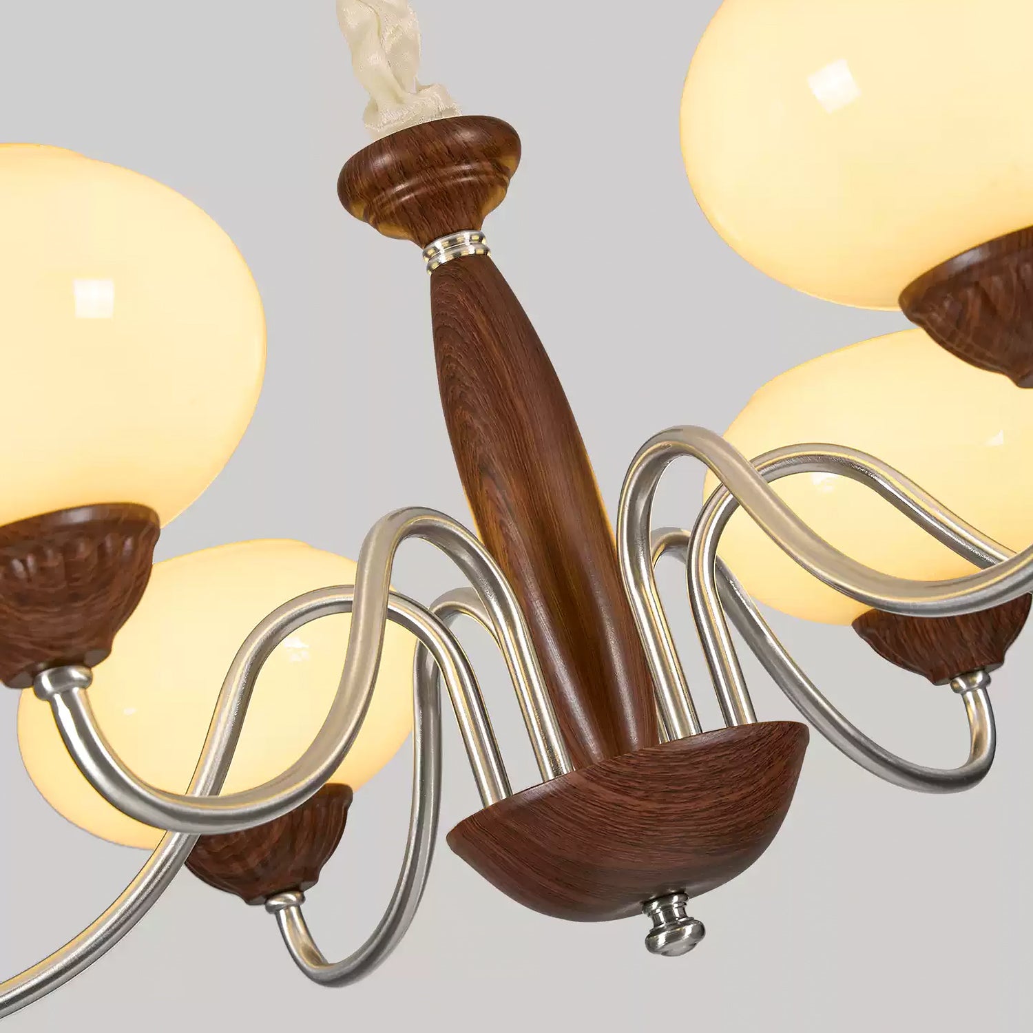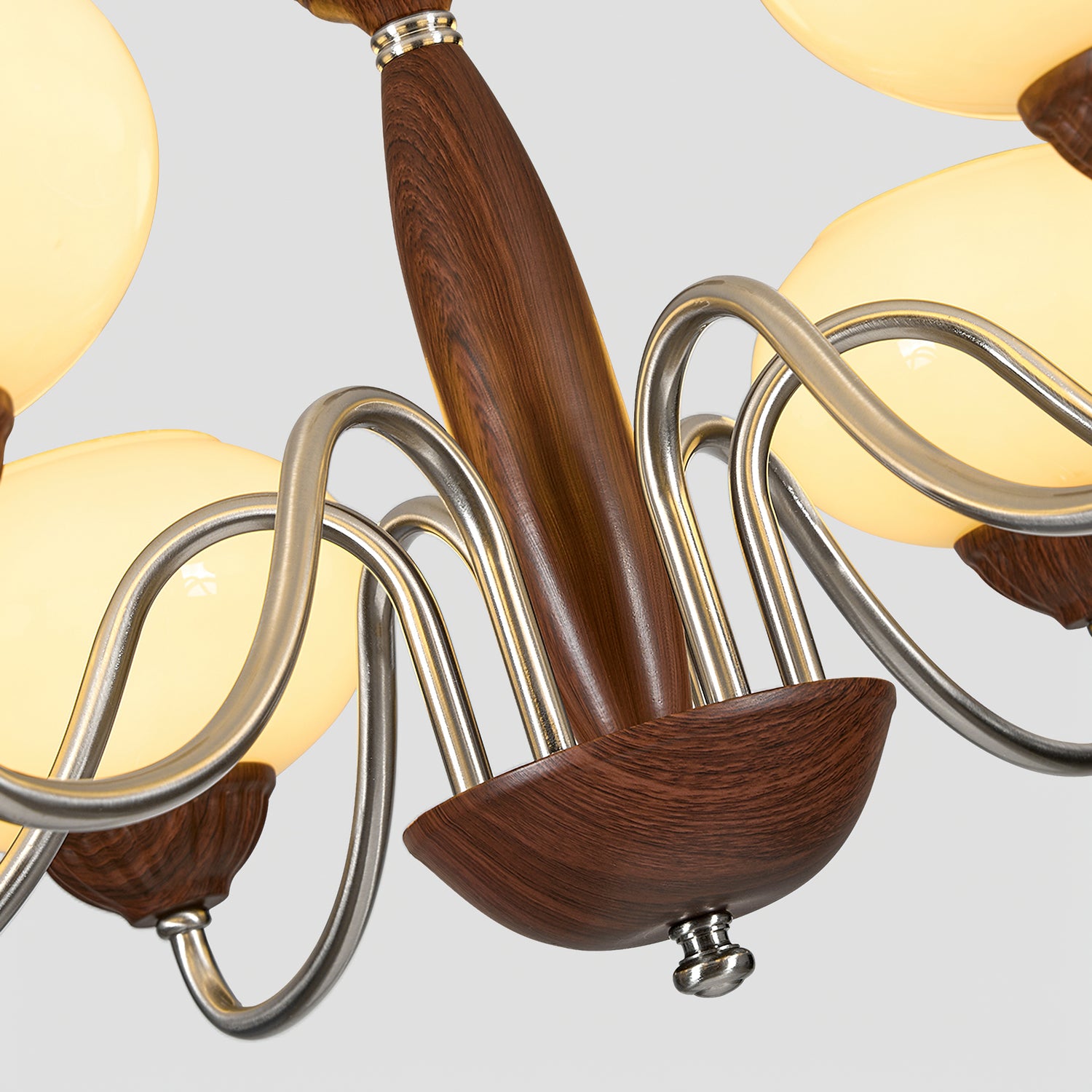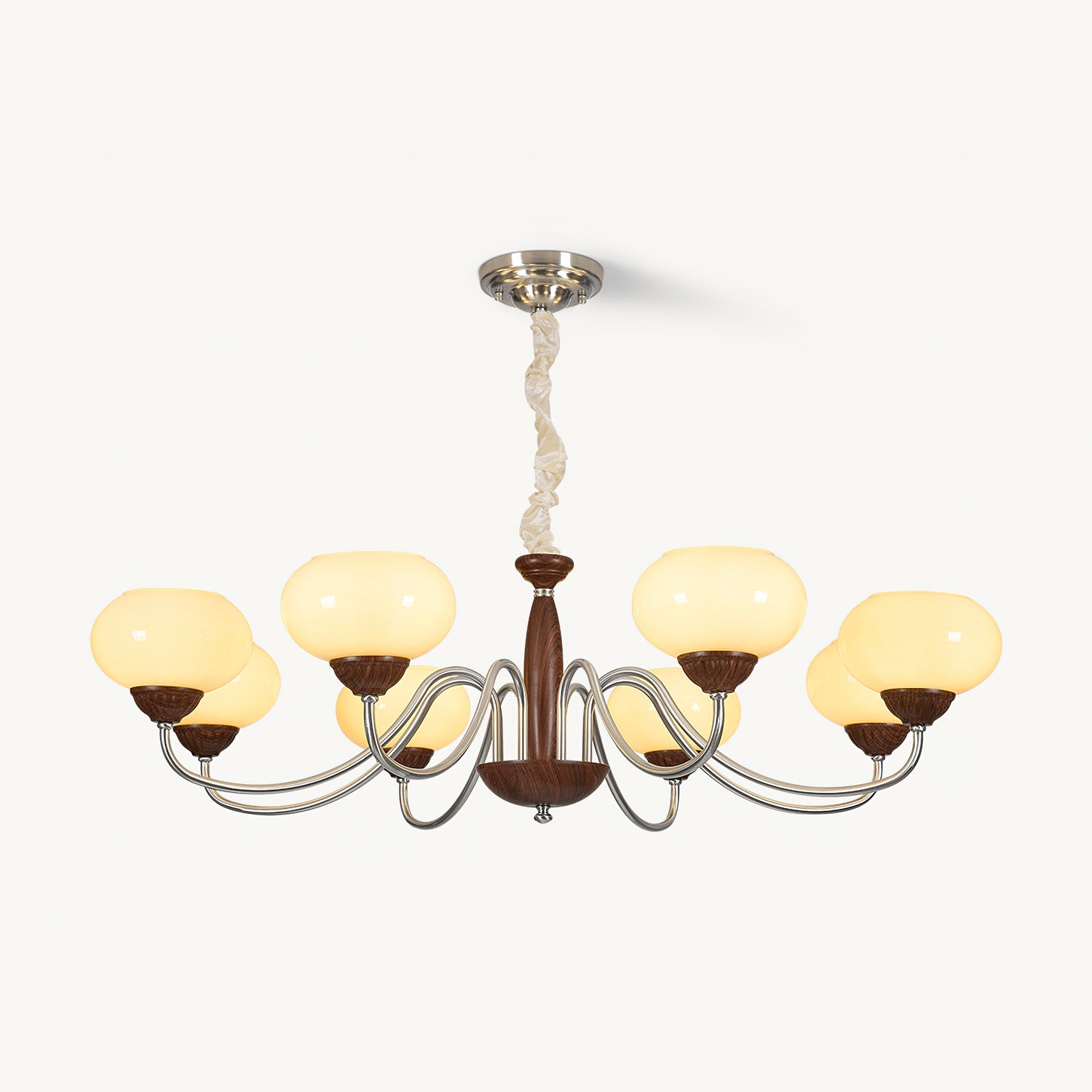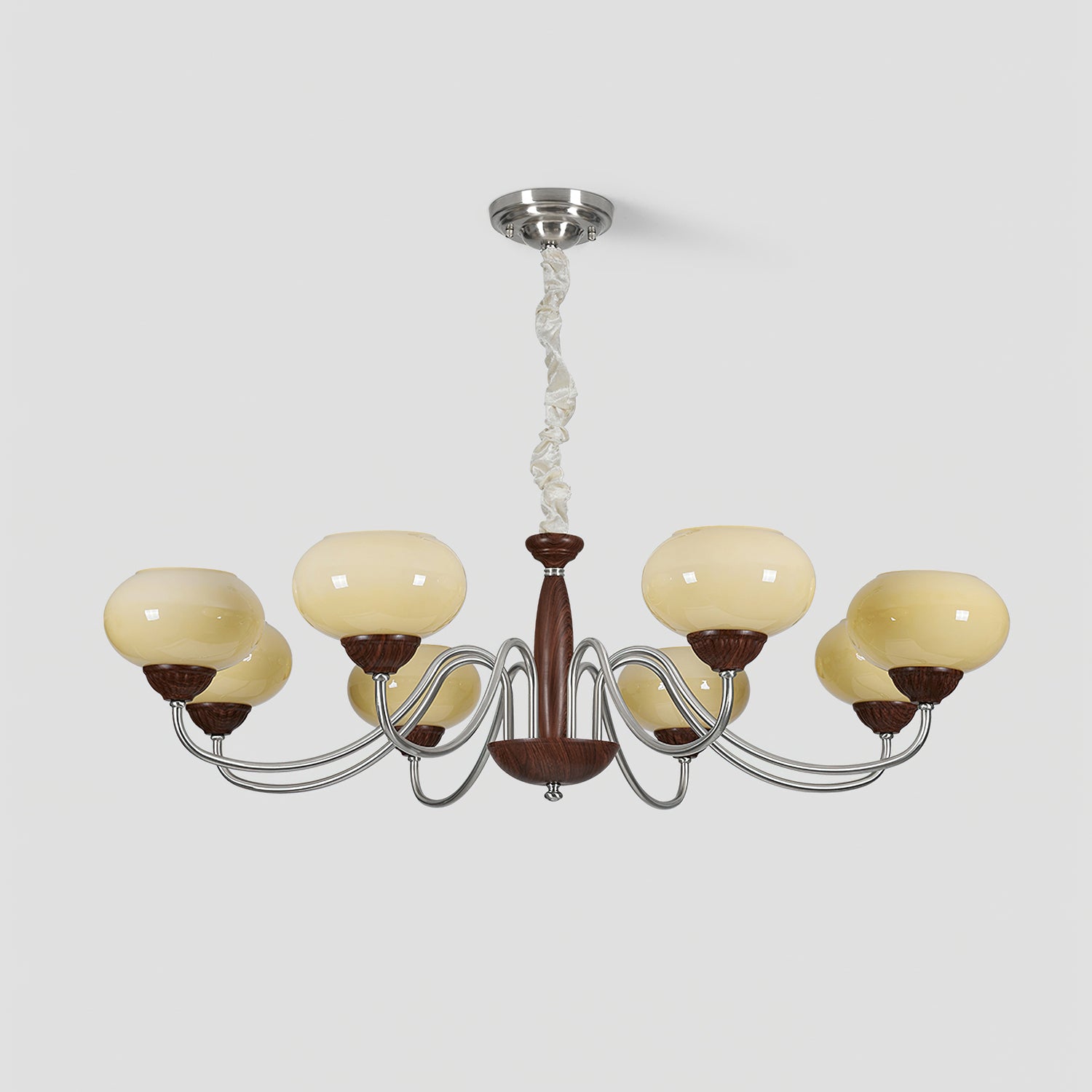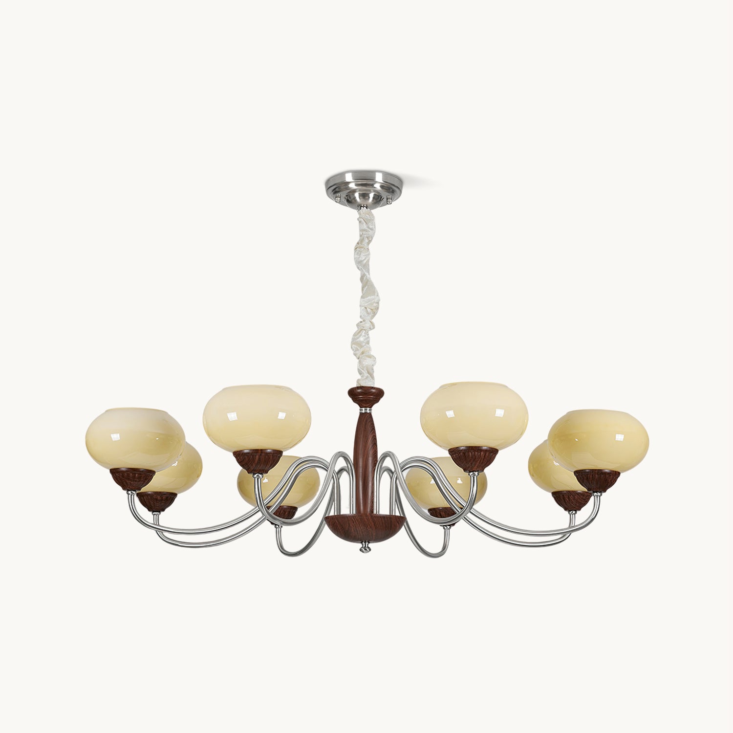 The Stetler Chandelier from Mooijane blends iron, glass, and subtle wood-grain details for a timeless design. Gracefully curved arms and blossom-inspired glass shades cast a warm, inviting glow, making it an elegant centerpiece for dining rooms, living areas, or bedrooms. Functional and decorative, it brings refined charm to any space.