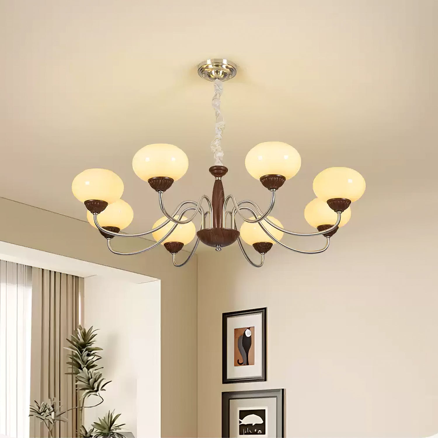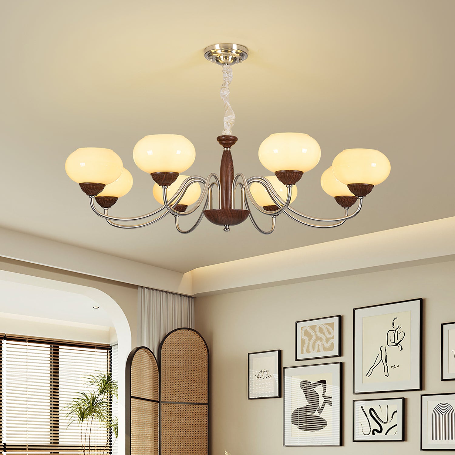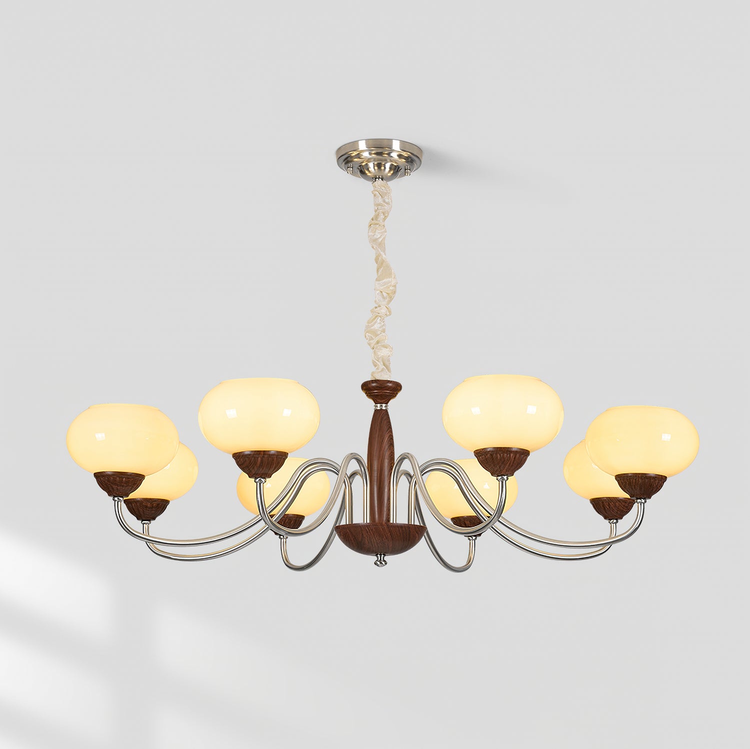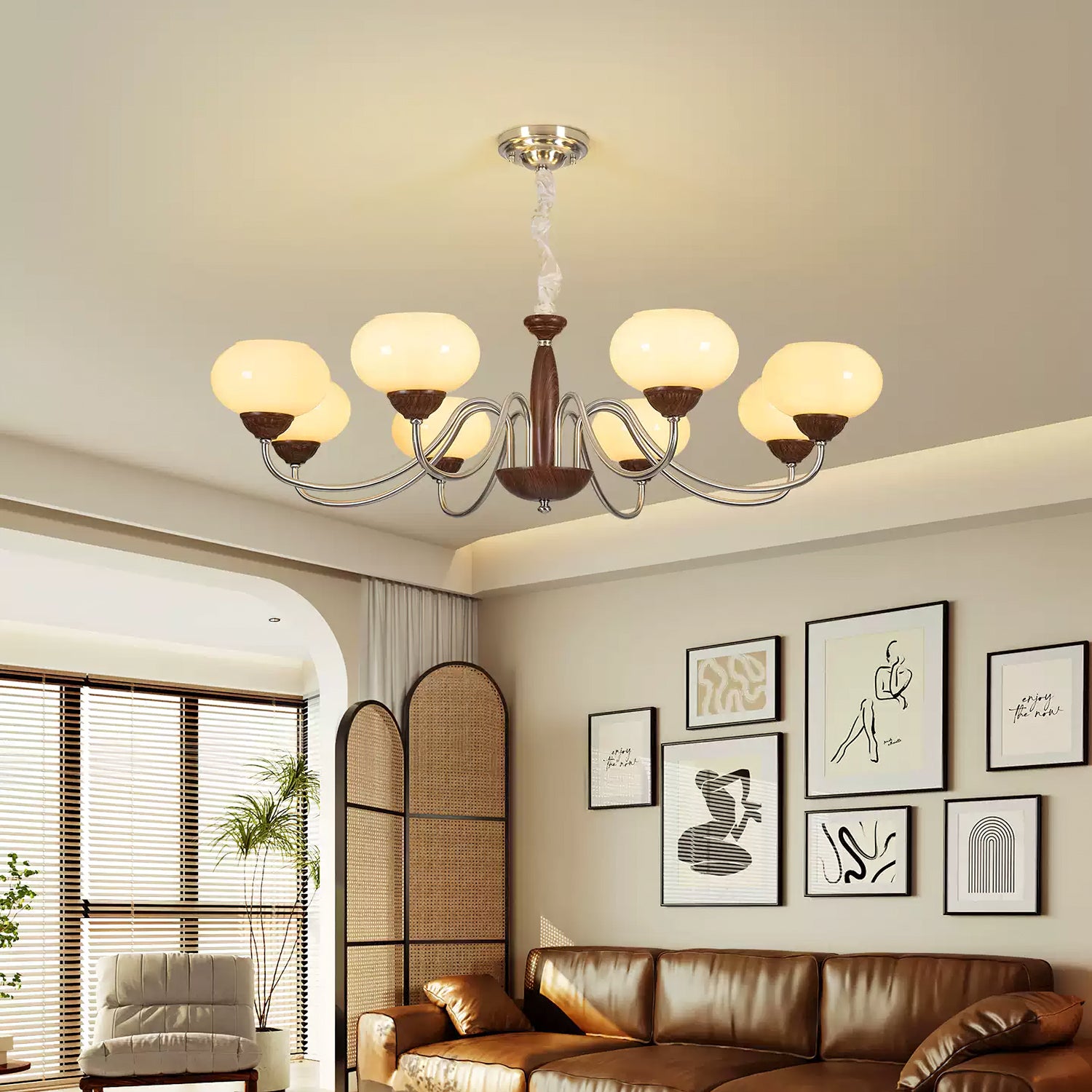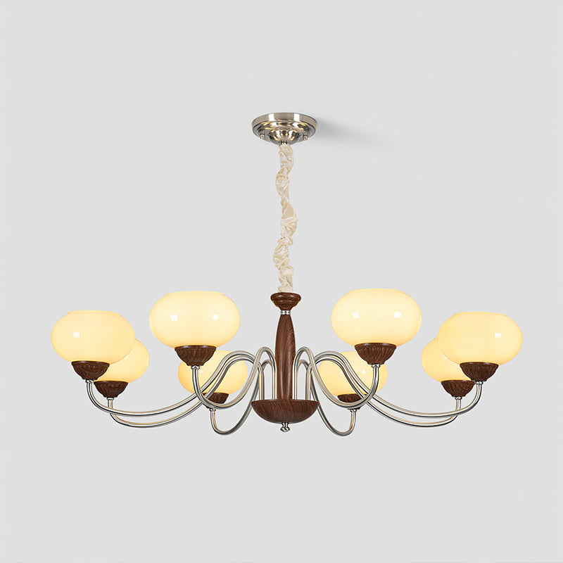 The Stetler Chandelier from Mooijane blends iron, glass, and subtle wood-grain details for a timeless design. Gracefully curved arms and blossom-inspired glass shades cast a warm, inviting glow, making it an elegant centerpiece for dining rooms, living areas, or bedrooms. Functional and decorative, it brings refined charm to any space.