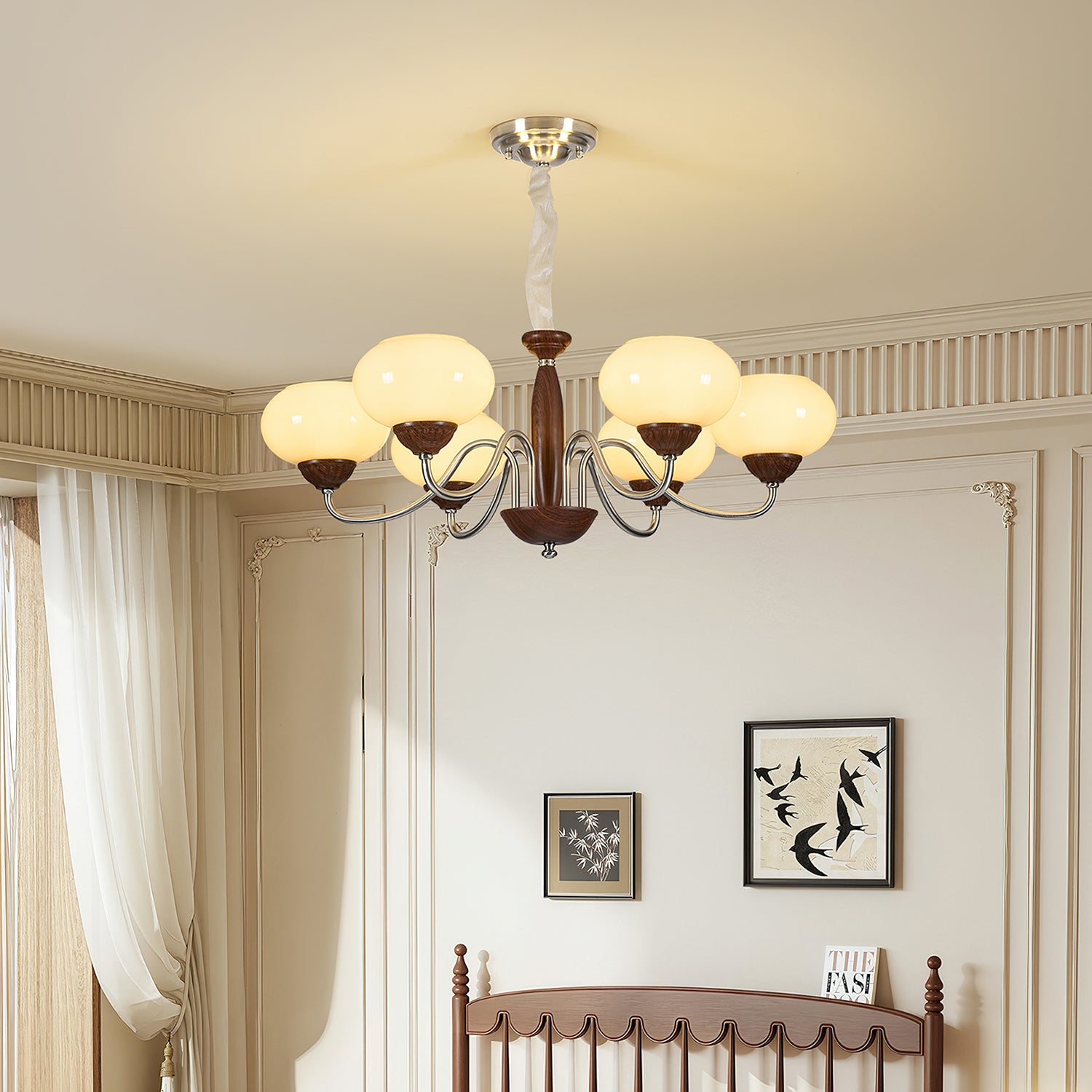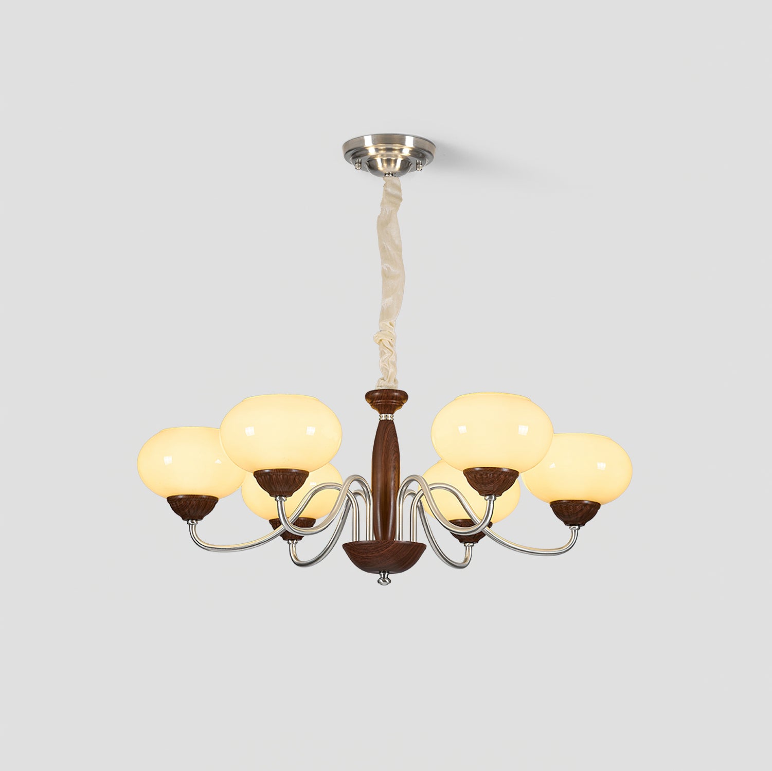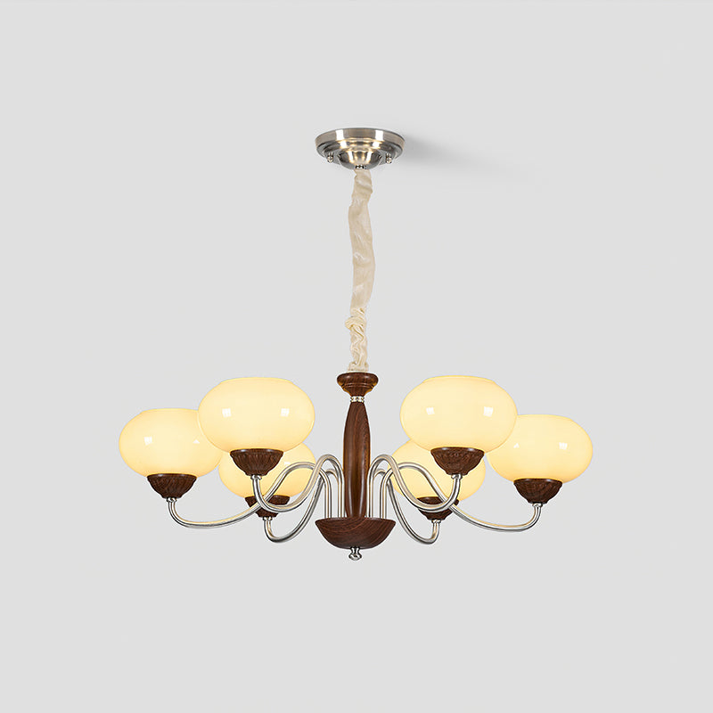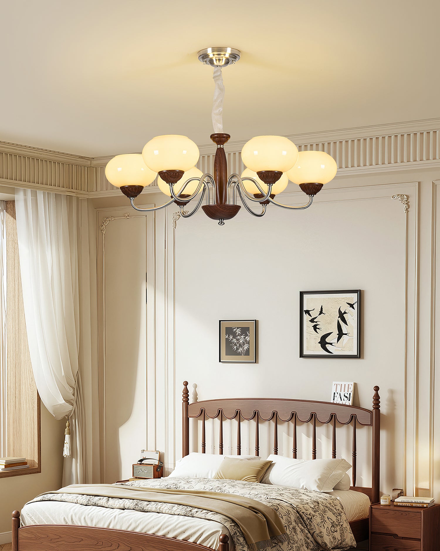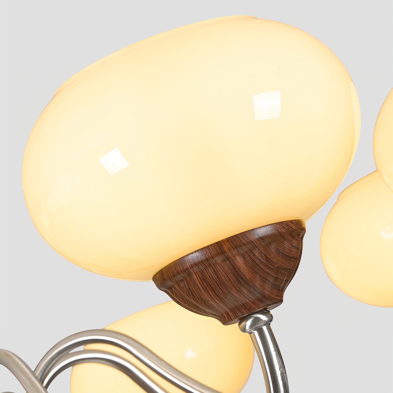 The Stetler Chandelier from Mooijane blends iron, glass, and subtle wood-grain details for a timeless design. Gracefully curved arms and blossom-inspired glass shades cast a warm, inviting glow, making it an elegant centerpiece for dining rooms, living areas, or bedrooms. Functional and decorative, it brings refined charm to any space.