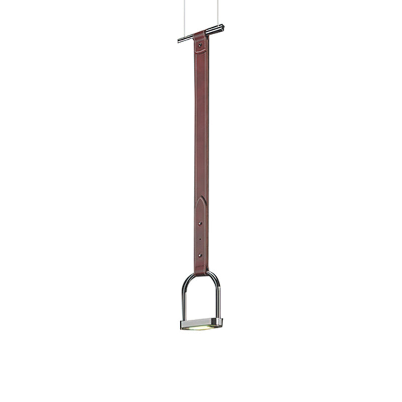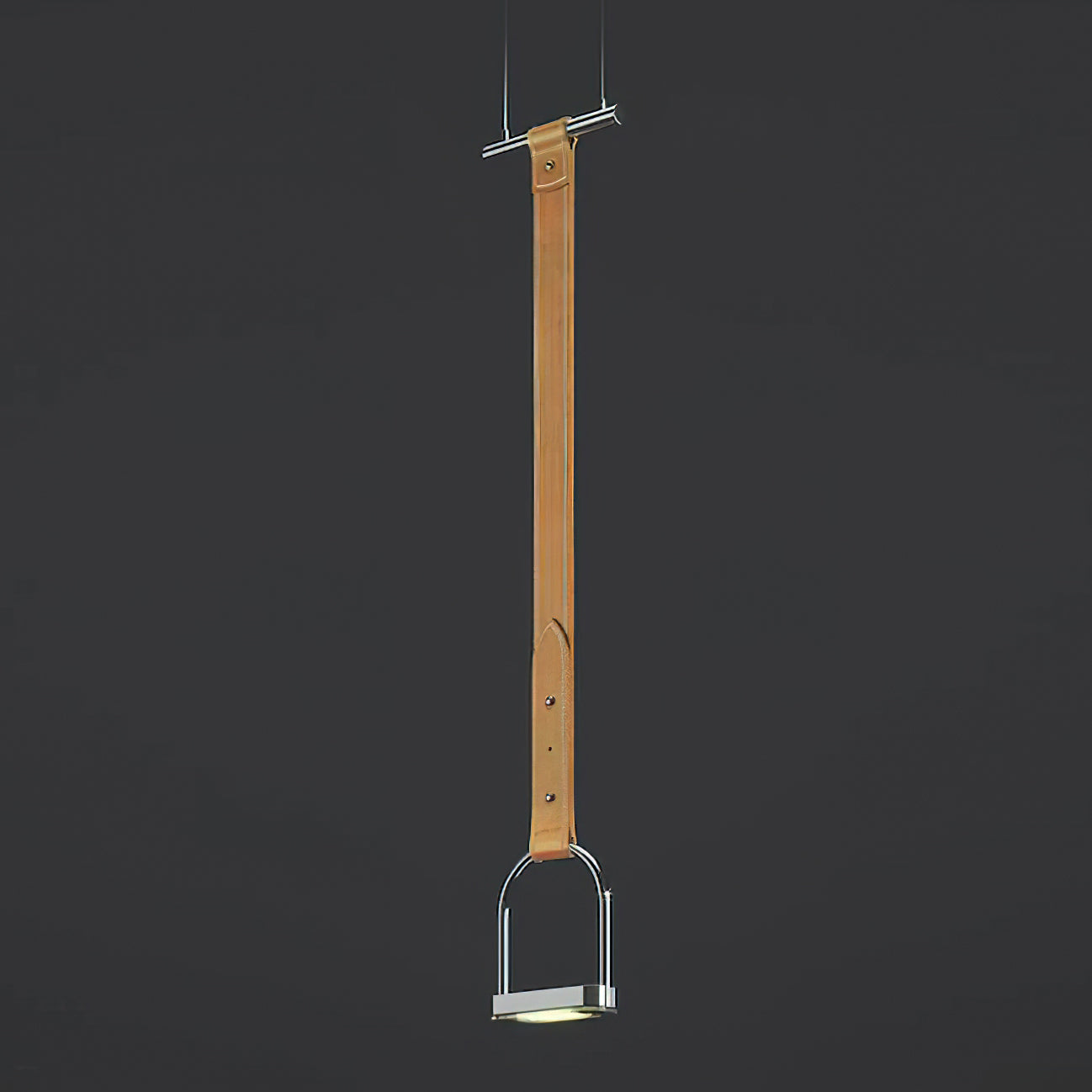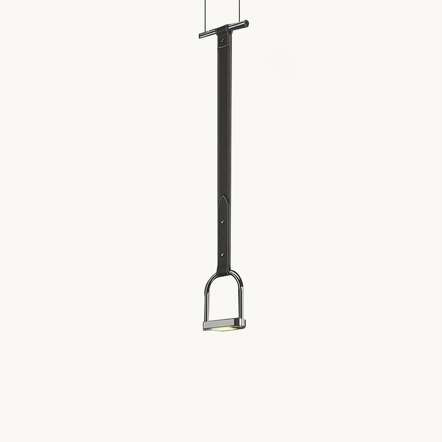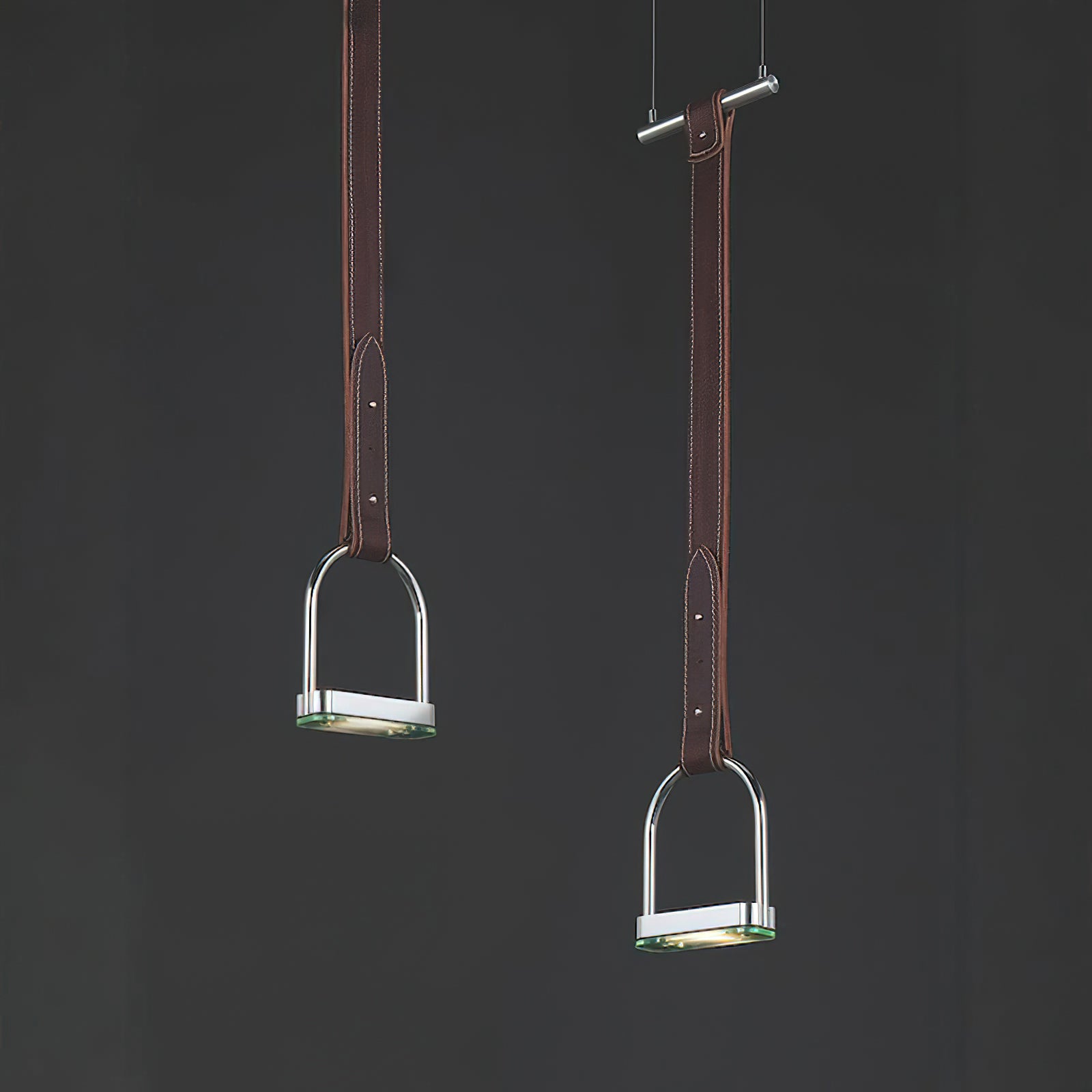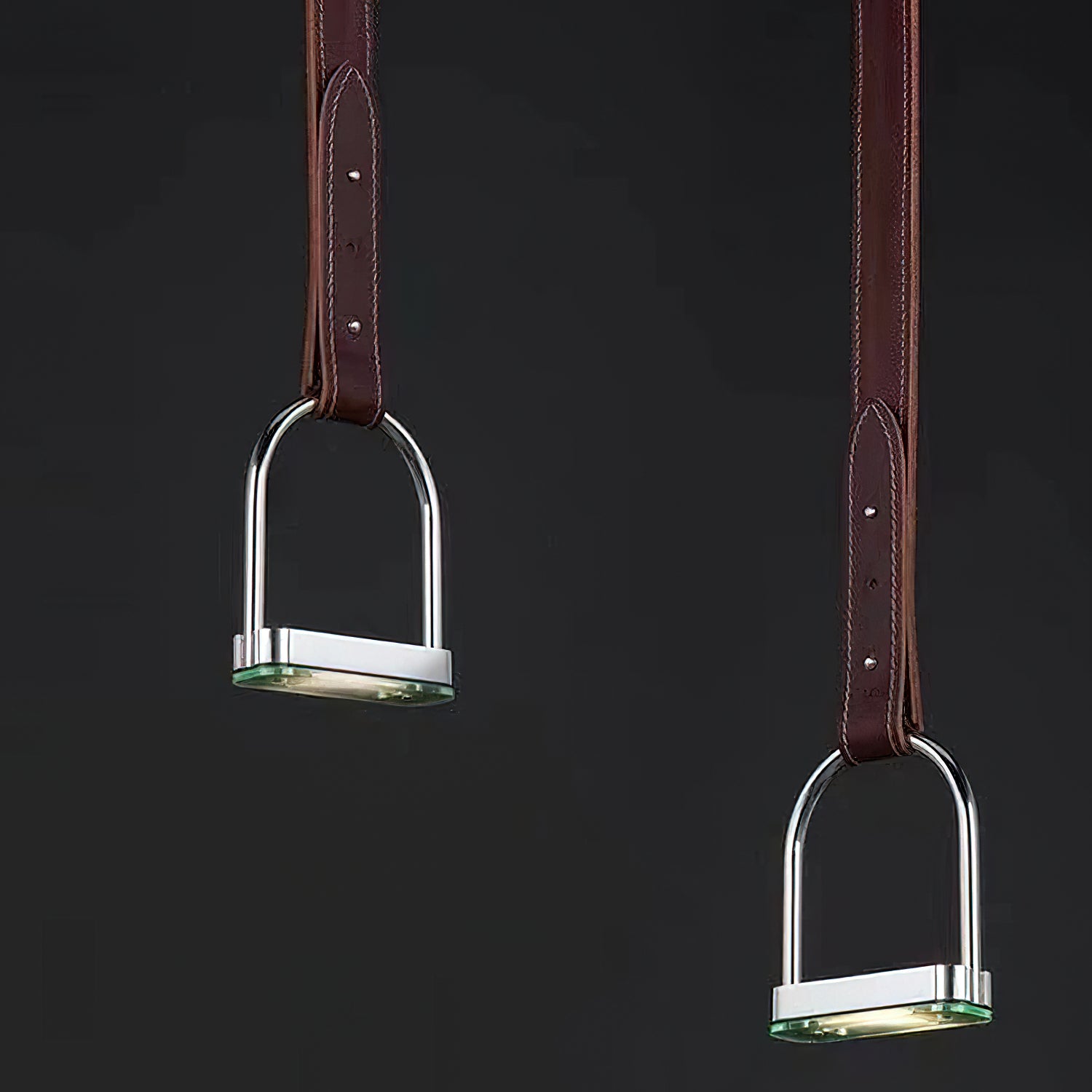 Introducing the Stirrup Pendant Lamp, a stunning chandelier inspired by the design of horseback riding stirrups. Made with premium leather and metal, this chandelier features integrated LED lights and its abstract stirrup design adds a touch of modern farmhouse style to any space.