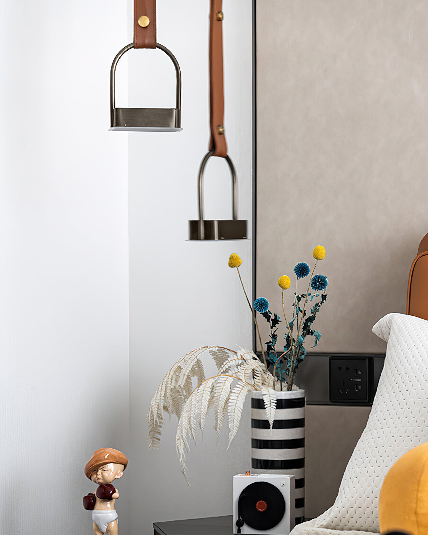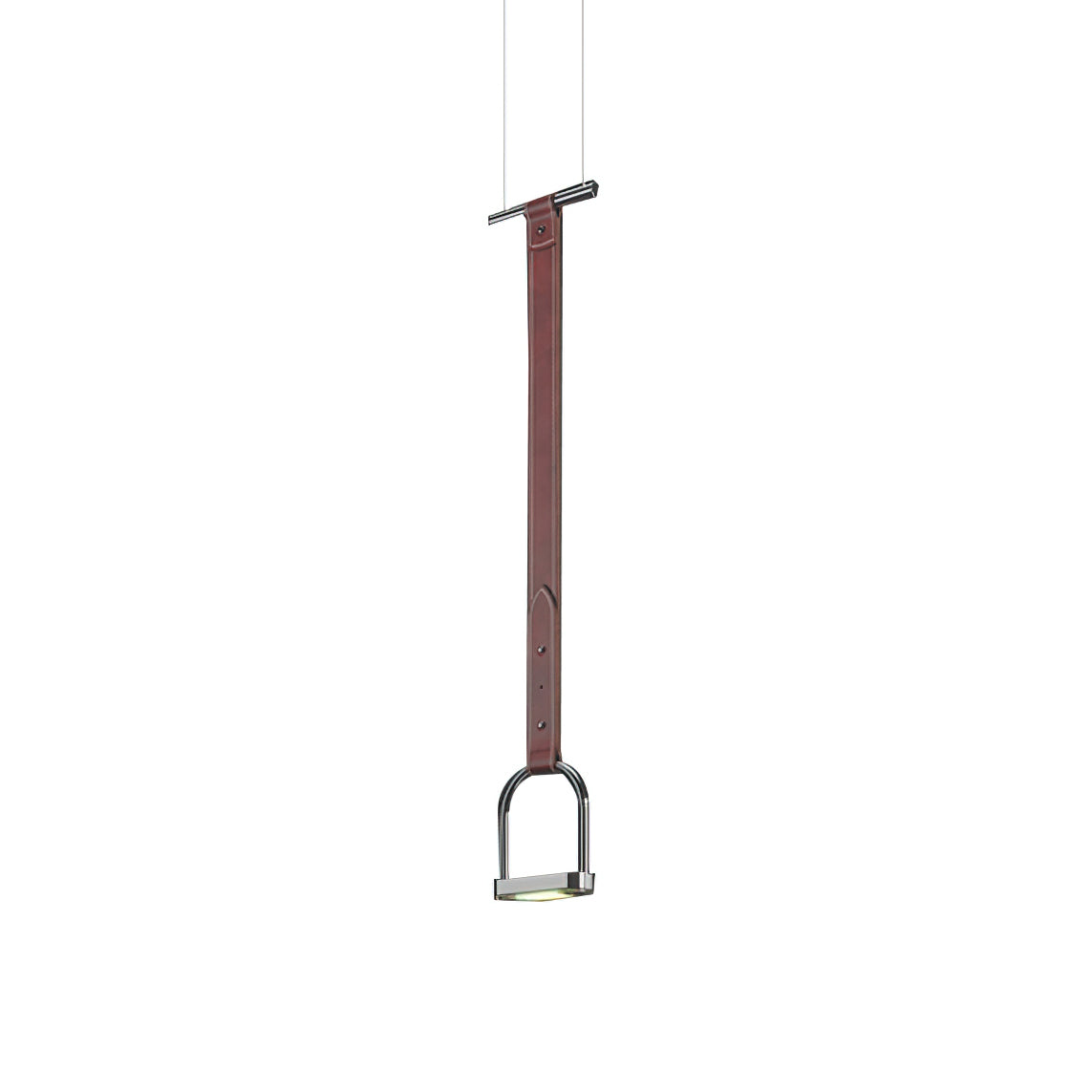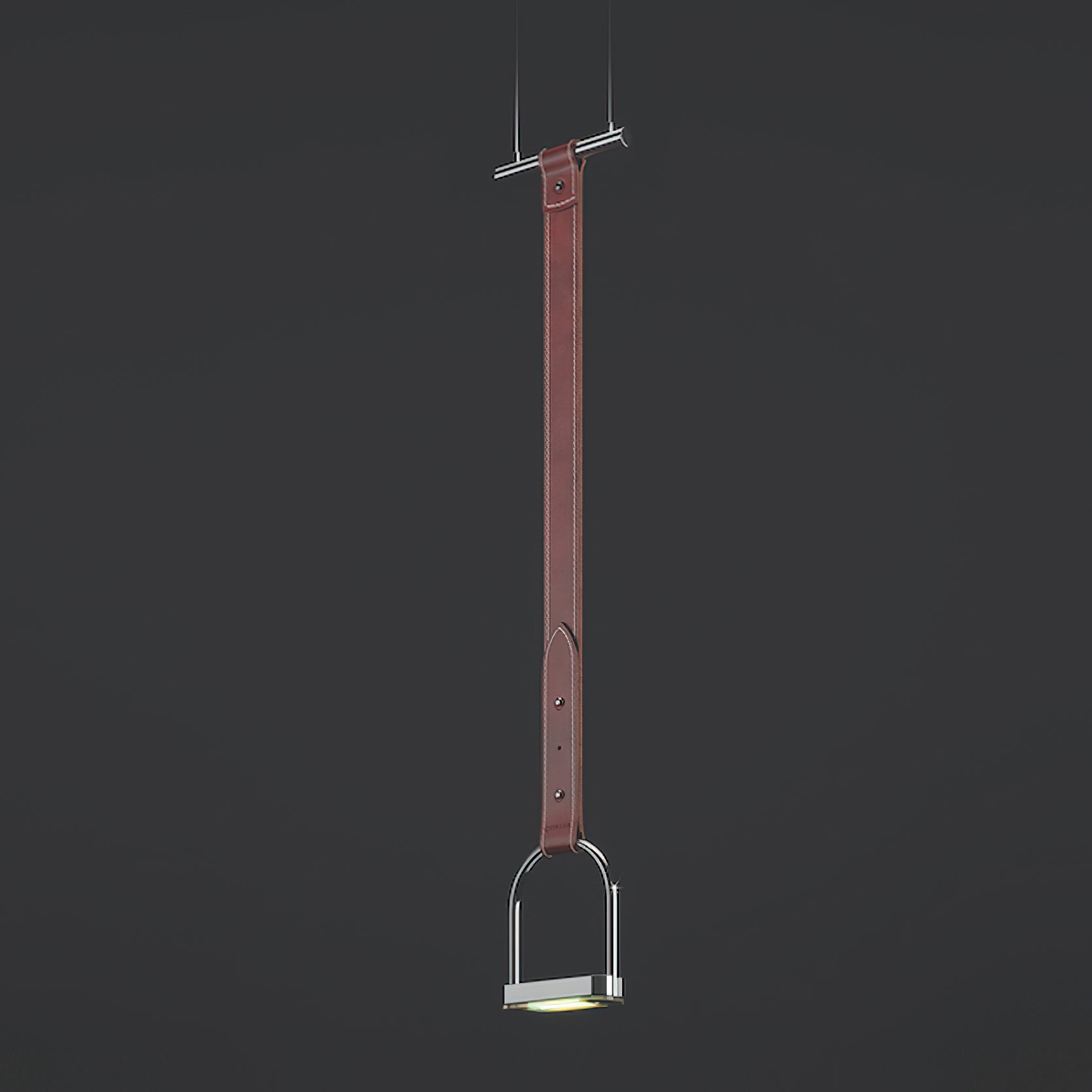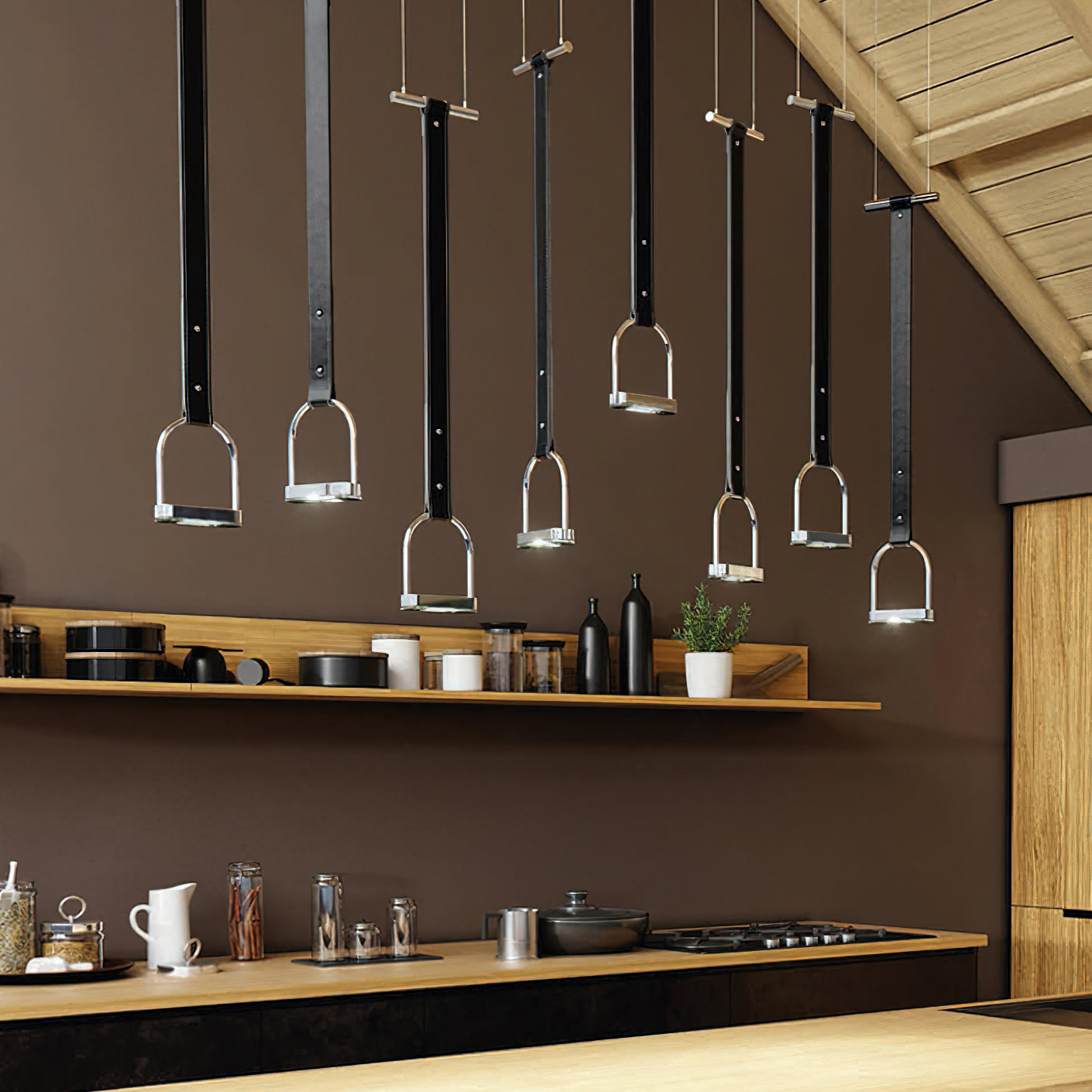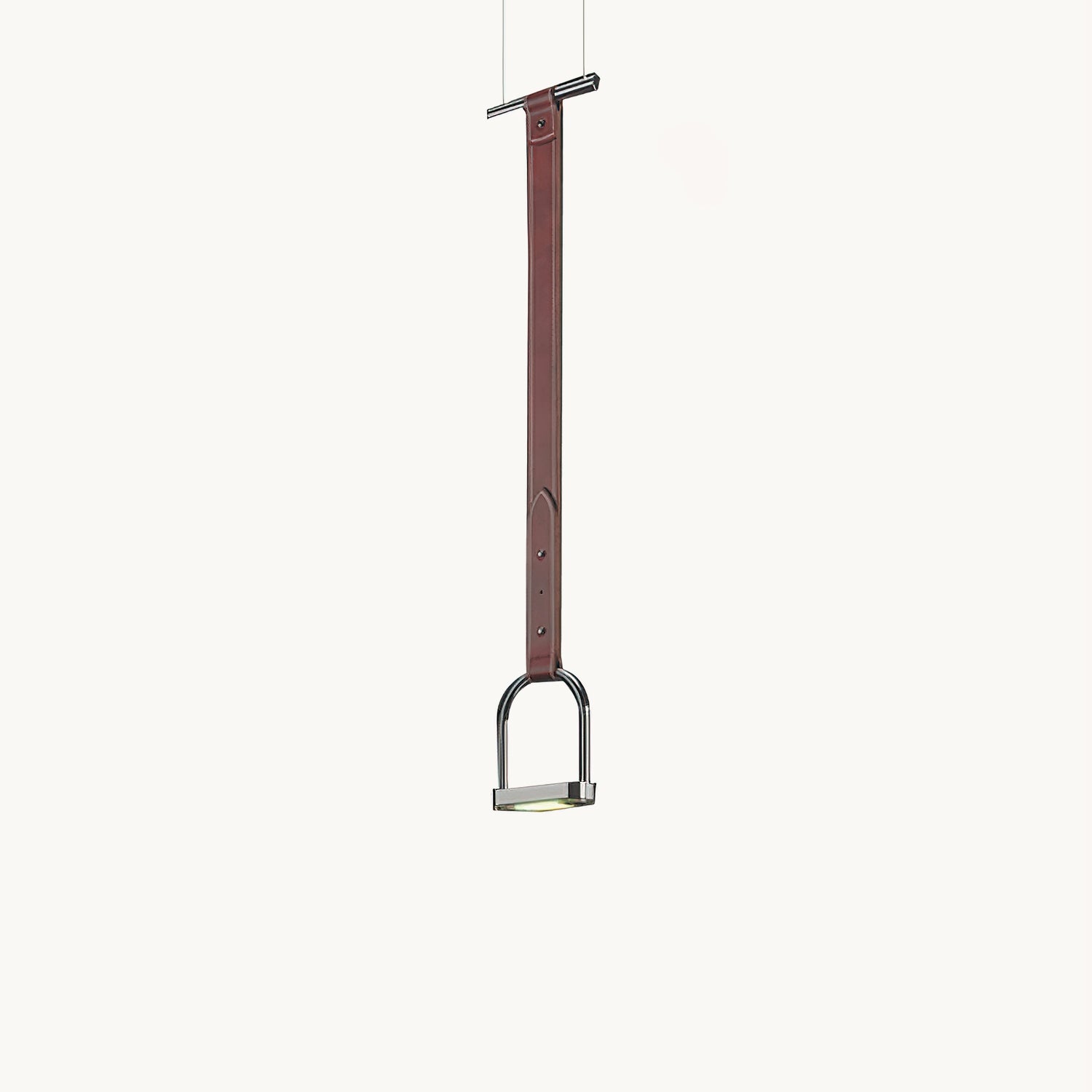 Introducing the Stirrup Pendant Lamp, a stunning chandelier inspired by the design of horseback riding stirrups. Made with premium leather and metal, this chandelier features integrated LED lights and its abstract stirrup design adds a touch of modern farmhouse style to any space.
