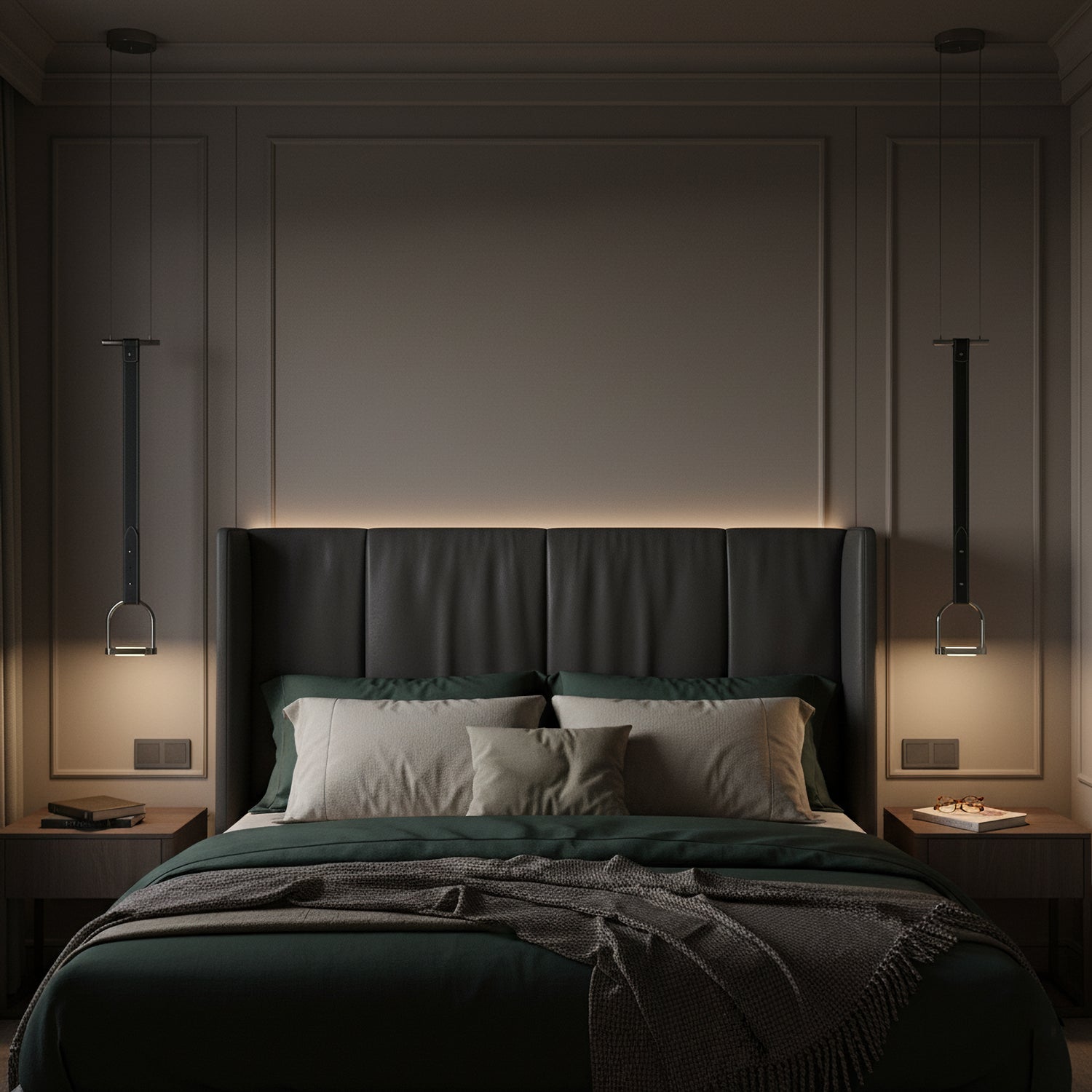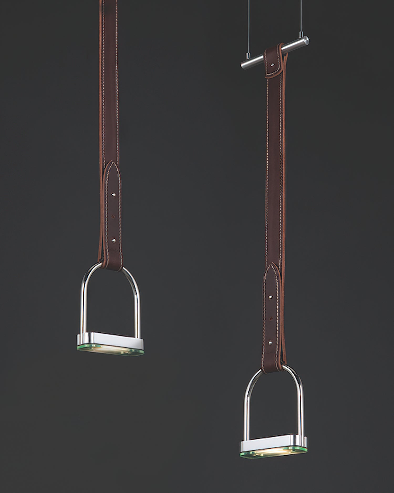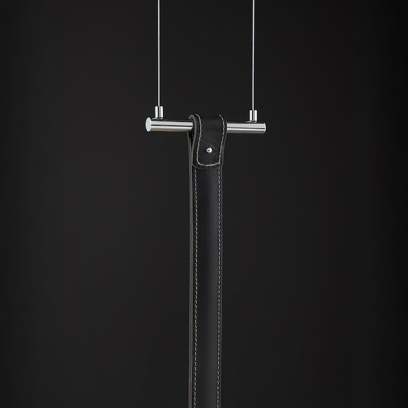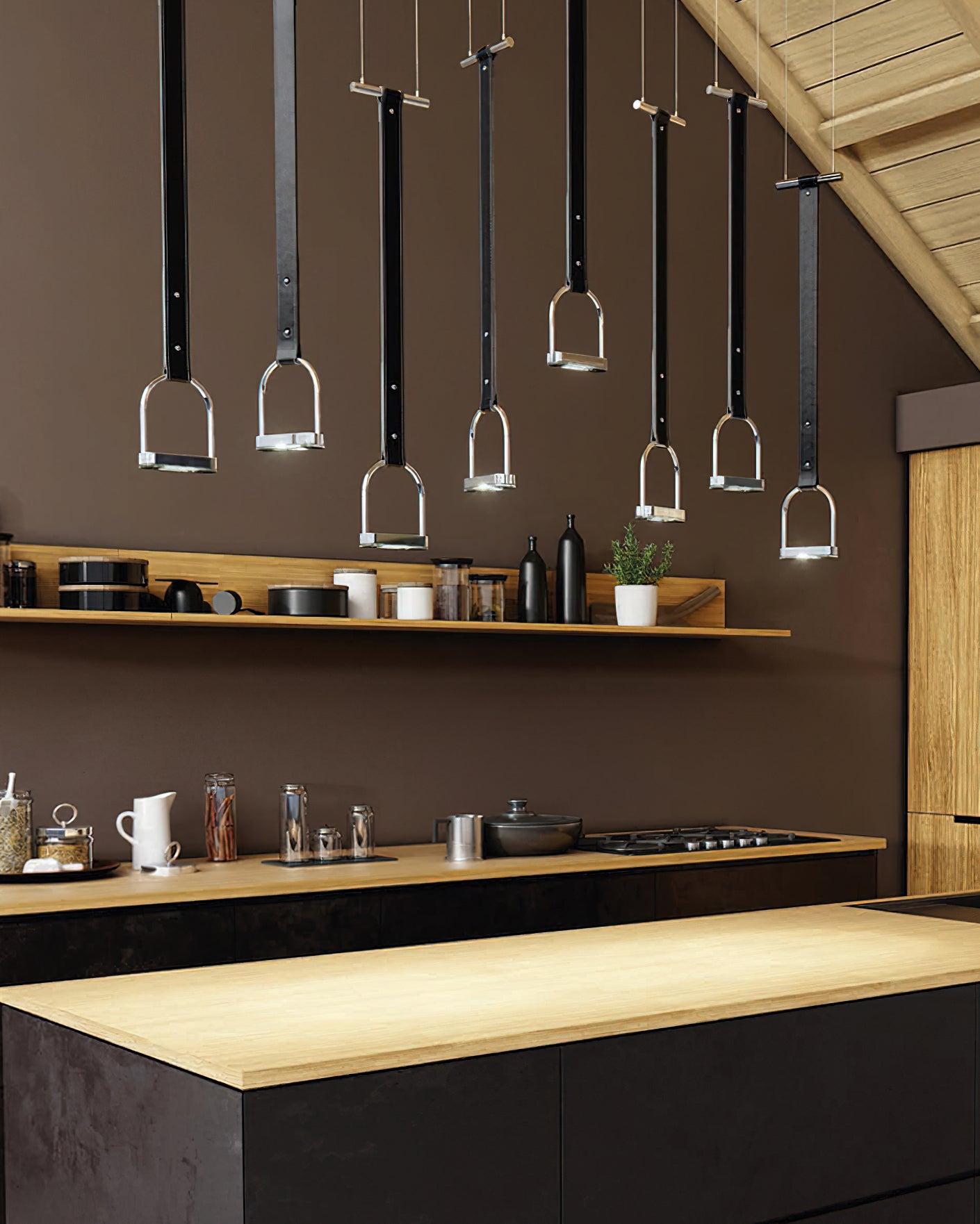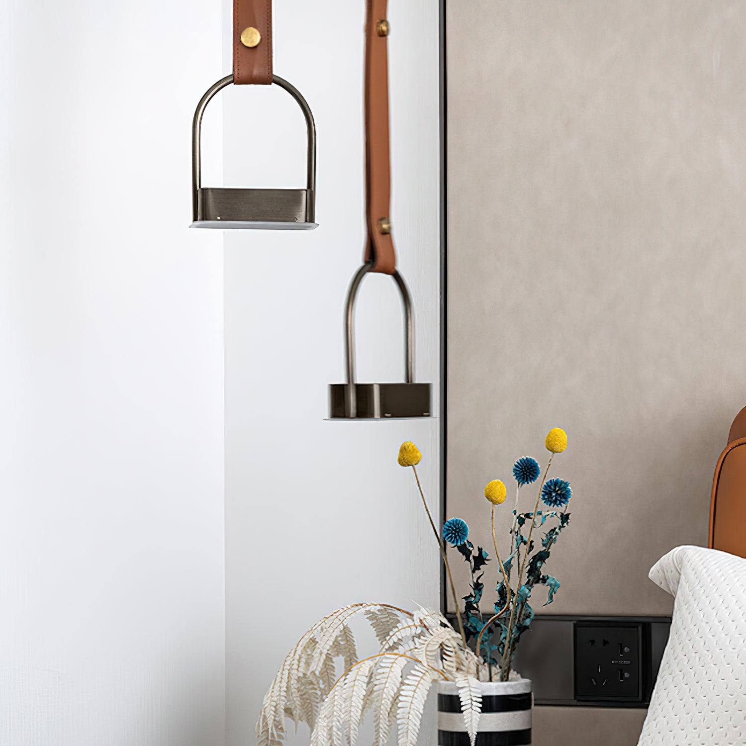 Introducing the Stirrup Pendant Lamp, a stunning chandelier inspired by the design of horseback riding stirrups. Made with premium leather and metal, this chandelier features integrated LED lights and its abstract stirrup design adds a touch of modern farmhouse style to any space.